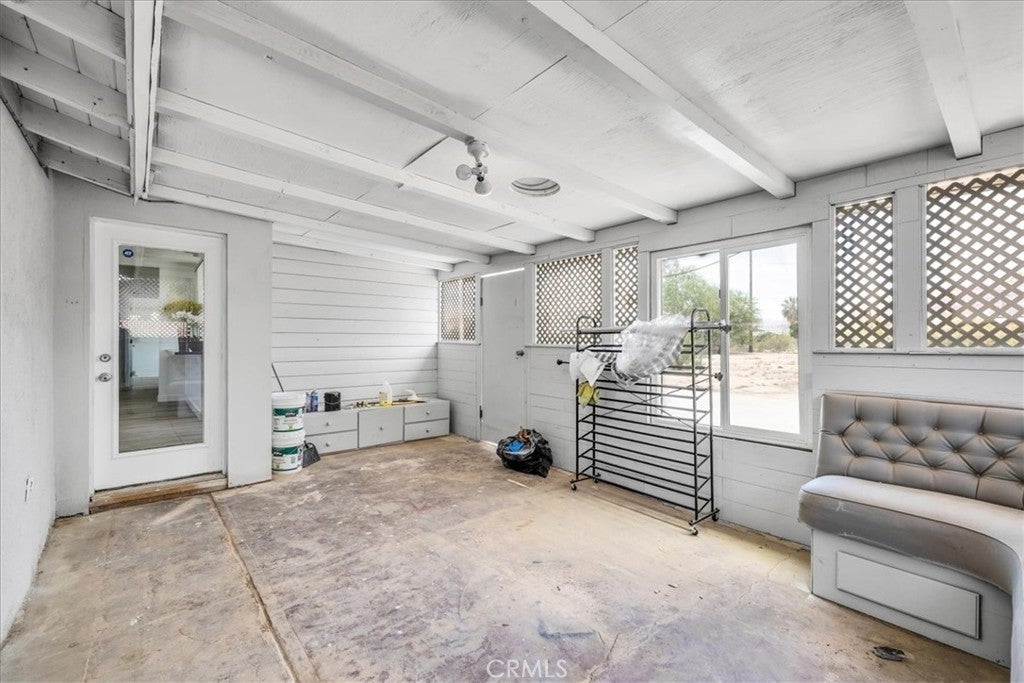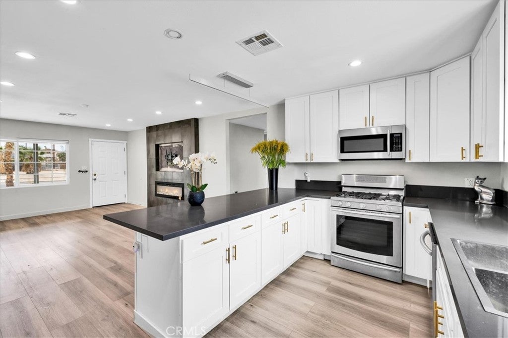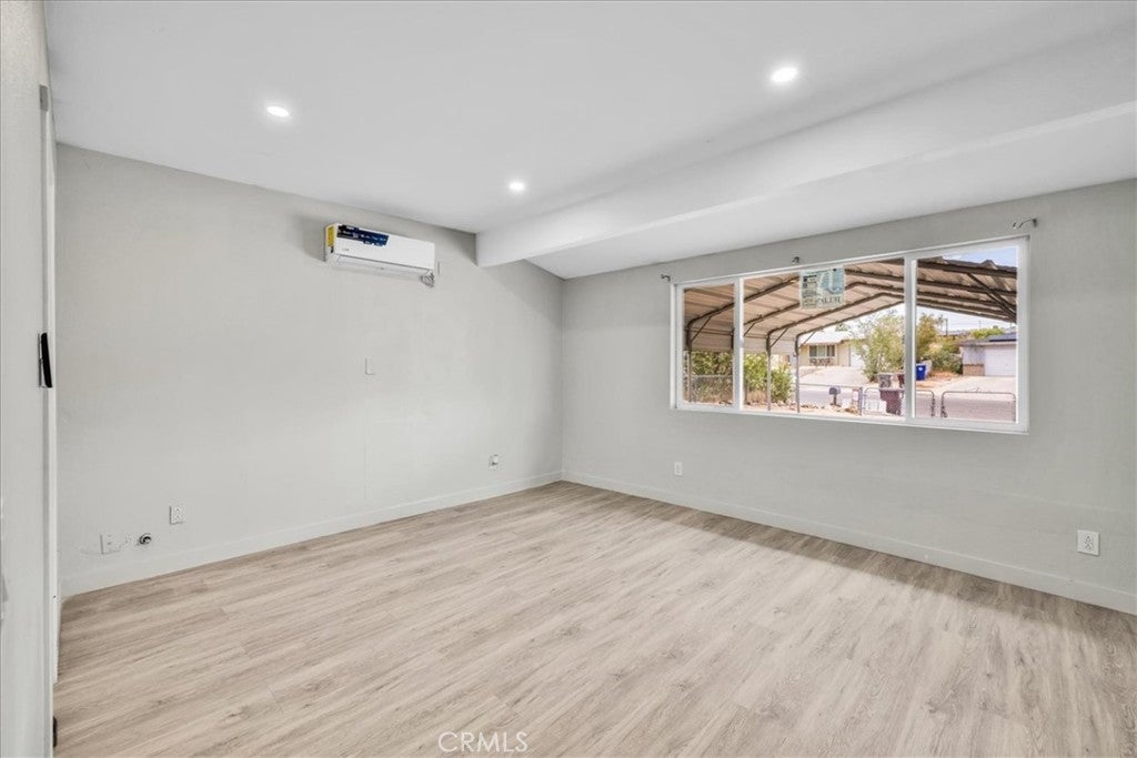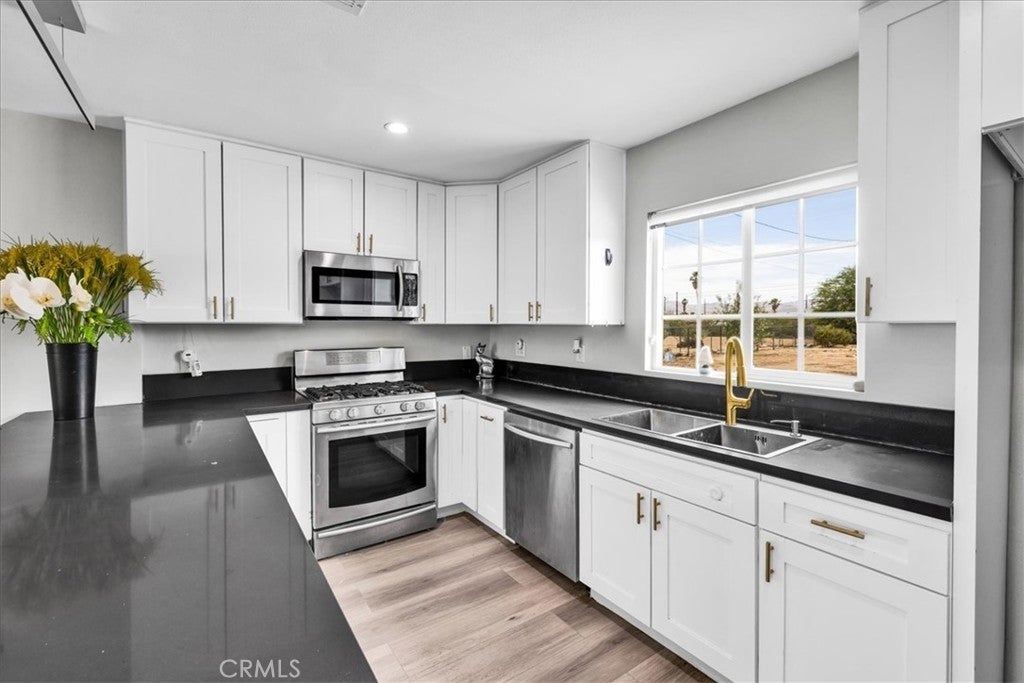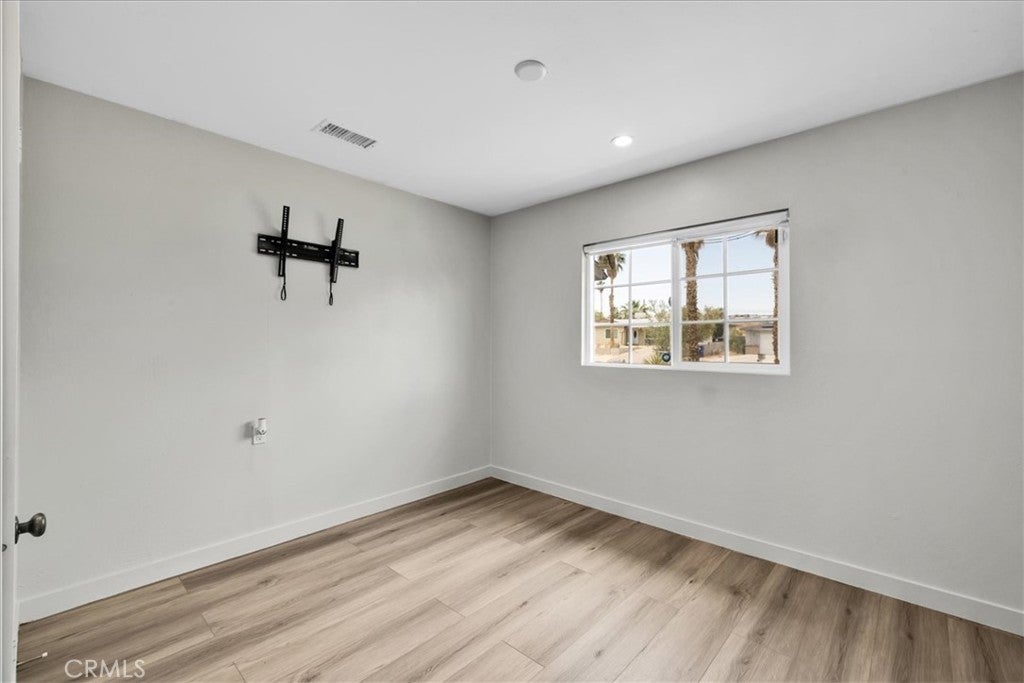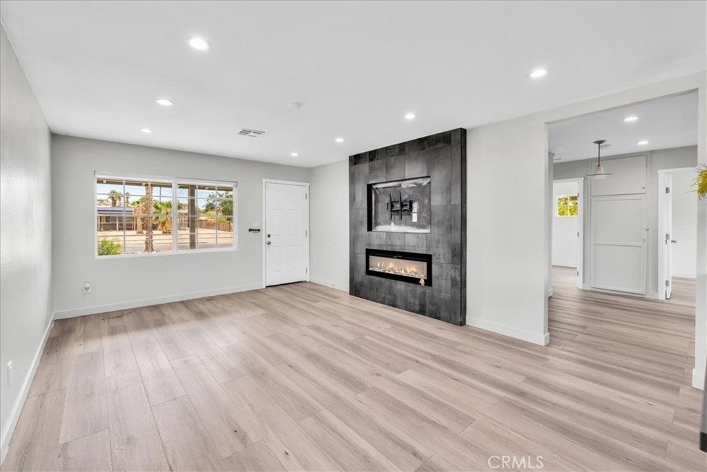 Welcome to this beautifully updated desert home! In the growing community of 29 Palms, this 4-bedroom, 2-bathroom residence blends modern style with timeless desert charm. Thoughtfully upgraded throughout, it’s move-in ready and designed for comfortable living. Step inside to discover new flooring, fresh interior paint, and recessed lighting that creates a bright, contemporary atmosphere. The upgraded kitchen is the heart of the home, featuring soft-close cabinetry, sleek quartz countertops, and ample space for cooking and entertaining. The living room offers a warm and inviting feel with its electric fireplace—perfect for cozy evenings. The guest bathroom includes a convenient shower-tub combo, while the primary suite features a beautifully tiled walk-in shower for a touch of luxury. Efficient mini-split systems provide heating and cooling throughout the home, ensuring year-round comfort. Outside, the spacious, fully fenced backyard offers privacy and endless potential—ideal for entertaining, gardening, or simply relaxing under the desert night sky. Make this updated 29 Palms gem your own—perfect as a full-time residence, vacation home, or investment property. Buyer to independently verify all MLS information, including but not limited to permits, property use, bedroom/bathroom counts, square footage, school districts, and enrollment availability. Buyer is strongly encouraged to conduct their own investigations and inspections to confirm the accuracy of all information provided.