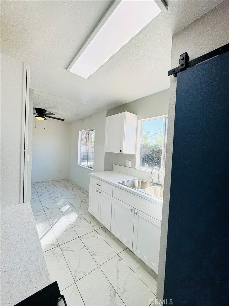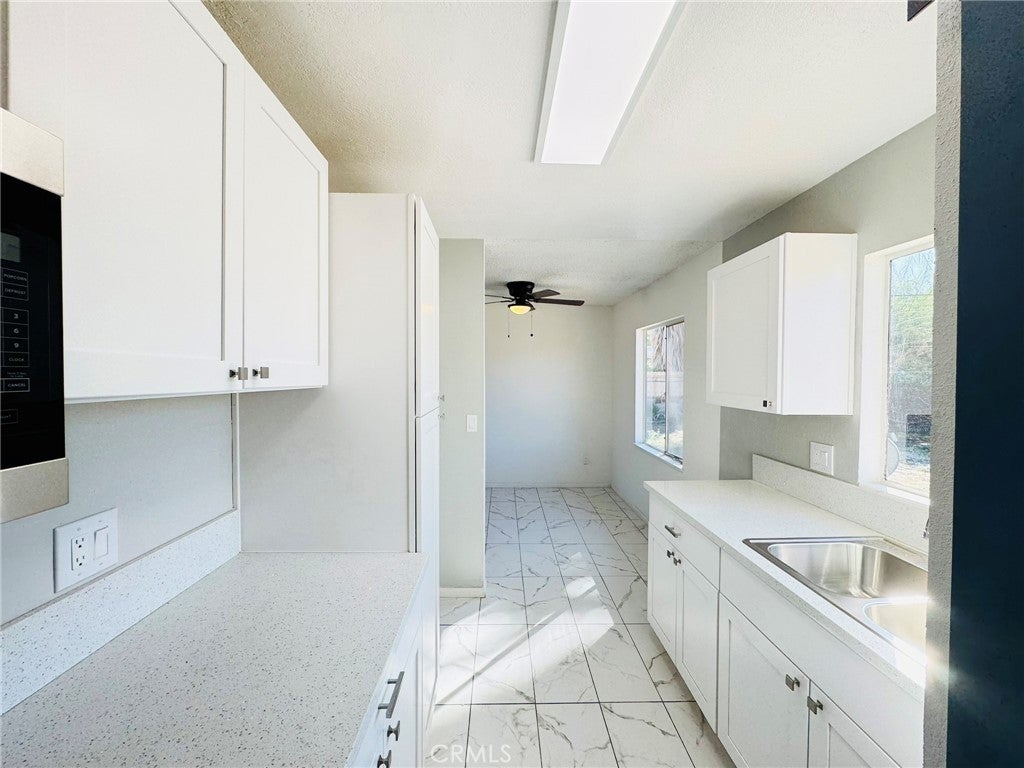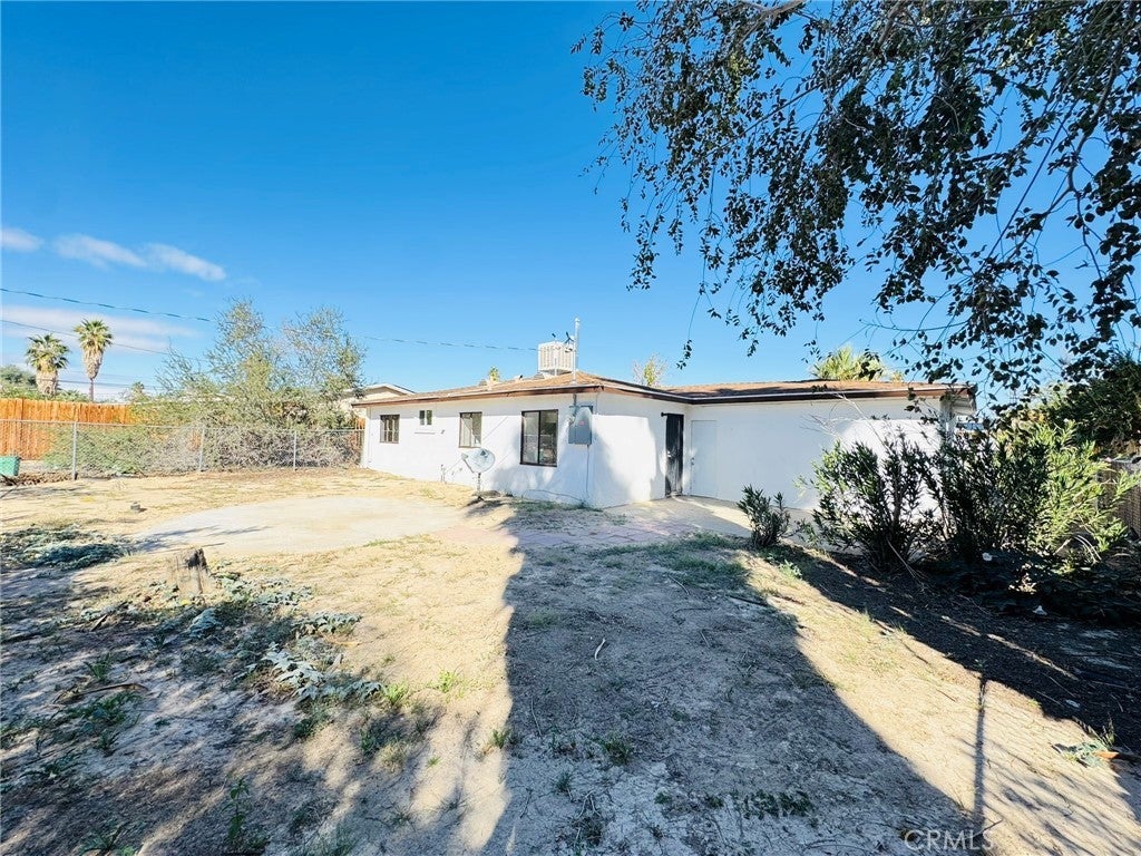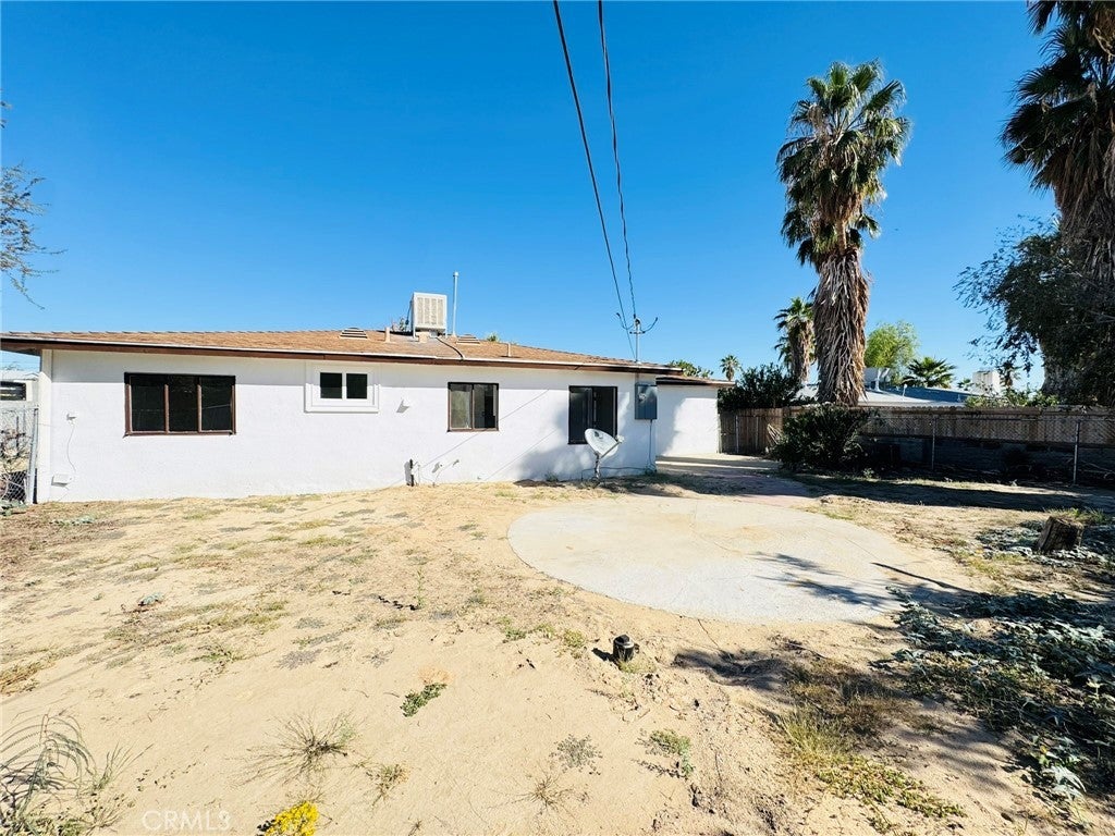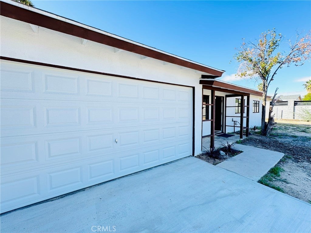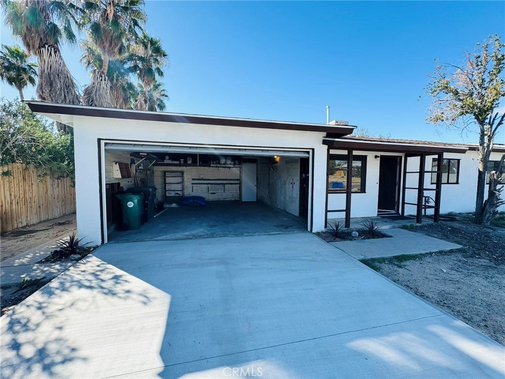 This charming single-story ranch is a great starter home, beautifully updated and move-in ready. It features a newly renovated kitchen with white cabinetry and modern fixtures, a contemporary restroom with new finishes, and new flooring throughout. The bright, open living spaces abundant natural light. Three spacious bedrooms are painted fresh and have gorgeous wood-look flooring. Beautiful mature palm tree adding a touch of desert charm, this home includes an attached 2-car garage with storage space and a long concrete driveway that accommodates multiple vehicles. The expansive fenced backyard is perfect for entertaining, and there’s potential for RV parking. Conveniently located just minutes from the Marine Corps Air Ground Combat Center, shopping, dining, and Joshua Tree National Park, this quiet neighborhood setting offers room to grow on this large lot. Turnkey and ready for immediate occupancy, this home is perfect for first-time buyers, military families, or investors seeking affordable desert living.