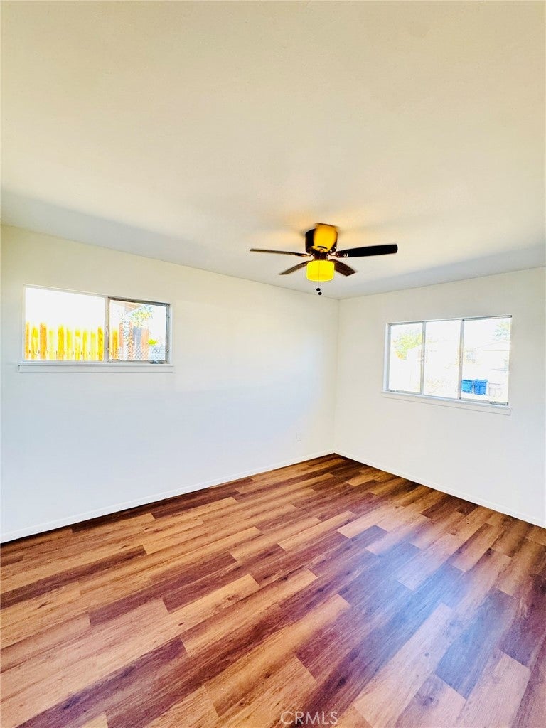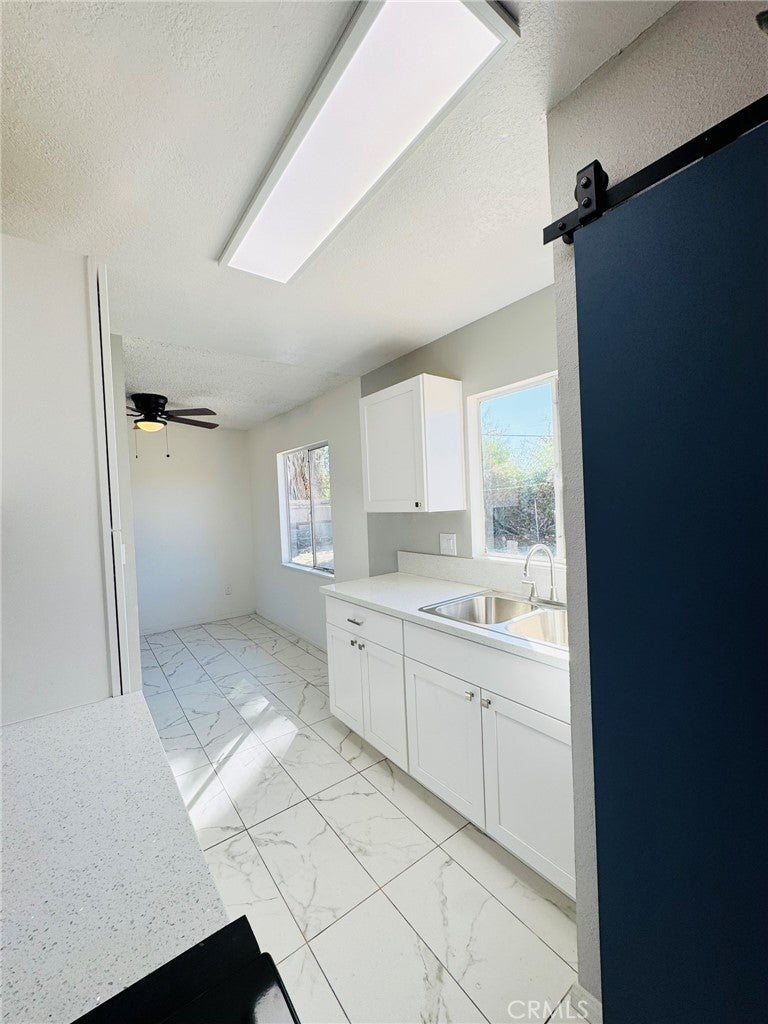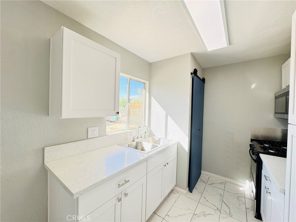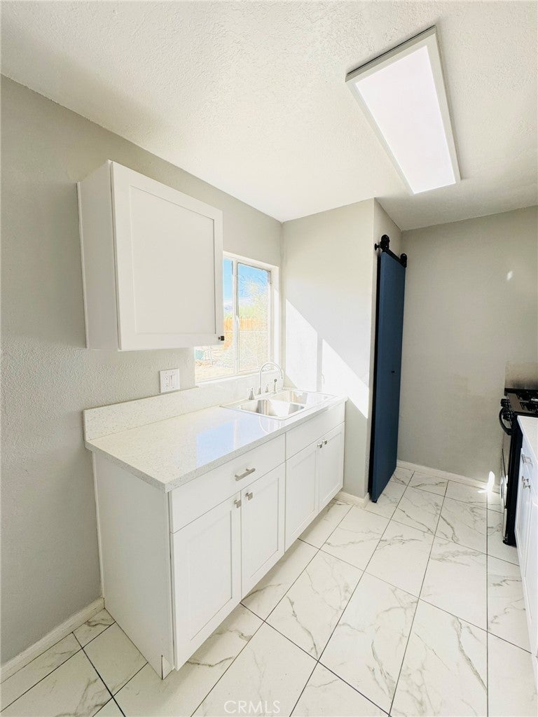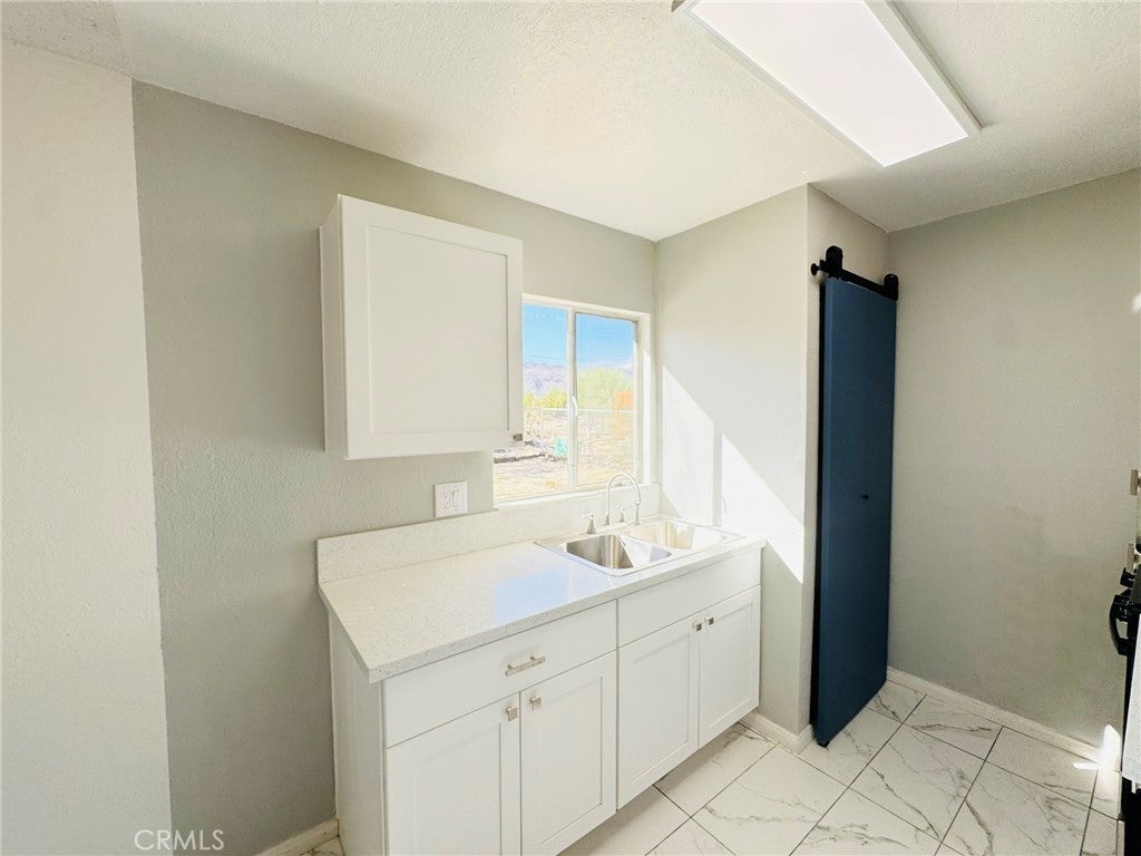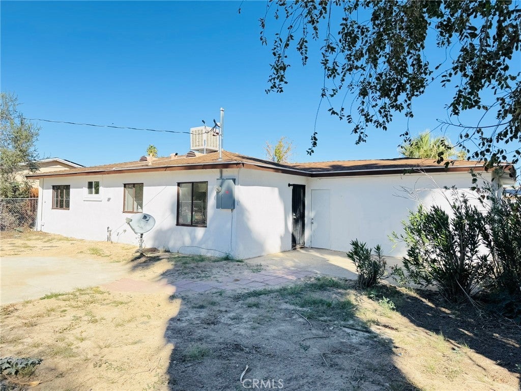 This charming single-story ranch is a great starter home, beautifully updated and move-in ready. It features a newly renovated kitchen with white cabinetry and modern fixtures, a contemporary restroom with new finishes, and new flooring throughout. The bright, open living spaces abundant natural light. Three spacious bedrooms are painted fresh and have gorgeous wood-look flooring. Beautiful mature palm tree adding a touch of desert charm, this home includes an attached 2-car garage with storage space and a long concrete driveway that accommodates multiple vehicles. The expansive fenced backyard is perfect for entertaining, and there’s potential for RV parking. Conveniently located just minutes from the Marine Corps Air Ground Combat Center, shopping, dining, and Joshua Tree National Park, this quiet neighborhood setting offers room to grow on this large lot. Turnkey and ready for immediate occupancy, this home is perfect for first-time buyers, military families, or investors seeking affordable desert living.