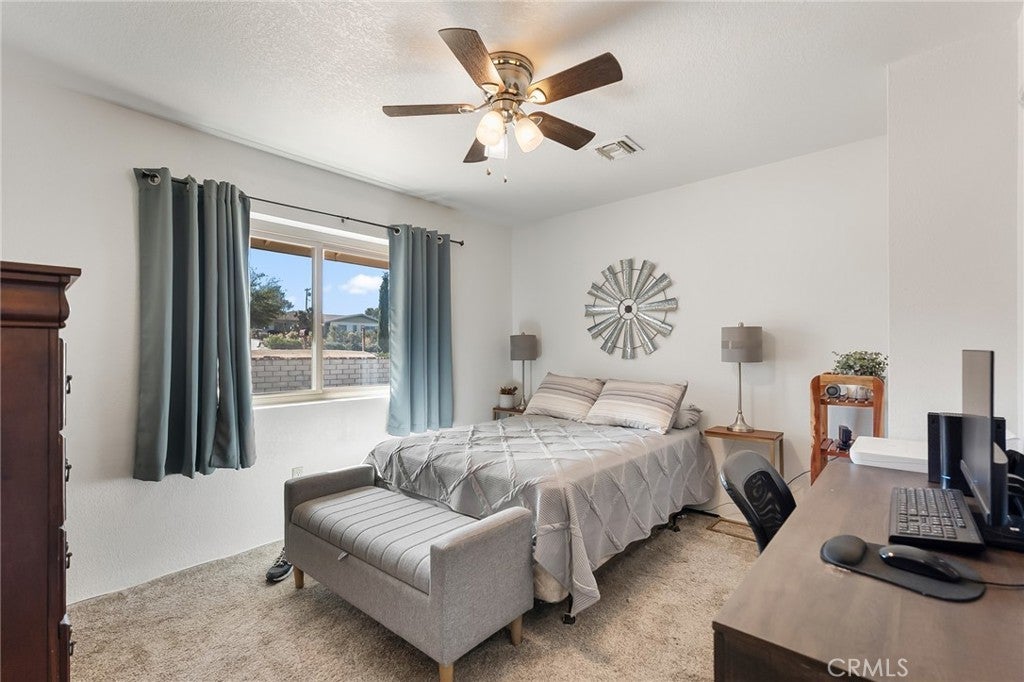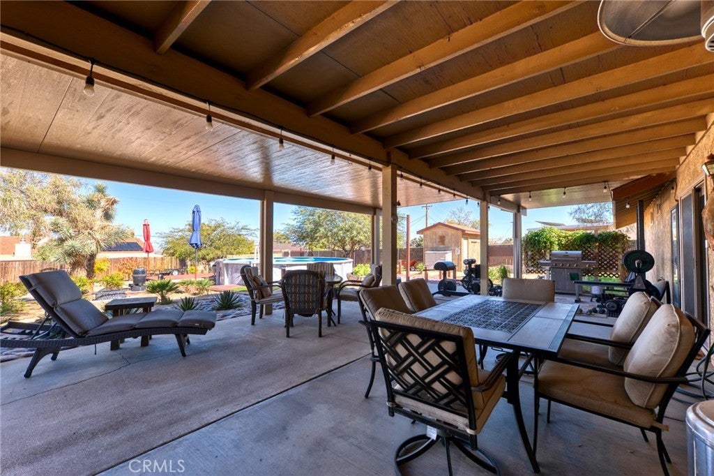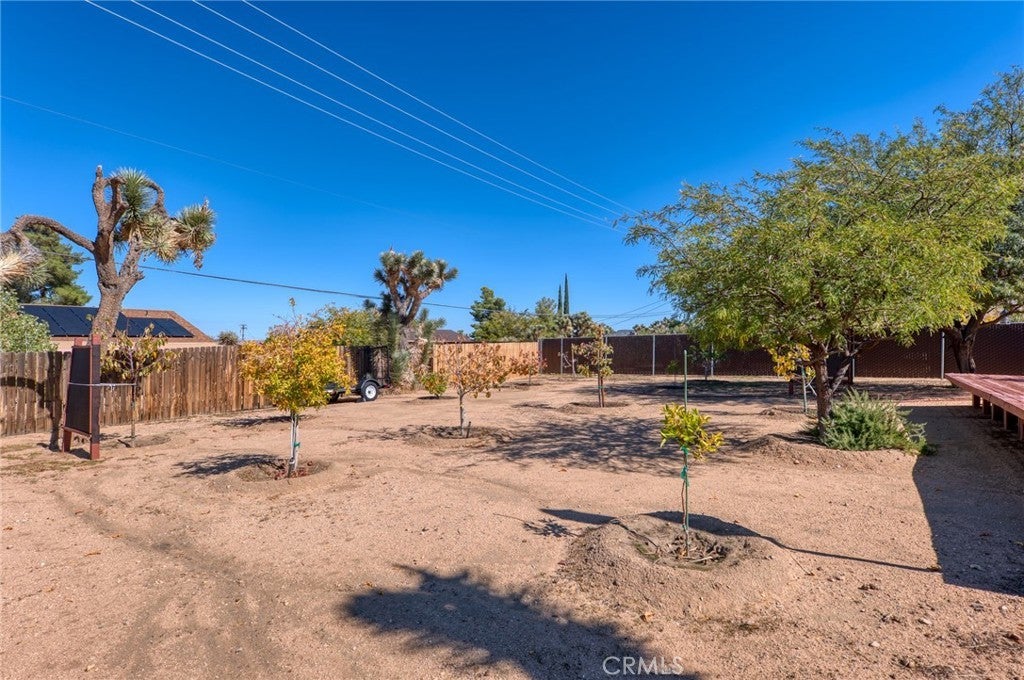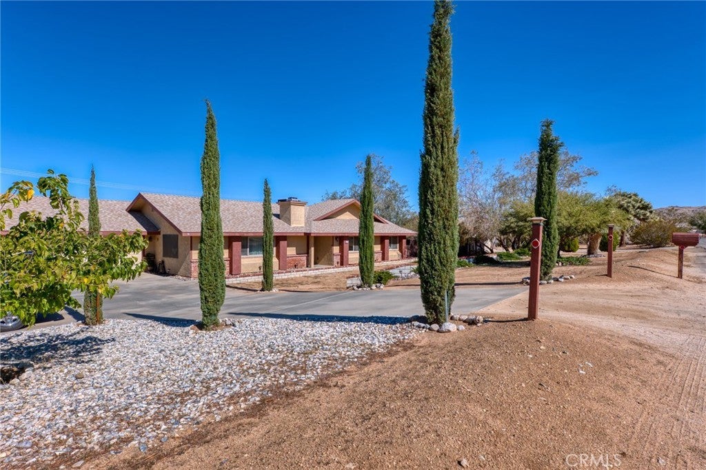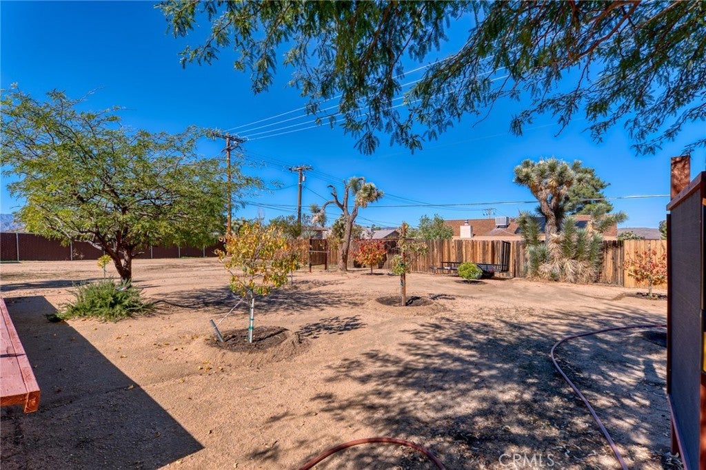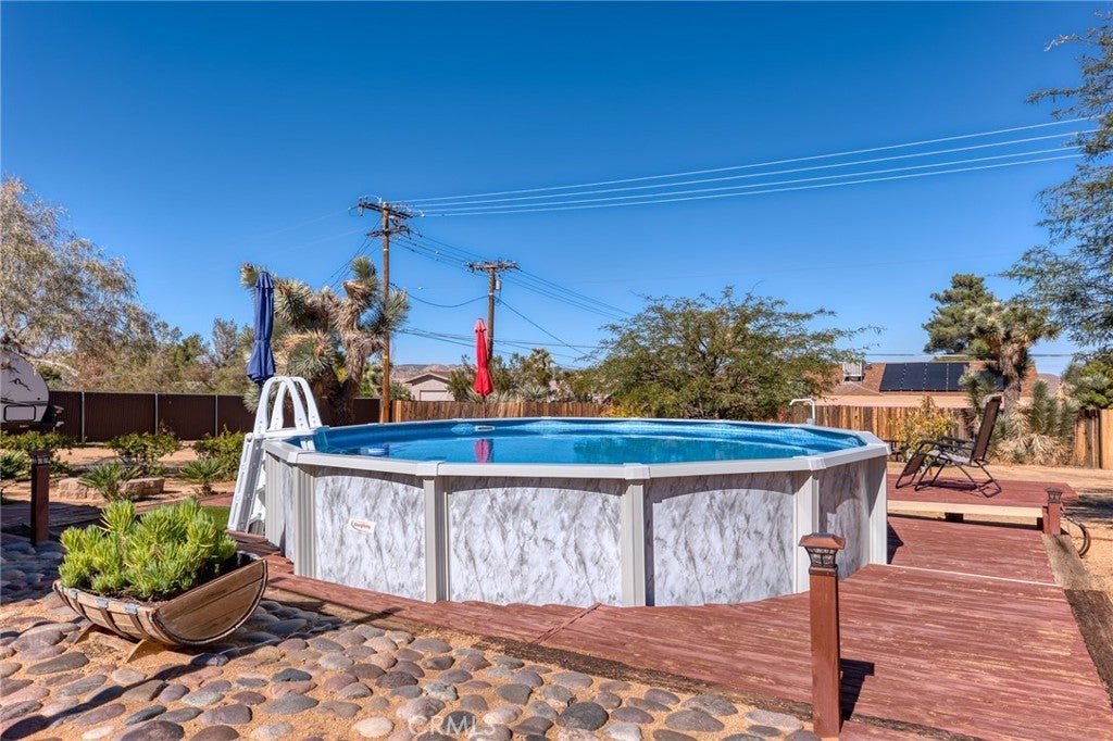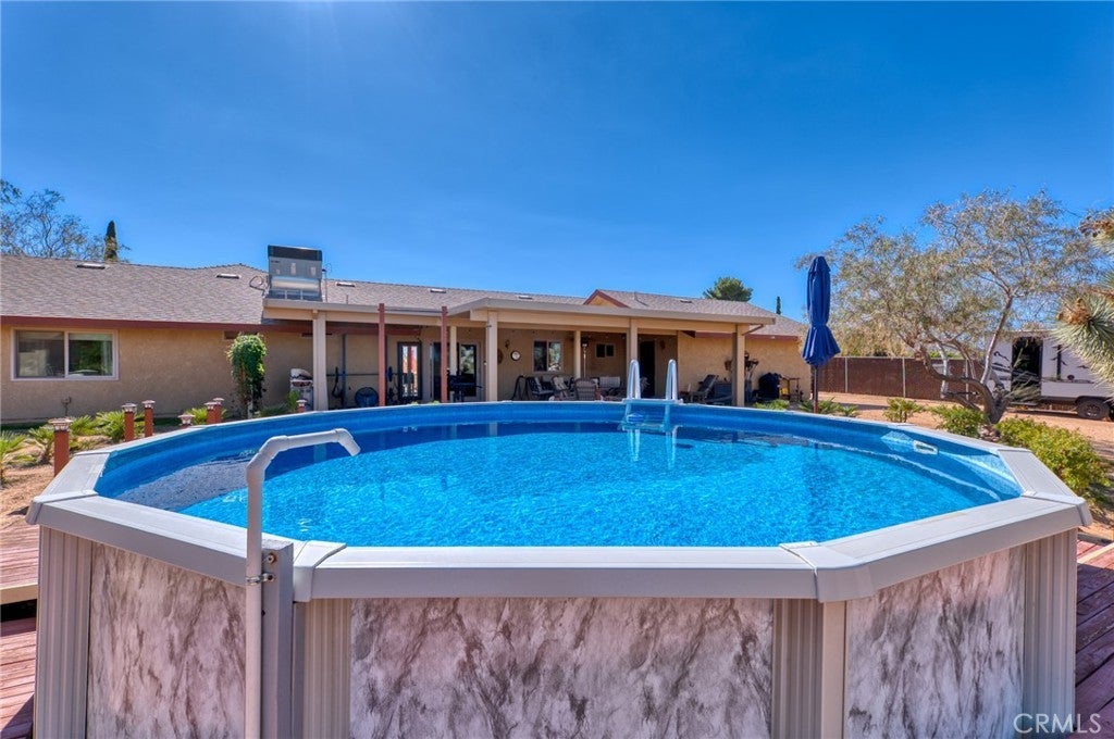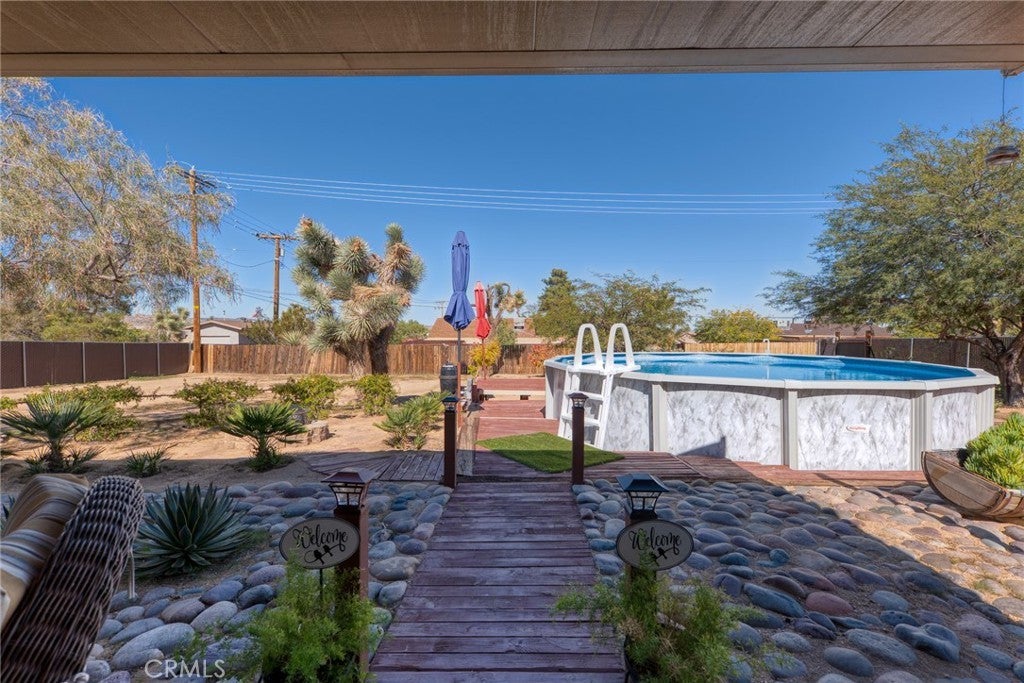 Welcome to this beautifully maintained 3-bedroom, 2-bath home nestled in the desirable Sky Harbor neighborhood of Yucca Valley, a peaceful, upscale pocket known for its wide streets, pride of ownership, and proximity to both town conveniences and Joshua Tree National Park. Spanning 1,690 square feet, this residence has been lovingly cared for and thoughtfully updated, offering comfort, style, and functionality in every detail. From the moment you step through the entryway, a mosaic tile inlay sets an elegant tone. The home features oversized ceramic tile floors in the kitchen and halls, new carpet and padding in the living areas and bedrooms, and a new HVAC system with upgraded ducting for year-round comfort. The spacious living room welcomes you with vaulted ceilings, abundant southern natural light, and a stone-faced fireplace with a new pellet insert and blower, the perfect centerpiece for cozy evenings. The expansive kitchen is a chef’s dream, offering solid honey oak cabinetry, stainless steel appliances including a double oven, a glass tile backsplash, and a sink overlooking the backyard. With an eat-up breakfast bar and a walk-in pantry, there’s no shortage of storage or counter space. A dining area just off the kitchen opens through new sliding glass doors to the backyard, creating a seamless indoor-outdoor flow ideal for entertaining. The guest bathroom features a long vanity with ample counter space, a shower/tub combo, and designer glass tile backsplash reaching to the ceiling. Both guest bedrooms are generously sized with ceiling fans, new carpet, and great natural light. The primary suite offers vaulted ceilings, plush carpet, and a private bath with a large walk-in shower and tile countertops.Step outside to your private backyard oasis, a north-facing covered patio perfect for lounging in the shade, an above-ground pool with wood decking, and lush desert landscaping accented by fruit trees and a storage shed. The yard is fully fenced and thoughtfully designed for low maintenance living. Additional highlights include a 30-amp RV hookup with clean-out and new retaining walls in the front yard, adding both function and curb appeal. Ideally situated just minutes from shopping, dining, and highly rated schools, this home also offers quick access to the Black Rock hiking trails, Joshua Tree National Park, and the vibrant arts and dining scene of downtown Yucca Valley. This home is prefect for a full time residence or desert retreat.