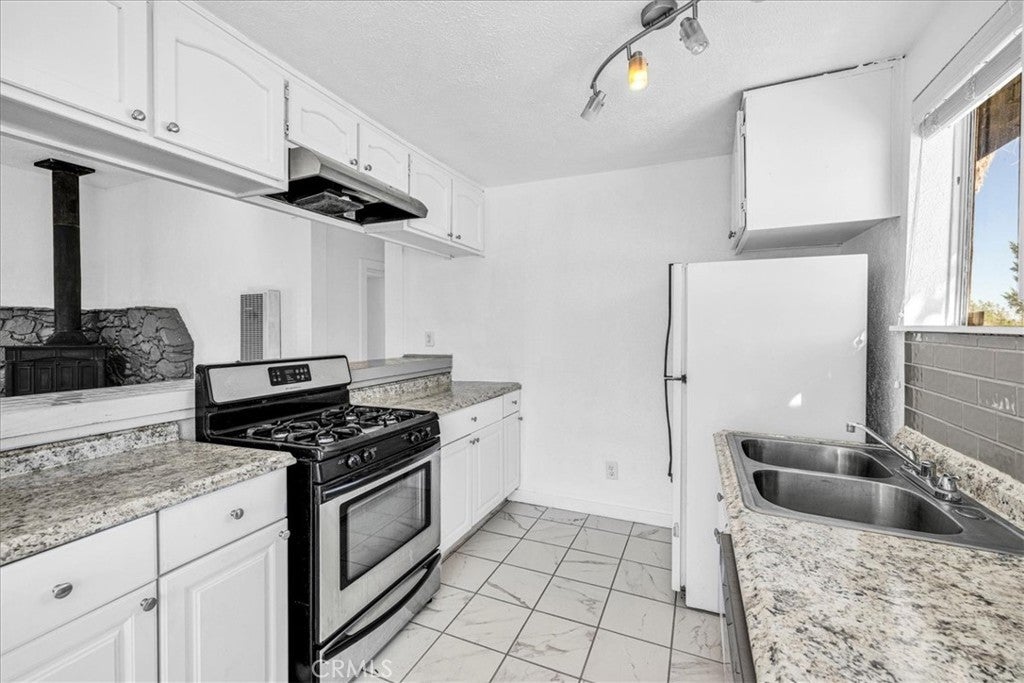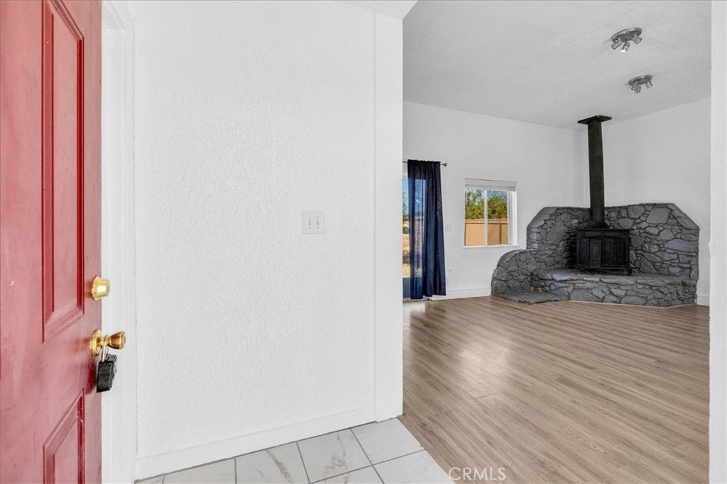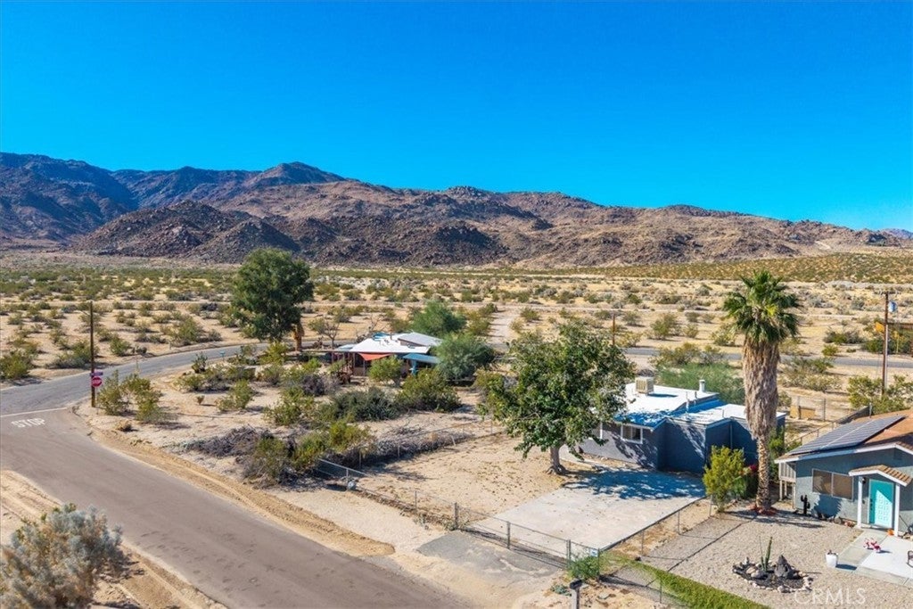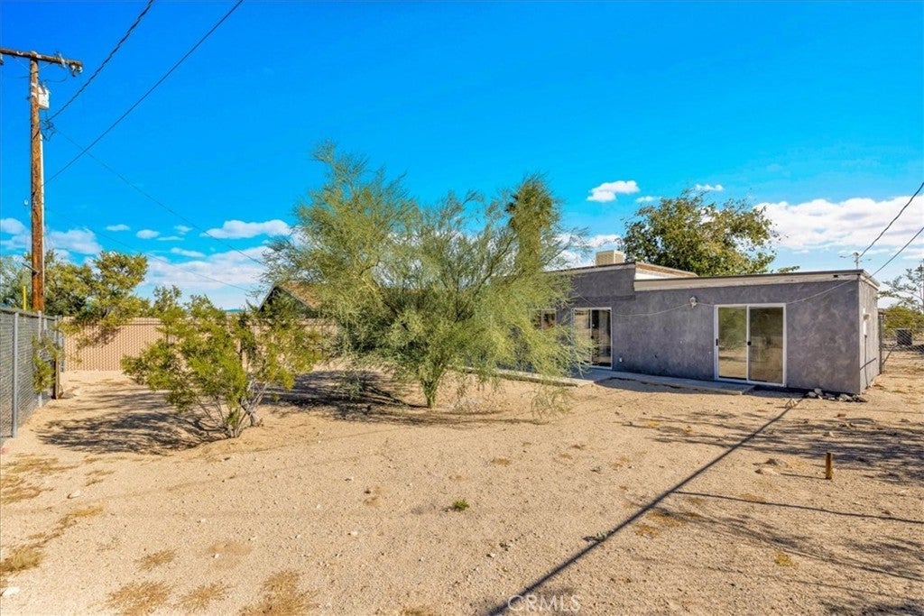 Centrally located in the Smoke Tree area of 29 Palms, this inviting 2 bedroom, 2 bath home offers comfort, charm, and convenience with thoughtful updates and plenty of space to enjoy desert living. The property is fully fenced and features a paved driveway with a large shade tree welcoming you home. Inside, the spacious living room features wood-look flooring, modern light fixtures, and a cozy wood stove set on a rustic hearth designed to resemble natural stone. Large windows and a sliding glass door fill the space with light and provide easy access to the backyard. The layout flows into the dining area and updated kitchen, which includes tile floors, a tile backsplash, a gas stove, dishwasher, and a breakfast bar for casual dining. The primary bedroom is comfortably sized with its own sliding glass doors to the backyard and an attached bath with a tub/shower combo. The second bedroom also offers a sliding glass door for direct outdoor access, making both rooms bright and airy. The guest bath features a walk-in shower with glass doors. Additional highlights include indoor laundry hookups and a spacious backyard, offering plenty of room to relax or entertain under the desert sky. Located just minutes from the entrance to Joshua Tree National Park, with its convenient location, updated interior, and inviting layout, this home is a great opportunity in a desirable part of 29 Palms.