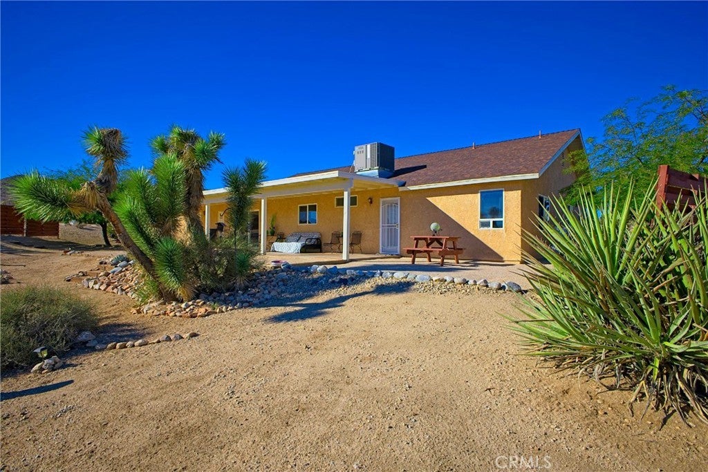 A Magical Desert Retreat with Sweeping Views & Room to Dream : Welcome to 59105 Wilcox Lane, a truly special place in the heart of Yucca Valley where desert beauty meets peaceful living. This charming single-level home rests on over ONE ACRE of land,on 2 attached lots, offering endless possibilities for expansion, gardens, a guesthouse, or your own private oasis. Step inside and feel immediately at home. The spacious, light-filled interior features 3 bedrooms and 2 full baths, with an open-concept layout that invites connection and comfort. The kitchen glows with warm granite countertops, quality cabinetry, and plenty of space for gathering and cooking together. The living and dining areas flow naturally, framed by large windows that let in the serene desert light. The primary suite is a tranquil retreat with its own private bath, while the additional bedrooms are perfect for guests, a home office, or creative studio space. With central heating and cooling, every season here feels just right. But it’s what’s outside that truly makes this home magical. From the front patio, watch the desert awaken each morning with golden light spilling across the mountains. From the back patio, take in breathtaking panoramic views that transform with every sunset — pink skies, endless stars, and the quiet hum of the desert night. The property’s expansive lot offers endless opportunities for outdoor living — with meandering walking paths, thoughtfully landscaped areas, and mature trees that provide shade and serenity. The additional half-acre parcel opens the door to even more possibilities, whether you dream of creating gardens, adding a guesthouse, or keeping horses or livestock Nestled in a peaceful pocket of Yucca Valley, you’re close to everything — local shops, dining, and just a short drive to Joshua Tree National Park — yet far enough to feel the deep calm and magic of the desert. Whether you’re seeking a full-time sanctuary, a vacation escape, or a place to create and dream, this home captures the spirit of the high desert like few others. Come experience the magic of Wilcox Lane — where every sunrise feels like a new beginning.