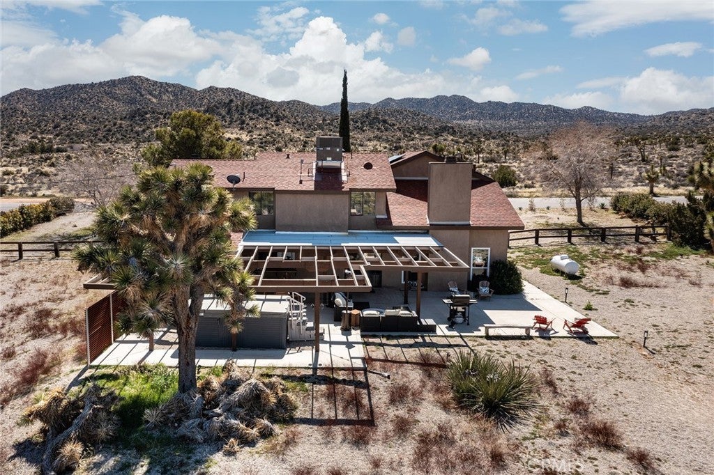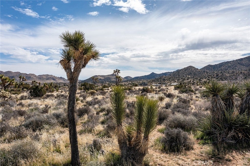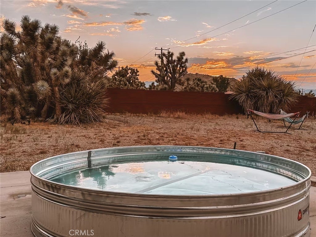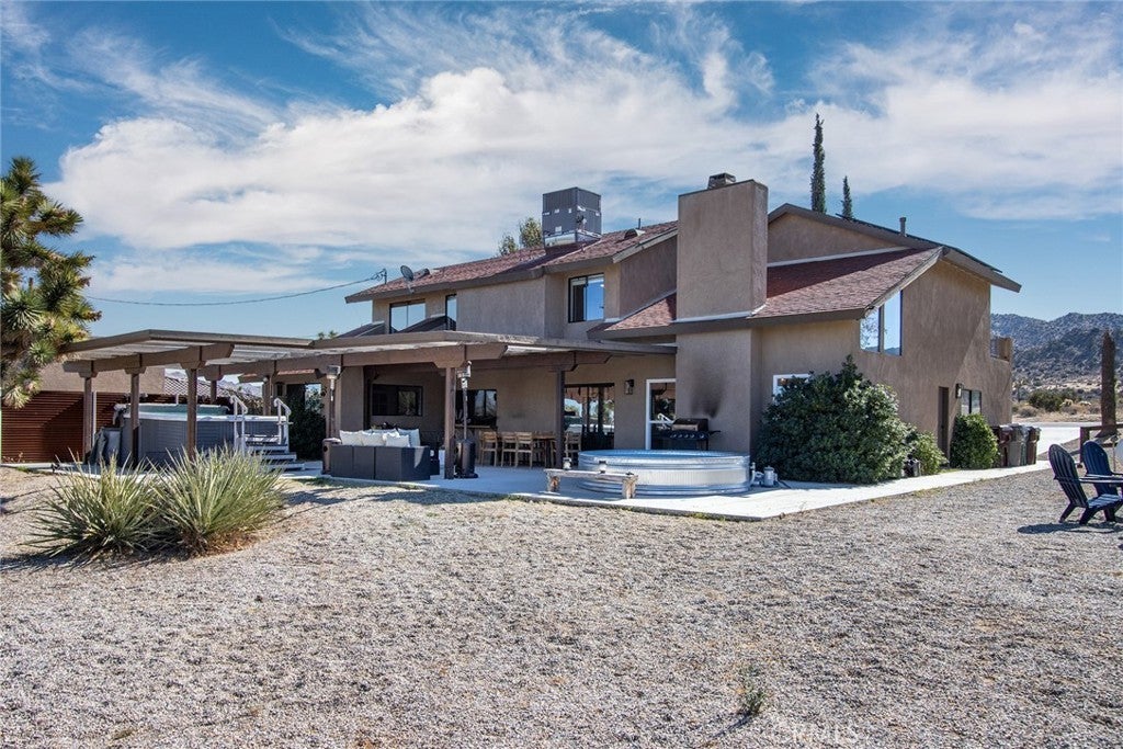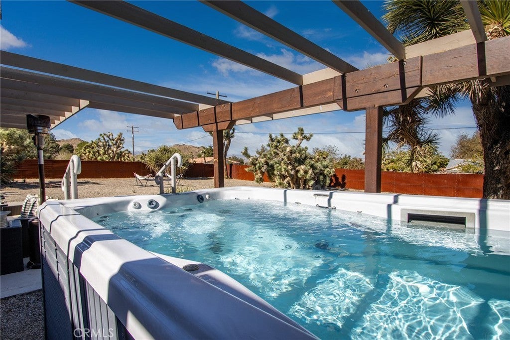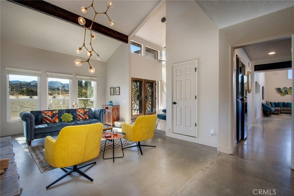 Welcome to The Lodge at Blackrock, a striking modern lodge-style residence designed by a renowned global interior designer. Located in the sought after Upper Sky Harbor on the last paved street at the top of the hill, this property is mere steps away from Joshua Tree National Park and hiking at Blackrock entrance, offering a rare blend of luxury, comfort, and iconic desert serenity. Step inside to a grand two-story living room anchored by a massive stone wood-burning fireplace, with walls of glass framing panoramic desert and mountain views. The open floor plan flows into a formal dining area and a chef’s kitchen with premium finishes, ample counter space, and a cozy breakfast nook. A second living area with a pellet stove fireplace provides a warm and inviting retreat. The home features 5 bedrooms (tax roll shows 4 beds - additional bed in converted dining room) and two-and-a-half baths, including a spacious primary suite with a luxury soaking tub and walk-in shower. Outdoors, relax in the 10-person “swim spa,” cool off in the cowboy tub, or gather around the fire pit under starlit desert skies. Located in a quiet neighborhood known for its natural beauty and peace, The Lodge at Blackrock offers a truly immersive desert lifestyle. Whether as a primary residence, vacation retreat, or investment property, this home checks all the boxes!