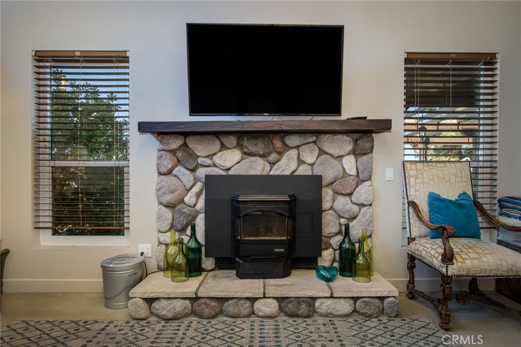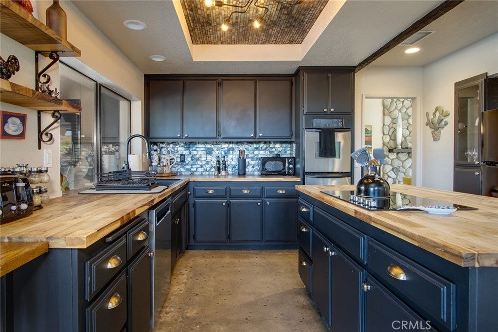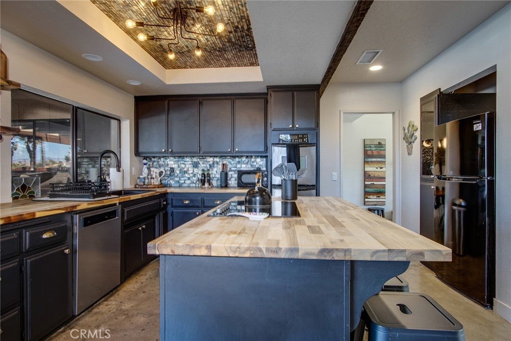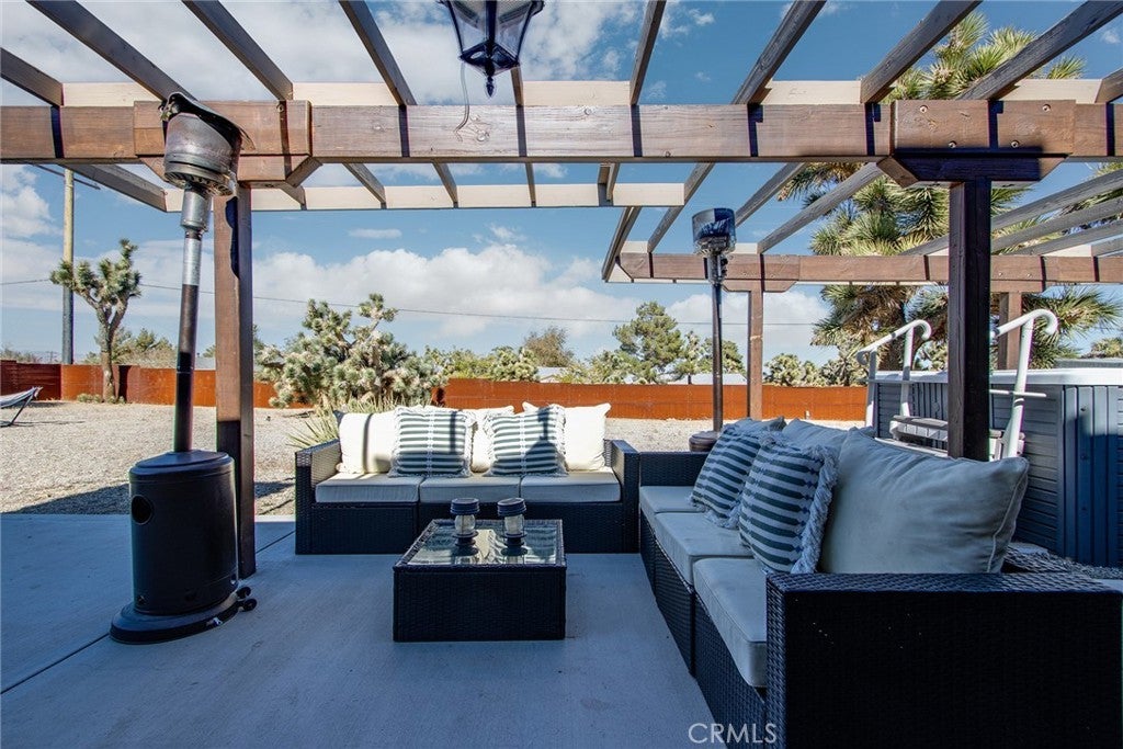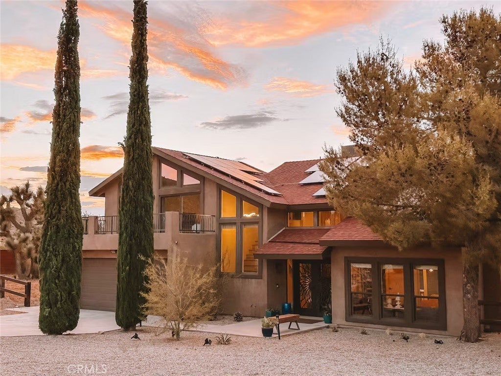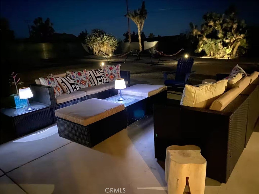 Welcome to The Lodge at Blackrock, a striking modern lodge-style residence designed by a renowned global interior designer. Located in the sought after Upper Sky Harbor on the last paved street at the top of the hill, this property is mere steps away from Joshua Tree National Park and hiking at Blackrock entrance, offering a rare blend of luxury, comfort, and iconic desert serenity. Step inside to a grand two-story living room anchored by a massive stone wood-burning fireplace, with walls of glass framing panoramic desert and mountain views. The open floor plan flows into a formal dining area and a chef’s kitchen with premium finishes, ample counter space, and a cozy breakfast nook. A second living area with a pellet stove fireplace provides a warm and inviting retreat. The home features 5 bedrooms (tax roll shows 4 beds - additional bed in converted dining room) and two-and-a-half baths, including a spacious primary suite with a luxury soaking tub and walk-in shower. Outdoors, relax in the 10-person “swim spa,” cool off in the cowboy tub, or gather around the fire pit under starlit desert skies. Located in a quiet neighborhood known for its natural beauty and peace, The Lodge at Blackrock offers a truly immersive desert lifestyle. Whether as a primary residence, vacation retreat, or investment property, this home checks all the boxes!