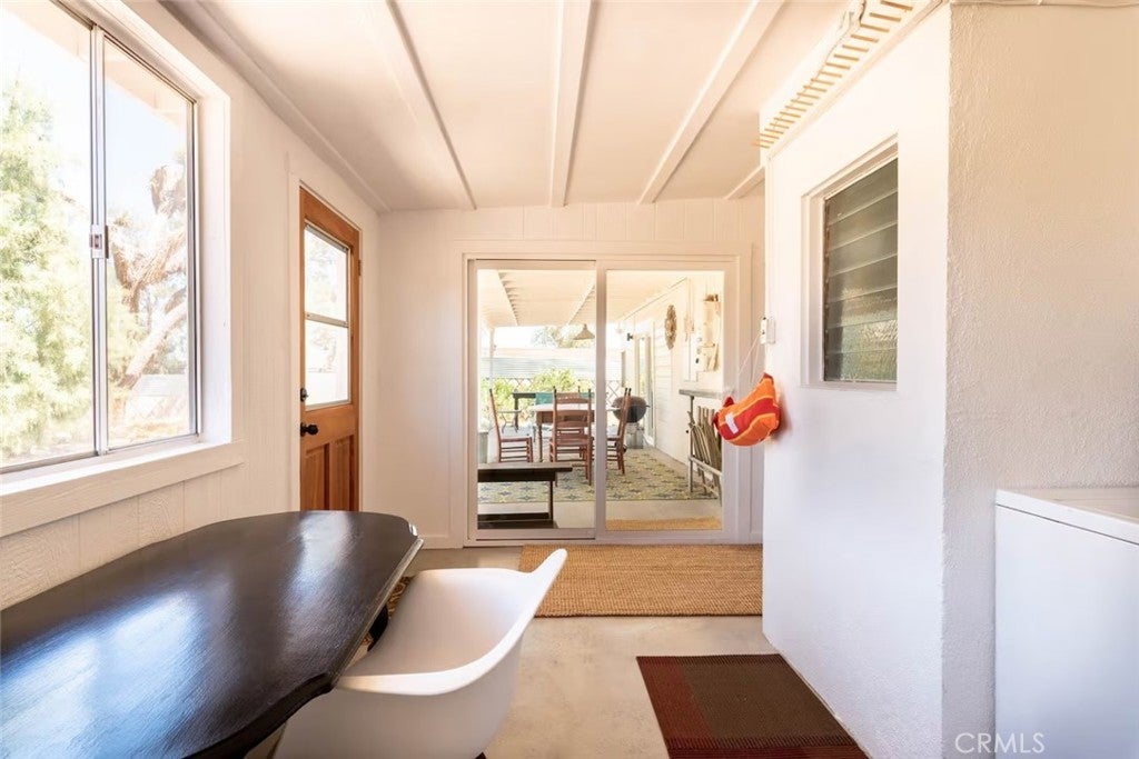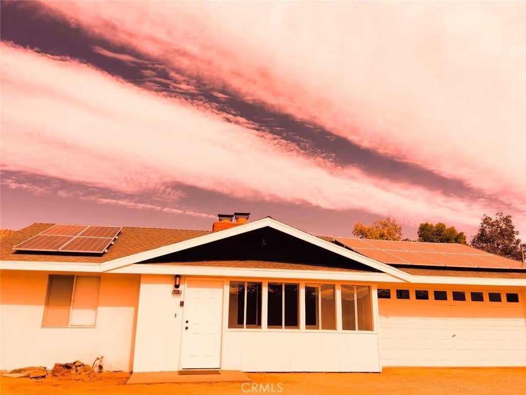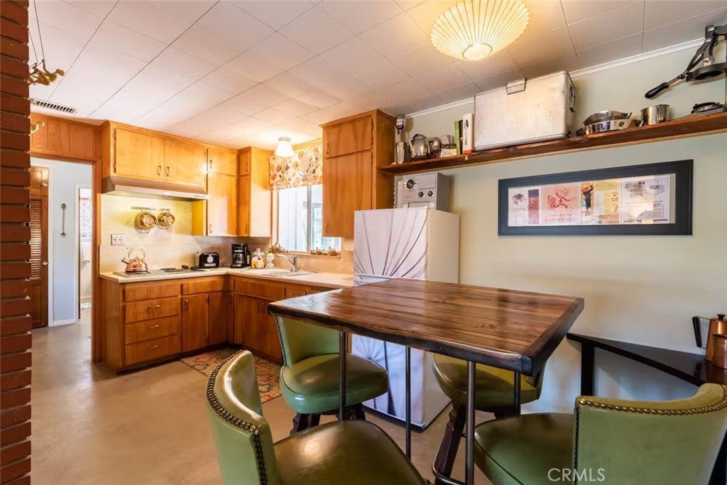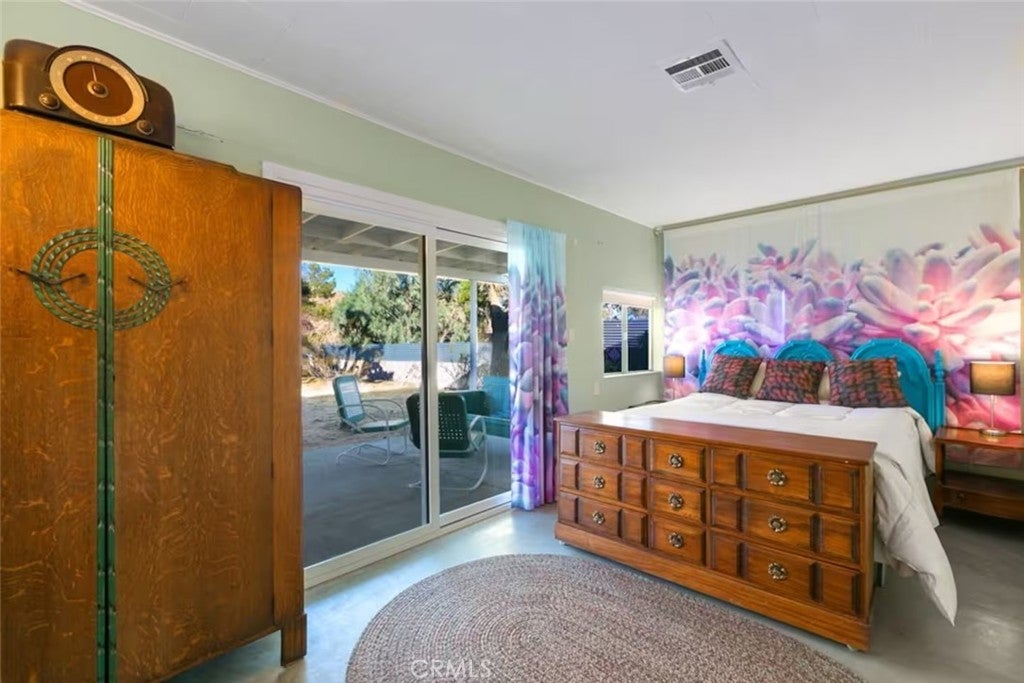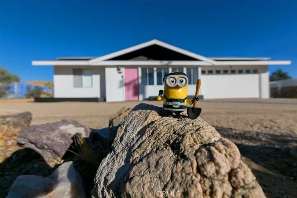 JT Original Retro Style Gold Medal Home. Two bedroom, one bath all-electric solar home in a fantastic location situated on a 2-acre lot just a few blocks from downtown Joshua Tree. Low electric bill due to large solar array. Spacious living room with a wood burning fireplace. Eat in kitchen. Large enclosed front porch. Shady north-facing covered back patio. The kitchen comes equipped with a refrigerator, dishwasher, cooktop, oven, and microwave. Large laundry area with a full size washer and dryer. Two car garage. Option for fully-furnished.