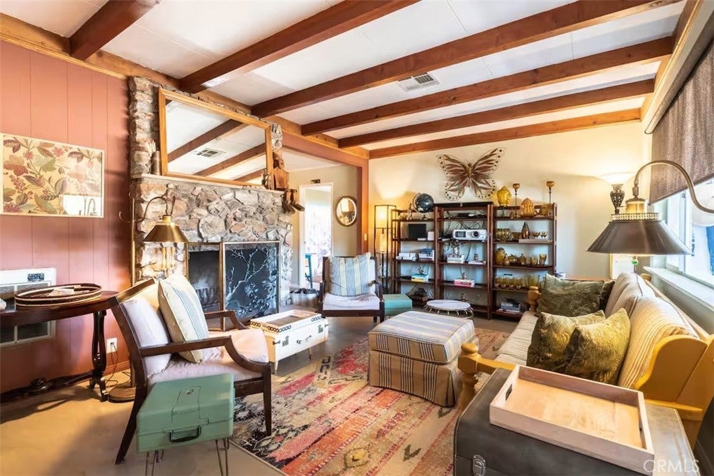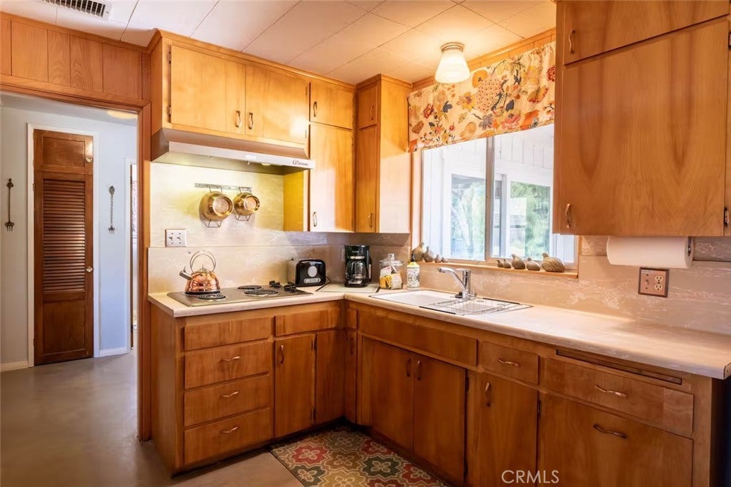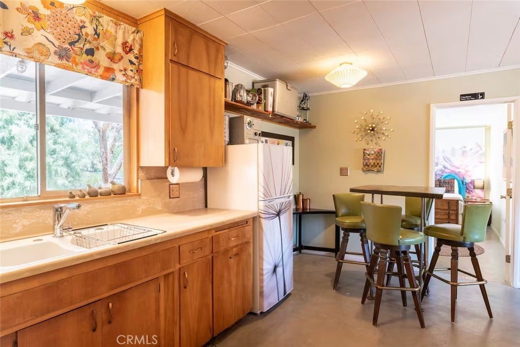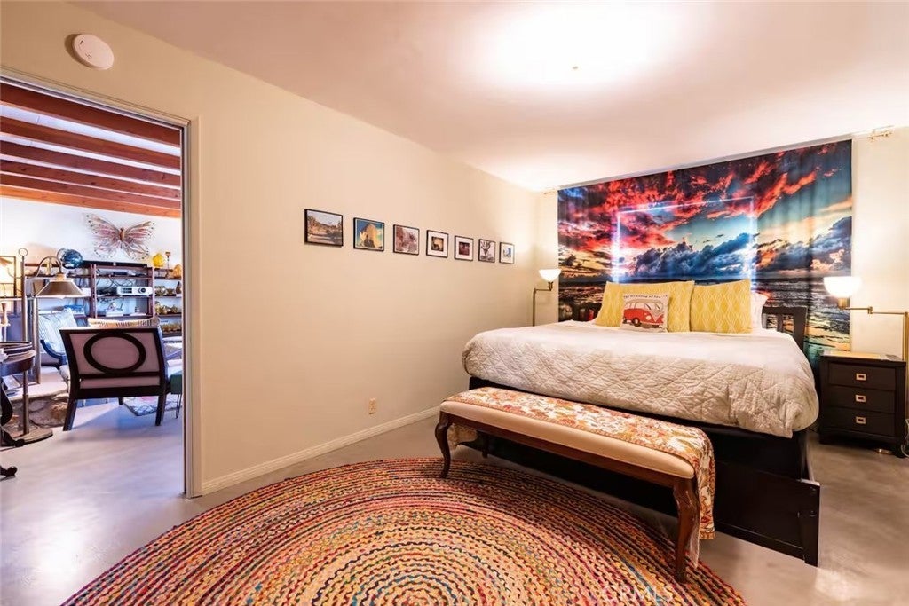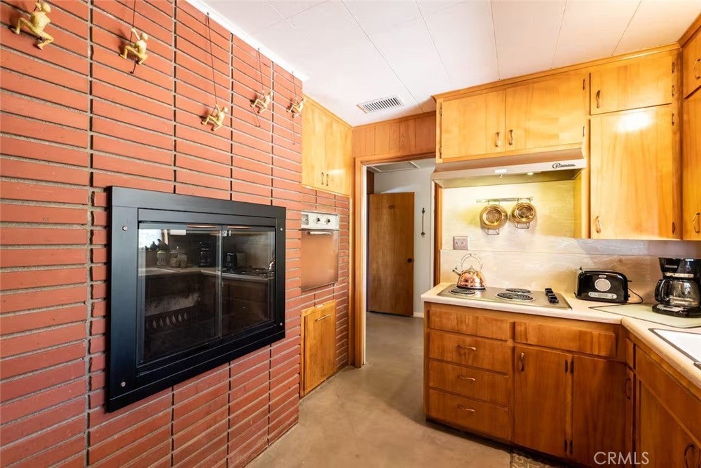 JT Original Retro Style Gold Medal Home. Two bedroom, one bath all-electric solar home in a fantastic location situated on a 2-acre lot just a few blocks from downtown Joshua Tree. Low electric bill due to large solar array. Spacious living room with a wood burning fireplace. Eat in kitchen. Large enclosed front porch. Shady north-facing covered back patio. The kitchen comes equipped with a refrigerator, dishwasher, cooktop, oven, and microwave. Large laundry area with a full size washer and dryer. Two car garage. Option for fully-furnished.