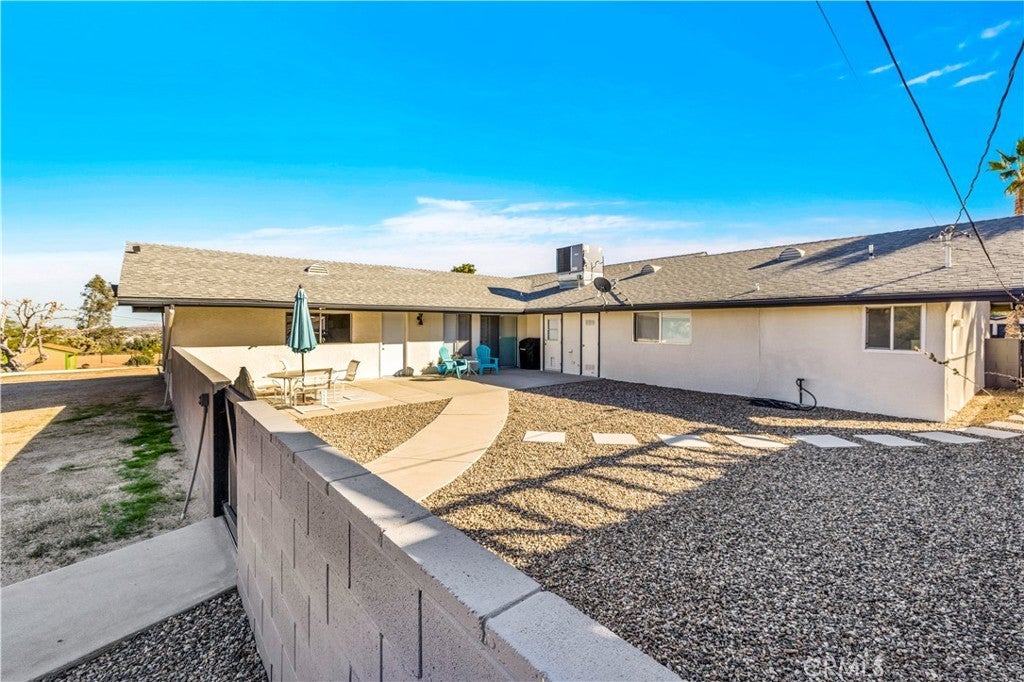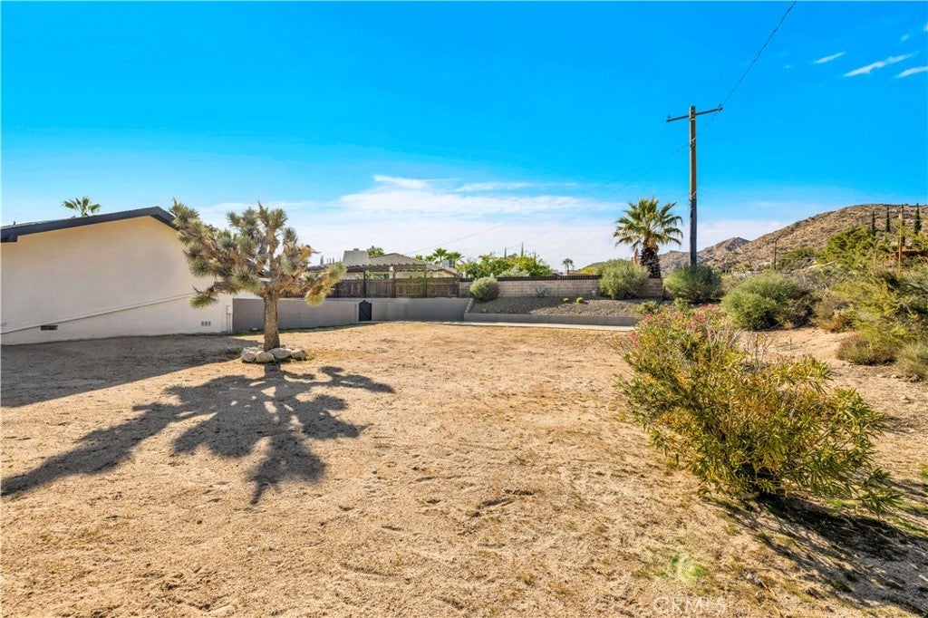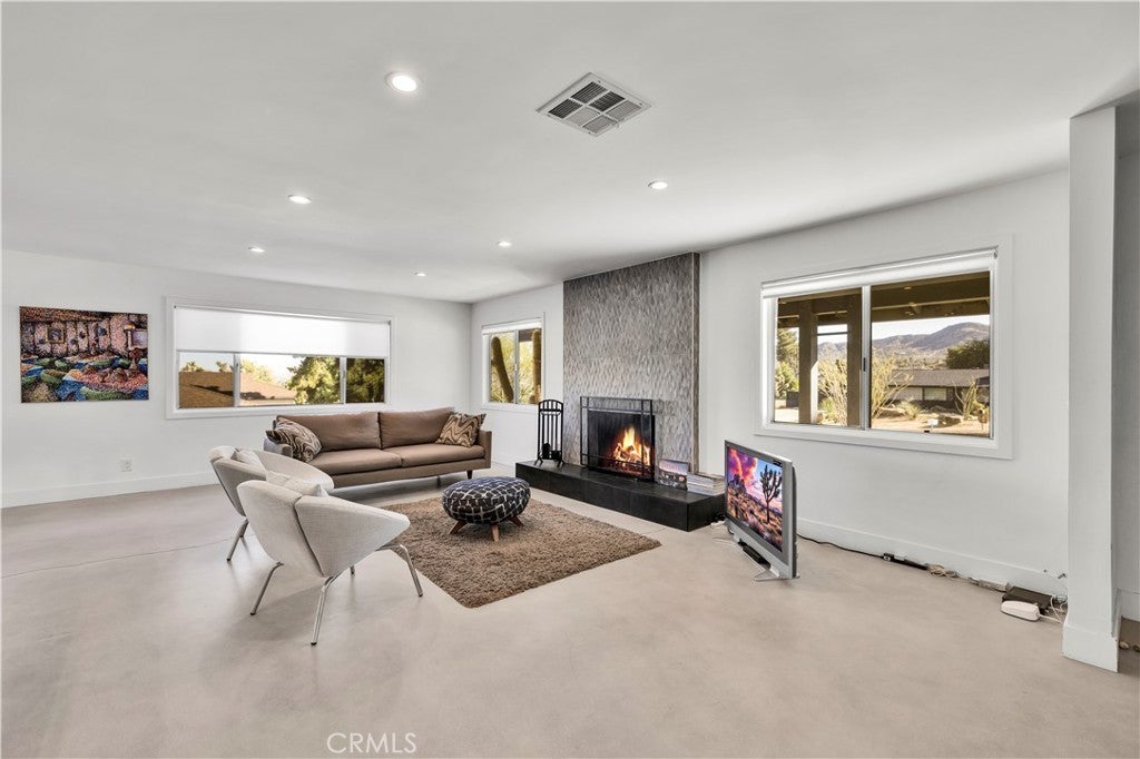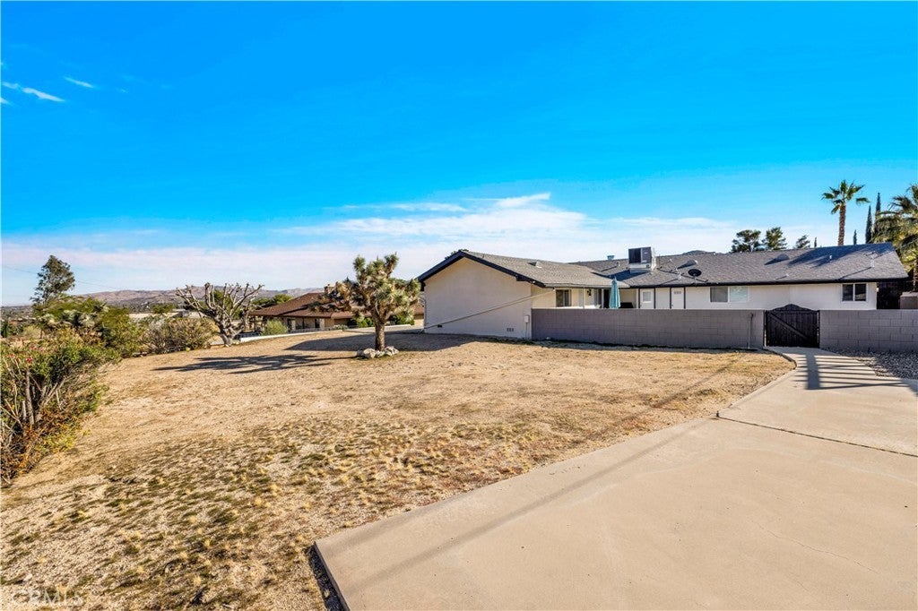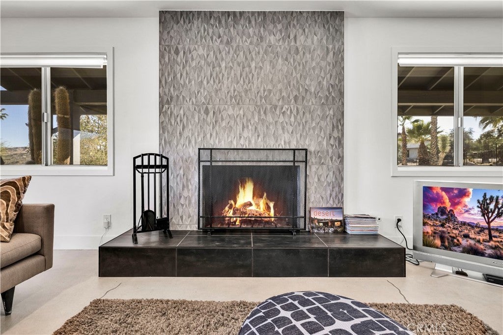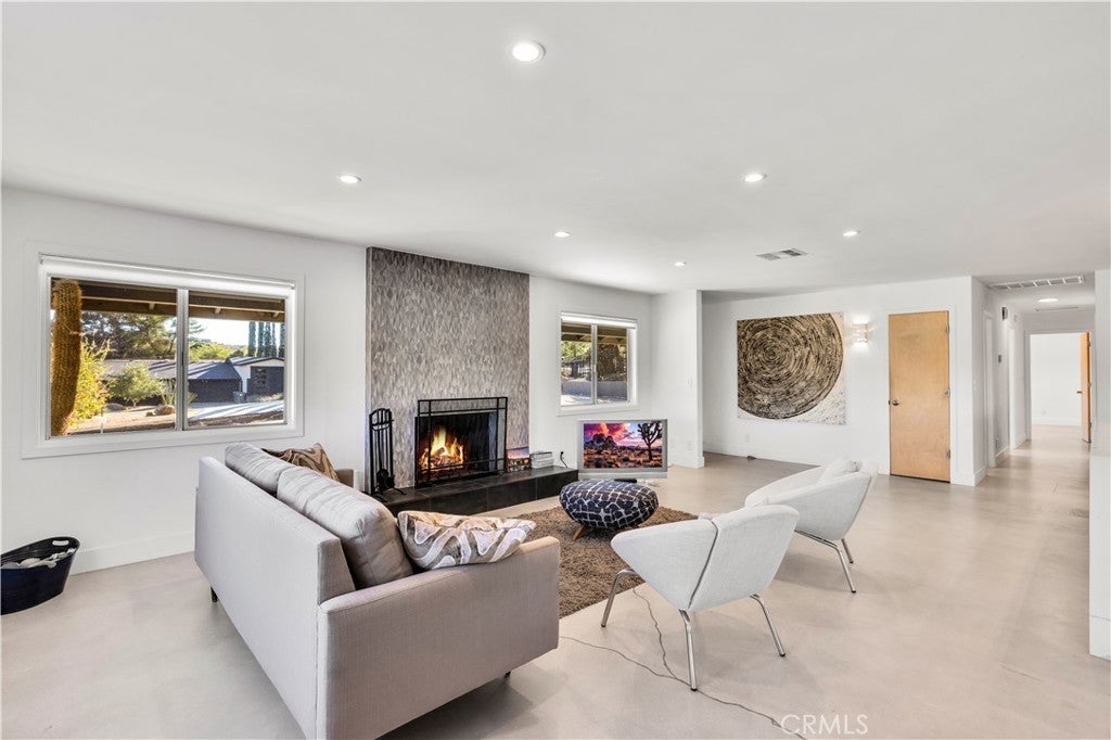 Your dream home awaits in this gorgeously appointed 3 bedroom, 2 bath home situated on just under 1/2 acre of land in the highly desirable Country Club area of Yucca Valley. As you approach the home, you'll love that the neighborhood is tucked close to the majestic desert hills that frame the valley, and appreciate the attached 2 car garage. Sleek, ultra-modern finishes greet you as you enter the home, which has been tastefully updated throughout. The massive main living area enjoys large windows to let in plenty of natural light, an impressive 0 clearance fireplace, and stylish lighting. Polished concrete flooring flows throughout the space, adding to the clean styling of the home. The kitchen is beautifully appointed with quartz waterfall countertops, modern wood cabinetry and all new stainless steel appliances - including a gas range and second oven for the discerning chef. A spacious room off the main living space is perfect for a bonus room or formal dining area, and features high wood-beamed ceilings and two sliding glass doors to access the outdoor living space. Moving on, you'll note the conveniently located laundry room with its own outside access as well. The guest bath continues the theme of modern style with a floating vanity and glass-doored walk-in shower, and each guest bedroom is airy and well let with plenty of closet space. The primary bedroom is huge with large windows and an attached bath with another floating vanity with full tile backsplash, large walk-in glass shower, and closet. Book a showing to experience this beautiful desert sanctuary for yourself.