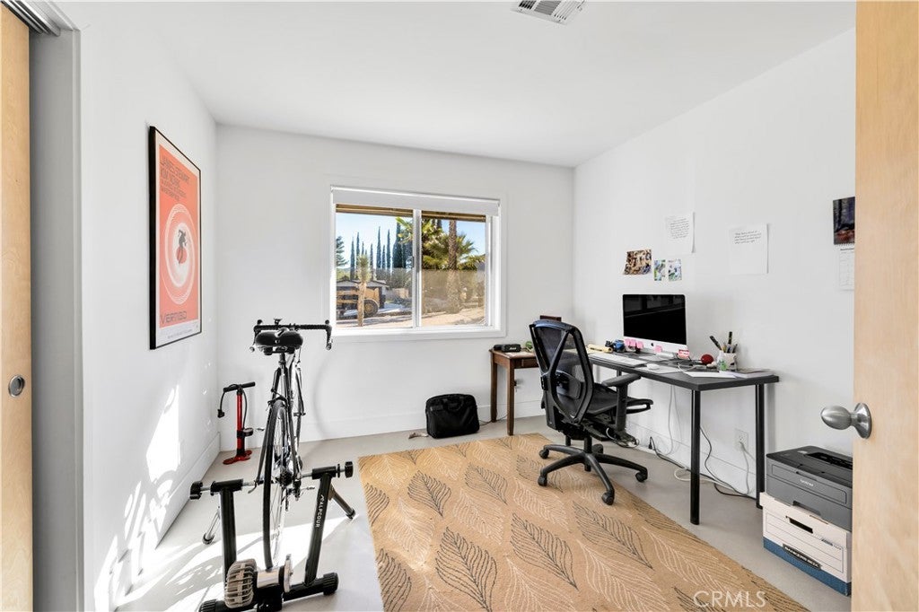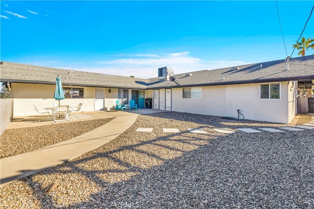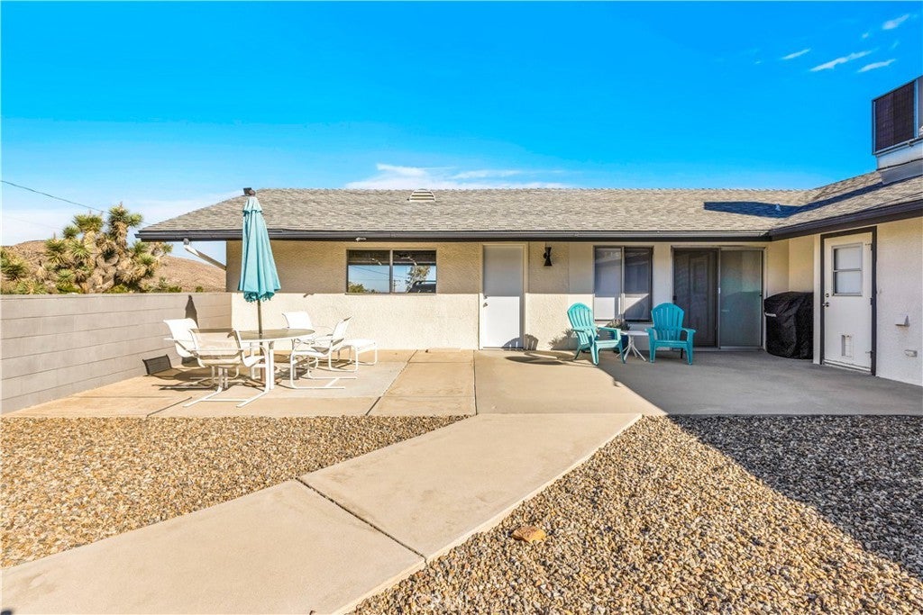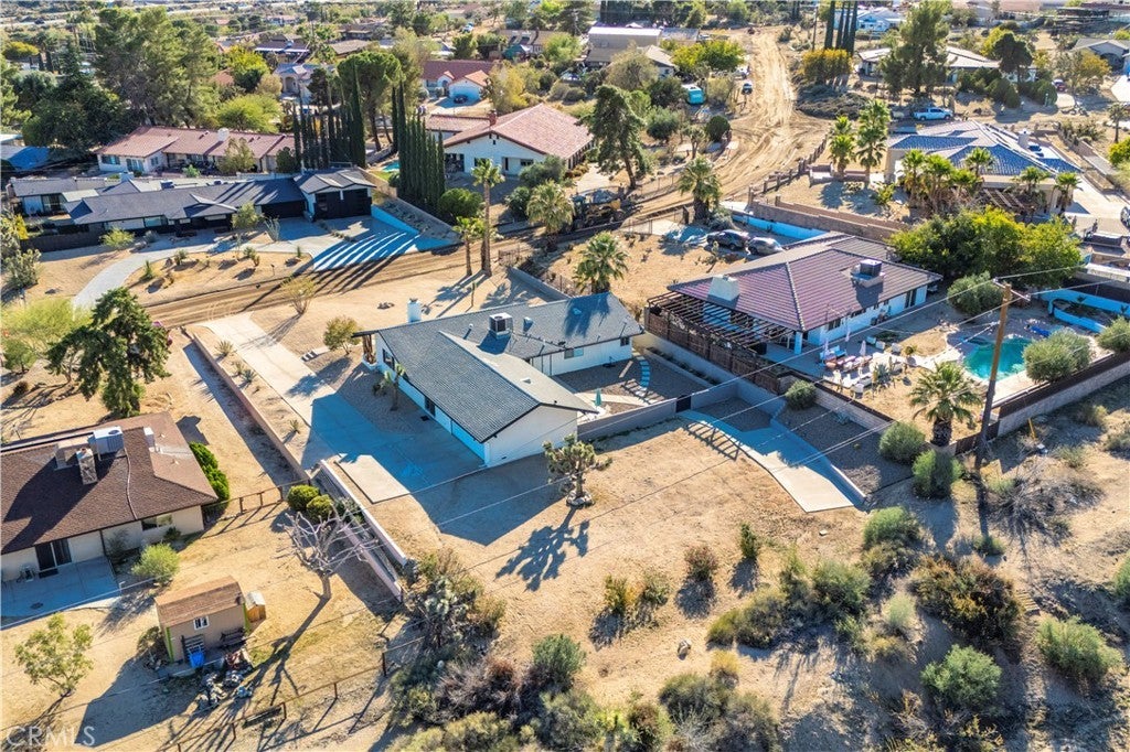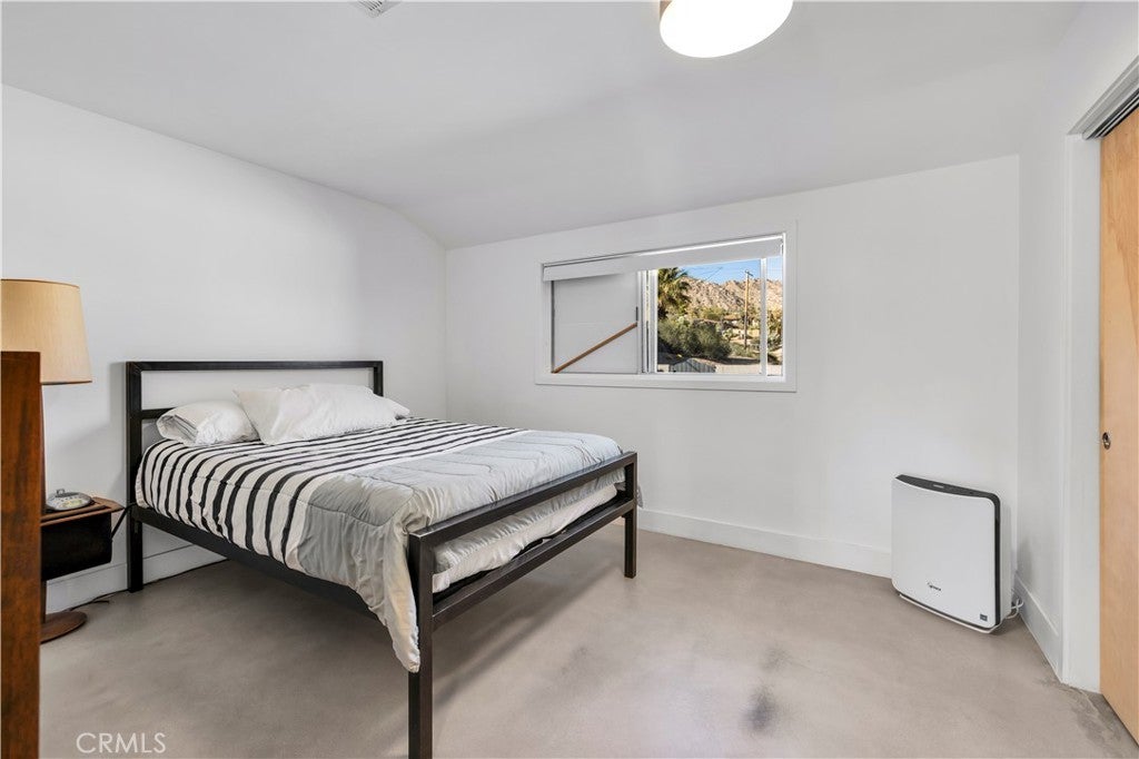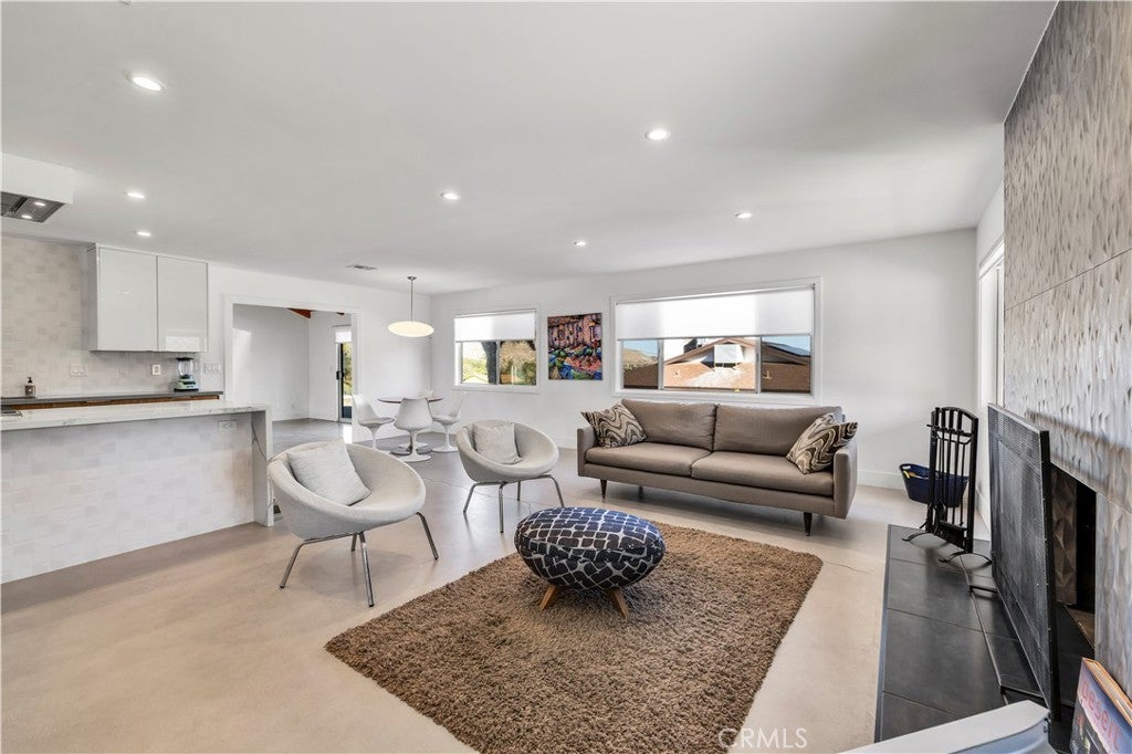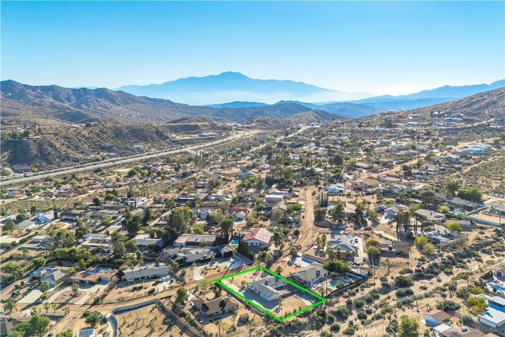 Your dream home awaits in this gorgeously appointed 3 bedroom, 2 bath home situated on just under 1/2 acre of land in the highly desirable Country Club area of Yucca Valley. As you approach the home, you'll love that the neighborhood is tucked close to the majestic desert hills that frame the valley, and appreciate the attached 2 car garage. Sleek, ultra-modern finishes greet you as you enter the home, which has been tastefully updated throughout. The massive main living area enjoys large windows to let in plenty of natural light, an impressive 0 clearance fireplace, and stylish lighting. Polished concrete flooring flows throughout the space, adding to the clean styling of the home. The kitchen is beautifully appointed with quartz waterfall countertops, modern wood cabinetry and all new stainless steel appliances - including a gas range and second oven for the discerning chef. A spacious room off the main living space is perfect for a bonus room or formal dining area, and features high wood-beamed ceilings and two sliding glass doors to access the outdoor living space. Moving on, you'll note the conveniently located laundry room with its own outside access as well. The guest bath continues the theme of modern style with a floating vanity and glass-doored walk-in shower, and each guest bedroom is airy and well let with plenty of closet space. The primary bedroom is huge with large windows and an attached bath with another floating vanity with full tile backsplash, large walk-in glass shower, and closet. Book a showing to experience this beautiful desert sanctuary for yourself.