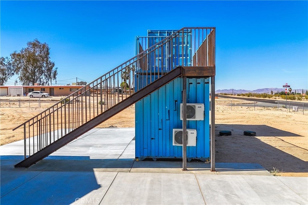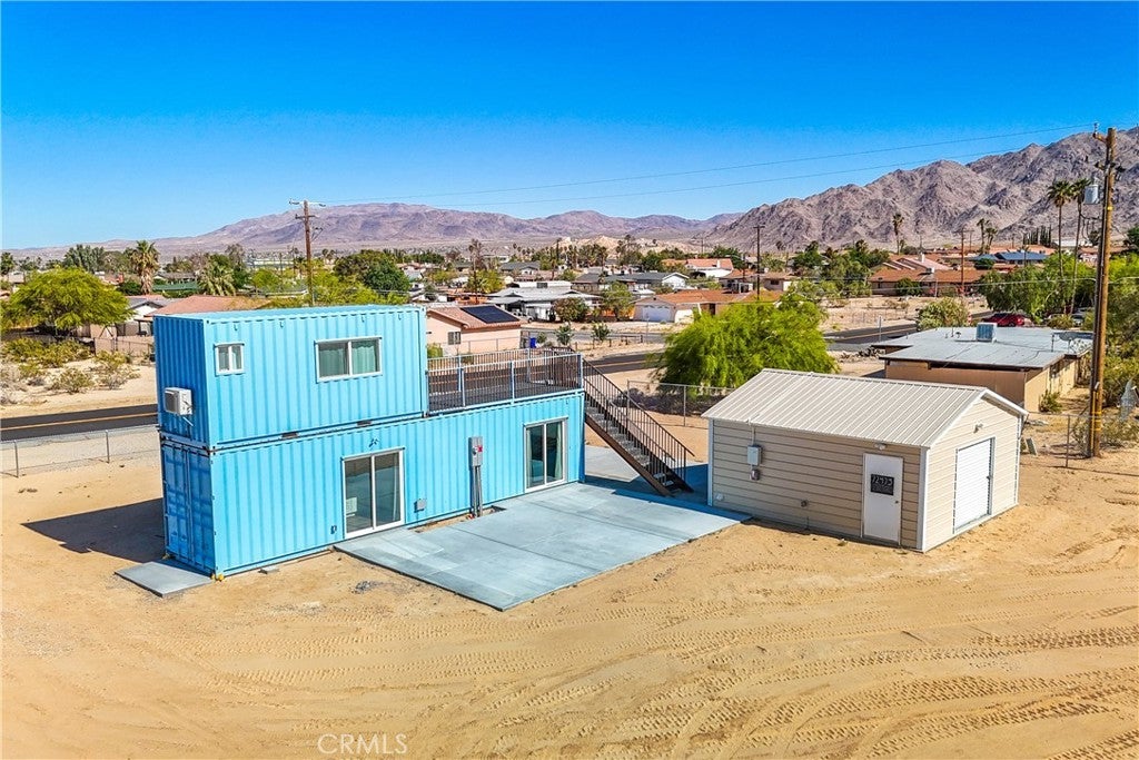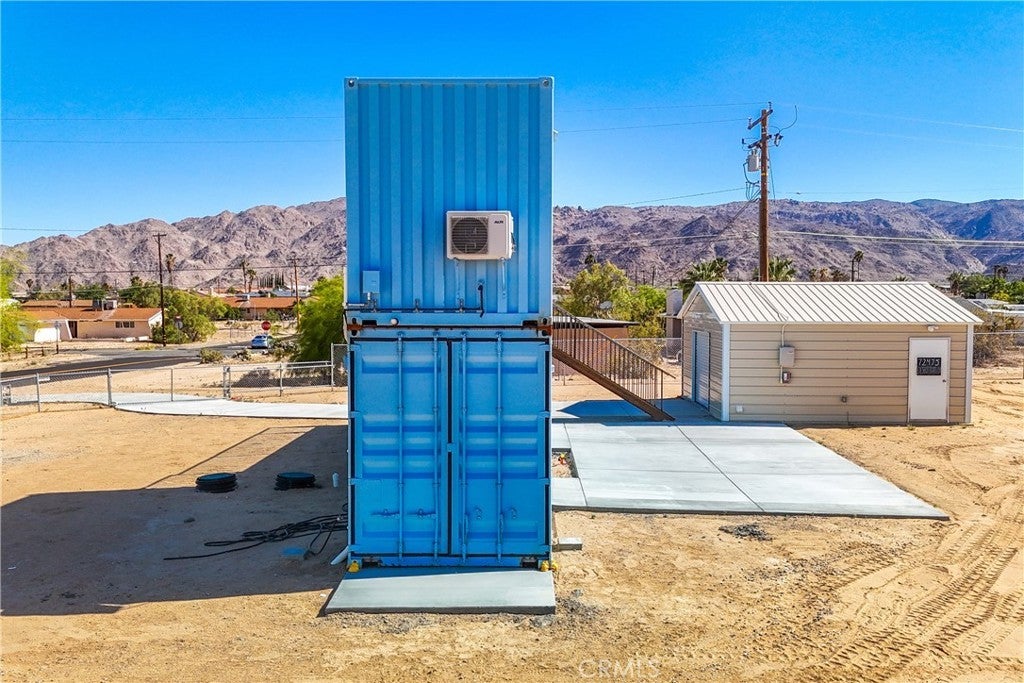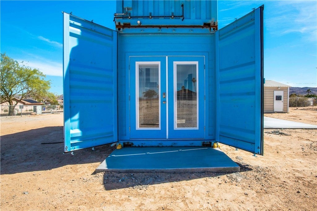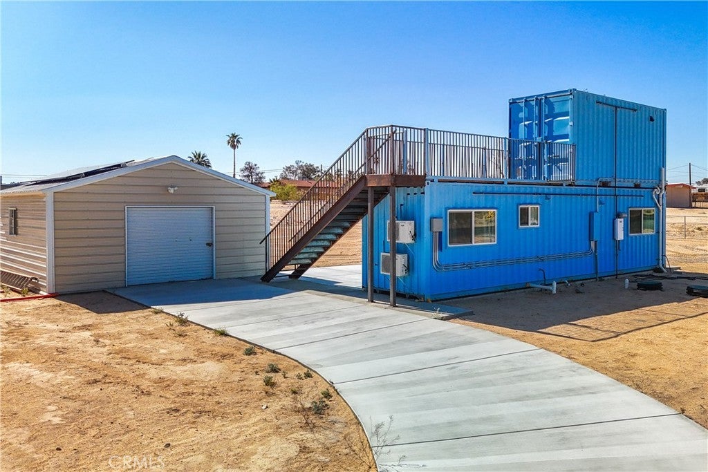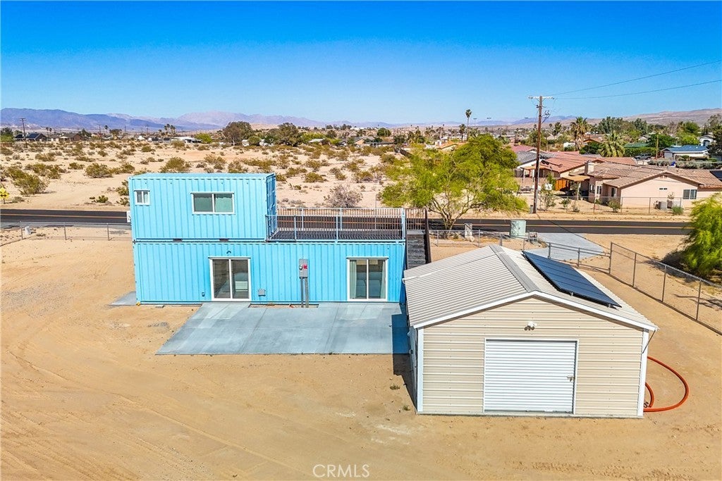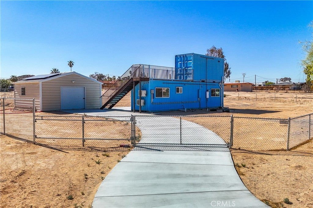 Unique Shipping Container Home on Over 1 Acre! Discover this extraordinary property, perfect for those seeking an eco-friendly, modern living experience in the vibrant heart of 29 Palms. This two-story shipping container home presents a rare opportunity to own a distinctive architectural gem in one of the area's most sought-after neighborhoods. Nestled on more than an acre of fenced land, this prime location offers easy access to downtown's trendy shopping and dining options, as well as the breathtaking Joshua Tree National Park. The expansive lot provides abundant space for expansion, whether you envision adding a pool, an outdoor kitchen, or other desirable amenities. Inside, the home features an open-concept design with beautiful stained wood floors, contemporary lighting, dual-pane windows, and energy-efficient mini-split HVAC units. The kitchen is equipped with modern appliances, butcher block countertops, and a deep sink, seamlessly merging with the living area. Both bathrooms are designed with stylish walk-in tiled showers, modern vanities, and built-in shelving. The main floor bedroom includes a ceiling fan, mini-split unit, and a sliding glass door that opens to the backyard, enhancing the indoor-outdoor flow. Upstairs, the primary suite is a true retreat, complete with a private balcony and an en-suite bath featuring a spacious walk-in shower. Adding to the property's allure is the oversized steel garage, ideal for vehicles, storage, or potential conversion into a gym or artist's studio. In the garage you'll also find an electric car charger and NEW washer & Dryer! With paved road access and an efficient solar power system, this exceptional offering is not to be missed. Seize the opportunity to own this one-of-a-kind shipping container home in the thriving community of 29 Palms. Schedule your private viewing today!
