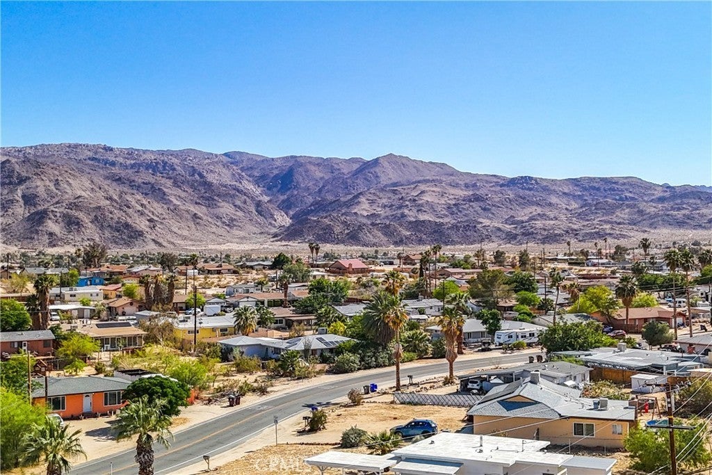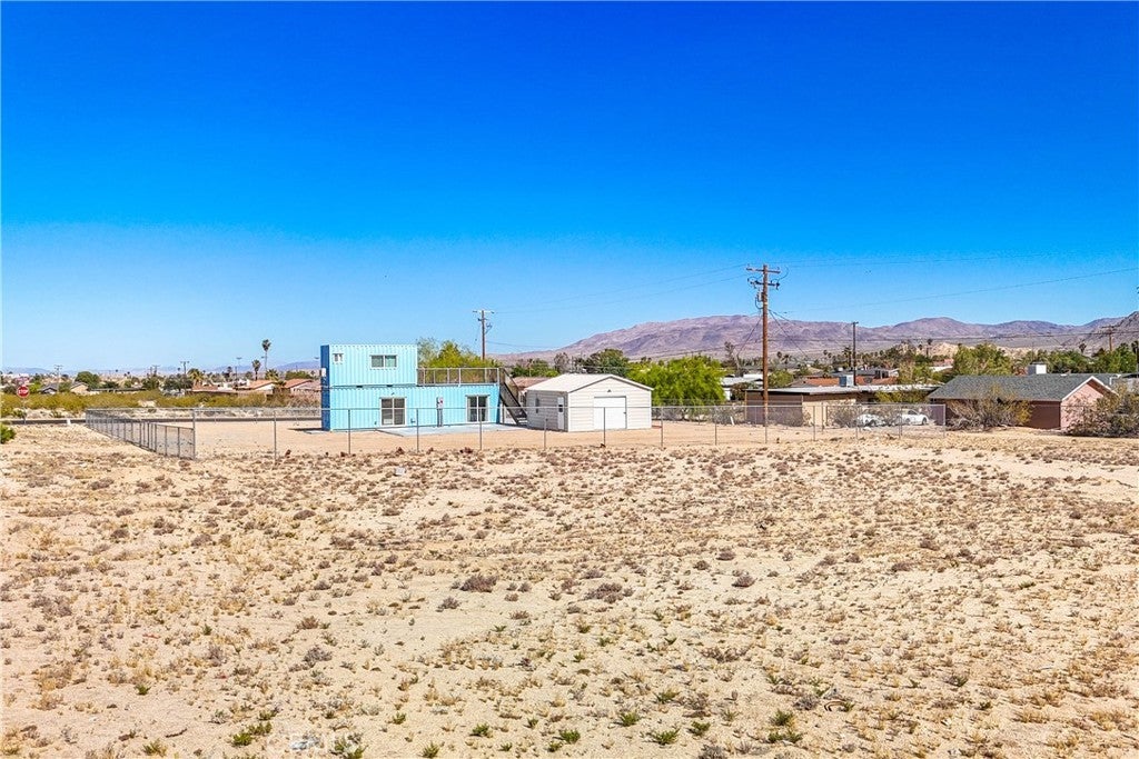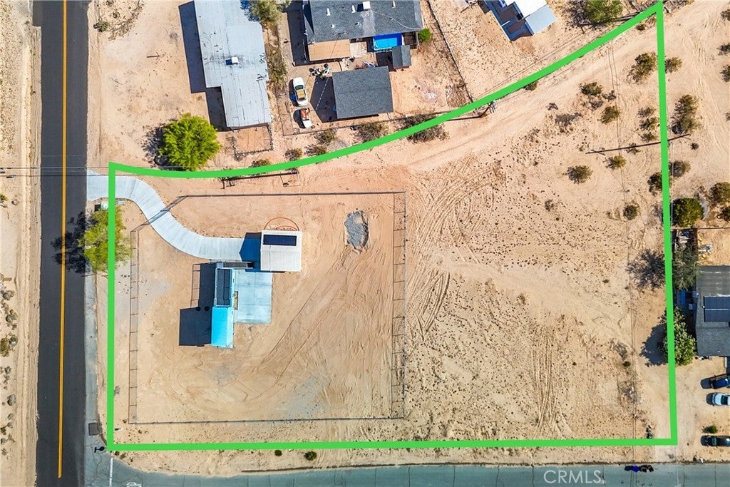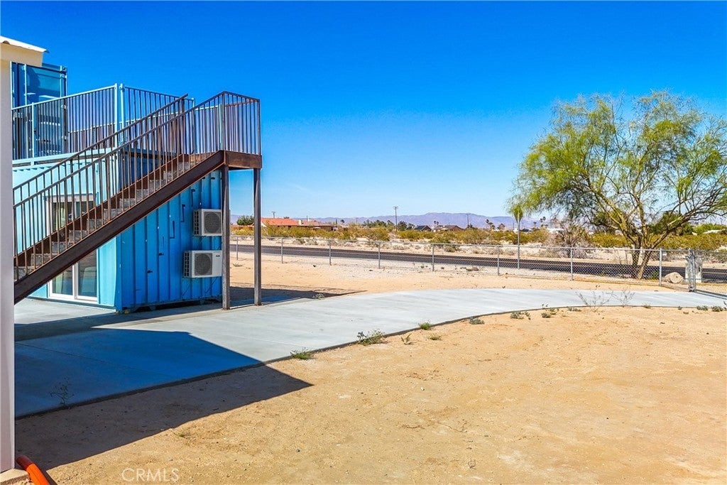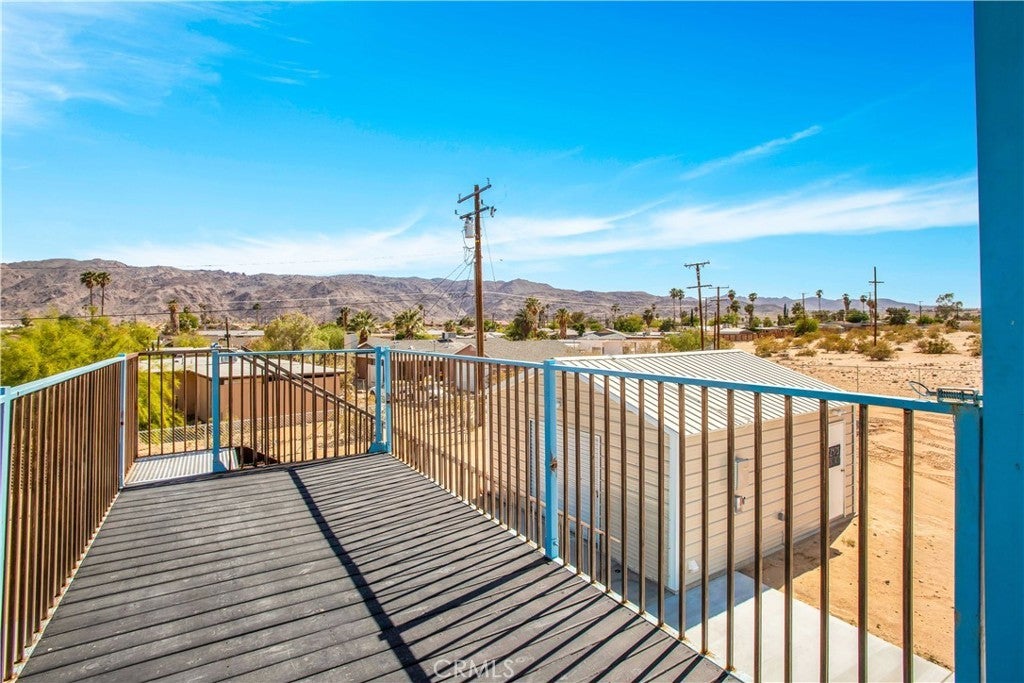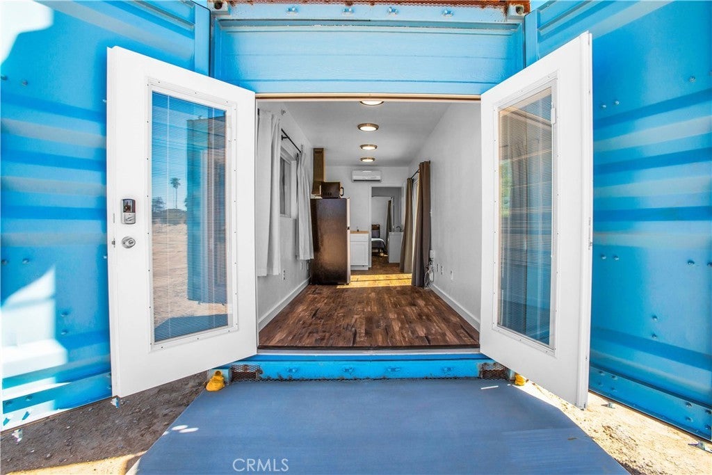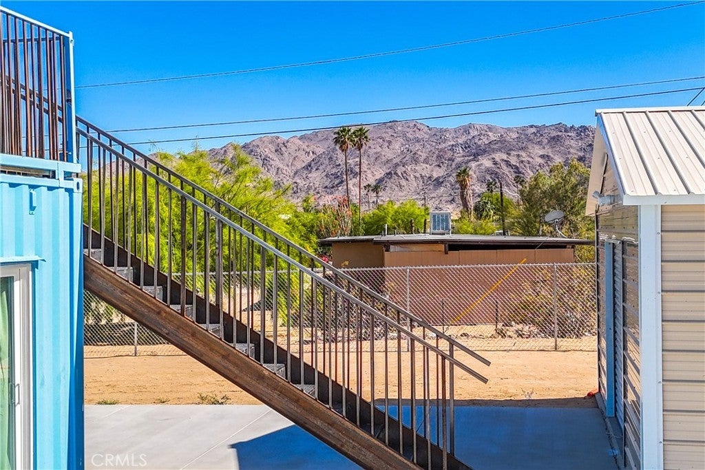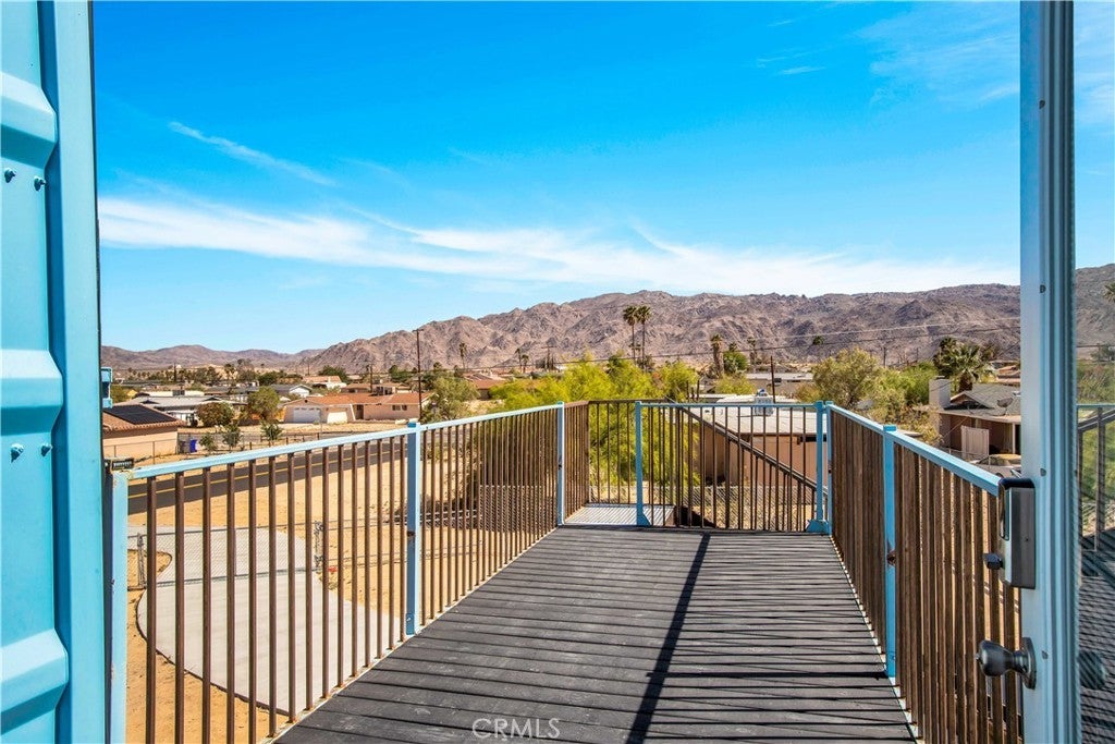 Unique Shipping Container Home on Over 1 Acre! Discover this extraordinary property, perfect for those seeking an eco-friendly, modern living experience in the vibrant heart of 29 Palms. This two-story shipping container home presents a rare opportunity to own a distinctive architectural gem in one of the area's most sought-after neighborhoods. Nestled on more than an acre of fenced land, this prime location offers easy access to downtown's trendy shopping and dining options, as well as the breathtaking Joshua Tree National Park. The expansive lot provides abundant space for expansion, whether you envision adding a pool, an outdoor kitchen, or other desirable amenities. Inside, the home features an open-concept design with beautiful stained wood floors, contemporary lighting, dual-pane windows, and energy-efficient mini-split HVAC units. The kitchen is equipped with modern appliances, butcher block countertops, and a deep sink, seamlessly merging with the living area. Both bathrooms are designed with stylish walk-in tiled showers, modern vanities, and built-in shelving. The main floor bedroom includes a ceiling fan, mini-split unit, and a sliding glass door that opens to the backyard, enhancing the indoor-outdoor flow. Upstairs, the primary suite is a true retreat, complete with a private balcony and an en-suite bath featuring a spacious walk-in shower. Adding to the property's allure is the oversized steel garage, ideal for vehicles, storage, or potential conversion into a gym or artist's studio. In the garage you'll also find an electric car charger and NEW washer & Dryer! With paved road access and an efficient solar power system, this exceptional offering is not to be missed. Seize the opportunity to own this one-of-a-kind shipping container home in the thriving community of 29 Palms. Schedule your private viewing today!