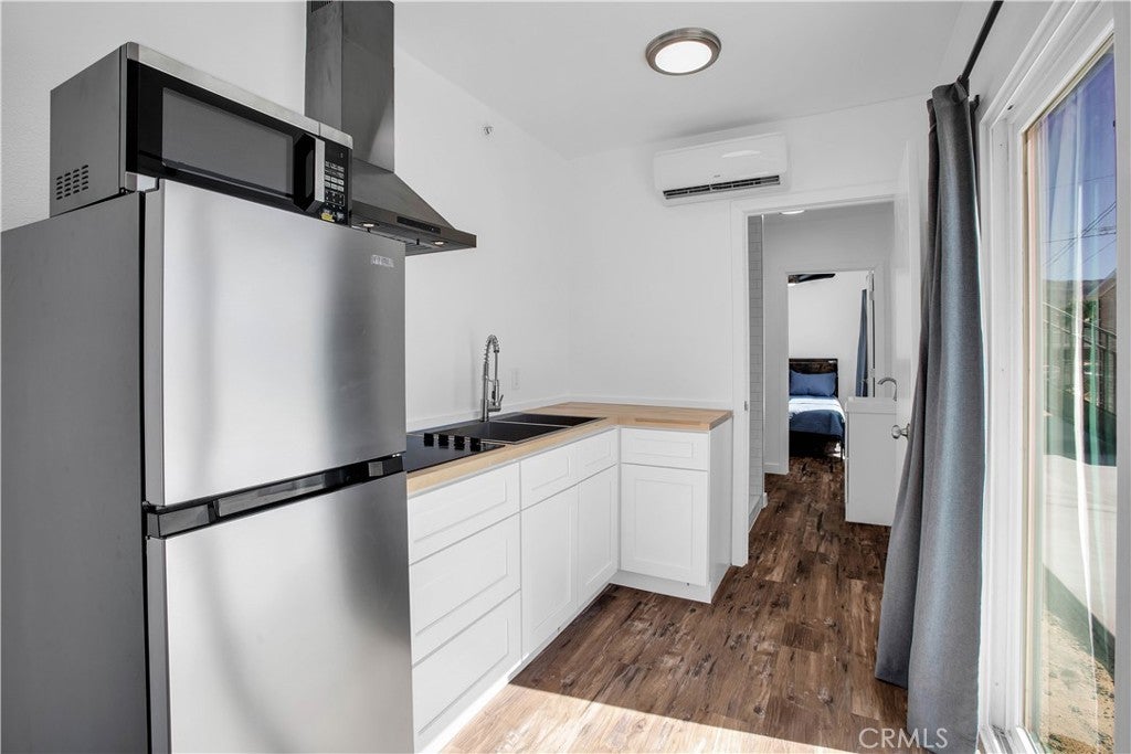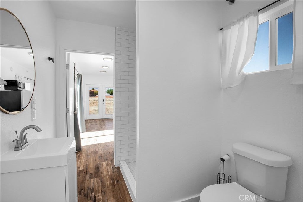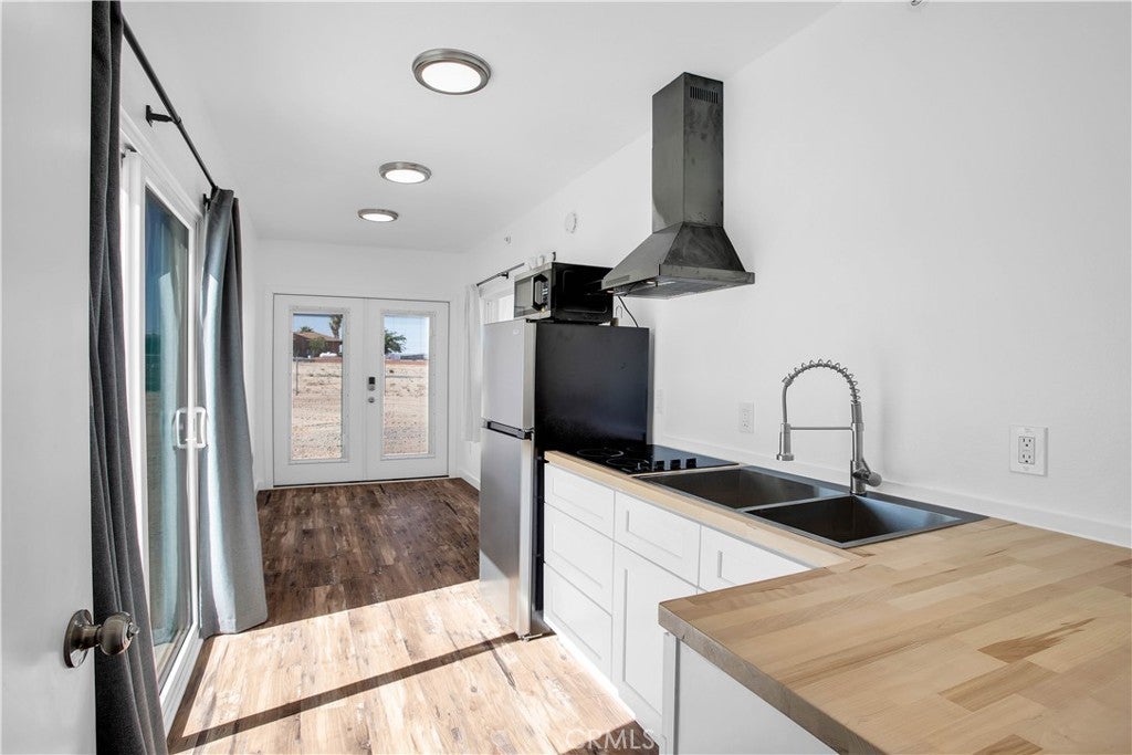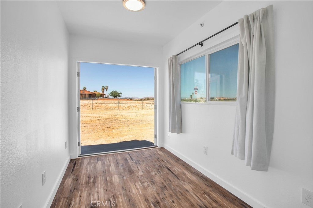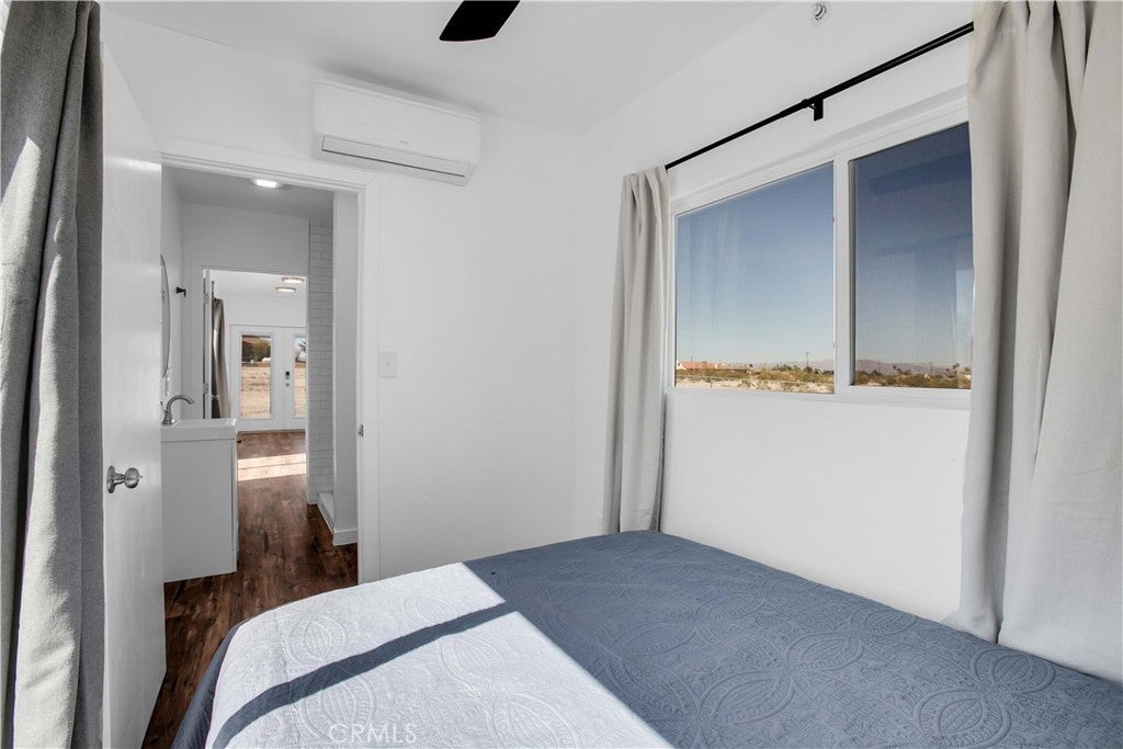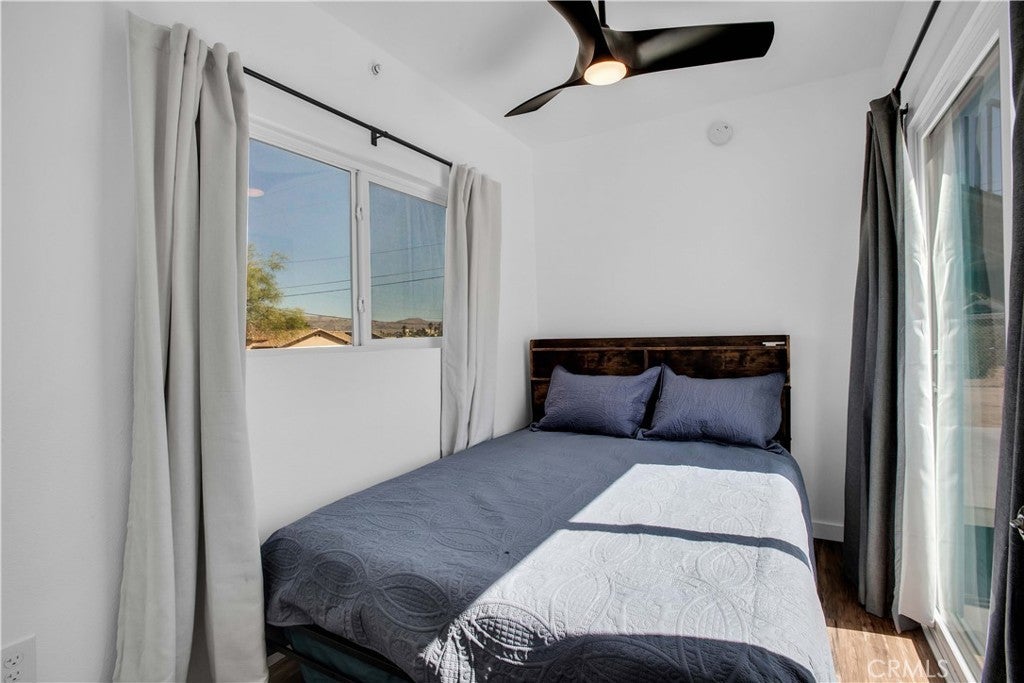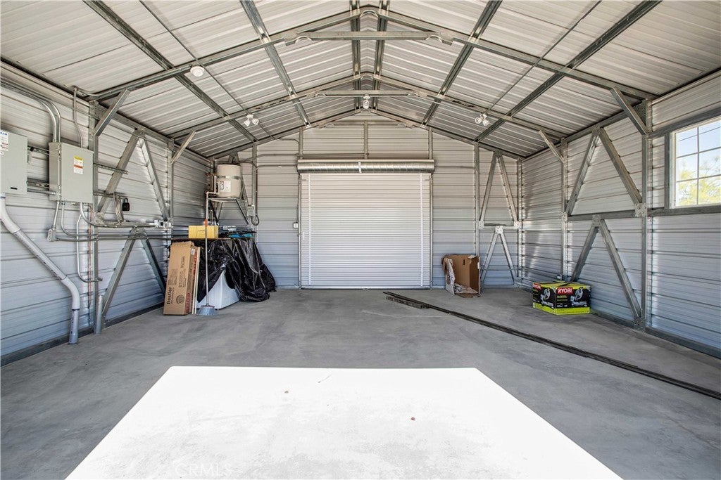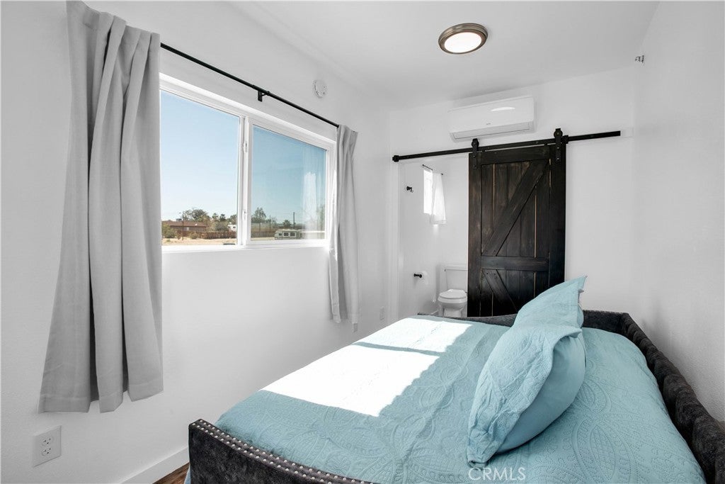 Unique Shipping Container Home on Over 1 Acre! Discover this extraordinary property, perfect for those seeking an eco-friendly, modern living experience in the vibrant heart of 29 Palms. This two-story shipping container home presents a rare opportunity to own a distinctive architectural gem in one of the area's most sought-after neighborhoods. Nestled on more than an acre of fenced land, this prime location offers easy access to downtown's trendy shopping and dining options, as well as the breathtaking Joshua Tree National Park. The expansive lot provides abundant space for expansion, whether you envision adding a pool, an outdoor kitchen, or other desirable amenities. Inside, the home features an open-concept design with beautiful stained wood floors, contemporary lighting, dual-pane windows, and energy-efficient mini-split HVAC units. The kitchen is equipped with modern appliances, butcher block countertops, and a deep sink, seamlessly merging with the living area. Both bathrooms are designed with stylish walk-in tiled showers, modern vanities, and built-in shelving. The main floor bedroom includes a ceiling fan, mini-split unit, and a sliding glass door that opens to the backyard, enhancing the indoor-outdoor flow. Upstairs, the primary suite is a true retreat, complete with a private balcony and an en-suite bath featuring a spacious walk-in shower. Adding to the property's allure is the oversized steel garage, ideal for vehicles, storage, or potential conversion into a gym or artist's studio. In the garage you'll also find an electric car charger and NEW washer & Dryer! With paved road access and an efficient solar power system, this exceptional offering is not to be missed. Seize the opportunity to own this one-of-a-kind shipping container home in the thriving community of 29 Palms. Schedule your private viewing today!