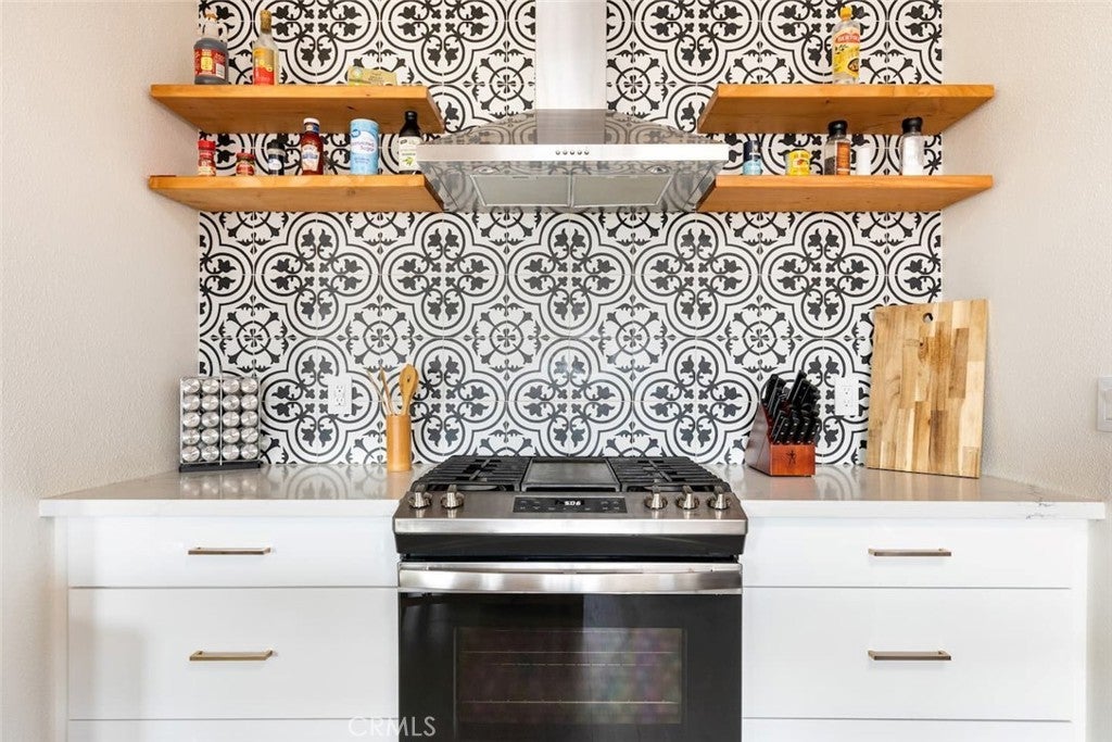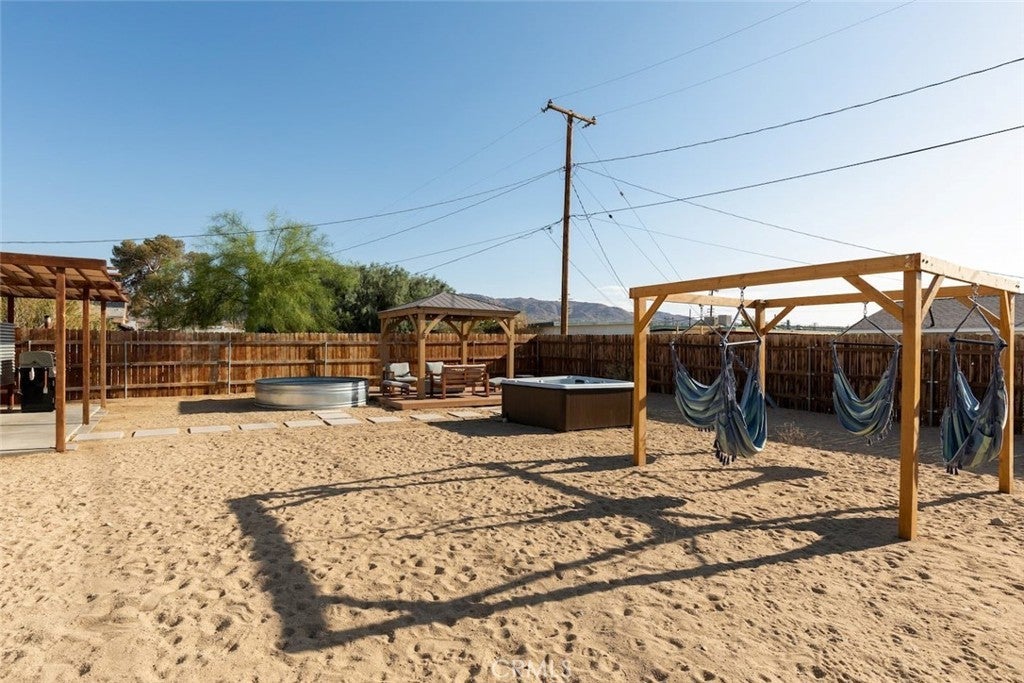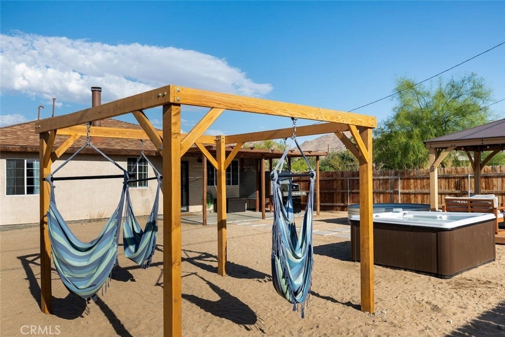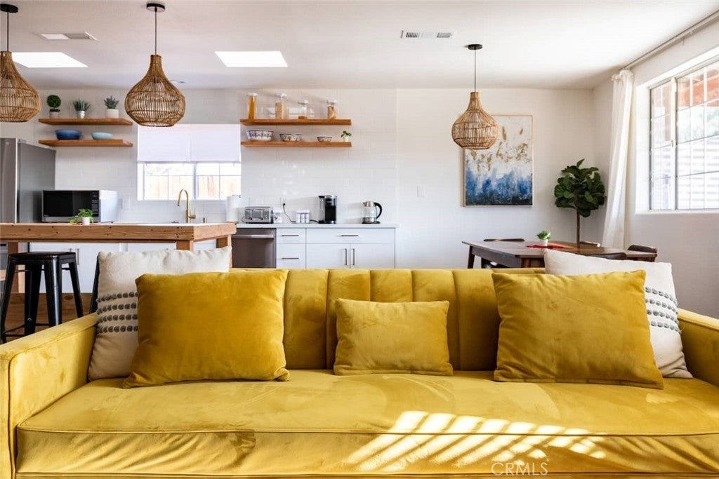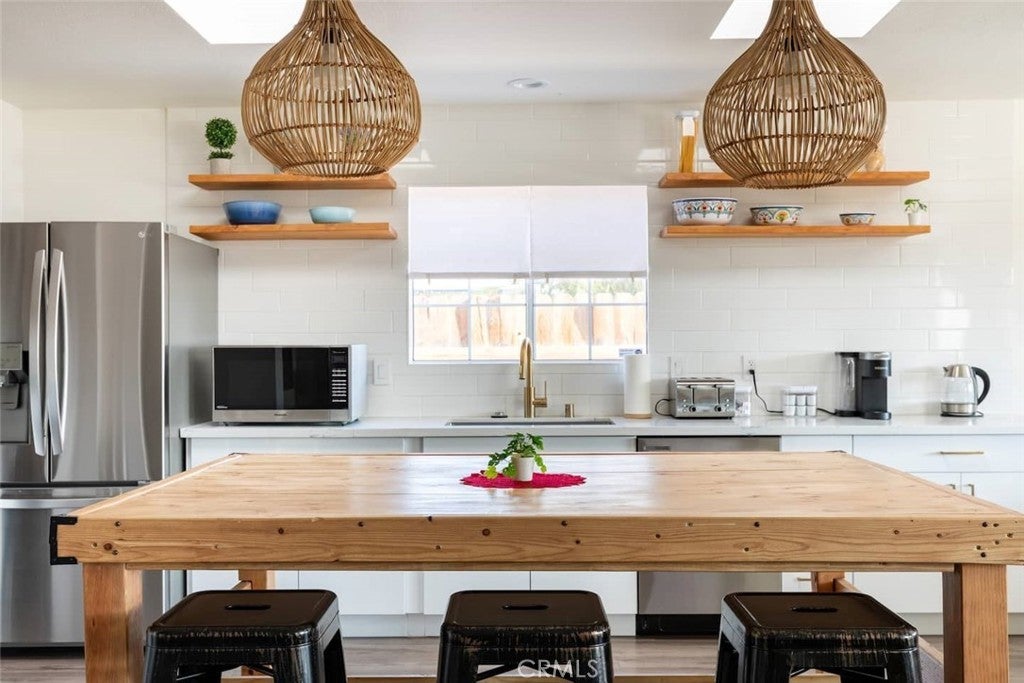 Spacious & Beautifully Updated – no expense spared – home, featuring fireplace in living area. Kitchen showcases quartz countertops and counter-to-ceiling subway tile backsplash with floating shelves. Stove alcove features custom designed counter-to-ceiling tile backsplash as well. High quality appliances throughout. Bathroom has pebble shower flooring and floor-to-ceiling tiles, hi-end vanity, fixtures and toilet. Hot tub in backyard for stargazing. Centrally located, close to downtown dining and shopping and only minutes to the front gate of Joshua Tree National Park.