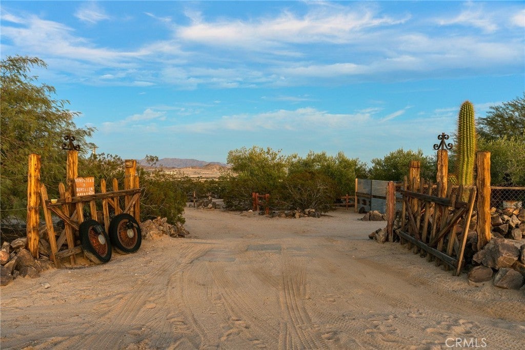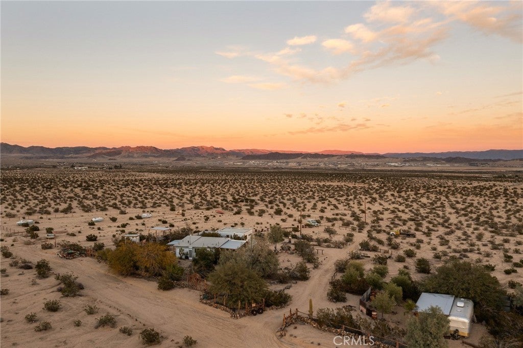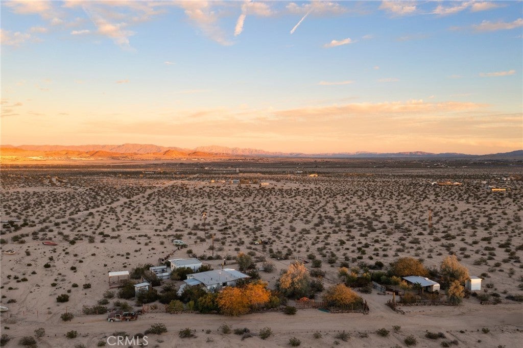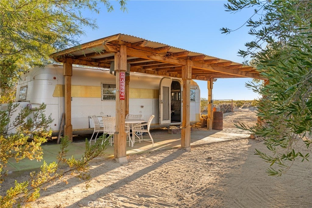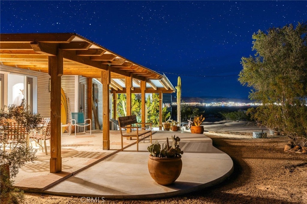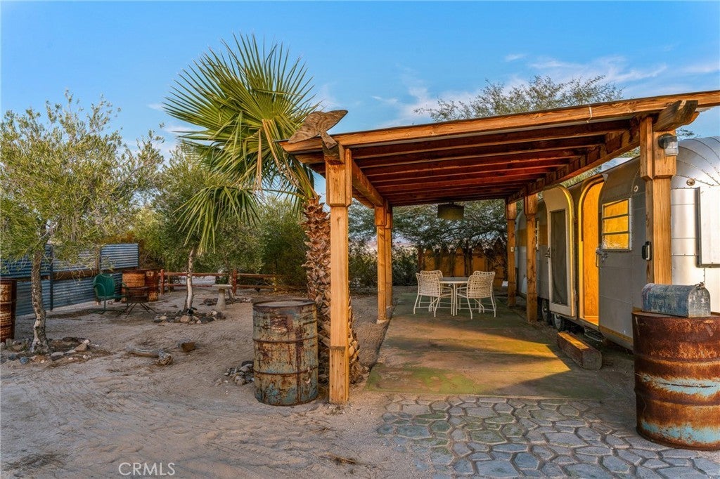 Discover your own private desert haven, where elegance and nature blend seamlessly on five enchanting acres. This remarkable compound invites you to experience a lifestyle of tranquil charm. At its heart lies a beautifully designed two-bedroom, two-bathroom main house, accompanied by a cozy studio casita complete with its own kitchenette and bath. Adding to the allure is a fully functional vintage Airstream station, thoughtfully connected to its own septic, water, and power, making it a perfect standalone retreat space. Every detail here is crafted for comfort and ease. With three newly updated septic systems and a modern electrical setup, you can enjoy peace of mind. There’s also an EV charger for added convenience. Step outside and find yourself surrounded by lush, mature olive trees and vibrant gardens, creating a green sanctuary that invites relaxation. Bordering open BLM land, you’ll enjoy breathtaking 360-degree mountain views and exceptionally dark skies perfect for stargazing. Just minutes from the western entrance of Joshua Tree National Park and the charm of downtown Joshua Tree and 29 Palms, this fully furnished short-term rental is a ready-made retreat. Whether you're looking for a perfect primary residence, a short-term rental opportunity, or a flexible mixed-use getaway, this property offers endless possibilities. (NOTE: Tax Records state 2-bedroom, 1-bathroom. Buyer is responsible to research to see if work was done with permits, and to confirm that this is a SFR and not a Rec Cabin zoning.)