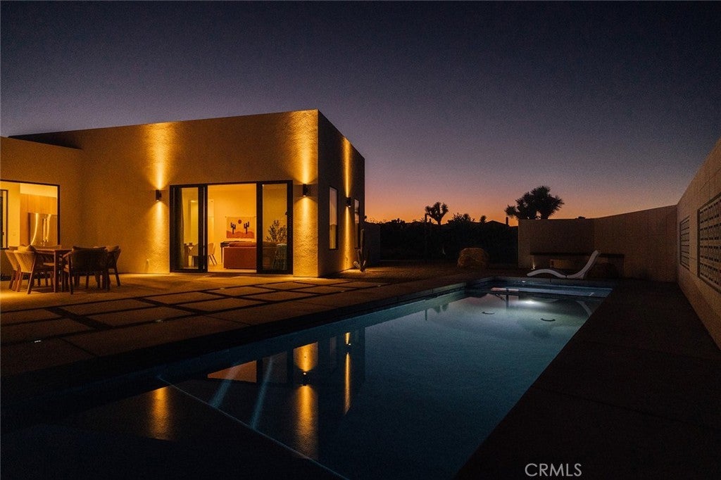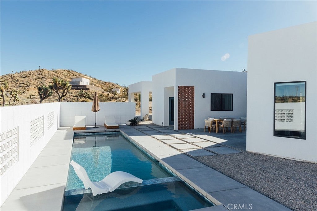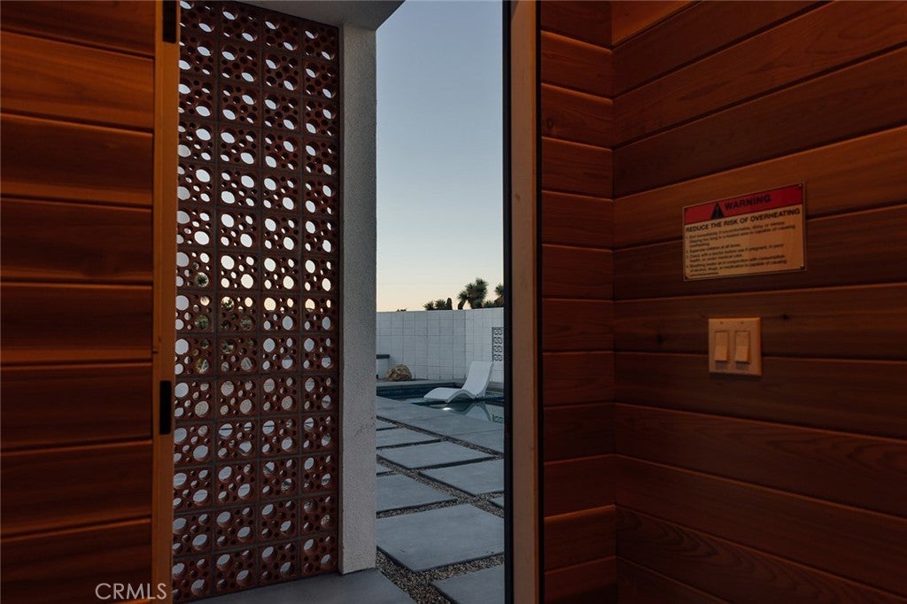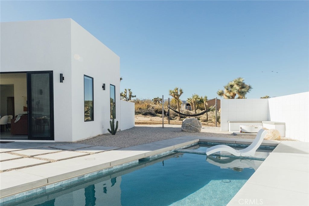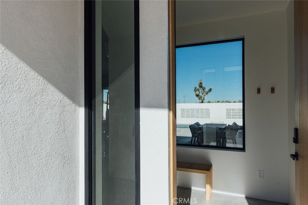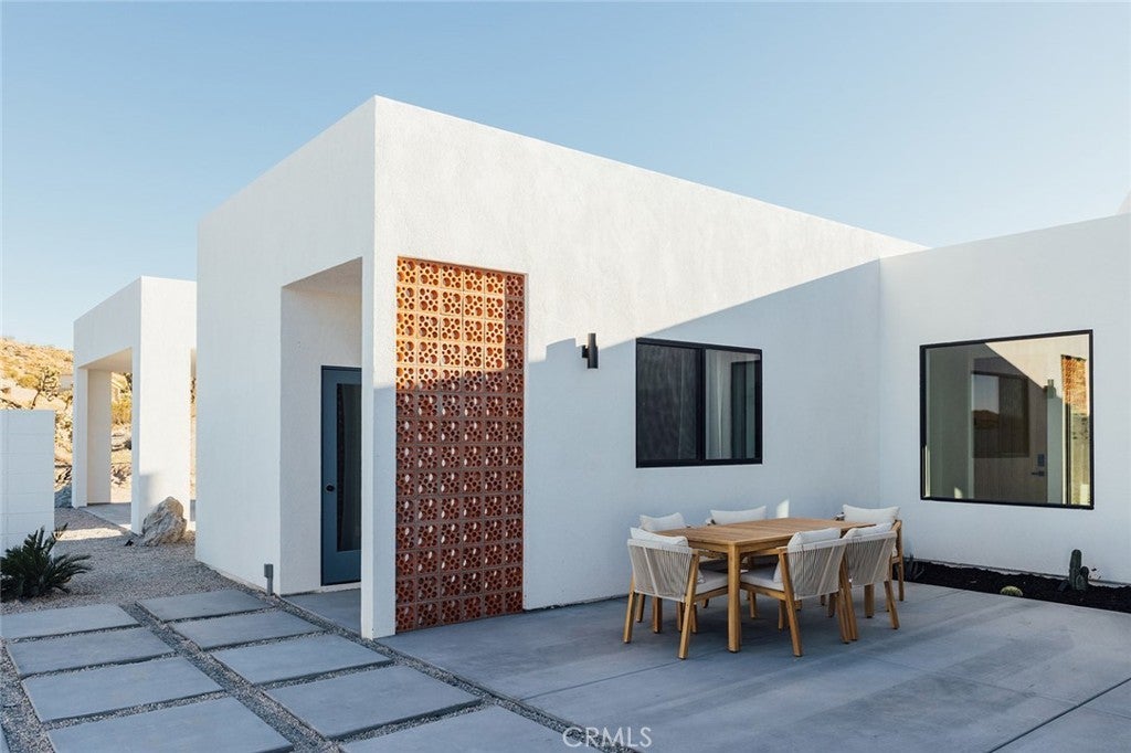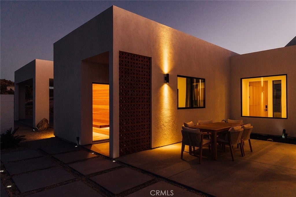 Welcome to your desert oasis at 57885 Sierra Vista. Set just above the road and backed by the hills of Buena Vista South, this modern, architect-designed home feels private, peaceful, and deeply connected to the landscape around it. Light moves gently through the space as the day unfolds, and evenings bring wide, open sunsets with views reaching all the way to San Gorgonio – Moments that never get old. An oversized mahogany front door opens into the simple, beautiful entry where your eye is immediately drawn through a picture window to the private courtyard and pool beyond. Inside, the open kitchen and living area feels airy without being oversized, thanks to 10-foot ceilings and a thoughtful layout. Moroccan zellige tiles run throughout the home, adding warmth and texture, while a custom built-in bookshelf gives the livingroom personality and purpose. Easy indoor/outdoor living and dining is accessible with the massive glass double-sliding doors. The kitchen is finished with Bosch appliances, ample storage, and a smart flow that works just as well for entertaining as it does for everyday living. A conveniently placed half bath sits just off the entry. The bedroom layout is intentionally designed for privacy. Each room is set apart and finished with 9-foot ceilings, creating a calm, restful feel throughout. The primary suite is a true retreat, with a walk-in closet, double vanity, spa-like soaking tub, and separate walk-in shower. Two additional bedrooms and a shared bath, as well as outdoor shower, are tucked quietly at the opposite end of the home. Not to be outdone by the interior, outside is where this home really comes to life. A private, block-walled courtyard centers around a heated 35-foot saltwater pool and spa. Nearby, a cedar sauna and outdoor shower sit behind a sculptural terra-cotta breezeblock wall. A built-in firepit with seating and nearby hammocks create the kind of space where evenings stretch longer than planned. With an elevated lot, two-car carport, Tesla charger, Starlink WiFi, and incredible light throughout the day, this is a home that’s easy to love and hard to leave. Offered fully furnished and completely turnkey, this amazing desert residence is ready to move into or place directly into service as an investment property with high-cashflow potential. Don’t let this opportunity pass you by – Call your agent for a private showing today.