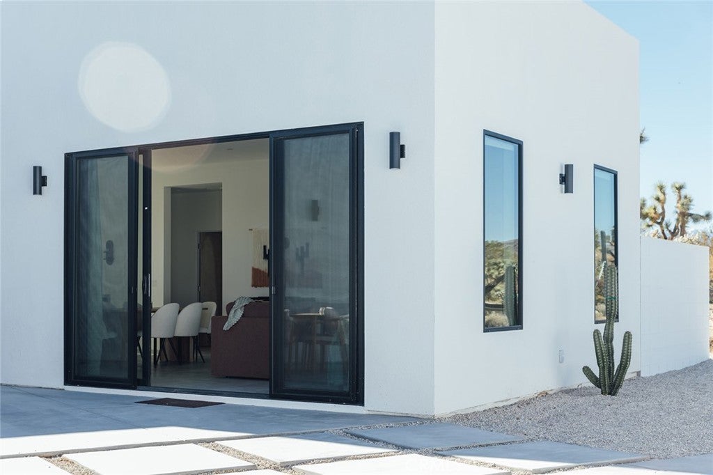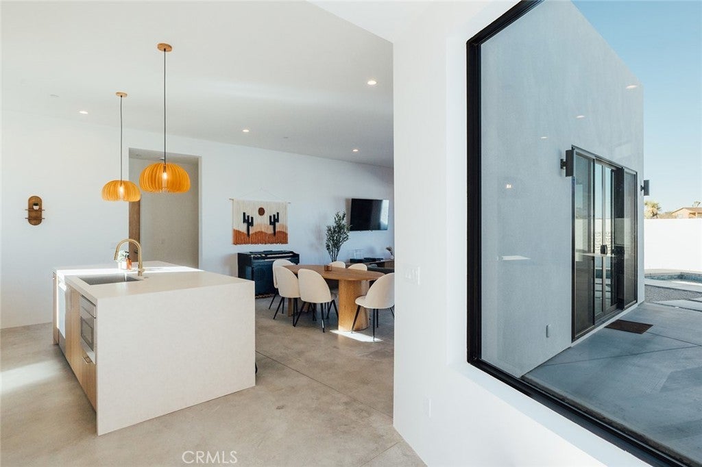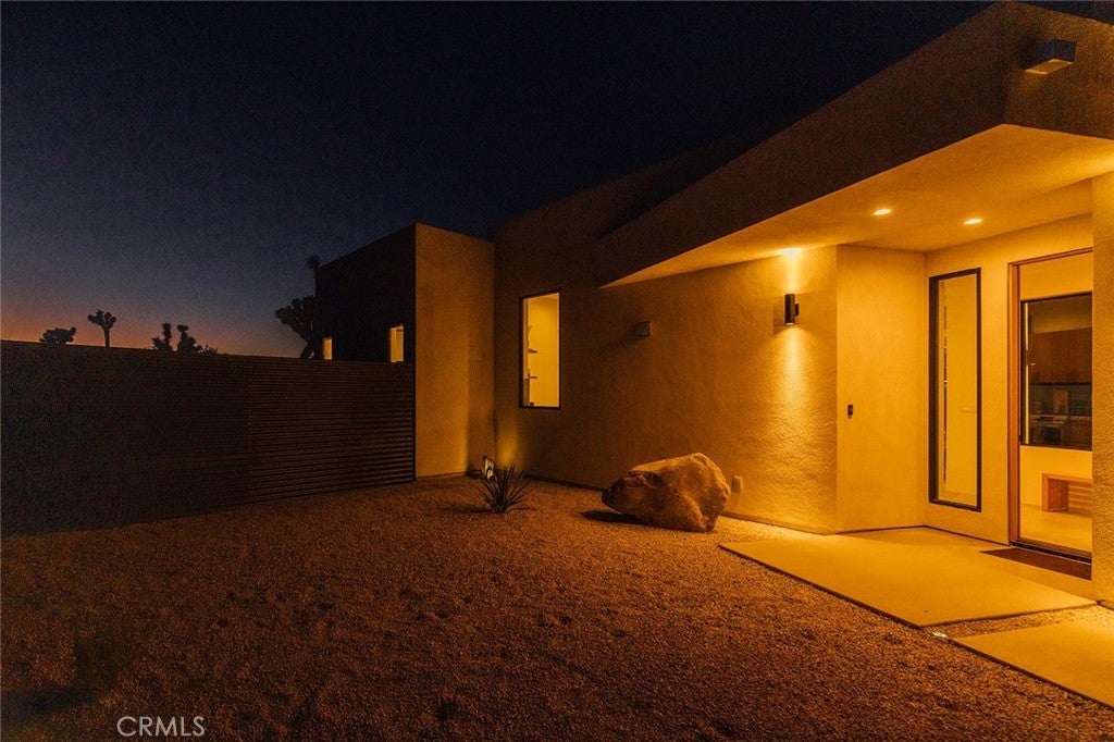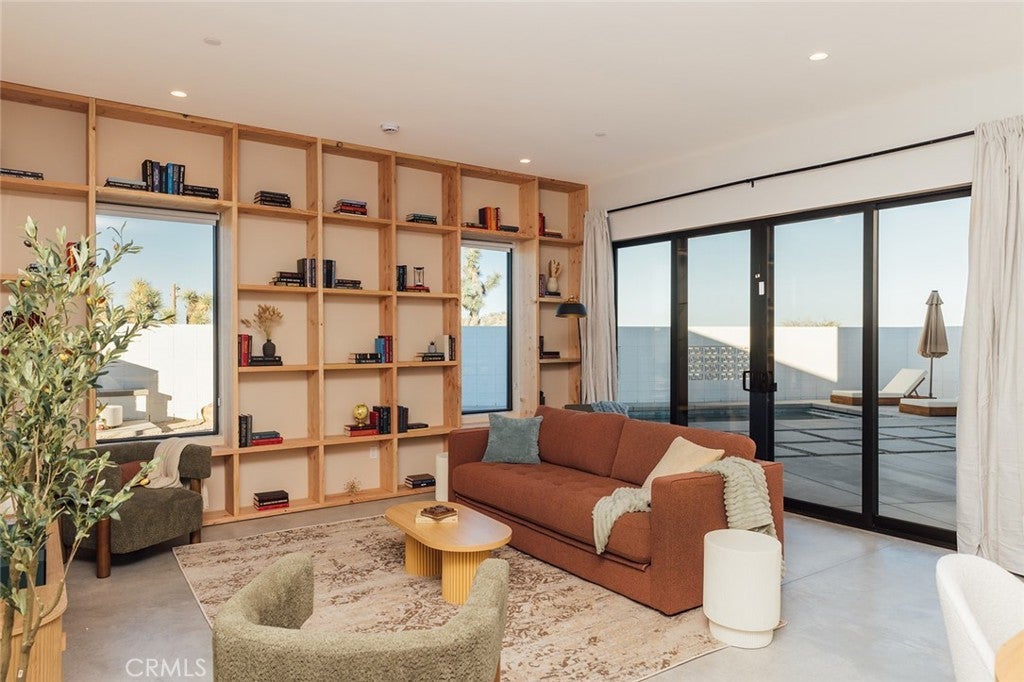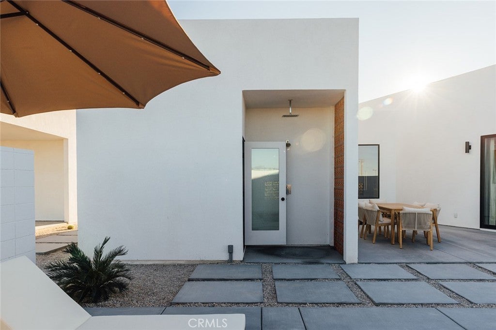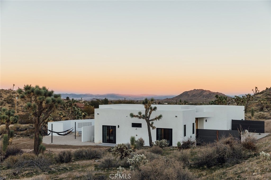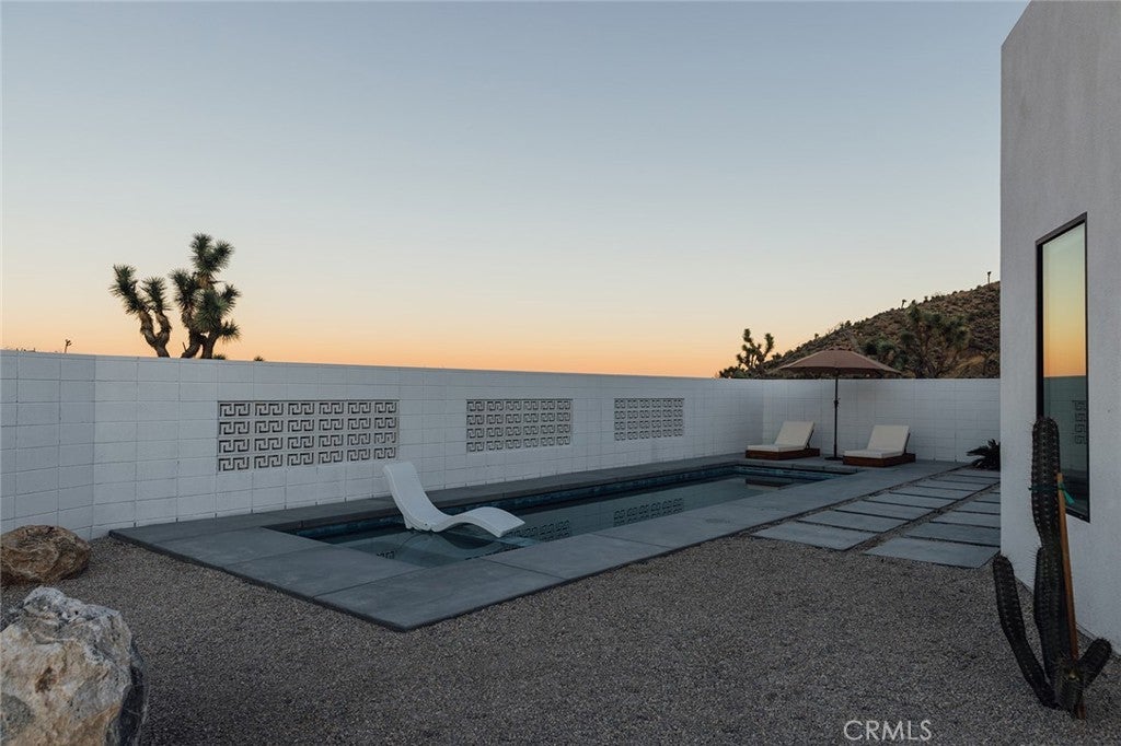 Welcome to your desert oasis at 57885 Sierra Vista. Set just above the road and backed by the hills of Buena Vista South, this modern, architect-designed home feels private, peaceful, and deeply connected to the landscape around it. Light moves gently through the space as the day unfolds, and evenings bring wide, open sunsets with views reaching all the way to San Gorgonio – Moments that never get old. An oversized mahogany front door opens into the simple, beautiful entry where your eye is immediately drawn through a picture window to the private courtyard and pool beyond. Inside, the open kitchen and living area feels airy without being oversized, thanks to 10-foot ceilings and a thoughtful layout. Moroccan zellige tiles run throughout the home, adding warmth and texture, while a custom built-in bookshelf gives the livingroom personality and purpose. Easy indoor/outdoor living and dining is accessible with the massive glass double-sliding doors. The kitchen is finished with Bosch appliances, ample storage, and a smart flow that works just as well for entertaining as it does for everyday living. A conveniently placed half bath sits just off the entry. The bedroom layout is intentionally designed for privacy. Each room is set apart and finished with 9-foot ceilings, creating a calm, restful feel throughout. The primary suite is a true retreat, with a walk-in closet, double vanity, spa-like soaking tub, and separate walk-in shower. Two additional bedrooms and a shared bath, as well as outdoor shower, are tucked quietly at the opposite end of the home. Not to be outdone by the interior, outside is where this home really comes to life. A private, block-walled courtyard centers around a heated 35-foot saltwater pool and spa. Nearby, a cedar sauna and outdoor shower sit behind a sculptural terra-cotta breezeblock wall. A built-in firepit with seating and nearby hammocks create the kind of space where evenings stretch longer than planned. With an elevated lot, two-car carport, Tesla charger, Starlink WiFi, and incredible light throughout the day, this is a home that’s easy to love and hard to leave. Offered fully furnished and completely turnkey, this amazing desert residence is ready to move into or place directly into service as an investment property with high-cashflow potential. Don’t let this opportunity pass you by – Call your agent for a private showing today.