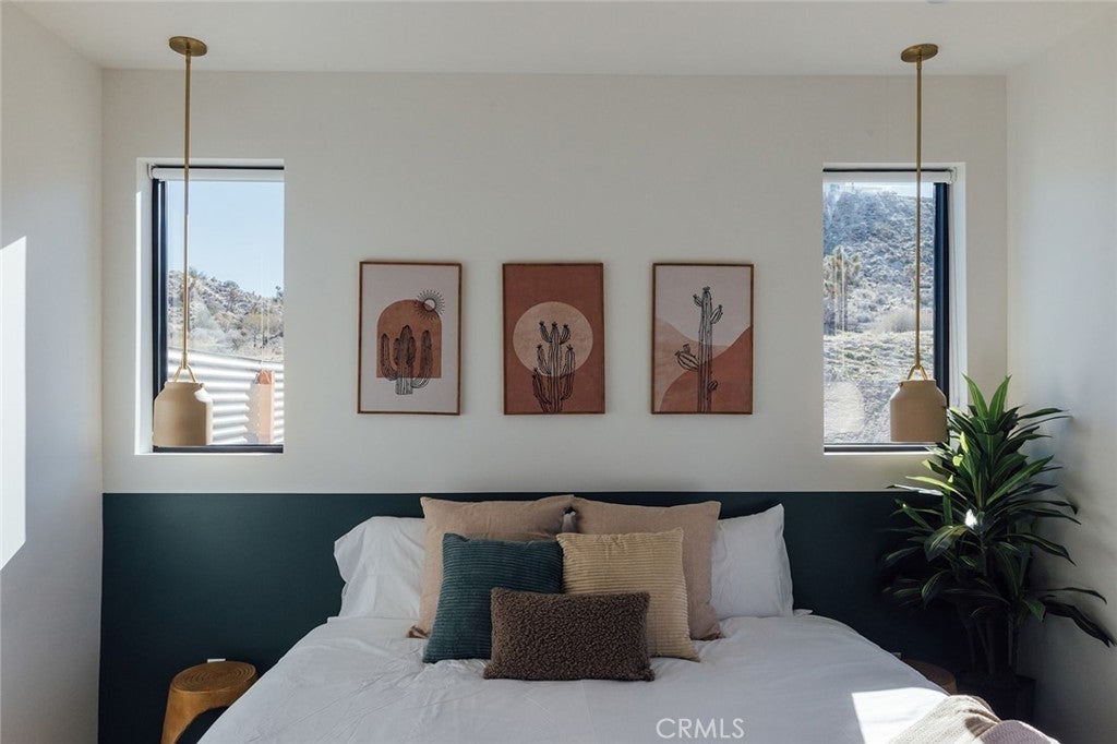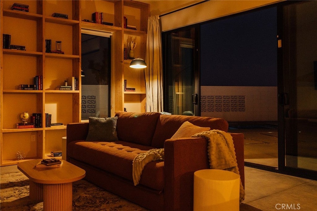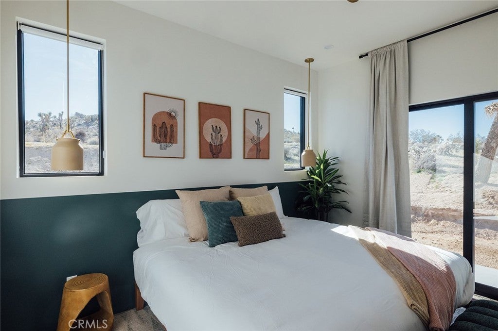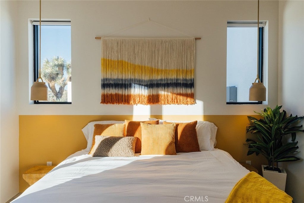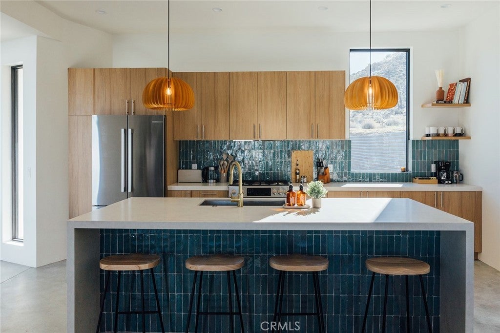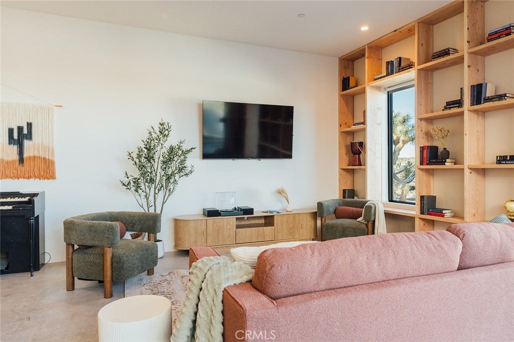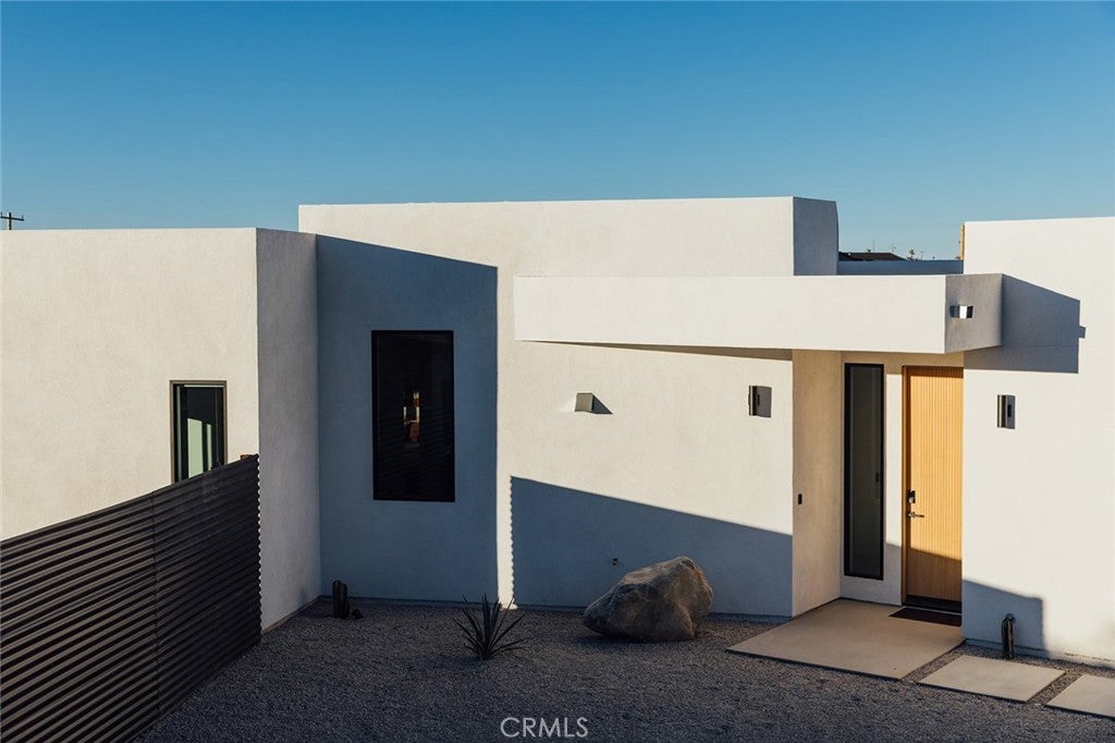 Welcome to your desert oasis at 57885 Sierra Vista. Set just above the road and backed by the hills of Buena Vista South, this modern, architect-designed home feels private, peaceful, and deeply connected to the landscape around it. Light moves gently through the space as the day unfolds, and evenings bring wide, open sunsets with views reaching all the way to San Gorgonio – Moments that never get old. An oversized mahogany front door opens into the simple, beautiful entry where your eye is immediately drawn through a picture window to the private courtyard and pool beyond. Inside, the open kitchen and living area feels airy without being oversized, thanks to 10-foot ceilings and a thoughtful layout. Moroccan zellige tiles run throughout the home, adding warmth and texture, while a custom built-in bookshelf gives the livingroom personality and purpose. Easy indoor/outdoor living and dining is accessible with the massive glass double-sliding doors. The kitchen is finished with Bosch appliances, ample storage, and a smart flow that works just as well for entertaining as it does for everyday living. A conveniently placed half bath sits just off the entry. The bedroom layout is intentionally designed for privacy. Each room is set apart and finished with 9-foot ceilings, creating a calm, restful feel throughout. The primary suite is a true retreat, with a walk-in closet, double vanity, spa-like soaking tub, and separate walk-in shower. Two additional bedrooms and a shared bath, as well as outdoor shower, are tucked quietly at the opposite end of the home. Not to be outdone by the interior, outside is where this home really comes to life. A private, block-walled courtyard centers around a heated 35-foot saltwater pool and spa. Nearby, a cedar sauna and outdoor shower sit behind a sculptural terra-cotta breezeblock wall. A built-in firepit with seating and nearby hammocks create the kind of space where evenings stretch longer than planned. With an elevated lot, two-car carport, Tesla charger, Starlink WiFi, and incredible light throughout the day, this is a home that’s easy to love and hard to leave. Offered fully furnished and completely turnkey, this amazing desert residence is ready to move into or place directly into service as an investment property with high-cashflow potential. Don’t let this opportunity pass you by – Call your agent for a private showing today.