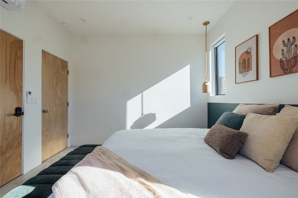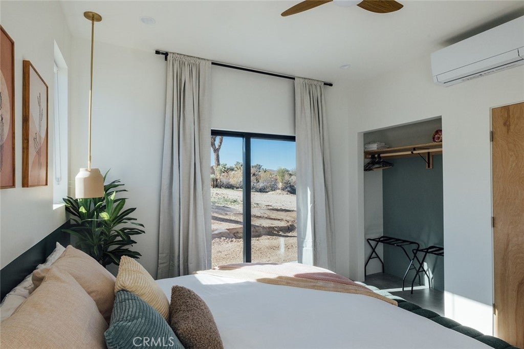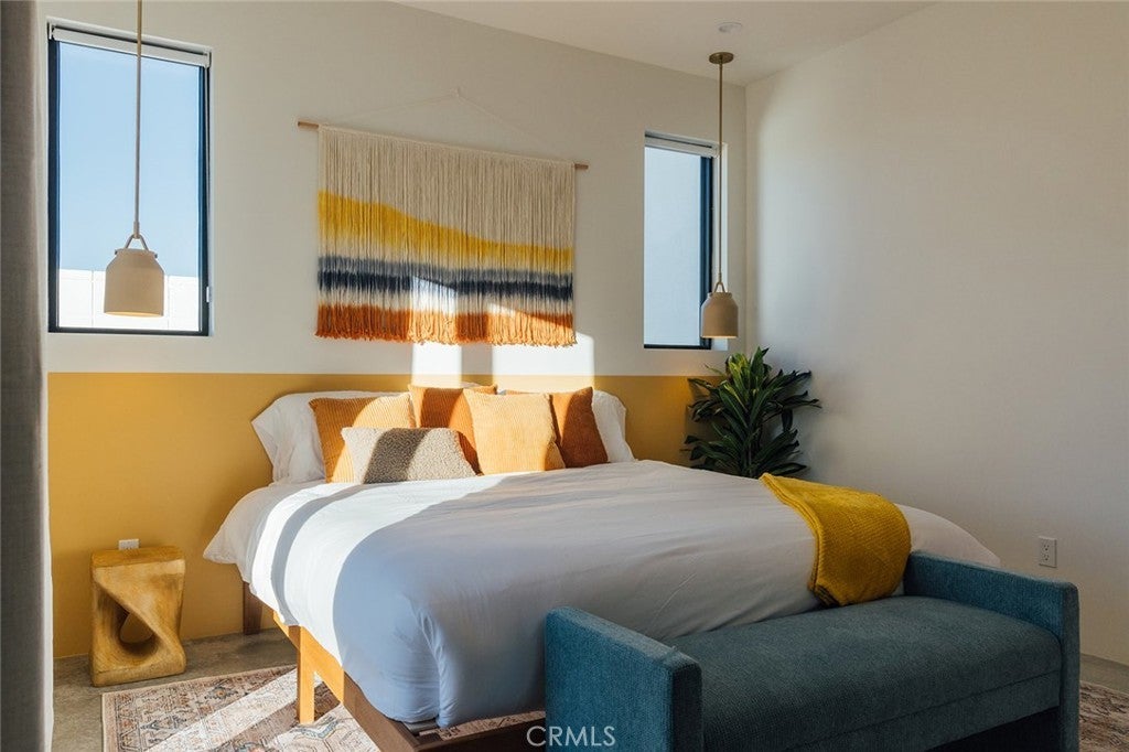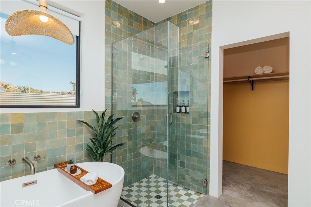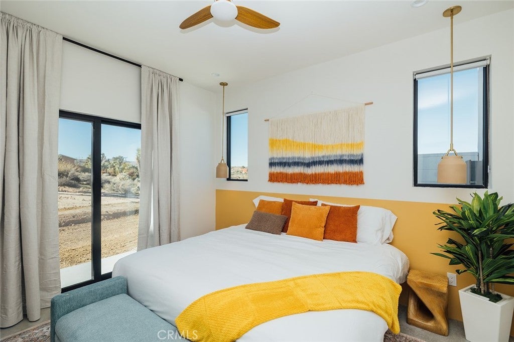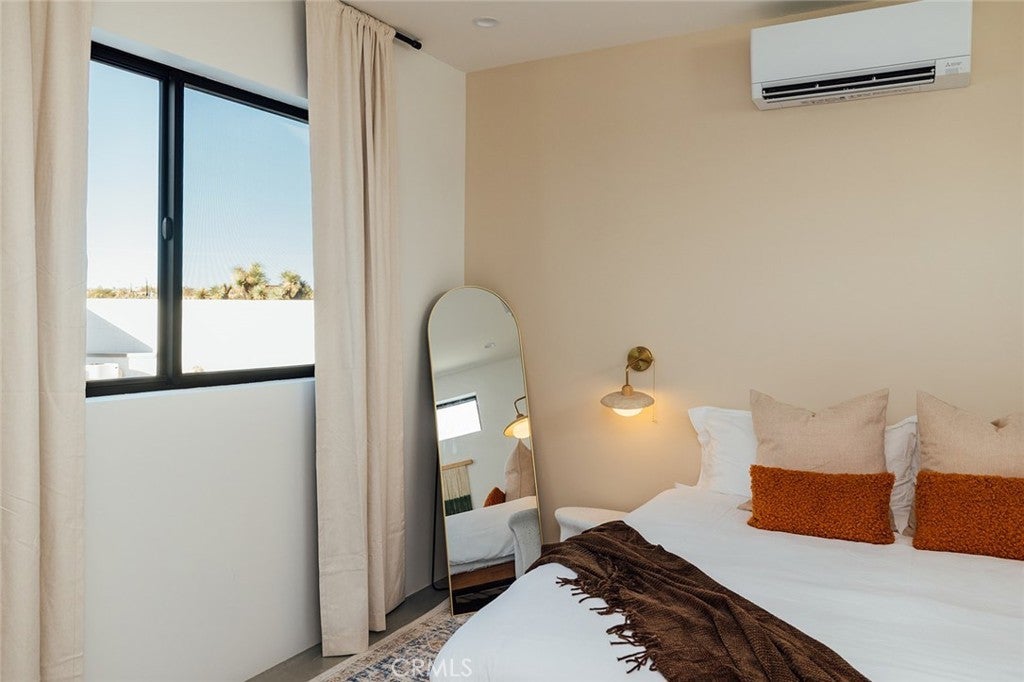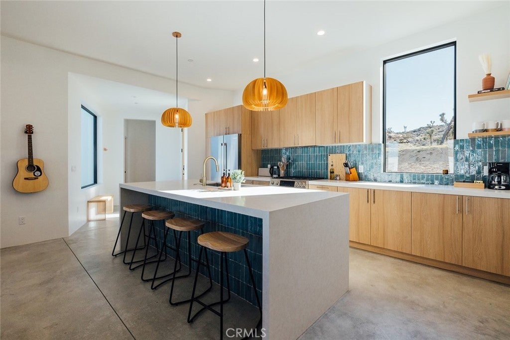Welcome to your desert oasis at 57885 Sierra Vista. Set just above the road and backed by the hills of Buena Vista South, this modern, architect-designed home feels private, peaceful, and deeply connected to the landscape around it. Light moves gently through the space as the day unfolds, and evenings bring wide, open sunsets with views reaching all the way to San Gorgonio – Moments that never get old. An oversized mahogany front door opens into the simple, beautiful entry where your eye is immediately drawn through a picture window to the private courtyard and pool beyond. Inside, the open kitchen and living area feels airy without being oversized, thanks to 10-foot ceilings and a thoughtful layout. Moroccan zellige tiles run throughout the home, adding warmth and texture, while a custom built-in bookshelf gives the livingroom personality and purpose. Easy indoor/outdoor living and dining is accessible with the massive glass double-sliding doors. The kitchen is finished with Bosch appliances, ample storage, and a smart flow that works just as well for entertaining as it does for everyday living. A conveniently placed half bath sits just off the entry. The bedroom layout is intentionally designed for privacy. Each room is set apart and finished with 9-foot ceilings, creating a calm, restful feel throughout. The primary suite is a true retreat, with a walk-in closet, double vanity, spa-like soaking tub, and separate walk-in shower. Two additional bedrooms and a shared bath, as well as outdoor shower, are tucked quietly at the opposite end of the home. Not to be outdone by the interior, outside is where this home really comes to life. A private, block-walled courtyard centers around a heated 35-foot saltwater pool and spa. Nearby, a cedar sauna and outdoor shower sit behind a sculptural terra-cotta breezeblock wall. A built-in firepit with seating and nearby hammocks create the kind of space where evenings stretch longer than planned. With an elevated lot, two-car carport, Tesla charger, Starlink WiFi, and incredible light throughout the day, this is a home that’s easy to love and hard to leave. Offered fully furnished and completely turnkey, this amazing desert residence is ready to move into or place directly into service as an investment property with high-cashflow potential. Don’t let this opportunity pass you by – Call your agent for a private showing today.