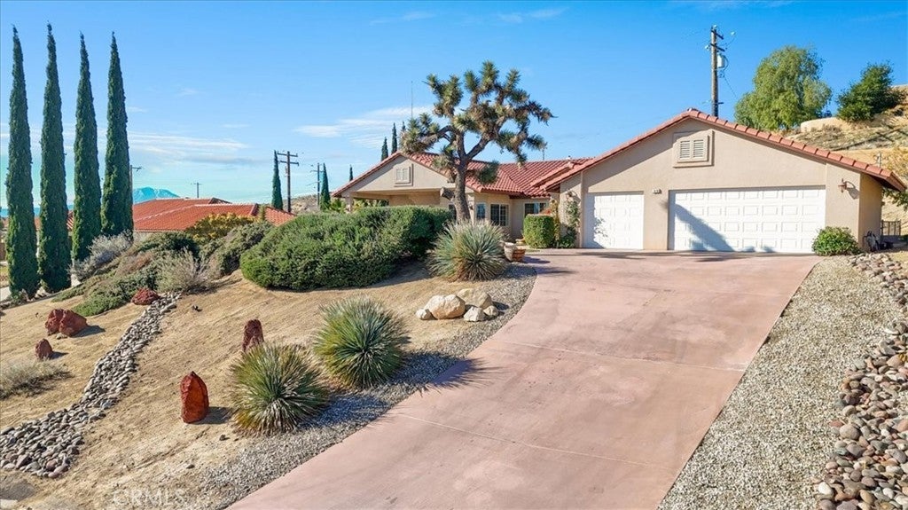 Sweeping valley views, brilliant night skies, and cooler desert living just 20 minutes from Palm Springs — a rare custom home at the top of the Yucca Grade. Perched in Yucca Valley’s highly sought-after Country Club Estates at the edge of town, this exceptional Humphreville custom home offers panoramic vistas, cooler evening breezes, and faster access to the Coachella Valley — the perfect balance of serenity and convenience. The light-filled interior features 3 spacious bedrooms plus a versatile bonus room with a custom closet (ideal as a fourth bedroom or home office), 2 full bathrooms, a formal dining room, and a breakfast bar overlooking million-dollar views. Premium features include radiant-barrier roof sheathing designed to reflect heat and reduce summer cooling costs, natural gas service, central heating and air, and a fully ducted evaporative cooler — with the cooling systems thoughtfully positioned on the north-facing wall for improved efficiency. The well-insulated home stays comfortably warmer than most in winter, requires minimal whole-house heating, and remains naturally cooler than the lower desert, all while being conveniently 20 minutes from Palm Springs. Tech-forward buyers will appreciate 5Gbps FiOS service, rack-mounted networking equipment, and hard-wired Ethernet in every room. The private primary suite offers generous proportions, a walk-in closet, and a spa-style bath with a jetted soaking tub and a separate shower. The chef’s kitchen features granite countertops, a gas cooktop, and upgraded stainless-steel appliances, making it perfect for entertaining. The inviting living room features a natural gas fireplace, surround-sound wiring, and a custom articulating, heat-sensing TV mount—a rare, thoughtful upgrade. Outdoors, enjoy landscaped grounds with irrigation, a water fountain, and a private enough front entertainment patio with natural gas stub for a future outdoor kitchen or spa. Be relaxed with breathtaking valley views by day, with dazzling star-filled skies by night — perfect for morning coffee, sunset wine, or evening barbecues under some of the clearest skies in Southern California. A finished three-car garage provides ample storage and convenience. Located near Hawk’s Landing Golf Course and close to town amenities, this home offers a rare blend of luxury, views, cooler desert living, and modern comfort. View the 3D tour, floor plan, and additional photos on Zillow under Facts & Features.