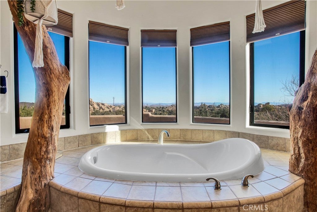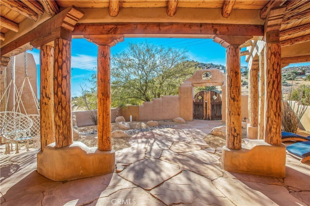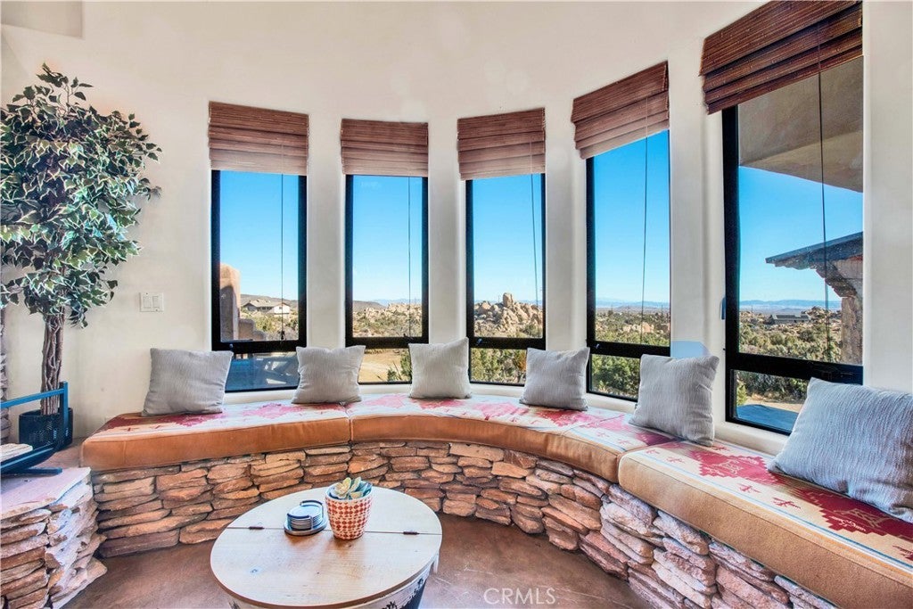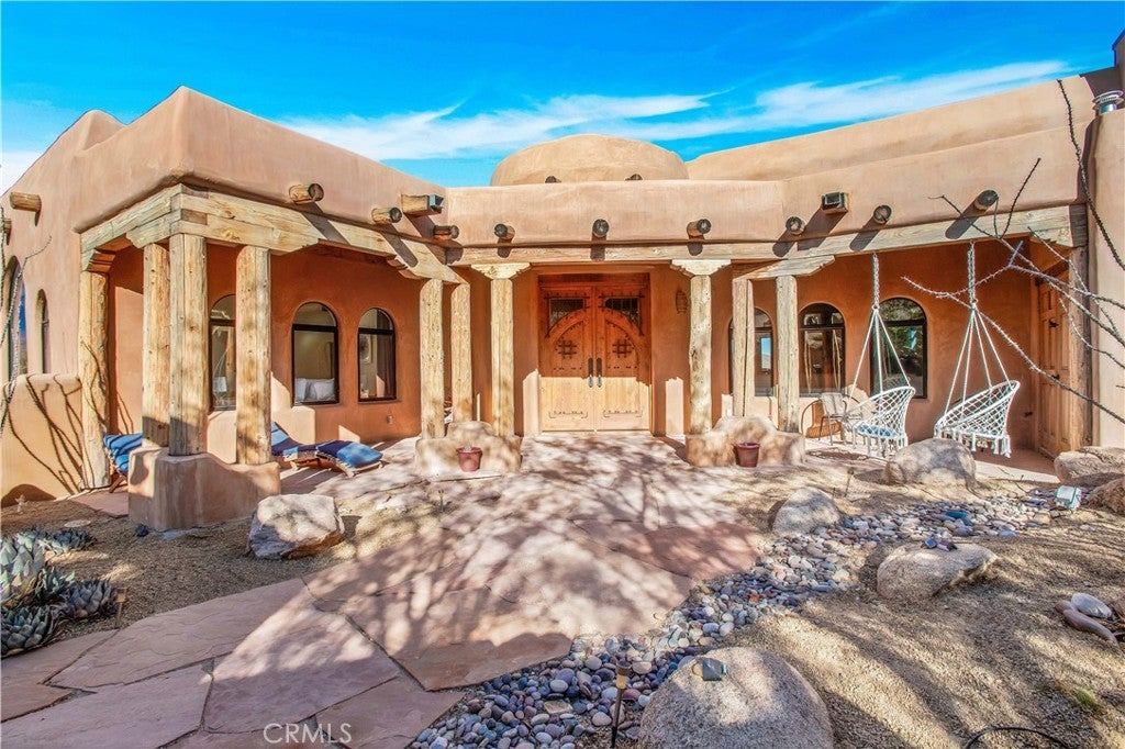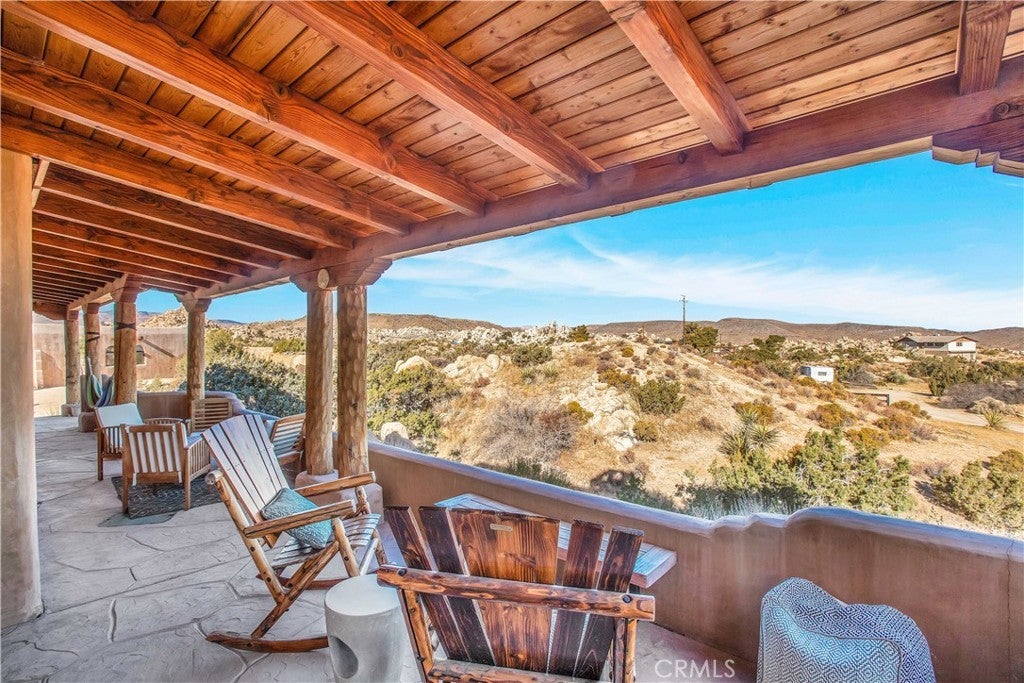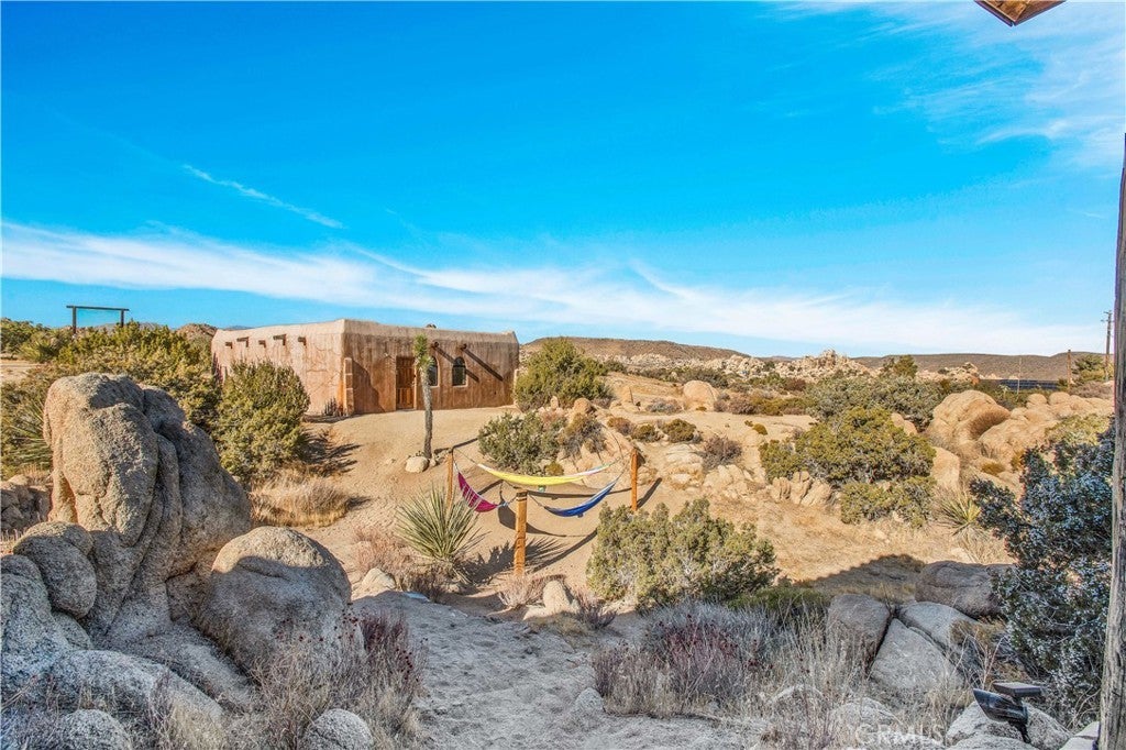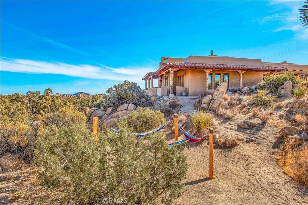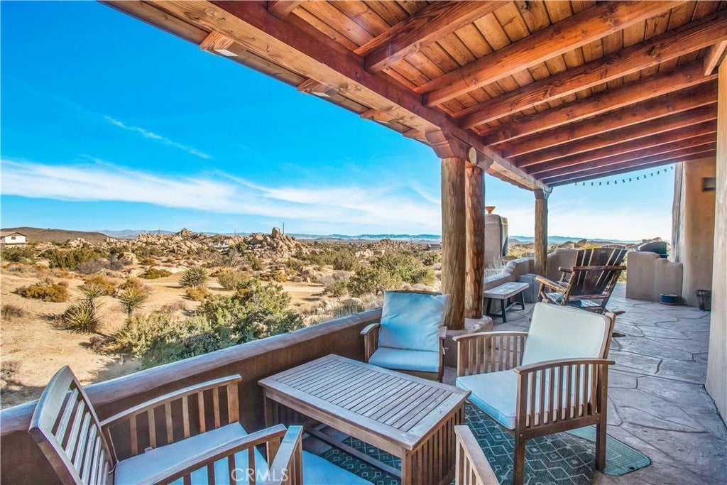 Custom-Built, Fully Furnished Desert Oasis! Welcome to "Sandcastle," a highly successful short-term rental located on just under 2 acres of breathtaking desert landscape, including stunning boulders and Joshua trees. This extraordinary home offers just under 3,000 sqft of living space, featuring 3 bedrooms, 3 bathrooms, a loft with a balcony, and a detached 1,200 sqft finished garage transformed into an entertainment haven. As you arrive, you’ll be greeted by a charming courtyard with flagstone pavers and plenty of seating. Step inside and be in awe of the expansive living room, showcasing an open-concept floor plan, soaring ceilings, and custom wood ceilings with large wood beams. The floor-to-ceiling stone fireplace anchors the space and flows seamlessly into a cozy seating area with breathtaking views. The massive kitchen is a chef’s dream, offering ample storage, counter space, and high-end features like a Wolf stove, a kitchen island with an additional sink, and a custom gas fireplace that adds ambiance at the flip of a switch. The loft above the living room adds charm, complete with a daybed, incredible views, and its own private balcony. The primary suite is truly spectacular, with its grand scale, unique wood beam ceilings, and a massive walk-in closet. The primary bathroom is a retreat, featuring a large soaking tub with incredible views, dual vanities, a no-step walk-in shower with a rain shower head, and a custom rock bench. The second bedroom is equally impressive, offering space for two beds and its own custom bay window. The guest bathroom has been beautifully updated with a luxurious shower. The third bedroom, affectionately known as “The Casita,” has its own private entrance, a spacious layout with patio access, and an ensuite bathroom that exudes elegance. Step outside to a spectacular back patio where you’ll find endless seating areas, a custom stucco outdoor fireplace, and an outdoor spa perfect for stargazing. The desert vistas, boulders, and Joshua trees create a tranquil setting. The detached 1,200 sqft garage has been transformed into an entertainment area complete with a projector for movie nights, games, and space for everyone to enjoy. This home is being sold fully furnished, making it ready for immediate enjoyment or continued success as a short-term rental. With its one-of-a-kind design, luxurious finishes, and incredible location, homes like this are truly rare. Experience the magic of "Sandcastle" for yourself!