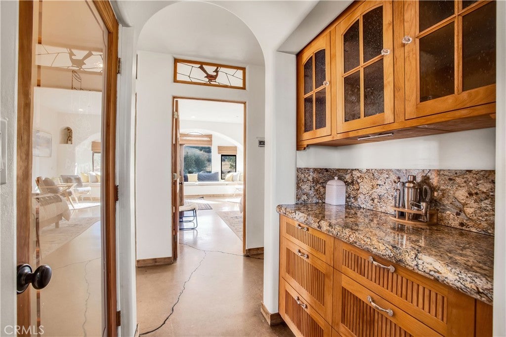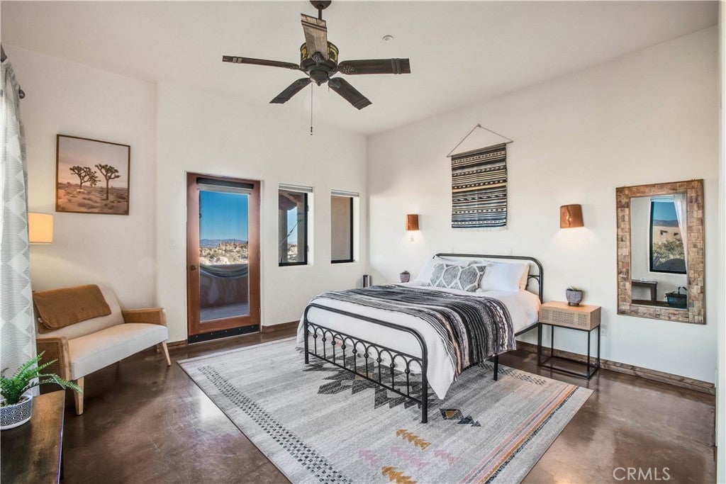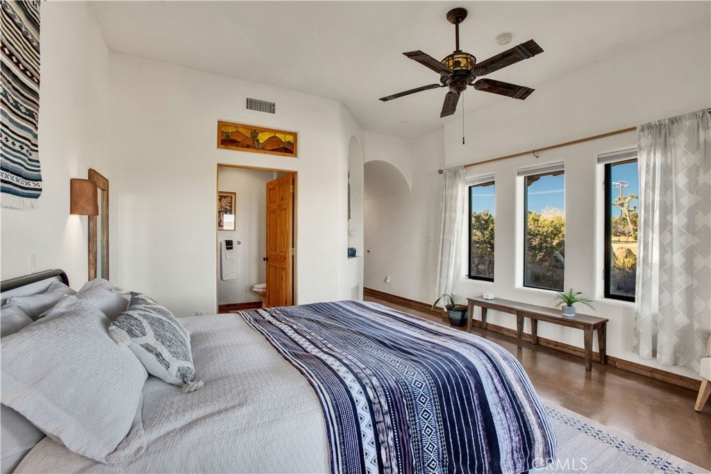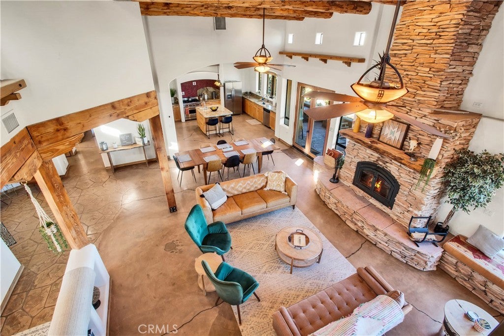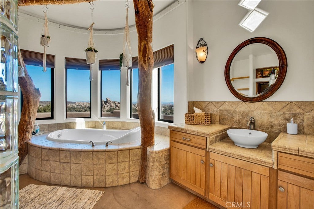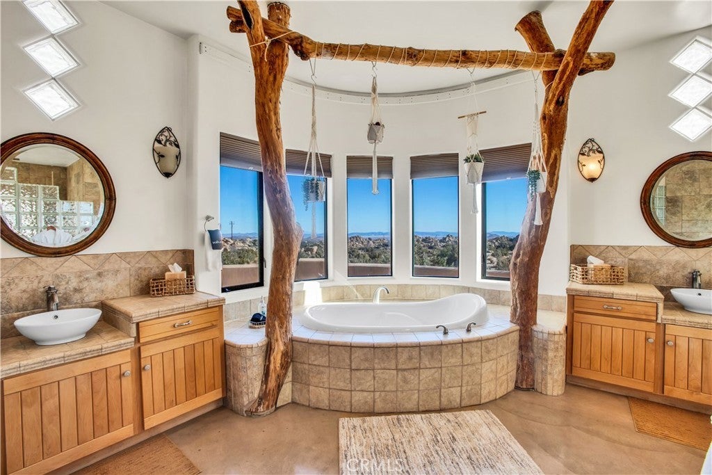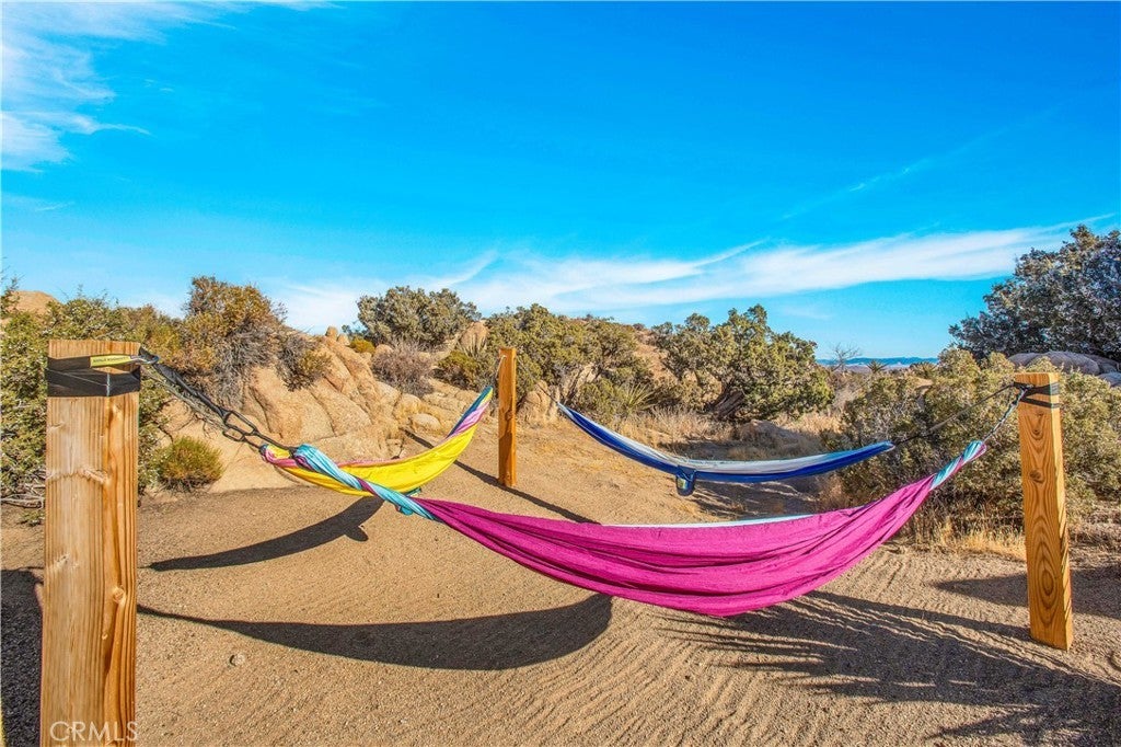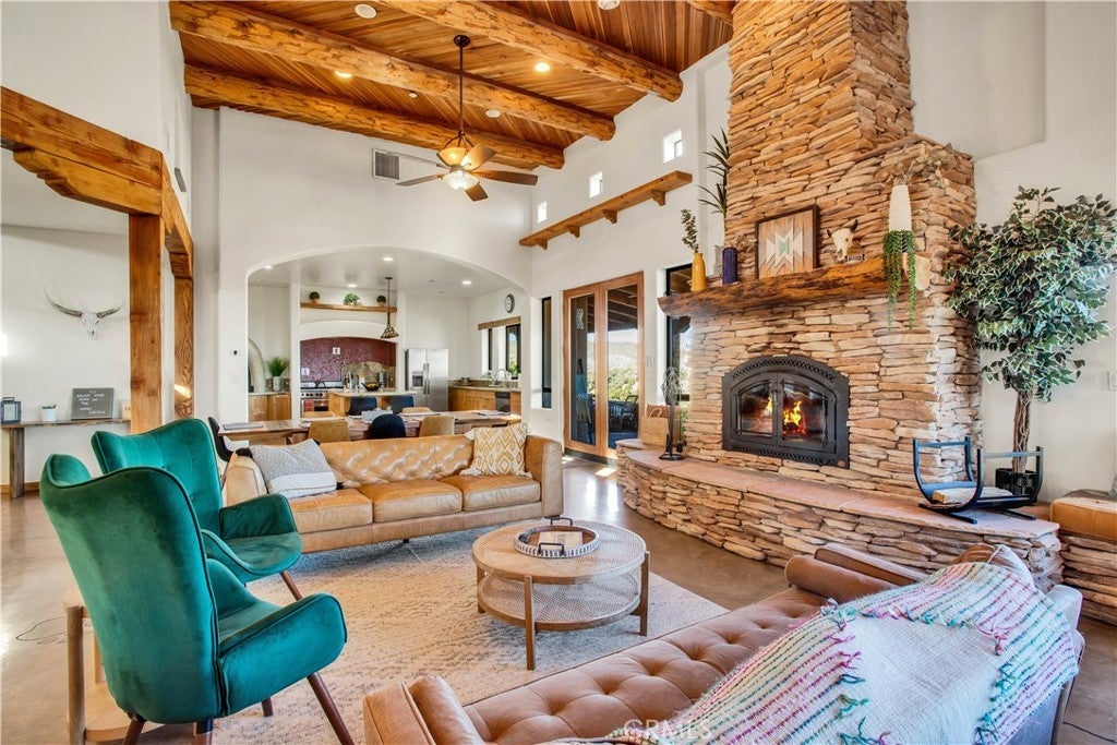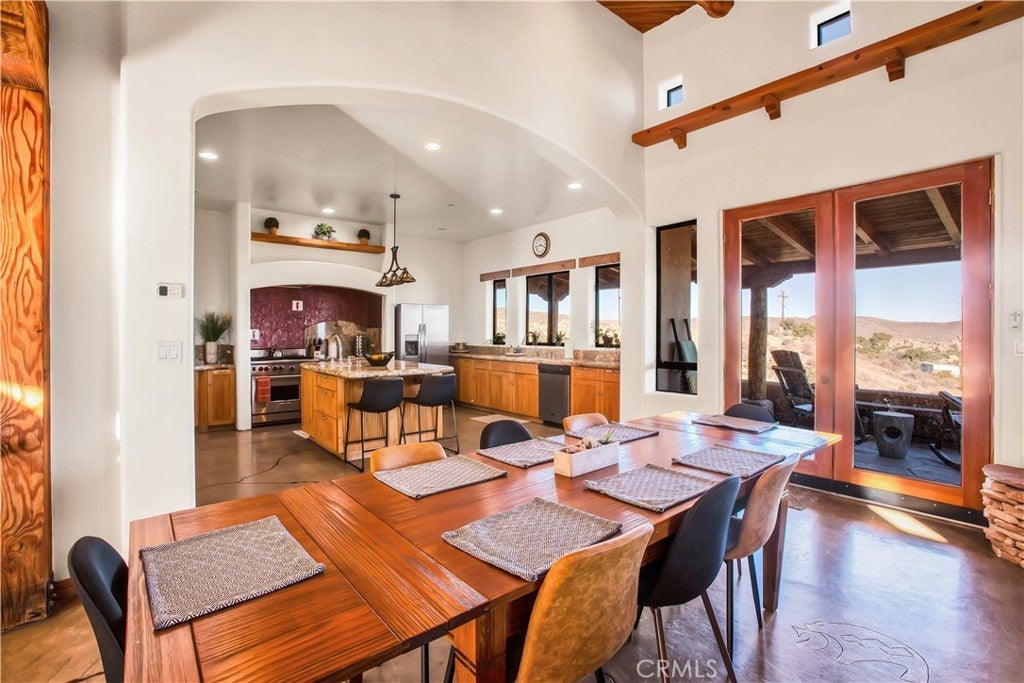 Custom-Built, Fully Furnished Desert Oasis! Welcome to "Sandcastle," a highly successful short-term rental located on just under 2 acres of breathtaking desert landscape, including stunning boulders and Joshua trees. This extraordinary home offers just under 3,000 sqft of living space, featuring 3 bedrooms, 3 bathrooms, a loft with a balcony, and a detached 1,200 sqft finished garage transformed into an entertainment haven. As you arrive, you’ll be greeted by a charming courtyard with flagstone pavers and plenty of seating. Step inside and be in awe of the expansive living room, showcasing an open-concept floor plan, soaring ceilings, and custom wood ceilings with large wood beams. The floor-to-ceiling stone fireplace anchors the space and flows seamlessly into a cozy seating area with breathtaking views. The massive kitchen is a chef’s dream, offering ample storage, counter space, and high-end features like a Wolf stove, a kitchen island with an additional sink, and a custom gas fireplace that adds ambiance at the flip of a switch. The loft above the living room adds charm, complete with a daybed, incredible views, and its own private balcony. The primary suite is truly spectacular, with its grand scale, unique wood beam ceilings, and a massive walk-in closet. The primary bathroom is a retreat, featuring a large soaking tub with incredible views, dual vanities, a no-step walk-in shower with a rain shower head, and a custom rock bench. The second bedroom is equally impressive, offering space for two beds and its own custom bay window. The guest bathroom has been beautifully updated with a luxurious shower. The third bedroom, affectionately known as “The Casita,” has its own private entrance, a spacious layout with patio access, and an ensuite bathroom that exudes elegance. Step outside to a spectacular back patio where you’ll find endless seating areas, a custom stucco outdoor fireplace, and an outdoor spa perfect for stargazing. The desert vistas, boulders, and Joshua trees create a tranquil setting. The detached 1,200 sqft garage has been transformed into an entertainment area complete with a projector for movie nights, games, and space for everyone to enjoy. This home is being sold fully furnished, making it ready for immediate enjoyment or continued success as a short-term rental. With its one-of-a-kind design, luxurious finishes, and incredible location, homes like this are truly rare. Experience the magic of "Sandcastle" for yourself!