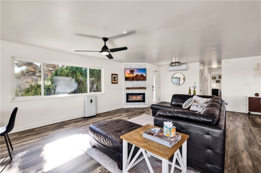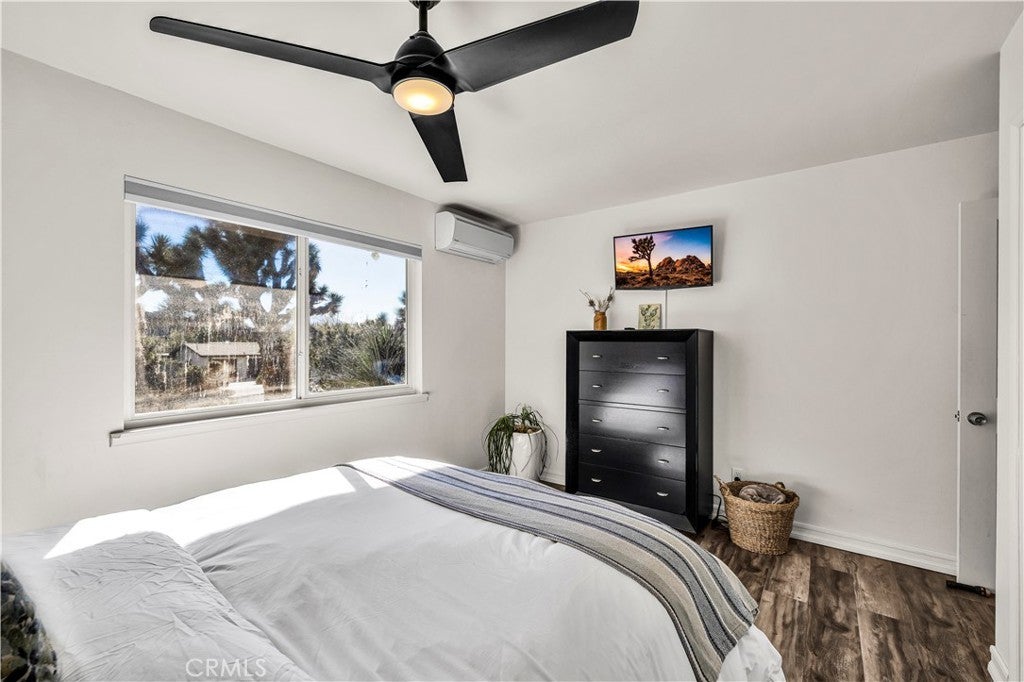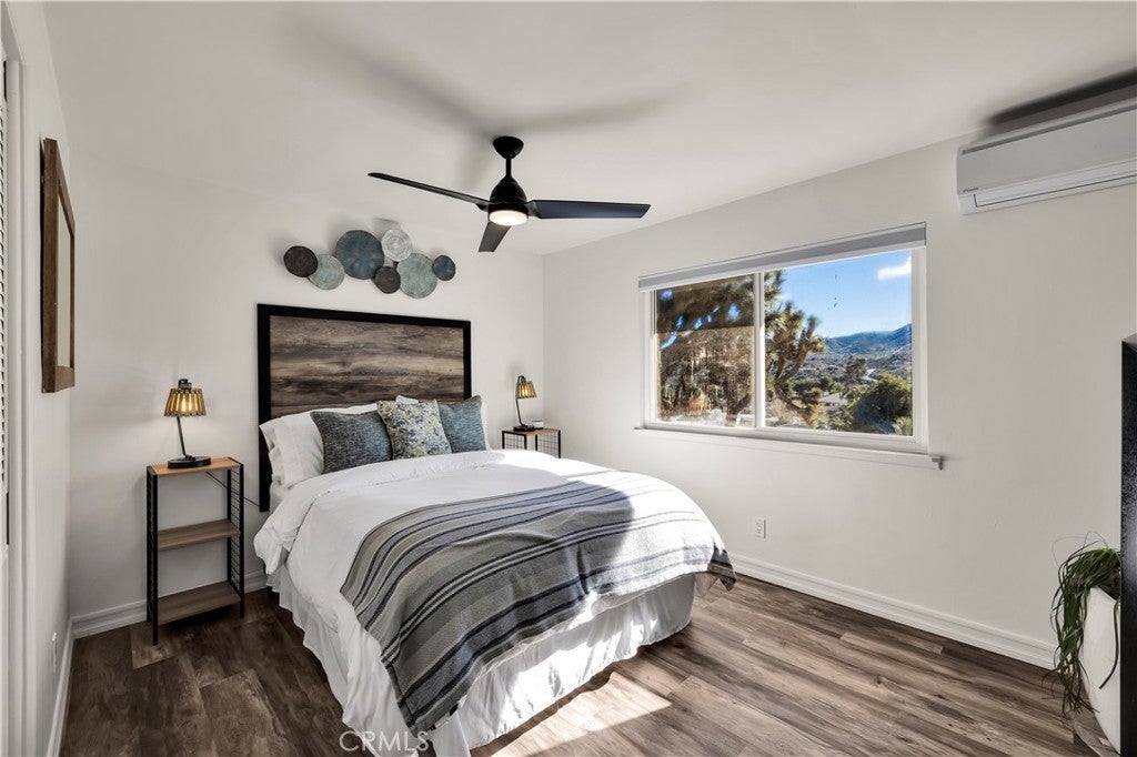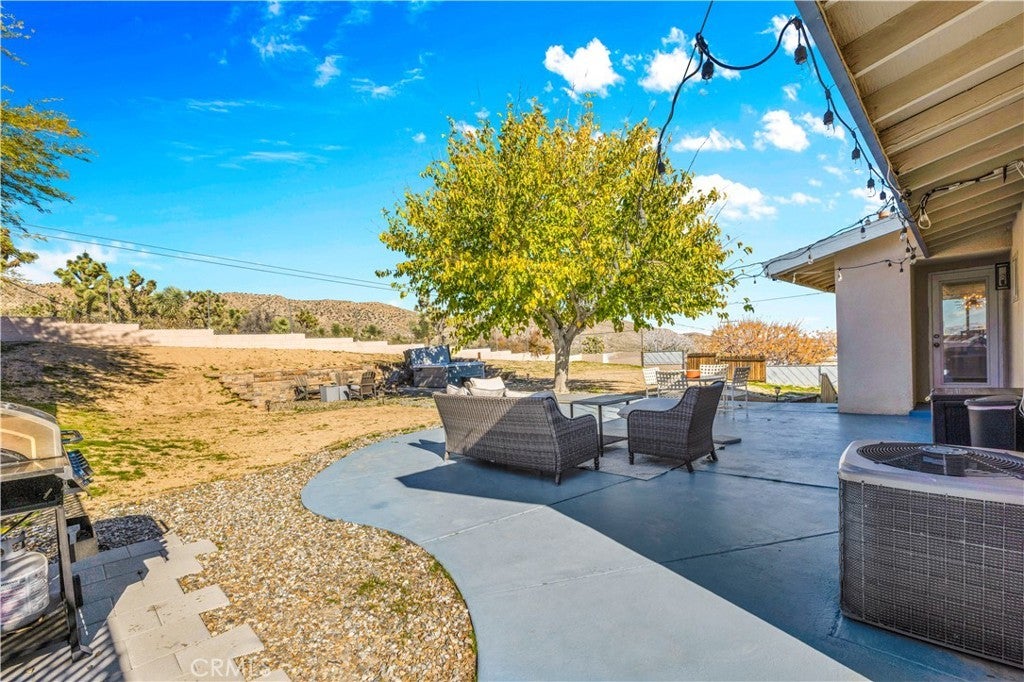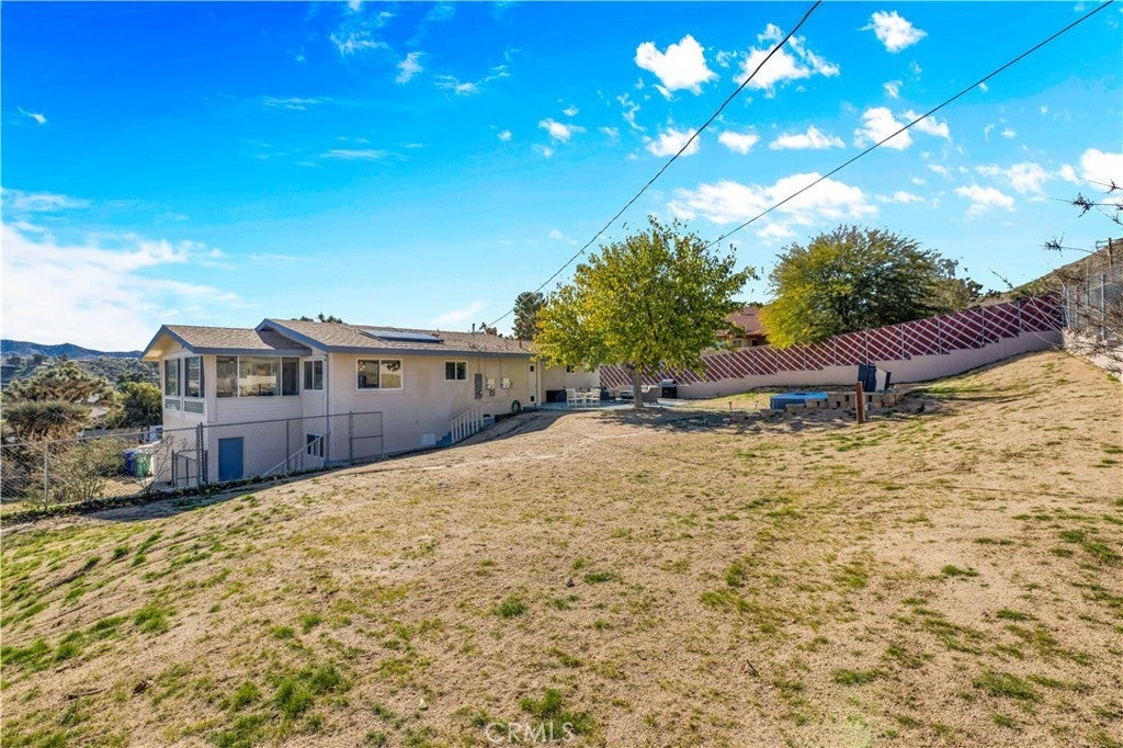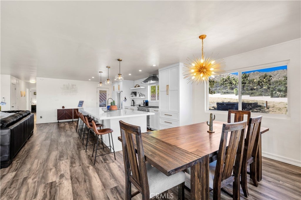 Welcome to this beautifully remodeled 2-bedroom, 2-bathroom home located high in the desirable Country Club Estates neighborhood of Yucca Valley—just up the street from the local golf course. This home is a turnkey short-term rental and offers elevated views, stylish upgrades, and everyday functionality. As you arrive, you’ll love the curb appeal, mature landscaping, and the convenience of two long concrete driveways providing ample parking—perfect for RVs, trailers, or toys. A drive-through gate leads to the fully fenced backyard for added versatility. Inside, you’re greeted by an open-concept layout with luxury vinyl plank flooring throughout. The living, dining, kitchen, and sunroom flow seamlessly, offering a massive combined living space filled with natural light and panoramic desert views. The fully remodeled kitchen features beautiful cabinetry, quartz countertops, a large center island, high-end Viking stainless steel appliances, ample storage, and even a hidden laundry area tucked behind custom cabinet doors. The sunroom, with its retro glass block and sweeping views, serves as a bright and stylish bonus space. The spacious primary suite includes a walk-in closet and a stunning ensuite bathroom featuring dual sinks, a large walk-in tile shower with dual rain showerheads, and sleek glass panels. The guest bathroom is equally impressive, with dual sinks and a fully remodeled shower/tub combo. The additional bedroom is generously sized and well-appointed. Step out back to enjoy the expansive concrete patio—perfect for entertaining—along with a private spa and fire pit. Beyond the yard, you'll enjoy the breathtaking view of thousands of Joshua trees and untouched desert landscape. This home has been thoughtfully upgraded with energy-efficient dual-pane windows, a newer electrical panel and mini-splits throughout for zoned heating and cooling. It also features an affordable leased solar system at approximately $175/month, keeping energy costs manageable. The home can be sold fully furnished, this home is truly turnkey—ideal for continued short-term rental income or as your own desert escape. Don’t miss this rare opportunity to own a move-in-ready, fully upgraded home with incredible views, designer finishes, and top-notch amenities in one of Yucca Valley’s most desirable neighborhoods. Schedule your private showing today!