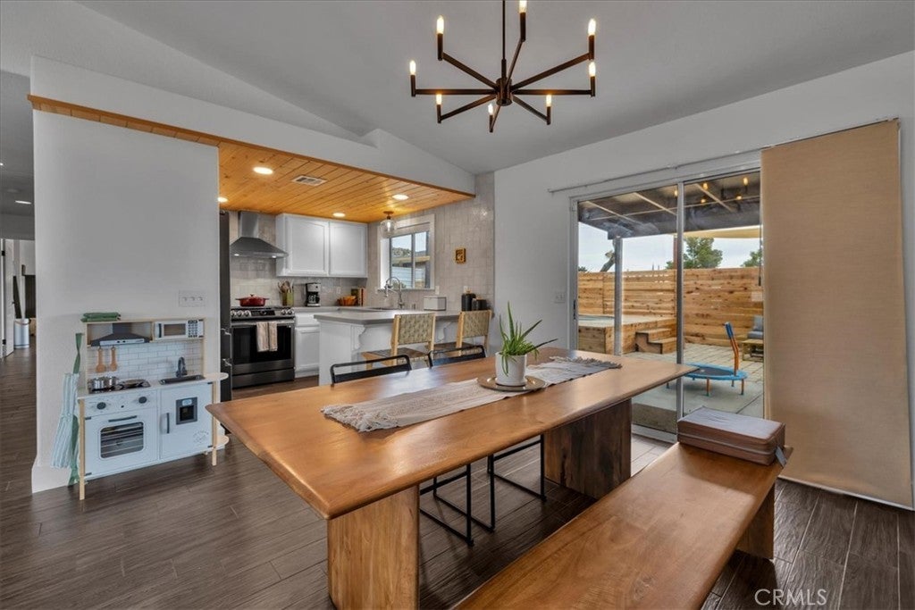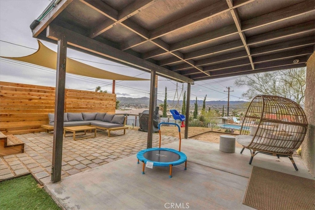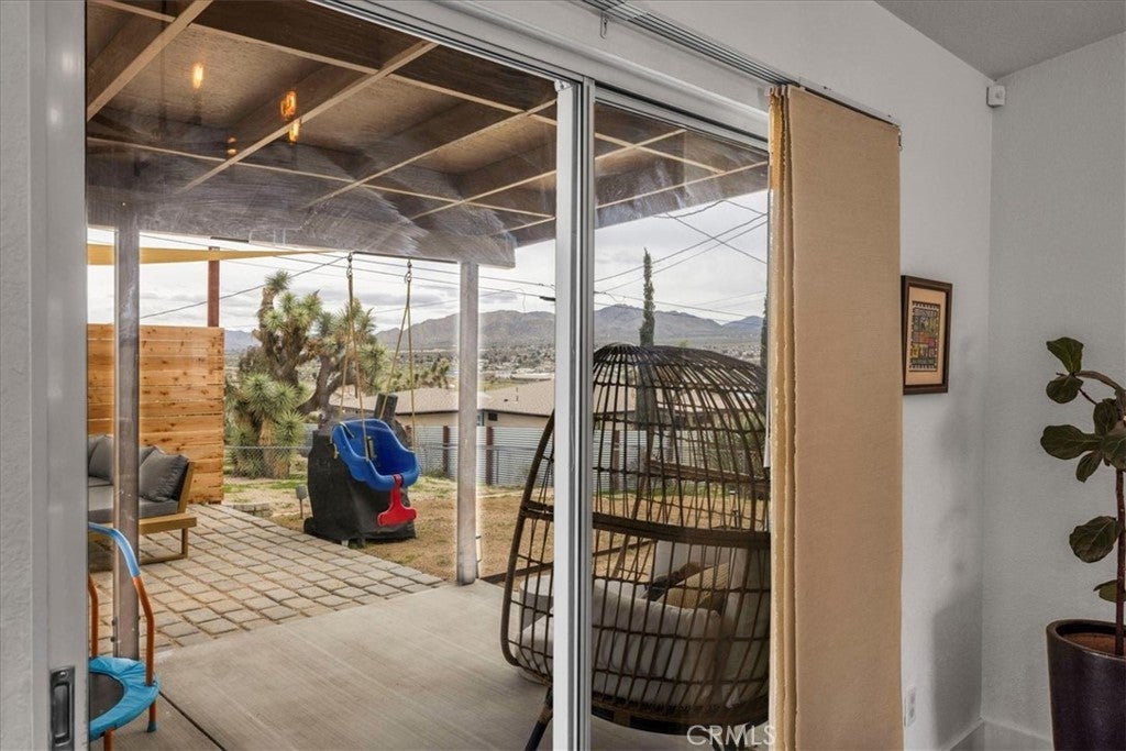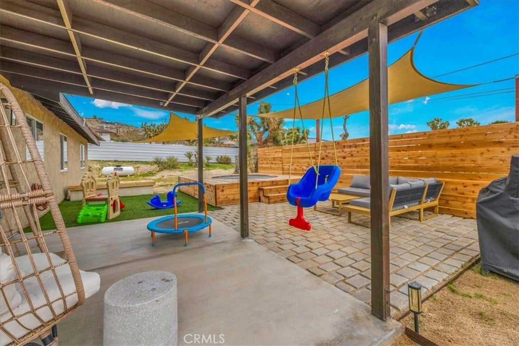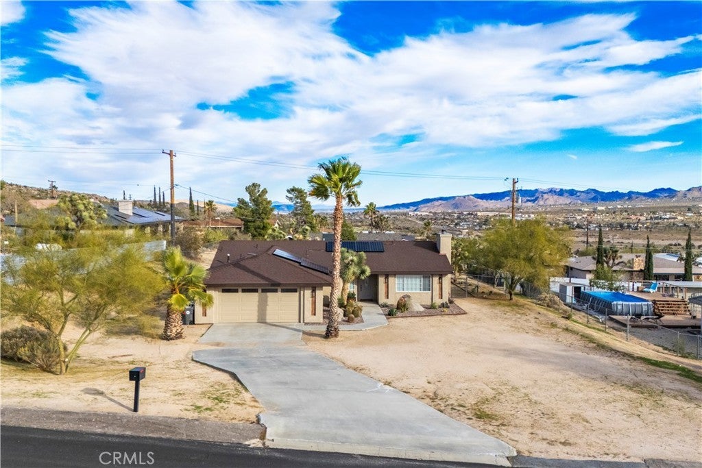 Located in Yucca Valley’s Western Hills neighborhood, this 3 bedroom, 2 bath home offers 1,522 square feet of thoughtfully designed living space on a 16,250 square foot lot. Built in 2003, the home features high ceilings, recessed lighting, tile wood-look flooring throughout, and an easy single-level layout connecting the living, dining, and kitchen areas. The living room is anchored by a wood stove insert with electric blower for efficient supplemental heat, along with central heating and cooling provided by a recently installed AC/heat pump package unit. Large windows frame sweeping desert and mountain views, creating a strong connection to the surrounding landscape. The kitchen opens to the main living areas and offers generous counter space and cabinetry suited for everyday living and entertaining. The primary bedroom is spacious and includes multiple closets and a large en-suite bath. Two additional bedrooms offer flexibility for guests, office space, or hobbies. An attached 2-car garage, propane service, and concrete driveway add to the home’s practicality and convenience. Seller describes the property as move-in ready; buyers to verify condition to their satisfaction. Outdoor living is a highlight, with a covered patio, shaded seating areas, and a filtered stock-tank style dunk pool/hot tub set against wide-open views across Yucca Valley and the surrounding hills. The backyard offers ample space to relax, gather, or further customize while enjoying expansive skies and sunsets. Set among established homes with wide streets and easy access to town amenities and Joshua Tree National Park, this Western Hills property combines comfort, function, and views in a well-established neighborhood.