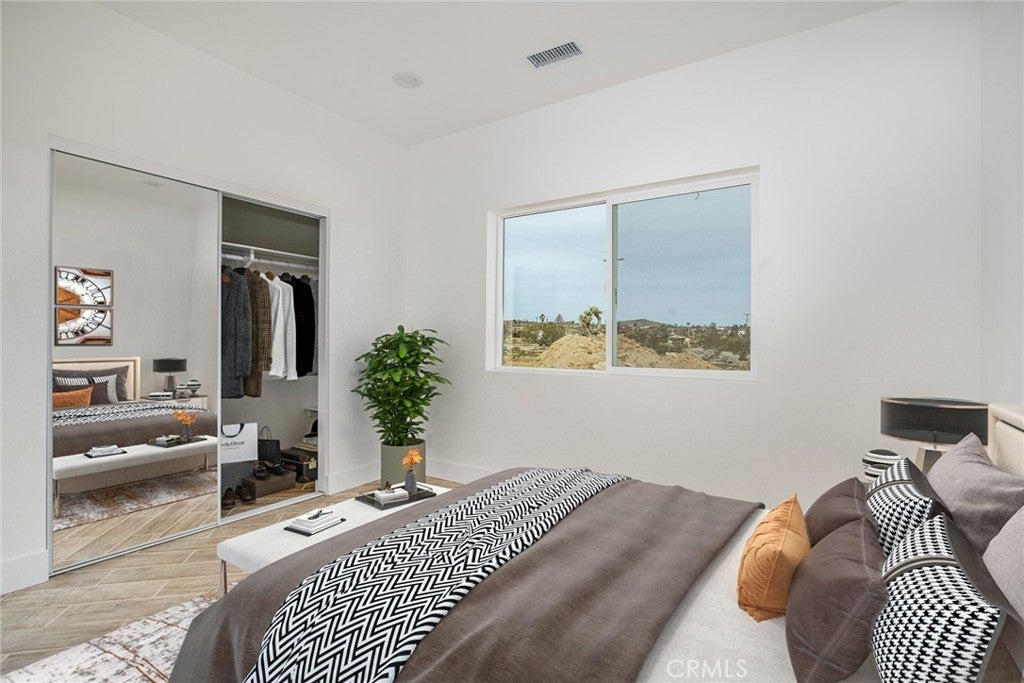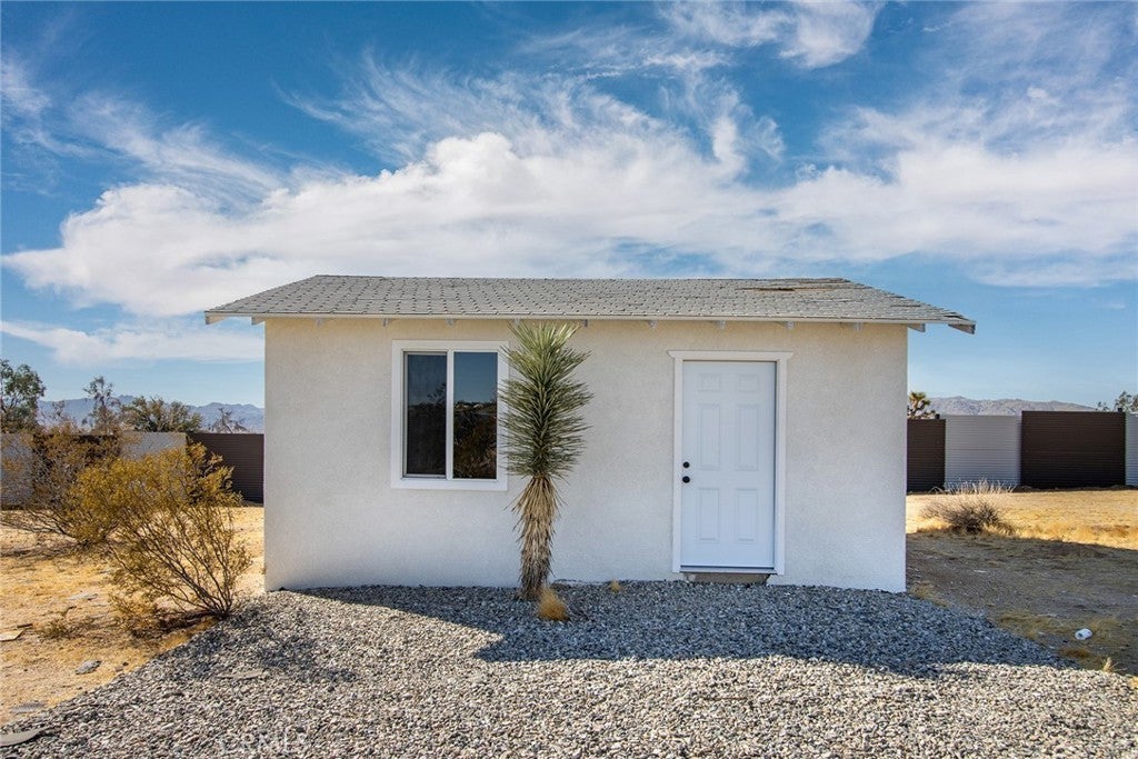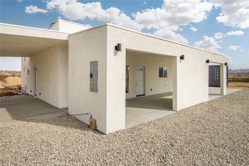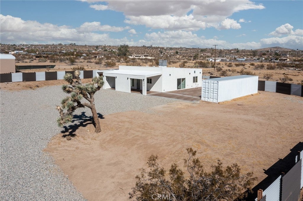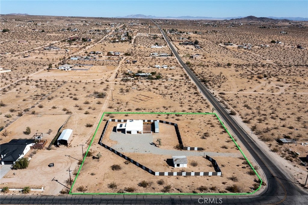 Joshua Tree—arguably one of the coolest destinations in Southern California. Now is your opportunity to own a newly built, never-lived-in mid-century modern home on a prime corner view lot, complete with an original homestead cabin full of potential. The main residence features a bright, airy open floor plan where the living and dining areas flow seamlessly into the kitchen. An office nook sits just off the dining space, ideal for remote work or creative pursuits. Two generously sized bedrooms and two beautifully finished bathrooms complement the home, with clean white quartz countertops adding a crisp, modern touch throughout. Outdoor living is front and center. A large east-facing patio offers both wind and sun protection, enhanced by a built-in storage structure and stained concrete surfaces for easy maintenance and modern appeal. And the views—approximately 15 miles of unobstructed desert and National Park vistas stretching to the south—are nothing short of breathtaking. Additional features include a carport, solar power paired with grid connectivity through Edison, and newly installed fencing and a gated entry for added privacy. The original homestead cabin remains on the property, ready for transformation into whatever suits your vision—studio, office, pool room, or creative retreat. This is a rare canvas in an iconic location. Come make it your artistic statement home.