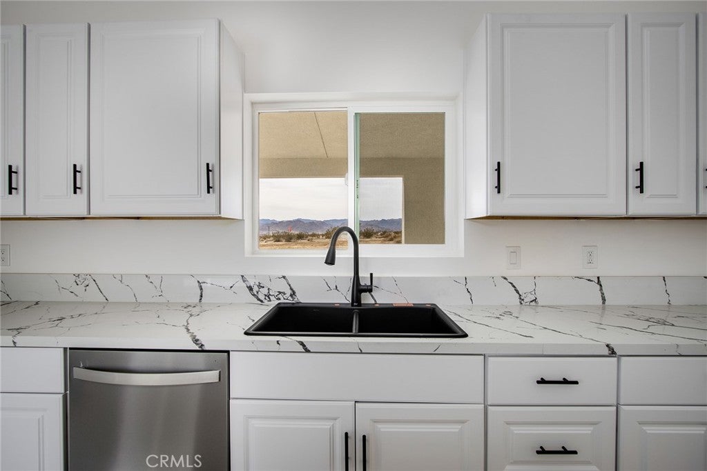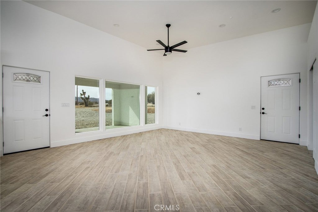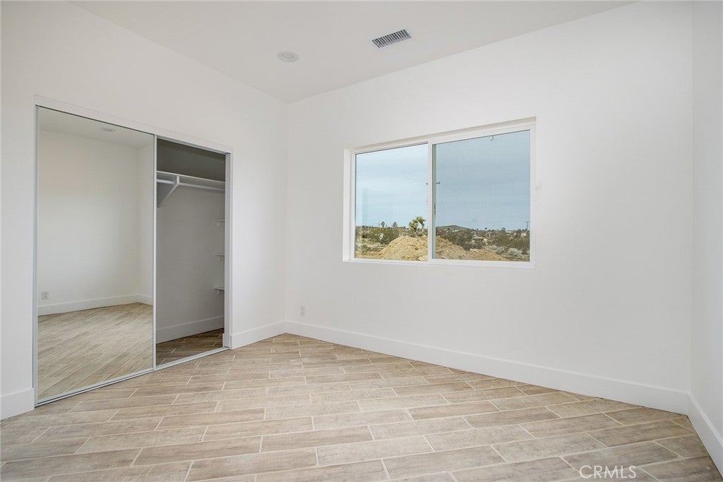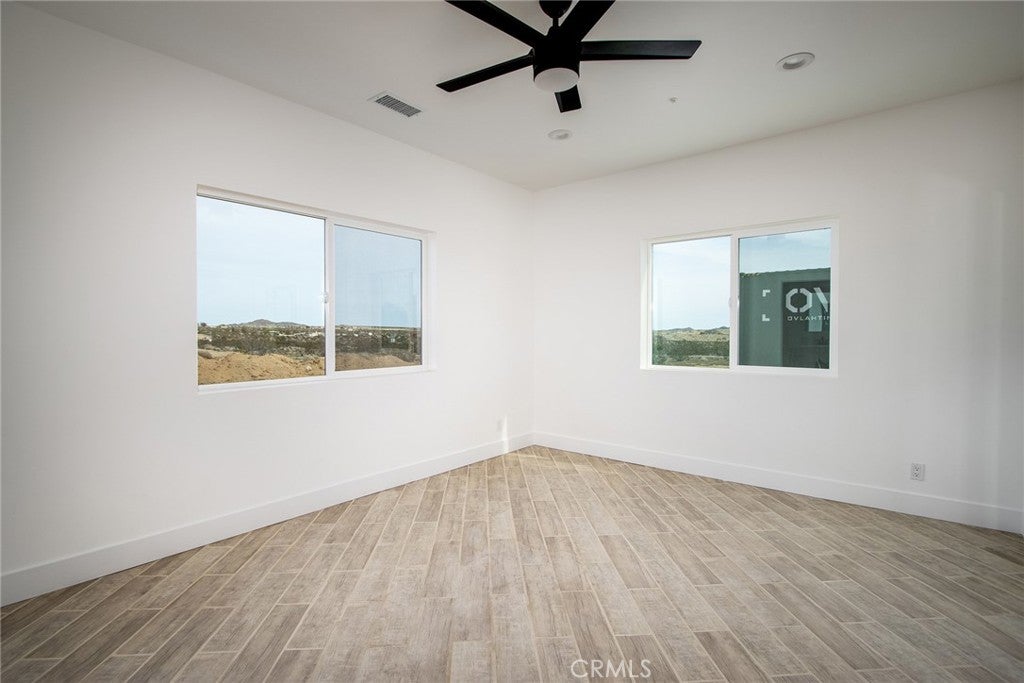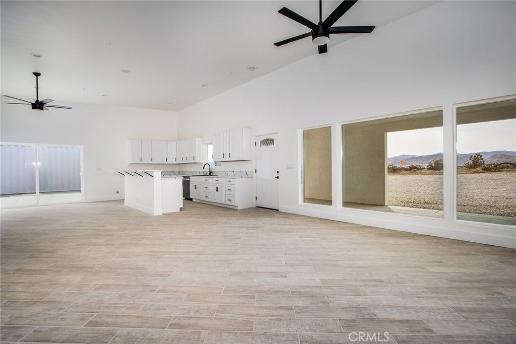 Joshua Tree—arguably one of the coolest destinations in Southern California. Now is your opportunity to own a newly built, never-lived-in mid-century modern home on a prime corner view lot, complete with an original homestead cabin full of potential. The main residence features a bright, airy open floor plan where the living and dining areas flow seamlessly into the kitchen. An office nook sits just off the dining space, ideal for remote work or creative pursuits. Two generously sized bedrooms and two beautifully finished bathrooms complement the home, with clean white quartz countertops adding a crisp, modern touch throughout. Outdoor living is front and center. A large east-facing patio offers both wind and sun protection, enhanced by a built-in storage structure and stained concrete surfaces for easy maintenance and modern appeal. And the views—approximately 15 miles of unobstructed desert and National Park vistas stretching to the south—are nothing short of breathtaking. Additional features include a carport, solar power paired with grid connectivity through Edison, and newly installed fencing and a gated entry for added privacy. The original homestead cabin remains on the property, ready for transformation into whatever suits your vision—studio, office, pool room, or creative retreat. This is a rare canvas in an iconic location. Come make it your artistic statement home.