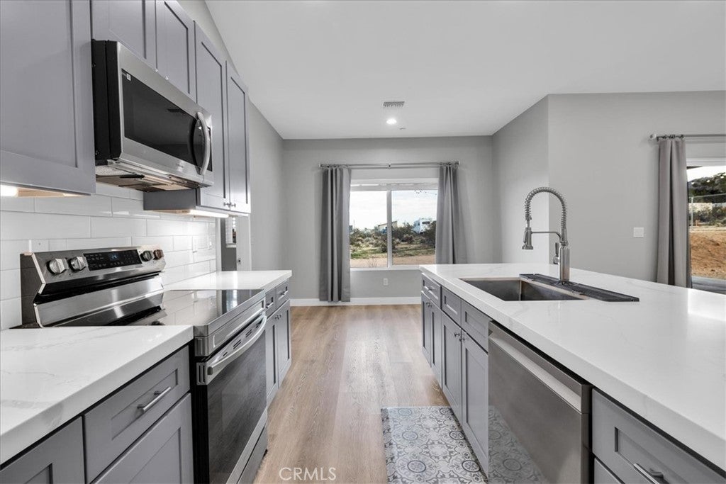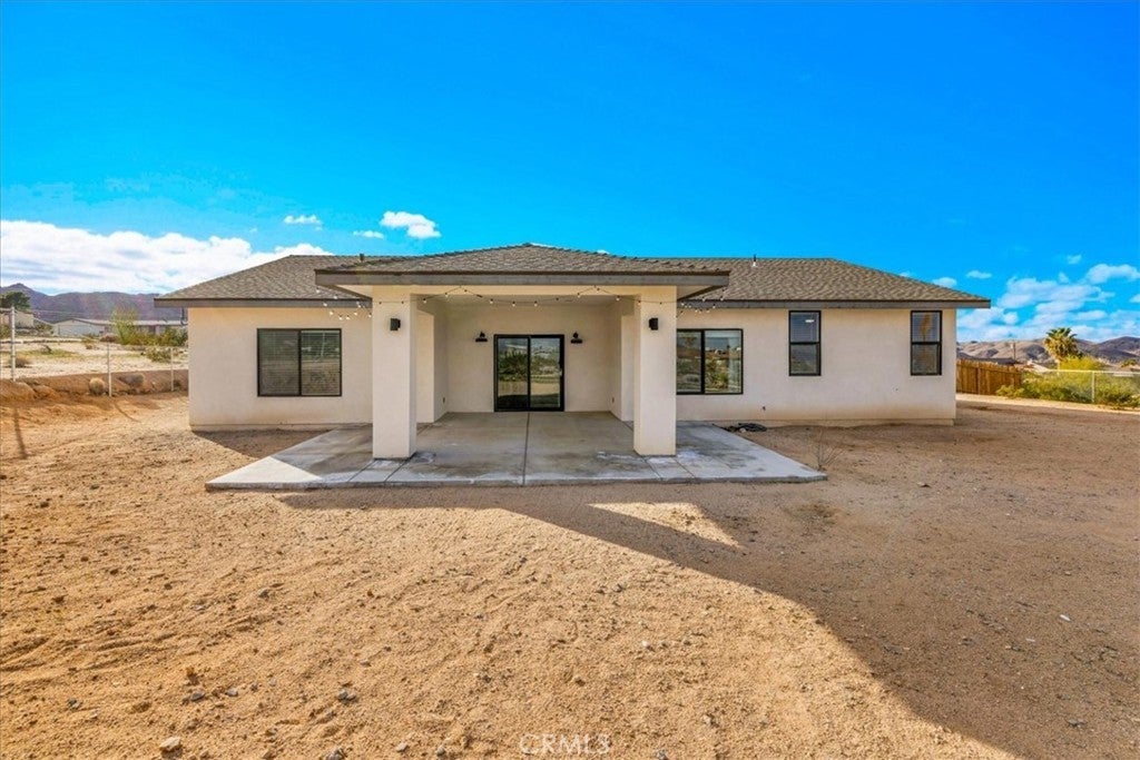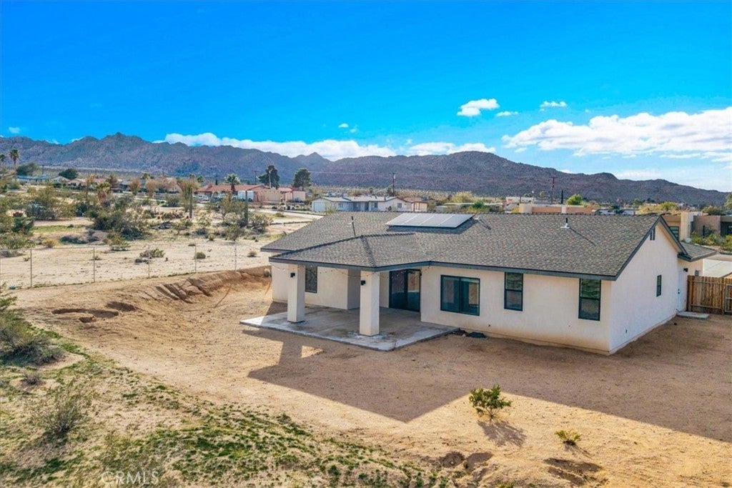 Newer Construction Home! VERY RARE here in the desert, insurance company's dream! FULLY PAID OFF SOLAR! Your dream home awaits in this nearly brand-new 4-bedroom, 2-bath stunner that blends modern style with QUALITY construction. Built with a well-insulated 2x6 frame and top-of-the-line double-glazed windows, it offers comfort, quiet, and energy efficiency year-round. Enjoy peace of mind knowing everything is fresh and low maintenance, so you can simply move in and enjoy. The light-filled open floorplan features vaulted ceilings, a showstopping kitchen with a massive quartz island and bar seating, and a private split layout perfect for any lifestyle. With luxury LVP flooring, gorgeous tile bathrooms, a spacious laundry room, a huge walk-in closet in the primary suite, and every detail is designed for comfort and efficiency. Ideally located just a hop, skip, and a jump to MCAGCC, Indian Cove Campground in Joshua Tree National Park, the growing downtown scene of 29 Palms, and Joshua Tree, this elevated lot just under an acre offers stunning views and the perfect balance of adventure and ease.
