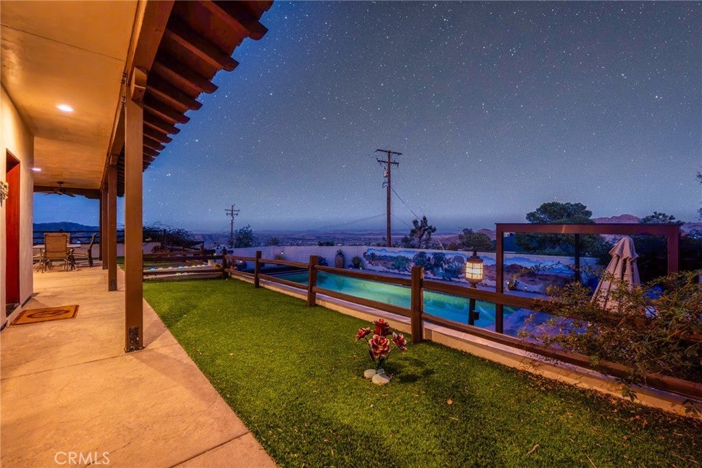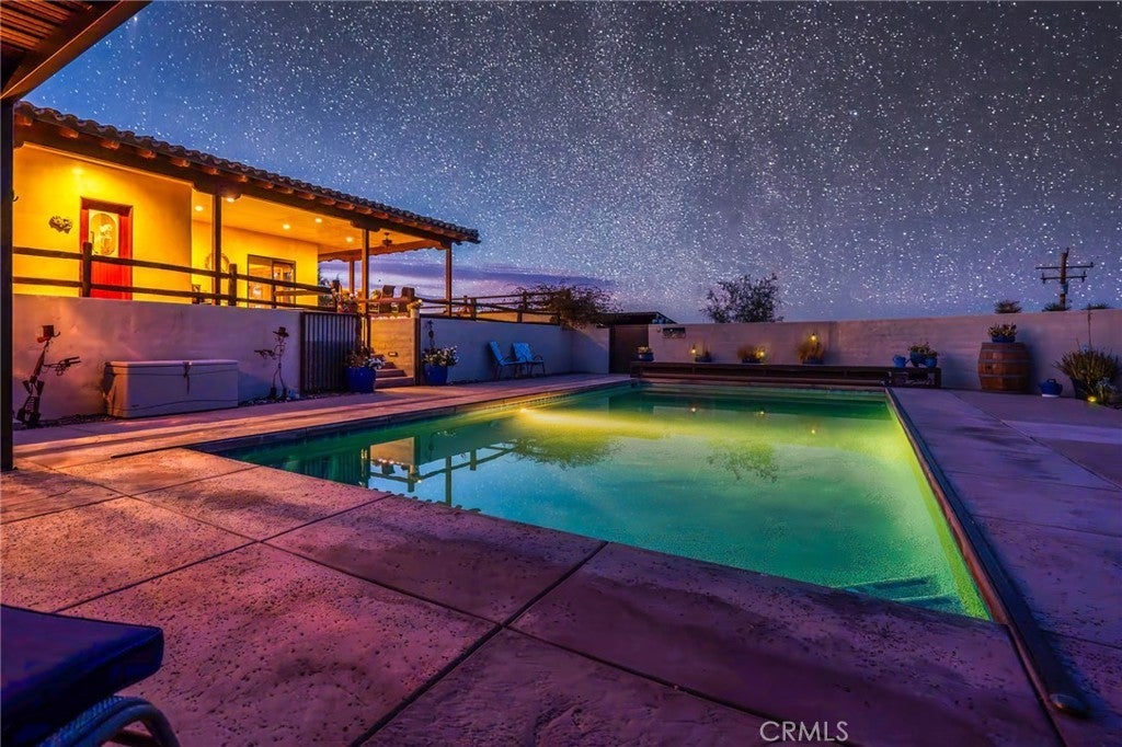 A homeowner's delight nestled in the heart of Joshua Tree...Seeing is believing with this one-of-a-kind exquisite property. Built in 2013 this Mediterranean Style home offers over 2500 square feet of living space and is custom from floor to ceiling. Featuring renowned woodwork and cabinetry throughout every detail is placed with purpose and poise. An open split floor plan 3 bedrooms 2 baths, grand living room, craft room, a cooks kitchen indulgence, including a wraparound bar, island with prep sink, beverage refrigerator and a large walk-in pantry just to name a few. This property is flooded with natural light allowing the beauty of the desert to surround you and it doesn't stop there! The home has multiple patios with handcrafted iron and masonry work, views that mesmerize and give you that retreat feeling you're looking for along with a deluxe swimming pool complete with automatic cover, shade structure and is heated by solar. Pool is surrounded by a unique desert mural painted by local artist. Outside the Master suite a luxurious hot tub awaits you for those relaxing starry nights. A three-car garage is attached to a breeze way and gorgeous courtyard equipped with mature planters, overflowing flower beds and a trickling water fountain. Home is abundantly full of extra amenities such as instant hot water heater, water softener, outside icemaker, dog run, doggie door and more...Come make this desert property a reality and call Joshua tree Home sweet Home! Shown by appointment only.