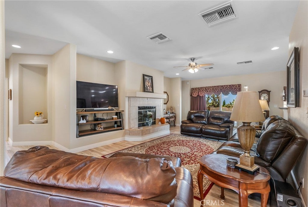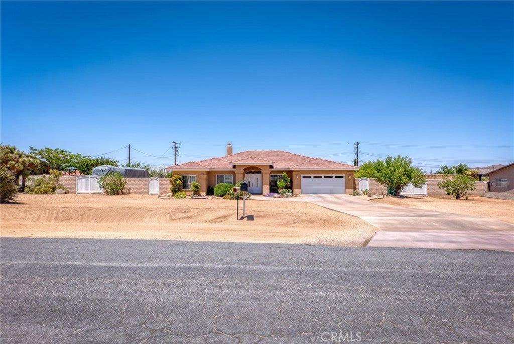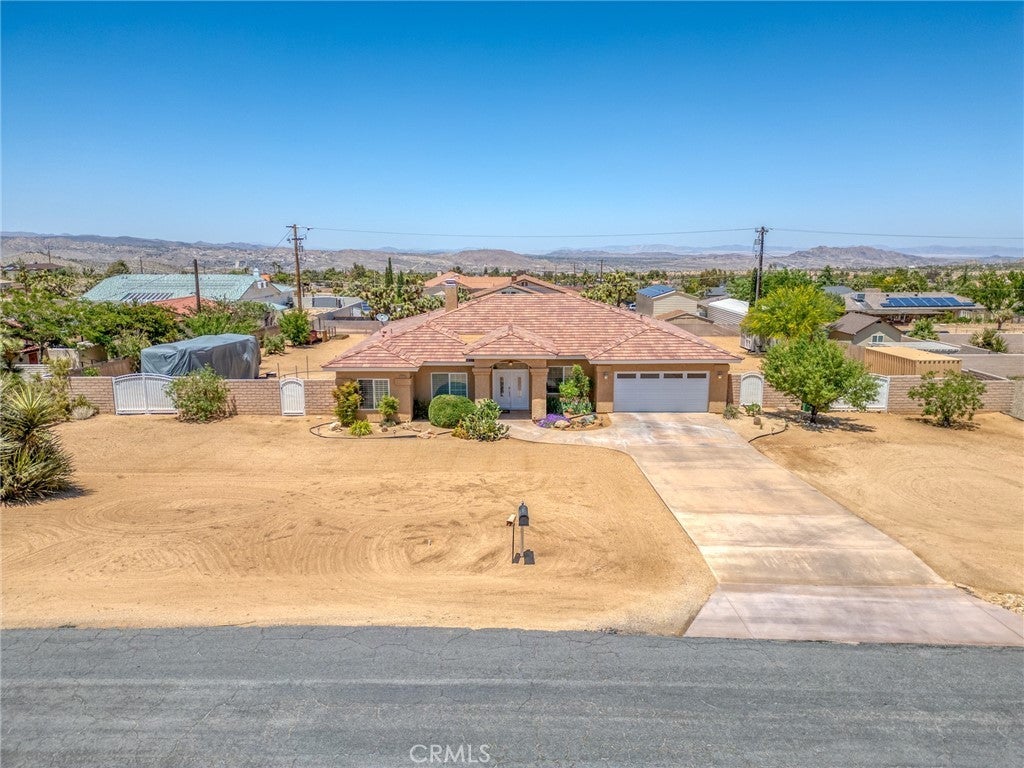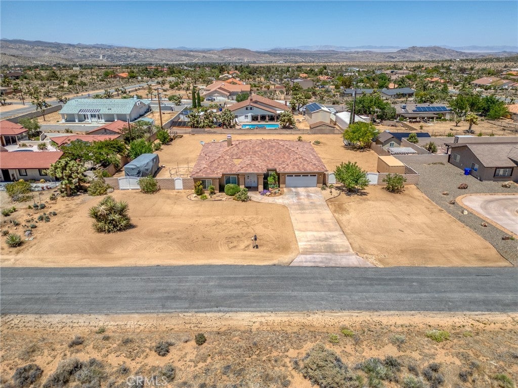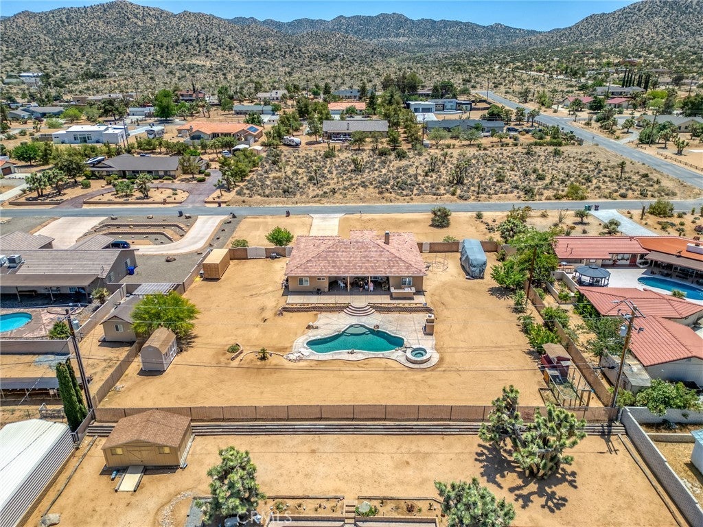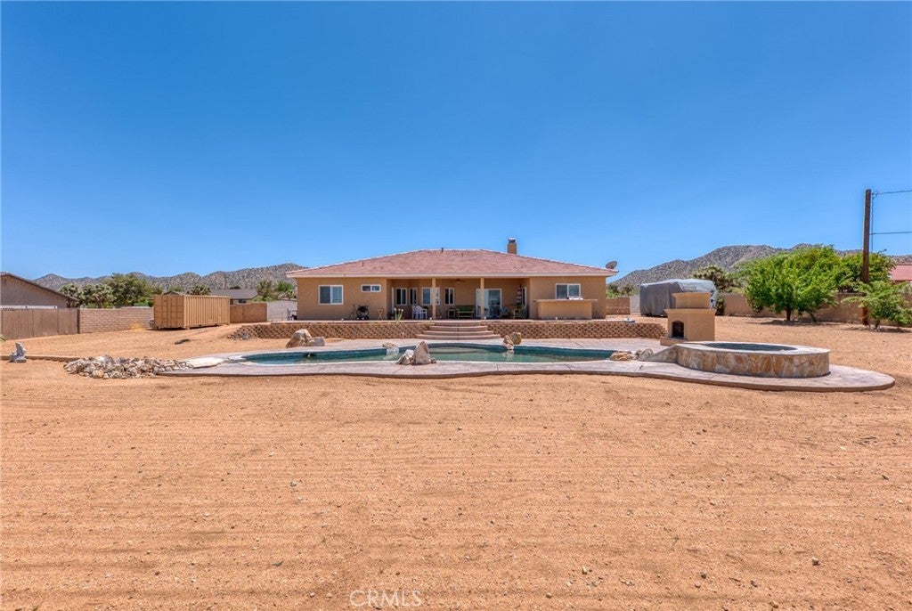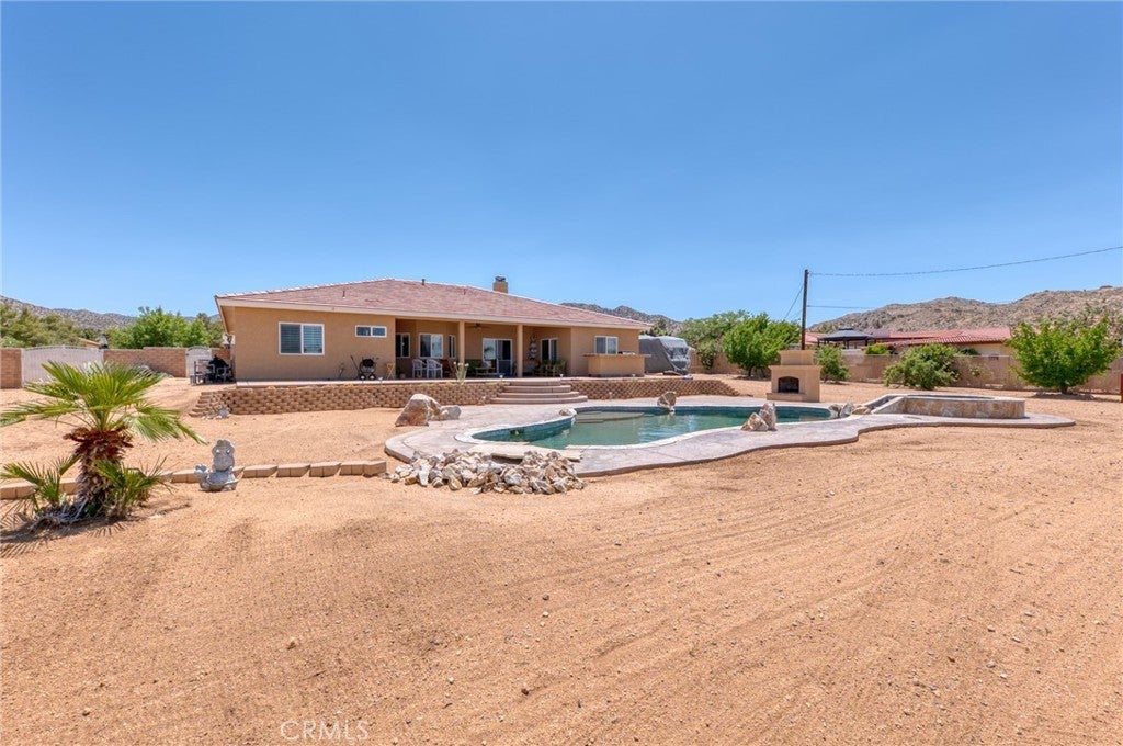 Welcome to this stunning 4-bedroom, 3-bathroom home in the desirable Upper Sky Harbor neighborhood of Yucca Valley, just minutes from Black Rock Campground and the entrance to Joshua Tree National Park. Set on a fully fenced 0.69-acre lot, this 2,395 sq. ft. home offers a perfect blend of space, comfort, and desert charm. A double-door entry opens to 9-foot ceilings, graceful archways, and custom 4-inch plantation shutters throughout. The open-concept layout includes a formal dining room, separate den, and a spacious living area centered around a gas fireplace. The adjacent kitchen features custom birch cabinetry, granite countertops, a gas stove, built-in microwave, walk-in pantry, recessed lighting, and an eat-up breakfast bar, with a cozy breakfast nook completing the space. The thoughtfully designed floor plan provides privacy and functionality. Two guest bedrooms on the east wing are spacious, carpeted, and share a full bathroom with granite countertops, tile flooring, and a tub/shower combo. A third guest bedroom on the southwest corner offers plenty of light, a ceiling fan, and access to another full bathroom with similar finishes. The expansive primary suite is a true retreat, with French doors to the backyard, a large walk-in closet with custom built-ins, and a luxurious ensuite featuring dual granite vanities, a soaking tub, walk-in glass shower, private toilet room, and abundant natural light. The indoor laundry room offers ample cabinetry, a deep utility sink, and direct access to the attached two-car garage. Outside, the backyard is an entertainer’s dream. Enjoy a covered patio with ceiling fans, stamped concrete, and a built-in outdoor kitchen complete with a grill and refrigerator. The in-ground heated Pebble Tec pool and attached spa are surrounded by quartzite coping and low-maintenance landscaping, with a freestanding gas fireplace offering the perfect spot to unwind. Additional features include a newer HVAC system, evaporative cooler, and gas water heater; vinyl plank flooring and new carpeting in bedrooms; all LED lighting; SimpliSafe security system; double-paned windows and sliders; a storage shed; a screened chicken coop; and irrigated fruit trees, including apple, plum, apricot, and almond. With every detail thoughtfully upgraded and maintained, this beautiful home offers the best of indoor-outdoor living in one of Yucca Valley’s most sought-after areas.