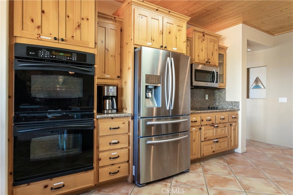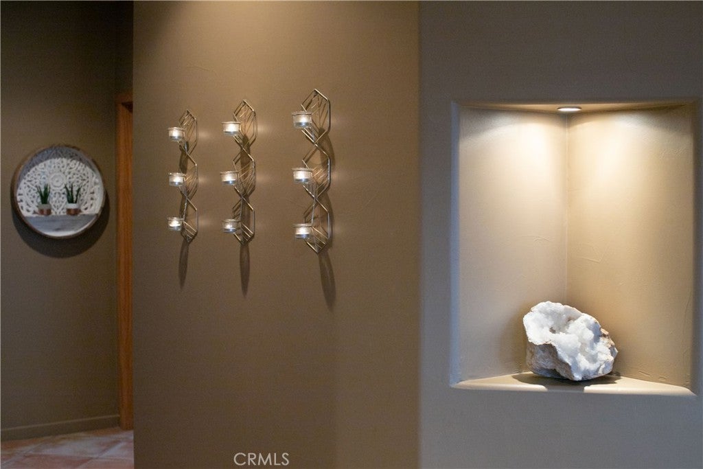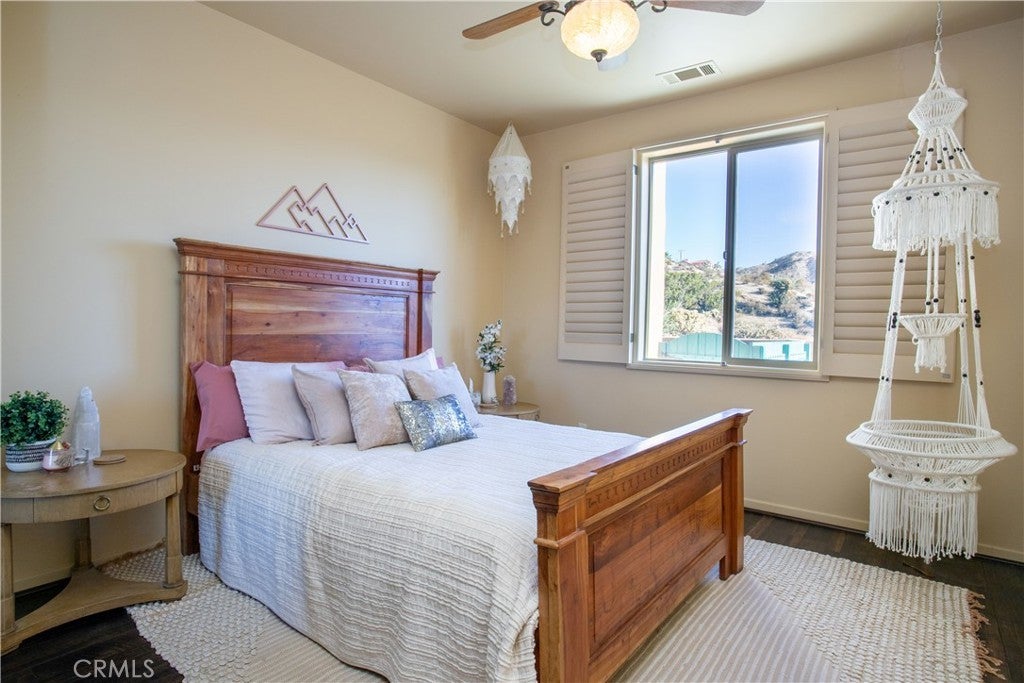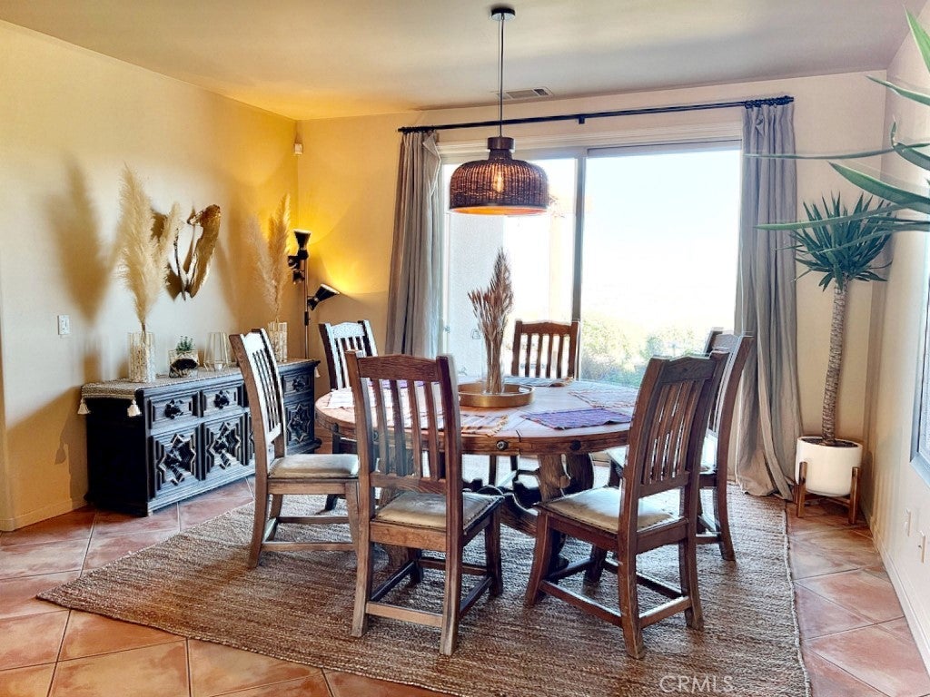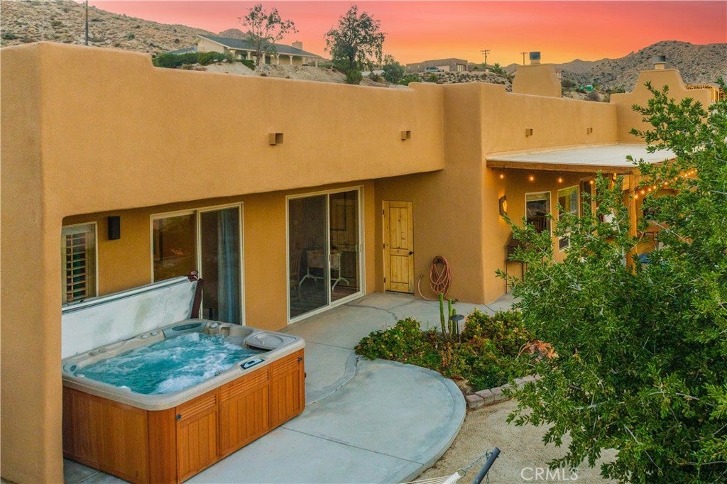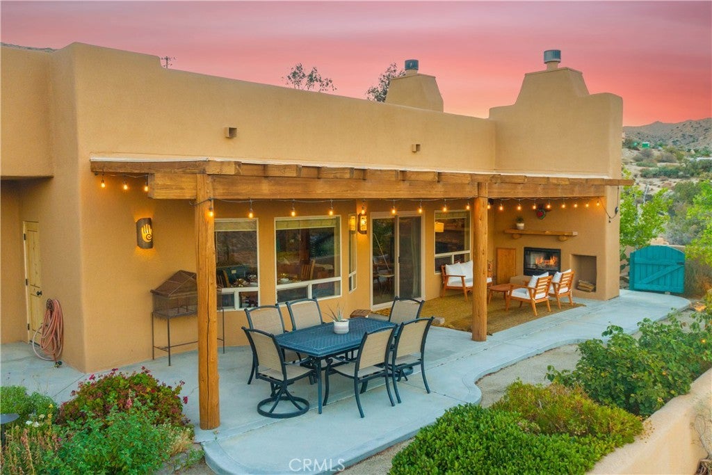 Nestled in the hills of Yucca Valley near Pioneertown, this fully furnished Santa Fe Boho Modern home offers a serene desert escape with breathtaking panoramic views. Designed for comfort and style, this spacious residence features a private hot tub looking towards the Joshua Tree National Park, perfect for enjoying starlit nights in total relaxation. FULL SOLAR plus TESLA POWERWALL on fixed payment to reduce energy bills! The expansive primary suite includes a California King bed, en-suite bath with a walk-in shower, an indoor jacuzzi, and private patio access. Two additional bedrooms, each with queen beds, share a full bath and offer beautiful desert views, while a bonus room serves as a nursery or extra bedroom with twin bunkbeds. The spacious kitchen boasts a jumbo island, breakfast bar, and premium appliances, seamlessly flowing into the mountain lodge-style living room with a grand fireplace—an inviting space for entertaining or unwinding. A dedicated yoga/game room provides a tranquil setting for relaxation, meditation, or family game nights. Outside, the shaded terrace with a fireplace offers a perfect spot to take in the stunning landscape of Joshua Tree Basin. High-speed WiFi and a dedicated workspace make this home ideal for remote work. The laundry room includes a second fridge for additional storage, adding to the home’s convenience. Secure interior storage room with work bench and cabinetry! Located in a safe, quiet area on the west end of Yucca Valley making both Joshua Tree and Palm Springs/Coachella valley a short drive! Sitting on the hill just minutes above Hawk's Landing Golf Course, and less than 10 minutes Pioneertown!