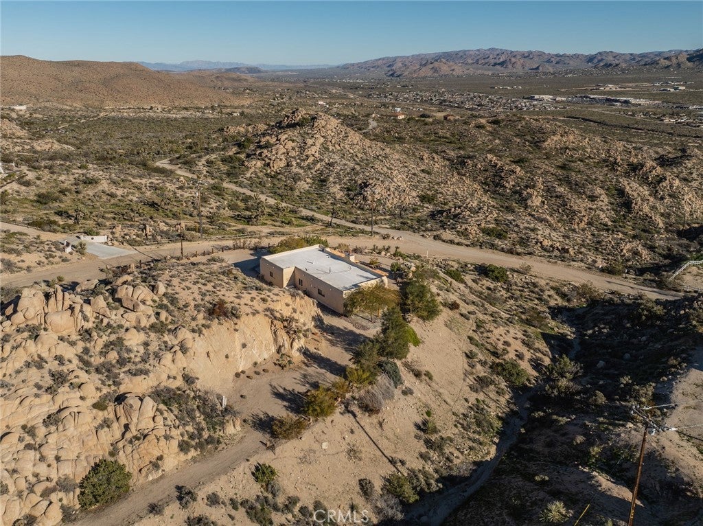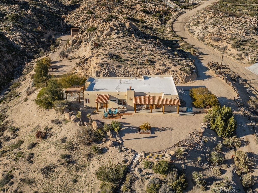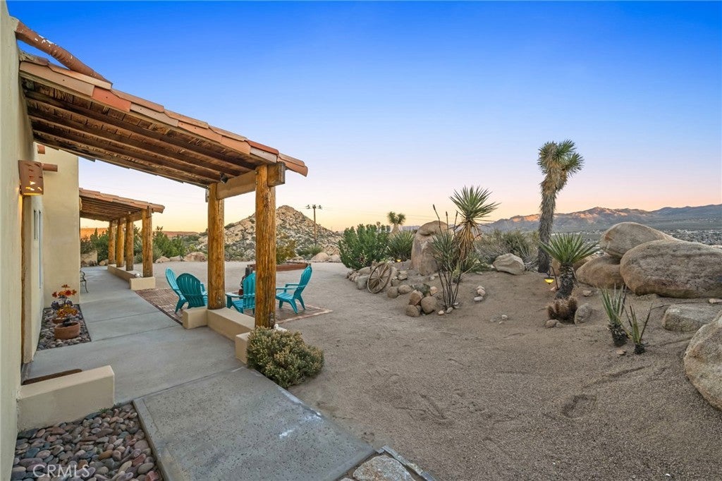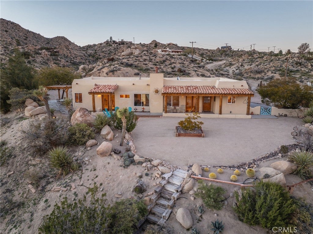 Commanding views from a Western Hills adobe define this elevated custom home, set within Yucca Valley’s most sought-after area. Carefully positioned among dramatic granite formations and mature native landscaping, the home offers a strong sense of connection to its surroundings Expansive windows frame natural scenes in every direction. Rock formations, desert flora, and sweeping valley horizons bring light, landscape, and the rhythm of the desert into everyday living. Multiple outdoor living spaces invite both gathering and quiet retreat. Enjoy evenings under the pergola, conversations around the fire pit, and peaceful walks along the natural path leading to a large shed at the back of the property – ideal for creative pursuits. Expansive flat areas offer flexibility for future enhancements, while established yuccas, Joshua trees, mesquite, junipers, and other native plants create a lush yet low-maintenance desert setting. Inside, the home is warm and welcoming, with Saltillo tile floors, exposed log ceilings, and large picture windows designed to maximize light and views. Patio doors support seamless indoor-outdoor living, ideal for entertaining or everyday relaxation. The kitchen is both beautiful and functional, featuring a Wolf range with hood, Fantastico granite countertops with full backsplash, and high-end fixtures. A flexible fourth bedroom works equally well as a guest room or home office. In the primary suite, double doors open to serene views, creating a private and restorative retreat. Located as the first home off the paved road within a secluded community, the property combines easy access with a sense of separation. Whether you’re seeking a full-time residence, a second home, or a peaceful escape, this is a place where the life slows, the views expand, and the landscape becomes part of how you live.