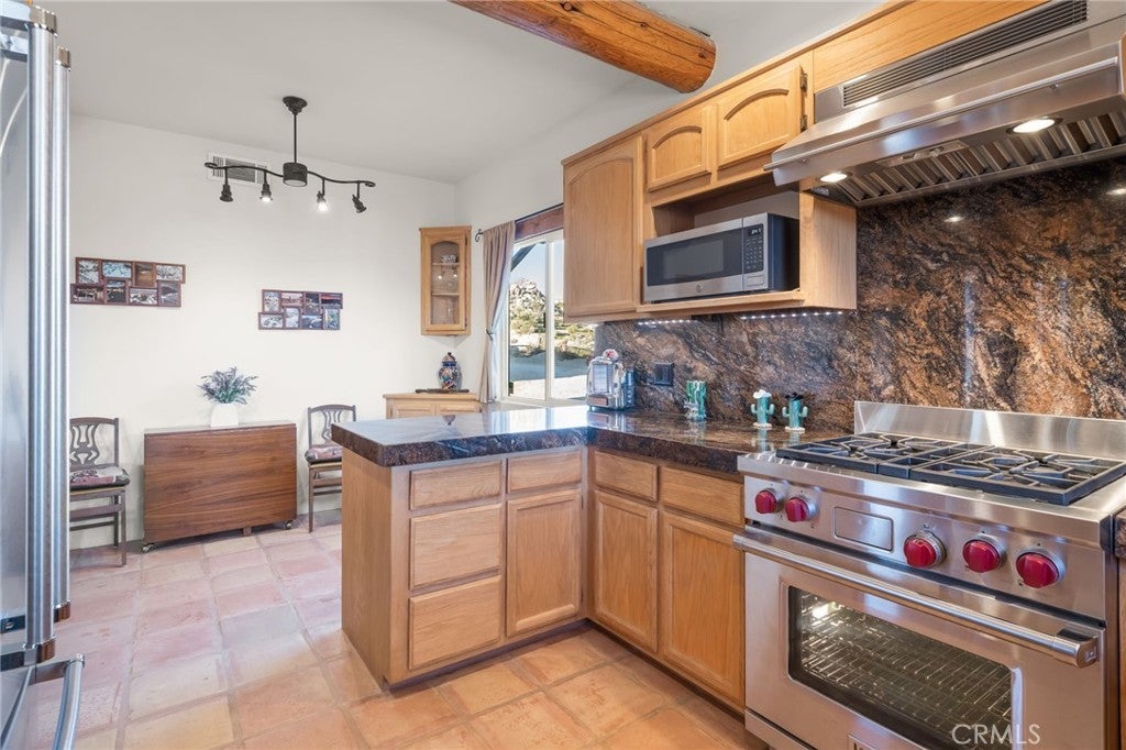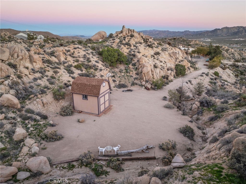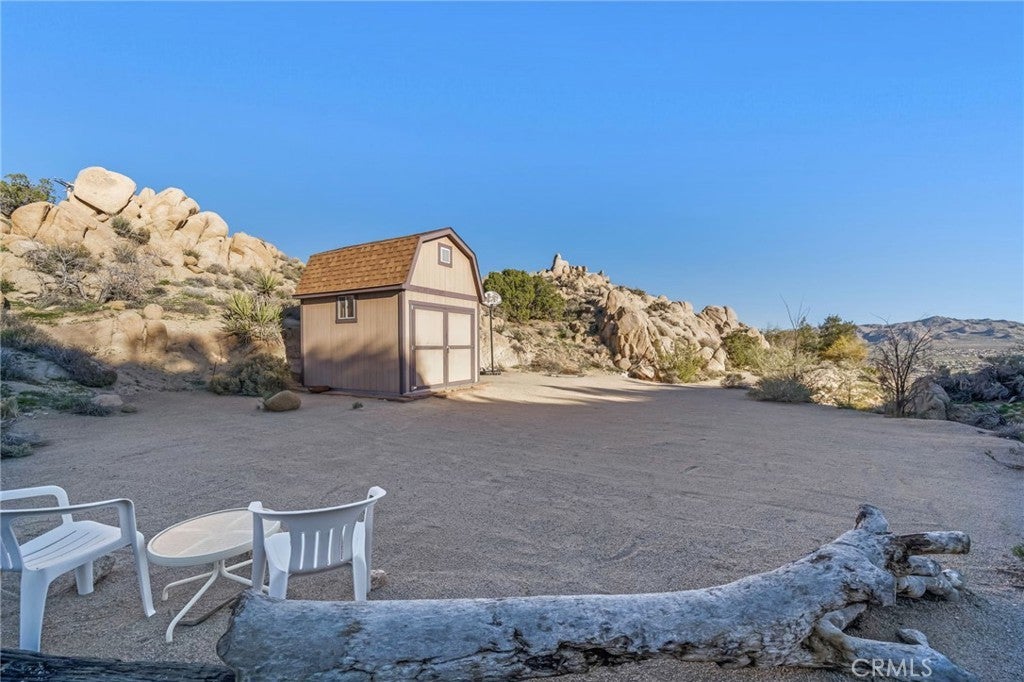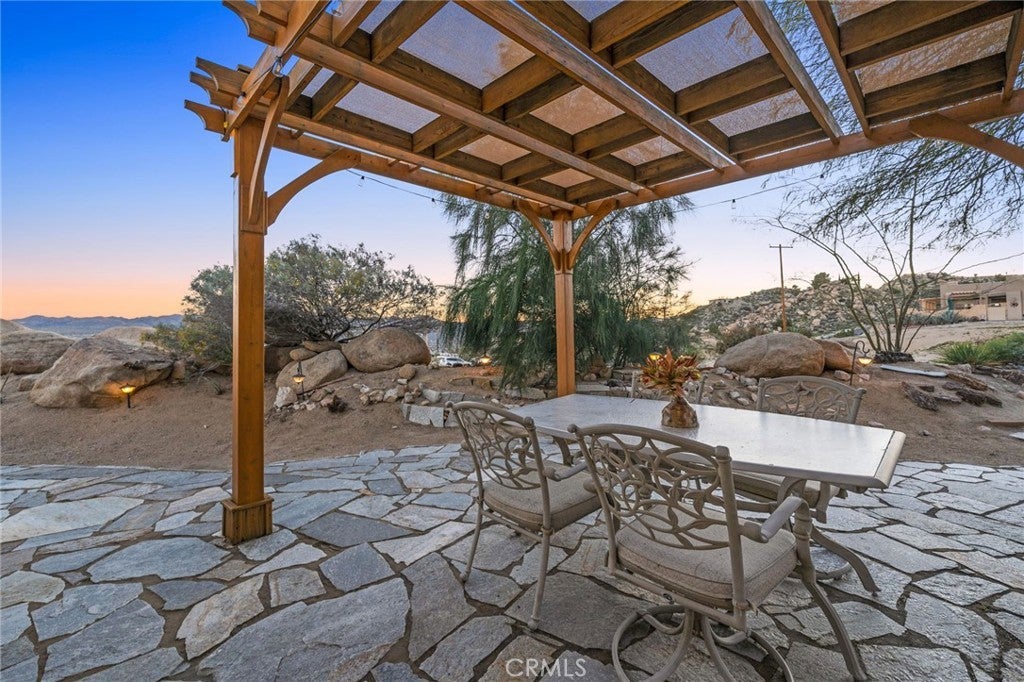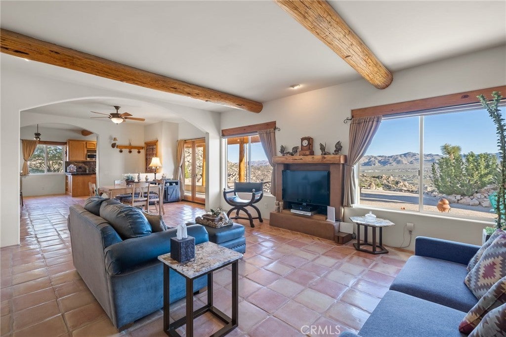Commanding views from a Western Hills adobe define this elevated custom home, set within Yucca Valley’s most sought-after area. Carefully positioned among dramatic granite formations and mature native landscaping, the home offers a strong sense of connection to its surroundings Expansive windows frame natural scenes in every direction. Rock formations, desert flora, and sweeping valley horizons bring light, landscape, and the rhythm of the desert into everyday living. Multiple outdoor living spaces invite both gathering and quiet retreat. Enjoy evenings under the pergola, conversations around the fire pit, and peaceful walks along the natural path leading to a large shed at the back of the property – ideal for creative pursuits. Expansive flat areas offer flexibility for future enhancements, while established yuccas, Joshua trees, mesquite, junipers, and other native plants create a lush yet low-maintenance desert setting. Inside, the home is warm and welcoming, with Saltillo tile floors, exposed log ceilings, and large picture windows designed to maximize light and views. Patio doors support seamless indoor-outdoor living, ideal for entertaining or everyday relaxation. The kitchen is both beautiful and functional, featuring a Wolf range with hood, Fantastico granite countertops with full backsplash, and high-end fixtures. A flexible fourth bedroom works equally well as a guest room or home office. In the primary suite, double doors open to serene views, creating a private and restorative retreat. Located as the first home off the paved road within a secluded community, the property combines easy access with a sense of separation. Whether you’re seeking a full-time residence, a second home, or a peaceful escape, this is a place where the life slows, the views expand, and the landscape becomes part of how you live.