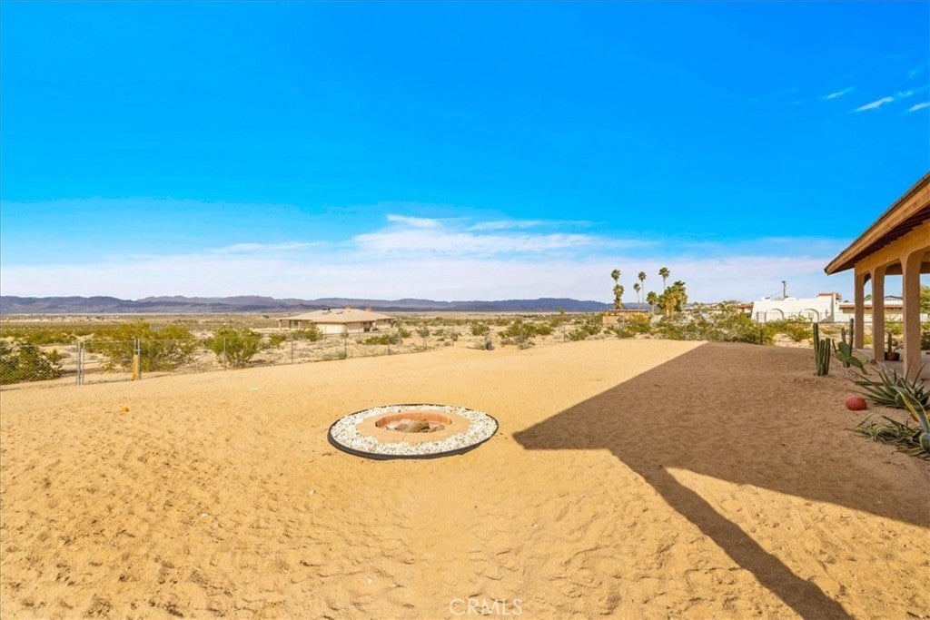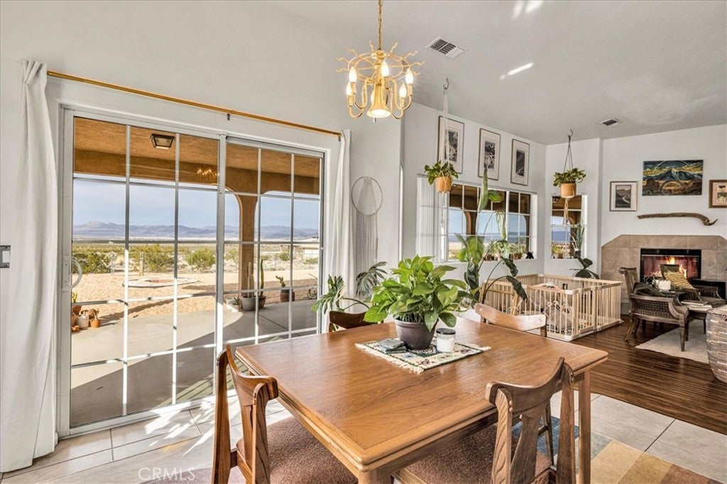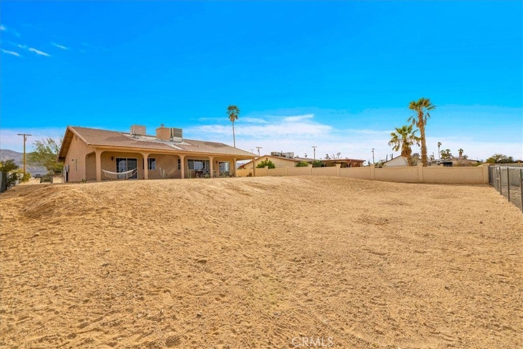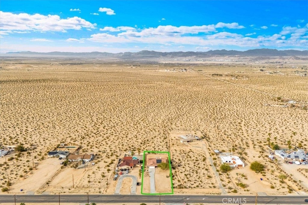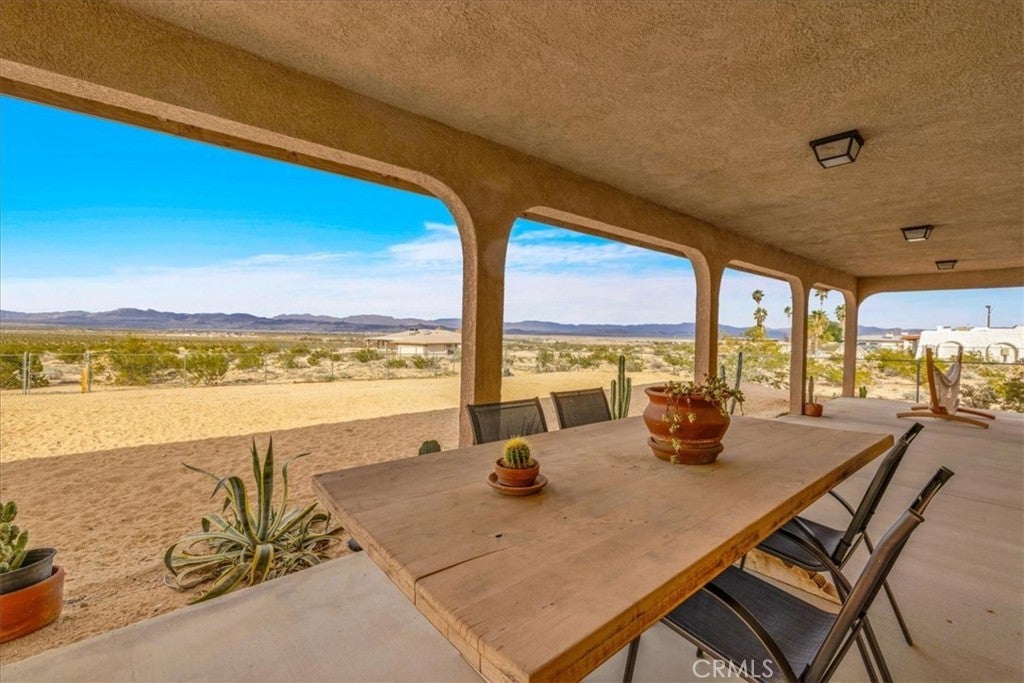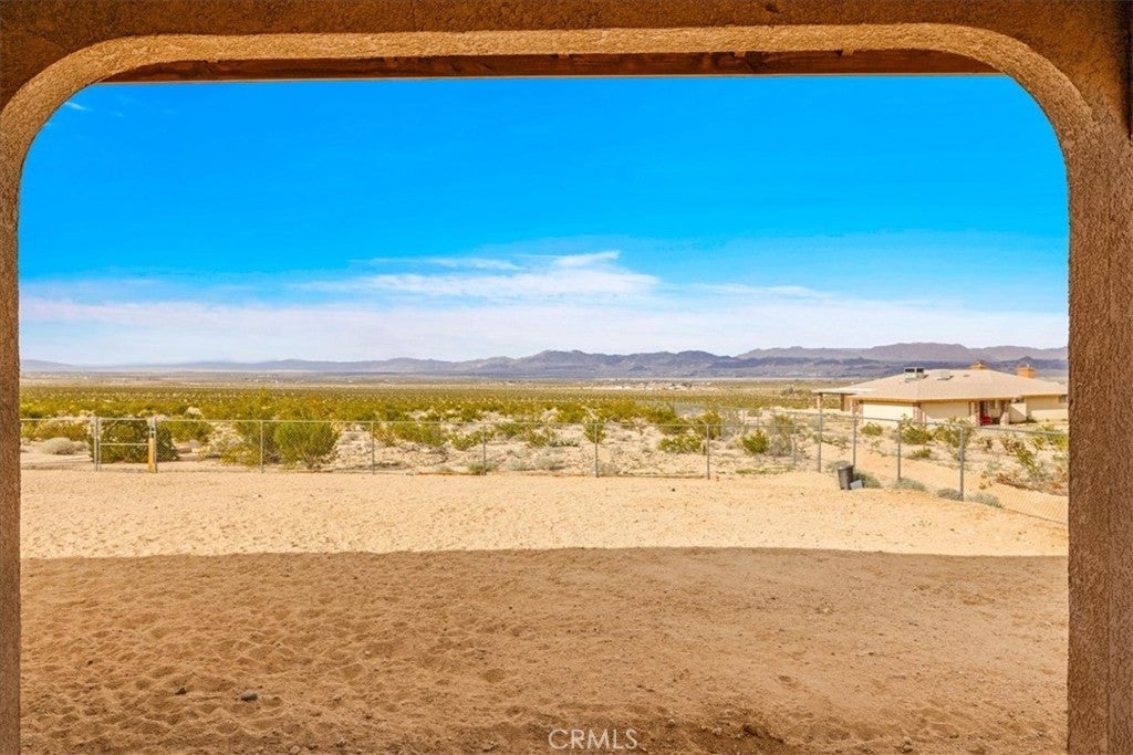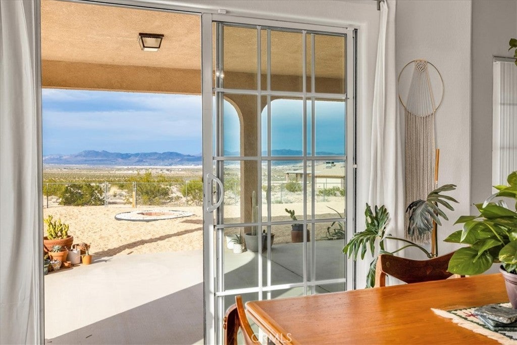 Welcome to 72962 Two Mile Rd, a beautifully-maintained 3 bed/2bath desert home nicely situated on just over a half acre of land with PAID SOLAR and Tesla Powerwall, stunning mountain views, and numerous upgrades throughout. The home itself is set back on the property with a long, inviting driveway and a nicely-landscaped yard with native plants. As you step inside the lovely open-concept living space, you’ll find warm wood-like laminate flooring, high-ceilings, a cozy gas fireplace, as well as several large, north-facing windows that let in an abundance of natural light throughout the day. The living room flows effortlessly into the dining and kitchen space, which boasts an oversized island with bar seating, new stainless steel appliances, a new seven-stage reverse osmosis water filtration system, earth-toned tile flooring, and ample cabinet and counter space. The dining area features a sliding glass door overlooking the mountain range to the north. The spacious primary bedroom features an ensuite bathroom, walk-in closet, and a sliding glass door leading to the back patio. All bedrooms include ceiling fans and picture windows; both bathrooms have single-sink vanities with shower/tub combos. Additional notable features include dual cooling, 1 GB fiber internet, new energy efficient washer, tile roof, and an indoor/outdoor SimpliSafe security system with smart fire & CO2 sensors. The property also features an attached 2-car garage with a new tankless water heater, and level 2 Tesla EV Charger! Outside you'll be delighted to find a fully-fenced yard with a gate that opens to the desert, offering dirt roads for nature walks, a beautiful north-facing covered patio that runs along the full length of the home, and plenty of space to entertain or relax around a firepit on a starry desert night. Located conveniently close to downtown 29 Palms, schools, eateries, the Marine Corps base, Joshua Tree National Park & more. All that's missing is YOU! Come take a look and let this home's charming allure do the rest, your new desert sanctuary or weekend retreat awaits.