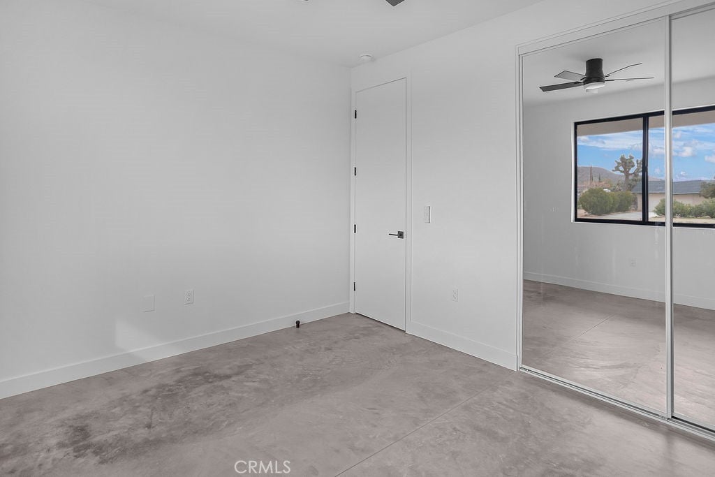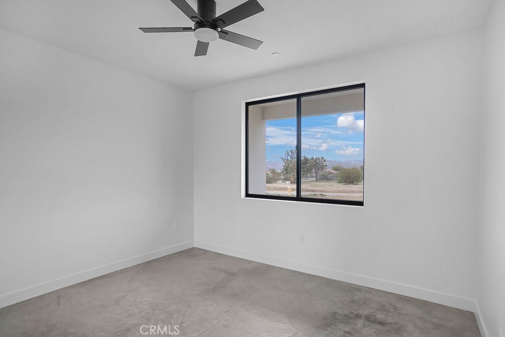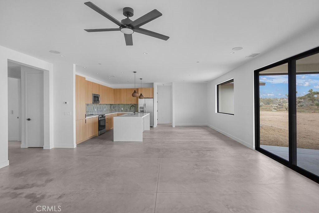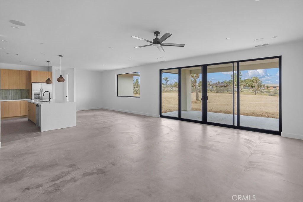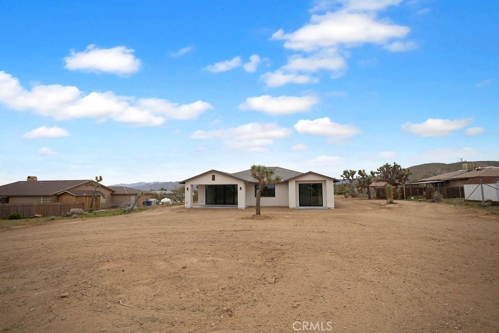 Modern desert architecture meets clean-lined minimalism in this newly built 2,047 square foot residence set on a 29,950 square foot parcel in Yucca Mesa. The design is intentional from the moment you enter. Polished concrete floors run throughout, creating a seamless visual foundation that pairs with warm natural wood cabinetry and matte black hardware. Expansive black-framed sliding glass doors open the living space to a covered patio, blending indoor and outdoor living against a backdrop of desert sky and mountain views. The kitchen anchors the home with a waterfall-edge island, quartz countertops, full-height artisan tile backsplash, stainless steel appliances, and integrated storage. Pendant lighting and recessed fixtures provide layered illumination while maintaining the home’s clean aesthetic. The primary suite offers a refined retreat with a custom-tiled walk-in shower, dual vanity, and modern finishes. Secondary bedrooms are thoughtfully positioned for privacy and flexibility. A dedicated laundry room with built-in cabinetry and utility sink enhances functionality. Owned solar contributes to energy efficiency and long-term savings. As new construction, the home benefits from updated systems, materials, and contemporary design throughout. Located in Yucca Mesa, known for its spacious parcels and open desert surroundings, just a short drive to dining, shops, and community events, and convenient access to Joshua Tree National Park. Buyer to verify all information including square footage, utilities, zoning, and solar specifications.
