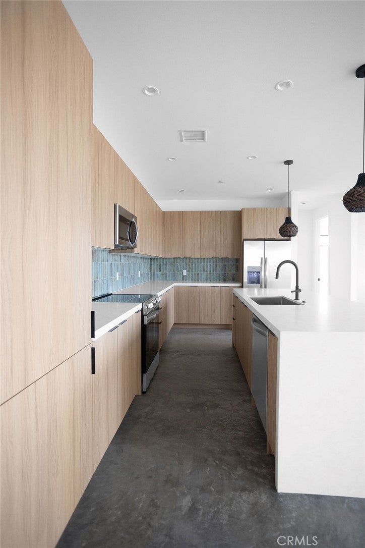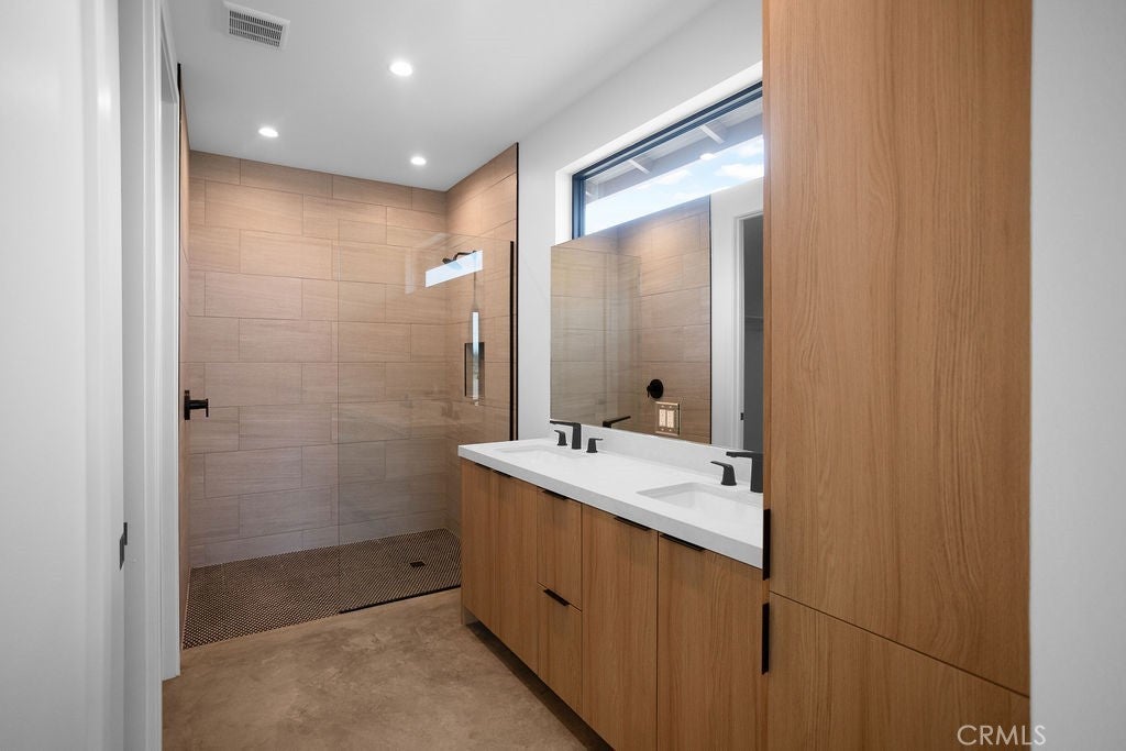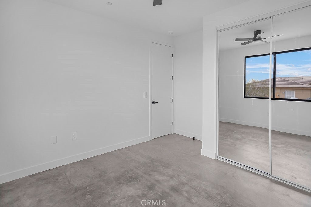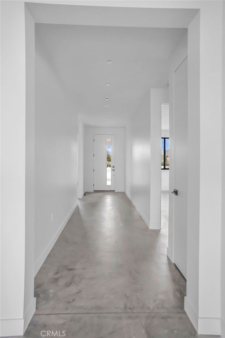 Modern desert architecture meets clean-lined minimalism in this newly built 2,047 square foot residence set on a 29,950 square foot parcel in Yucca Mesa. The design is intentional from the moment you enter. Polished concrete floors run throughout, creating a seamless visual foundation that pairs with warm natural wood cabinetry and matte black hardware. Expansive black-framed sliding glass doors open the living space to a covered patio, blending indoor and outdoor living against a backdrop of desert sky and mountain views. The kitchen anchors the home with a waterfall-edge island, quartz countertops, full-height artisan tile backsplash, stainless steel appliances, and integrated storage. Pendant lighting and recessed fixtures provide layered illumination while maintaining the home’s clean aesthetic. The primary suite offers a refined retreat with a custom-tiled walk-in shower, dual vanity, and modern finishes. Secondary bedrooms are thoughtfully positioned for privacy and flexibility. A dedicated laundry room with built-in cabinetry and utility sink enhances functionality. Owned solar contributes to energy efficiency and long-term savings. As new construction, the home benefits from updated systems, materials, and contemporary design throughout. Located in Yucca Mesa, known for its spacious parcels and open desert surroundings, just a short drive to dining, shops, and community events, and convenient access to Joshua Tree National Park. Buyer to verify all information including square footage, utilities, zoning, and solar specifications.
