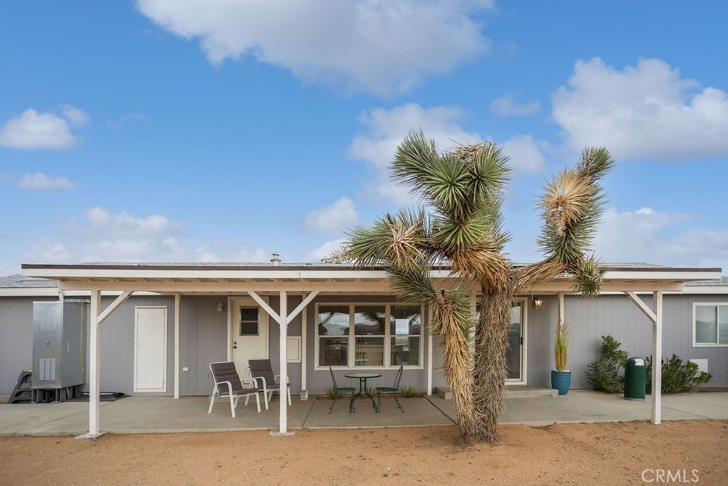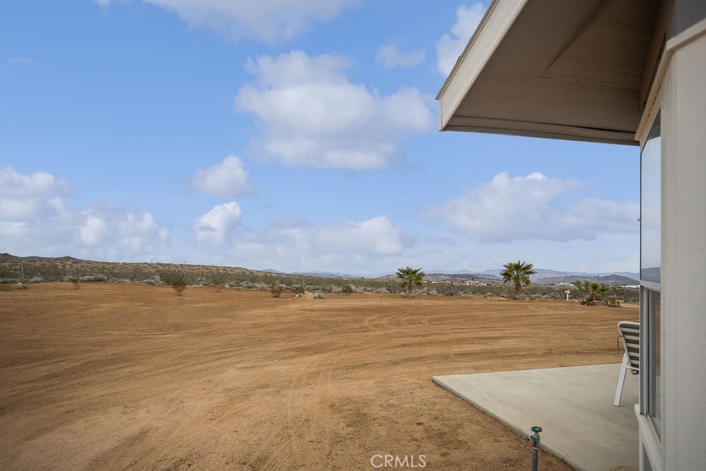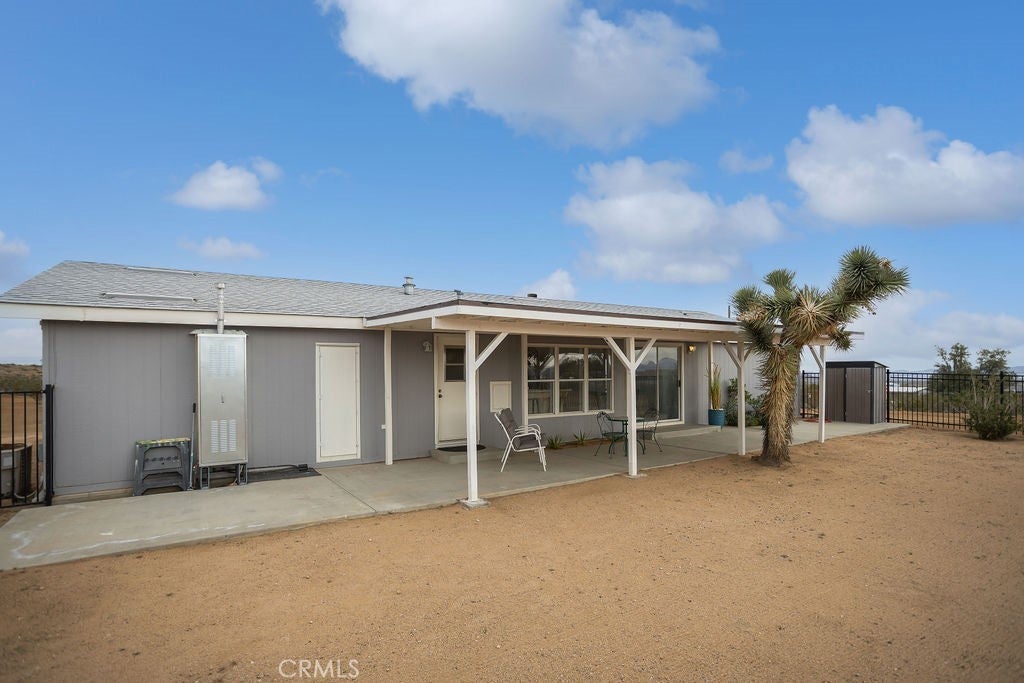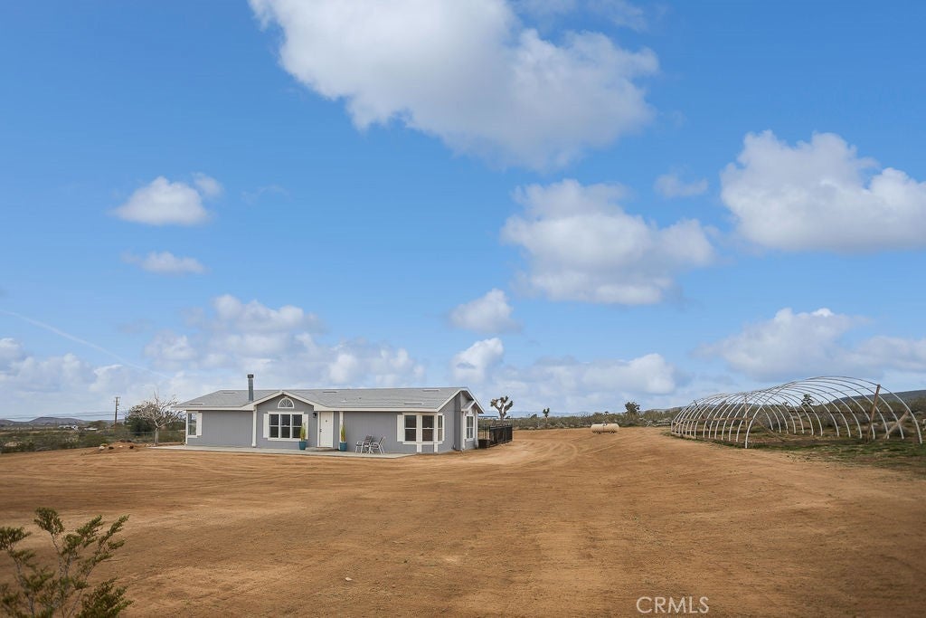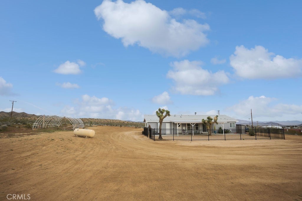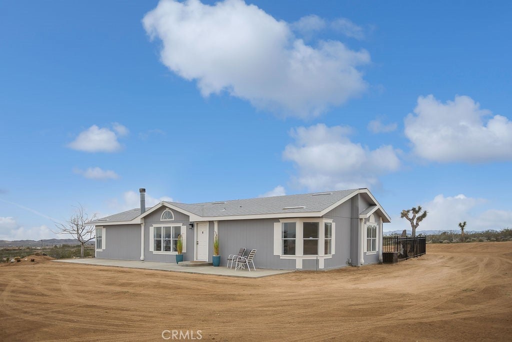 Manufactured home on permanent foundation situated on approximately 5 acres in Yucca Valley’s West Flamingo Heights area. Built in 2000, this 3-bedroom, 2-bath home offers 1,573 square feet with a desirable split floor plan and high cathedral ceilings throughout. The living room features a wood-burning fireplace and ceiling fan, with an open layout connecting to the dining area and kitchen. Kitchen includes a propane range, refrigerator, pantry, kitchen island, and ample cabinetry. The primary suite offers a walk-in closet and en-suite bath with dual sinks, soaking tub, and separate walk-in shower. Additional bedrooms are positioned for privacy. Laundry room includes washer hookup and gas dryer hookup. Central heating and air conditioning provide year-round comfort. The home is serviced by an owned propane tank. Exterior features include concrete surrounding the home, covered patio area, and full chain-link fencing around the 5-acre parcel. Enjoy expansive desert, mountain, and panoramic views. Property is located in an unincorporated area of San Bernardino County. Buyer to verify all utilities, land use, zoning, permits, square footage, and features to their satisfaction.