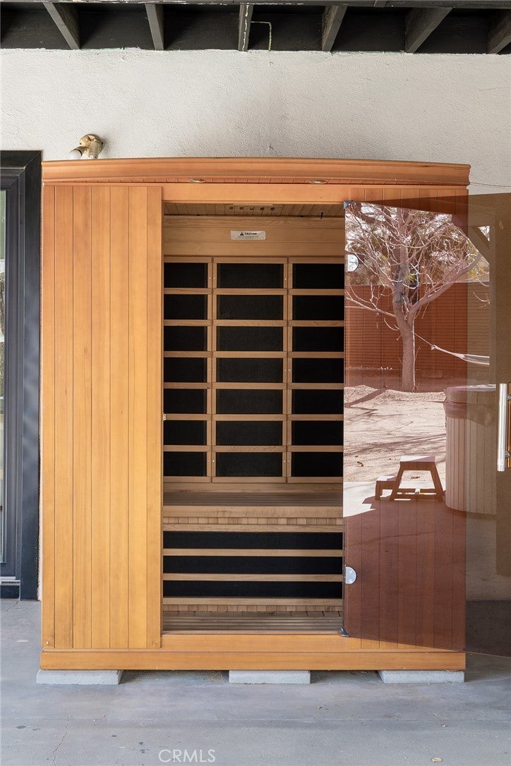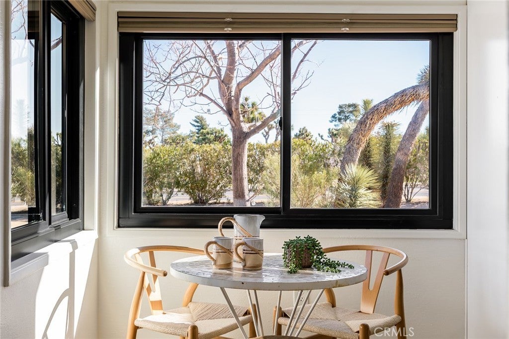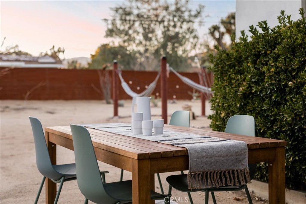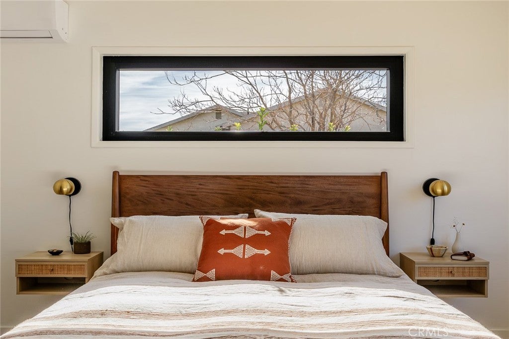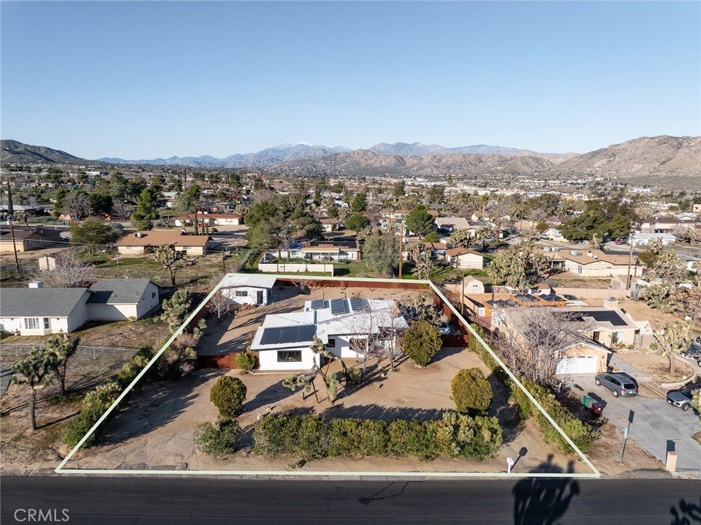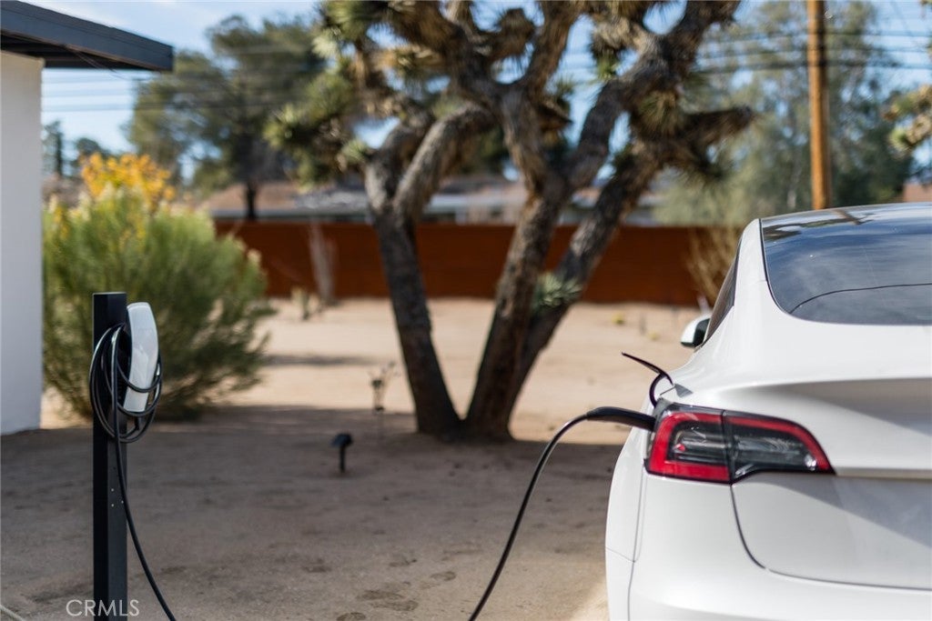 Welcome to 7422 Joshua Ln, a fabulously updated smart home with sophisticated mid-century curves and space-age upgrades. Access the front door with nothing but your fingerprint and enter the oversized living area where mood lighting has been adjusted for your arrival via the intuitive Philips Hue system. Thoughtful floorplan features 3 bedrooms w/ no shared walls + 2 modern full bathrooms. Flanking the back of the home are 2 bedrooms w/ clerestory windows, XL cedar closets, and mountain views. In the front, a generously sized bedroom/flex space w/ private entry makes a wonderful guest quarters or home office. Stay comfortable year-round w/ ductless mini-splits + new Andersen windows w/ honeycomb cordless shades. Bring the joy to cooking in the streamlined chef's kitchen w/ poured concrete countertops, newer appliances, under-cabinet lighting, reverse osmosis water filtration, black fixtures, gold hardware, and miles of cabinet space. Birdwatch from the sunny breakfast nook, catch magical afternoon beams of light in the formal dining room, or dine al fresco on the patio under the brilliant sky. Meticulously maintained and stunningly updated, you’ll create memories around the limewashed wood burning fireplace, take invigorating soaks in the hot tub, get steamy in the sauna, and stargaze meteor showers from multiple hammocks. A detached garage finished w/ drywall, polished concrete floors, and mini-splits expands your footprint by an add’l 420 sq ft, serving as an ideal gym, art studio, or convert it to an ADU for extra income. Charge your EV & blast the A/C with reckless abandon on the massive 11kw solar system grandfathered into NEM2 - get credits back for unused electricity! Lush front landscaping serviced by an irrigation system so smart it knows not to water in high winds or rain. Rich in native flora, property includes mulberry, Desert Willow, Palo Verde, Ocotillo, Red Yucca, Agave, pomegranate, rosemary, Desert Bird of Paradise, juniper, Joshua Trees and a multitude of cacti. Every detail has been taken care of down to fresh exterior paint, new elastomeric roof coating, new tankless hot water heater, washing machine & gas dryer, and city sewer. You won’t want to leave but if you do you’ll be minutes from Joshua Tree National Park, Tiny Pony, Desierto Alto, Copper Room, Pioneertown w/ Pappy & Harriets and Red Dog, and only 30 mins to Palm Springs. Timelessly elegant, futuristically refined, and sold partially furnished - the only thing missing is you!