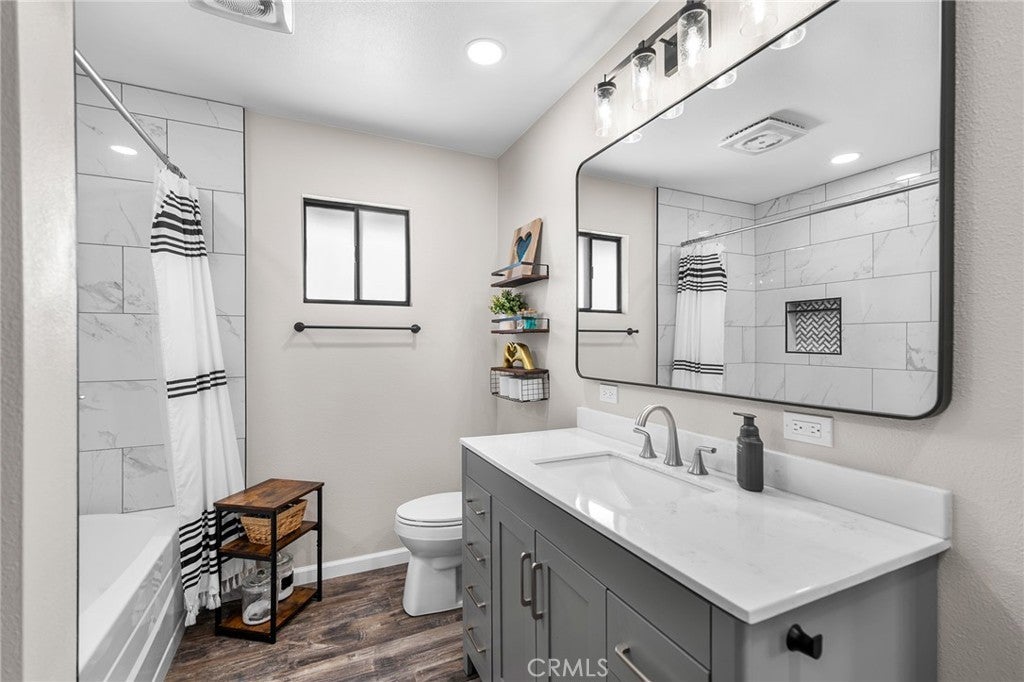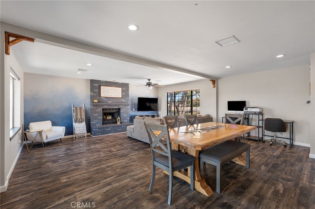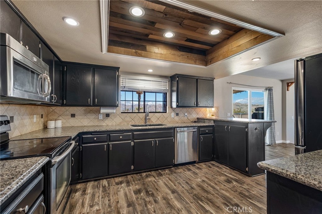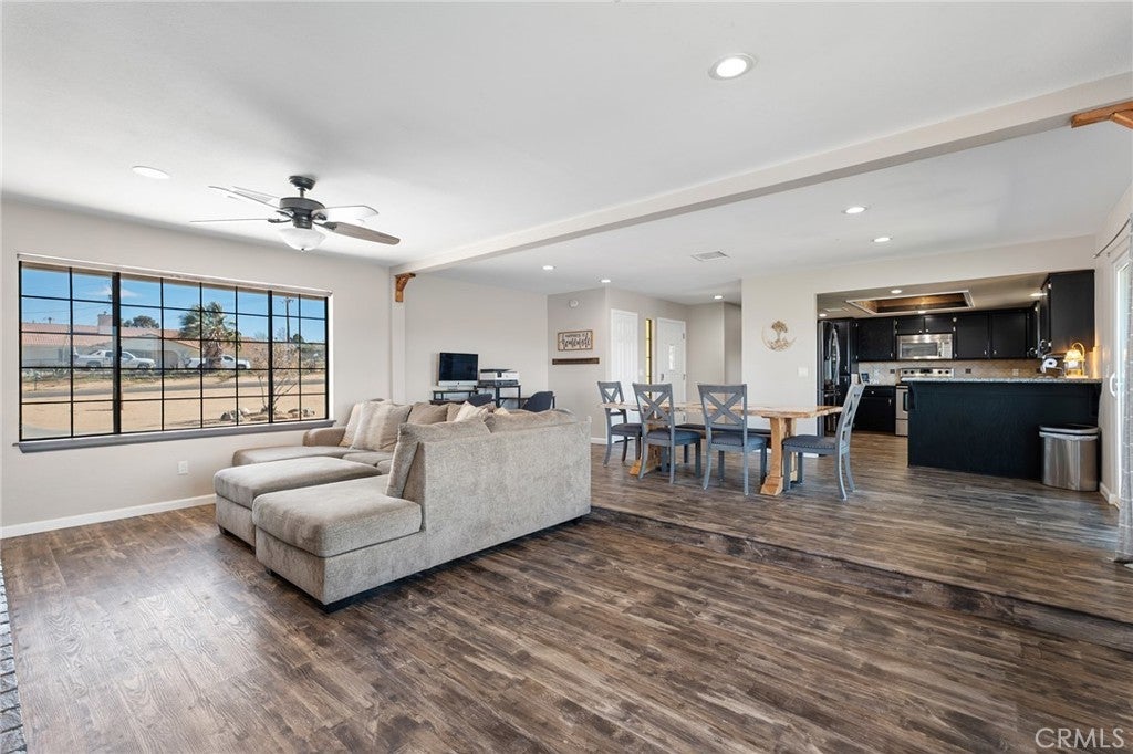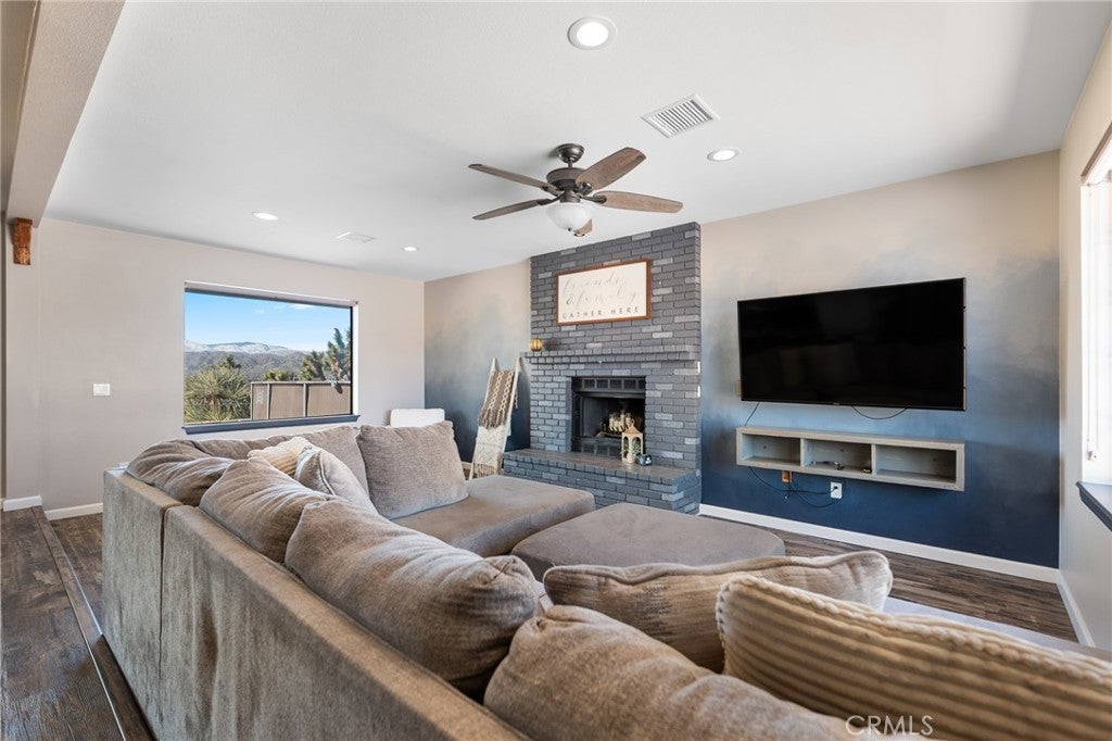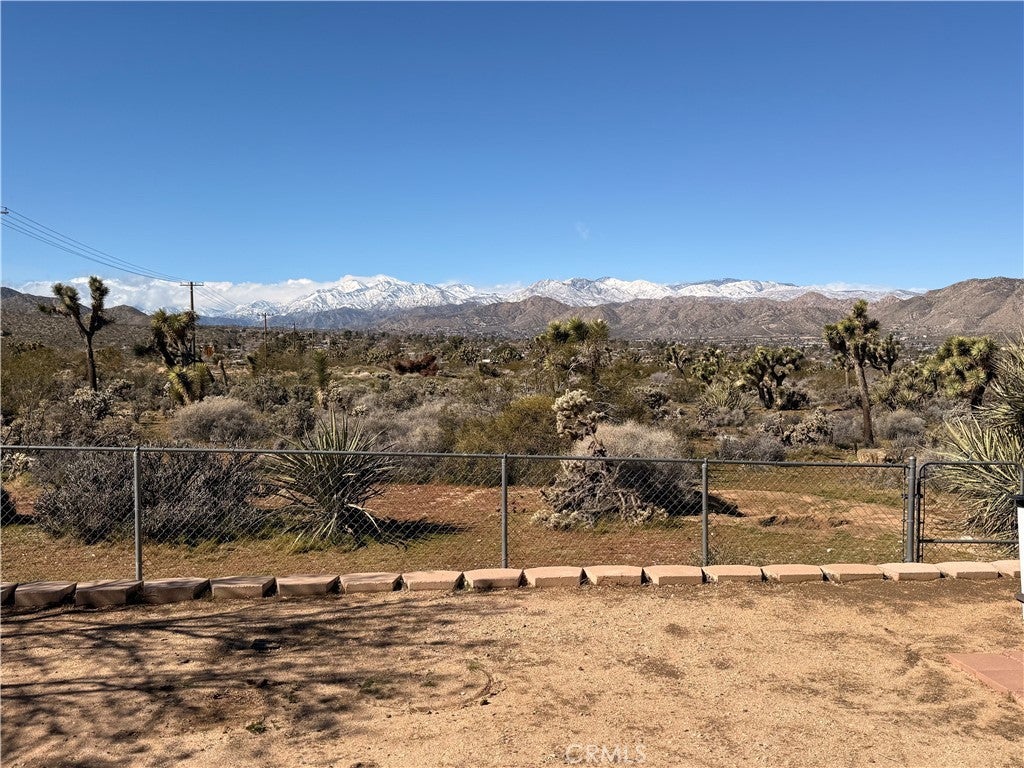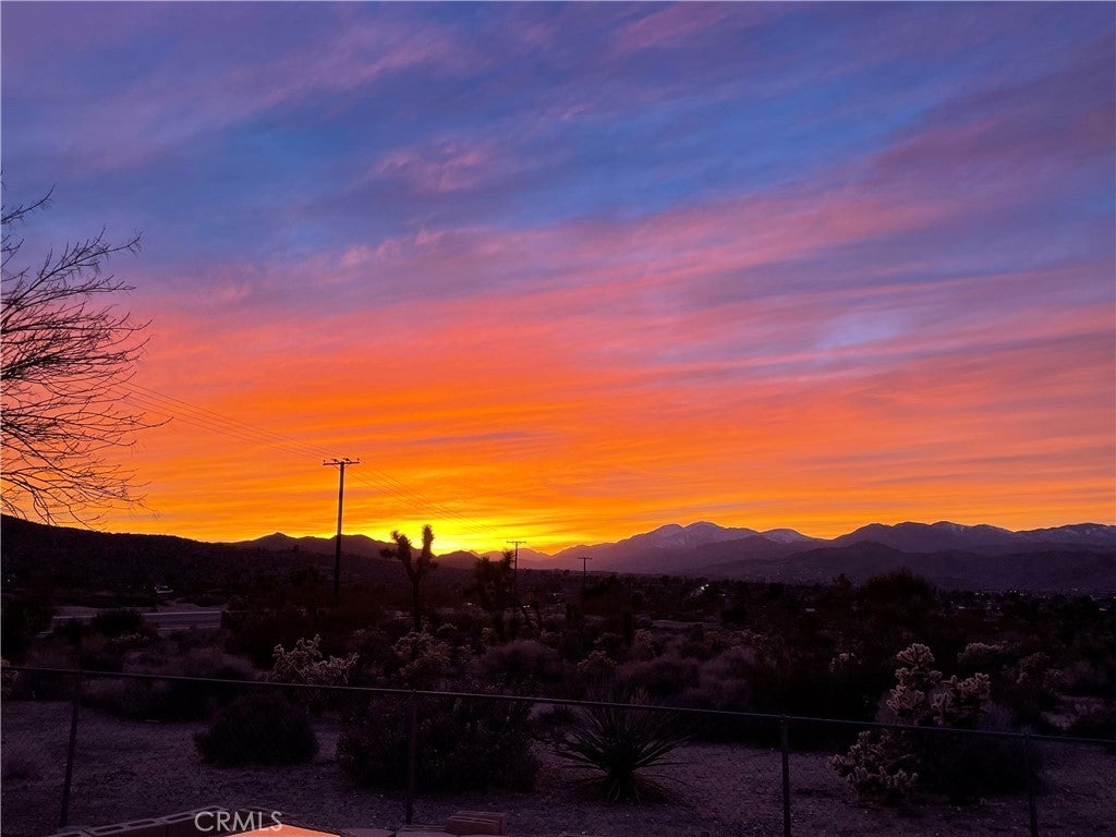 Positioned on a desirable corner lot in the heart of Yucca Valley, this beautifully remodeled 2-bedroom, 2-bath home offers 1,654 square feet of thoughtfully upgraded living space on a fully fenced 0.42 acre parcel. With breathtaking sunset and mountainous views, this property captures the very best of high desert living. Step inside to an open, airy layout filled with natural light and elevated by new vinyl flooring, plush new carpet, updated baseboards and trim, new interior doors, and modern recessed can lighting throughout. The spacious living room centers around a charming wood-burning fireplace, perfect for cozy desert nights and creating a warm, inviting atmosphere for gatherings. The large kitchen is a true showpiece, featuring stunning black cabinetry, sleek granite countertops, and generous workspace ideal for both daily living and entertaining. Its open connection to the main living areas makes hosting seamless while still offering plenty of storage and function. Both bedrooms are generously sized, with the primary suite offering a walk-in closet complete with built-in shelving for optimal organization. The renovated bathrooms showcase thoughtful updates and modern finishes. Comfort is dialed in year-round with central HVAC plus a dedicated mini-split system in the primary bedroom for personalized climate control. Major improvements provide peace of mind, including a new roof and fascia, new AC, and a new water heater. The home is connected to public sewer and includes solar for energy efficiency. Outdoors, the fully fenced lot offers space, privacy, and versatility, complete with an irrigation system, fenced side yard, and a relaxing jacuzzi where you can unwind while taking in those legendary desert sunsets. Conveniently located close to local schools and amenities, this property combines upgraded comfort, energy efficiency, and one of the most photographed views in the neighborhood.