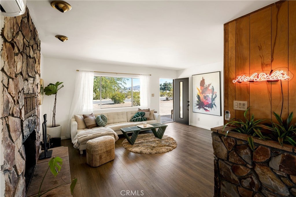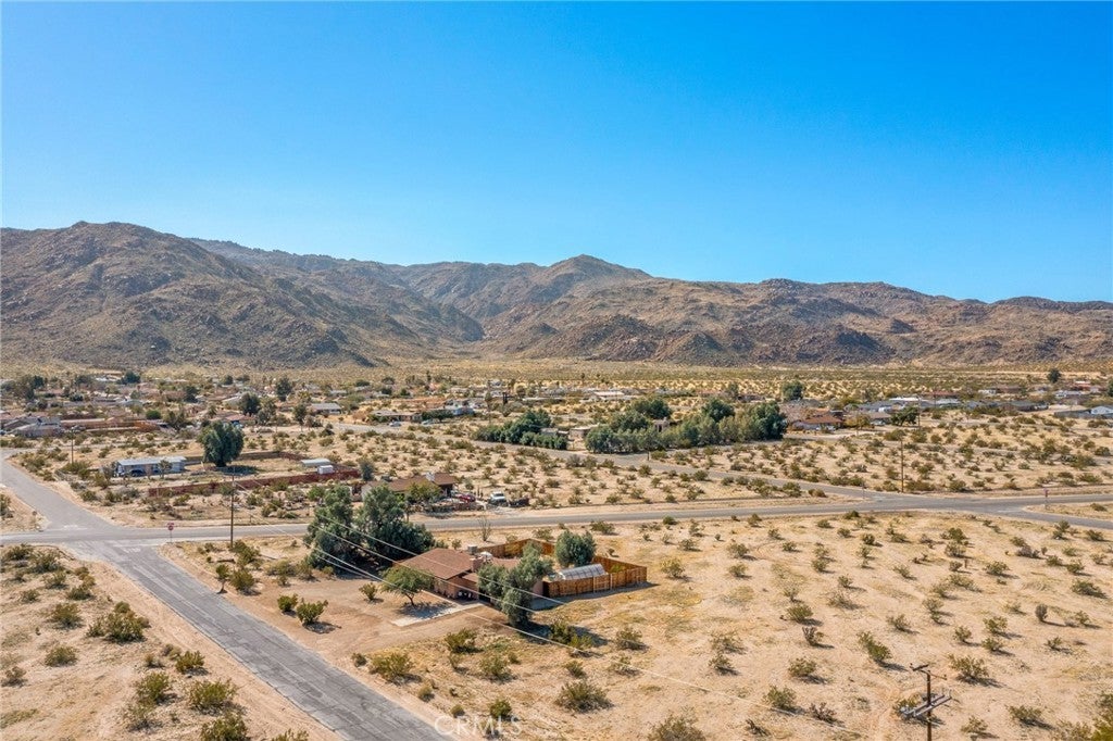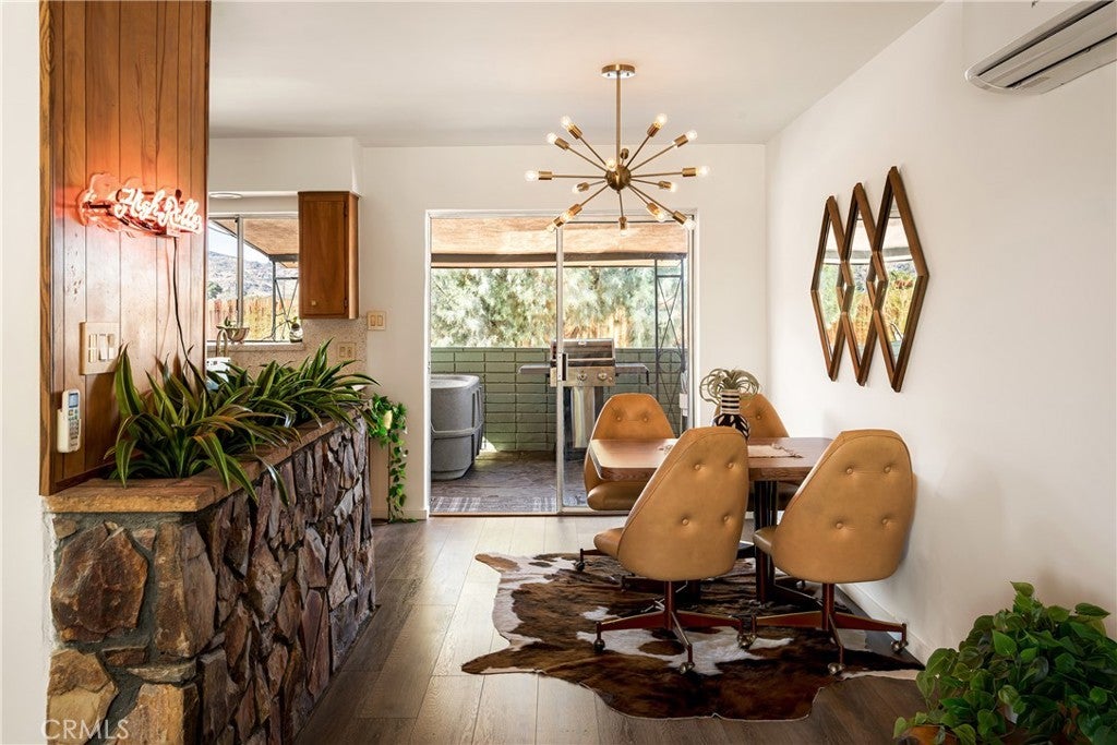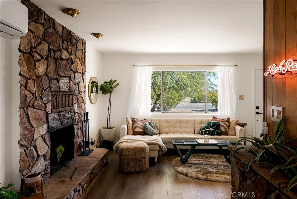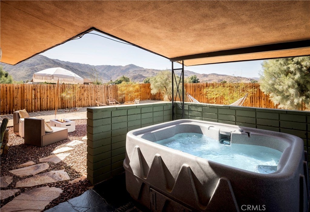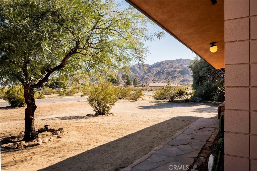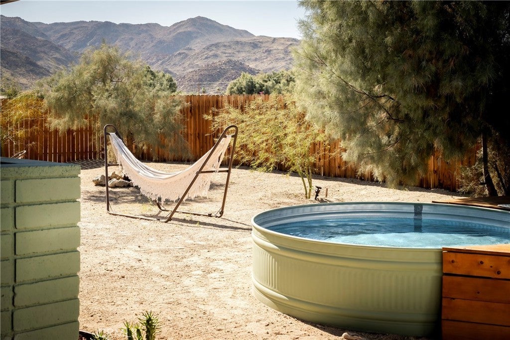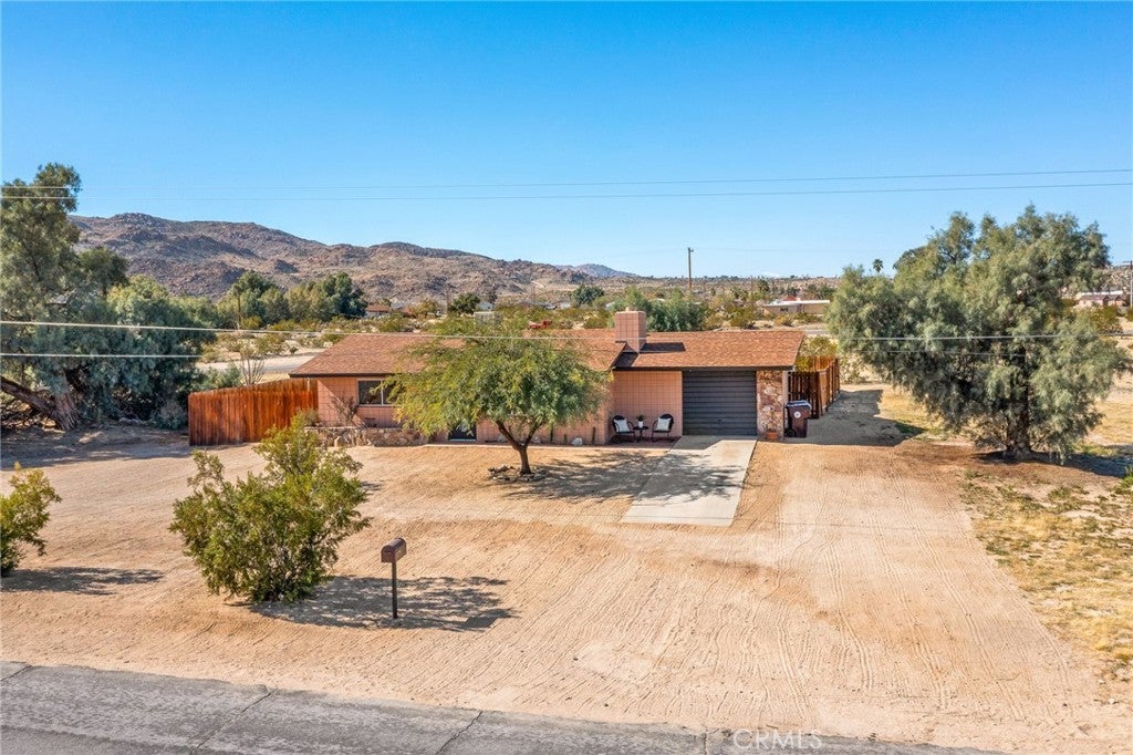 VINTAGE MID-CENTURY OASIS: Built in 1964, this brick-and-stone original sits on an approx. 16,000 sq ft lot and is centrally located near restaurants, shops, and markets, with the Eastern Joshua Tree National Park entrance about a 10-minute drive away. Natural light pours in all day, framing sunrise-to-sunset skies and beautiful mountain views, while the home’s mid-century character stays front and center symmetrical brickwork, classic rock accents, and a dramatic floor-to-ceiling stone, wood-burning fireplace anchoring the living space. The dining area delivers a true architectural moment with a rare indoor stone planter that stretches nearly the full length of the room, and the full bath features restored original tile that keeps the vintage vibe intact. The kitchen offers generous counter space and a large window above the dual sink with view lines toward the park, plus a driveway leading to a single-car garage with workshop. Outside, the property is framed by mature, lush green trees and sculptural desert cacti, creating a private, resort-like setting. A shaded, covered flagstone back porch/patio with a jacuzzi invites year-round unwinding, while a built-in cowboy pool on a wood deck is made for sunset dips. The exterior greenhouse with automatic irrigation adds a rare, practical touch for gardening and growing year-round. Finish the evening around the oversized stone fire pit in the gated backyard under the star-filled night sky that makes Joshua Tree famous.