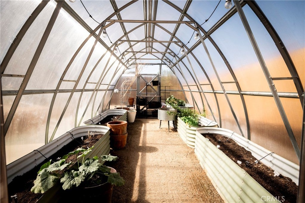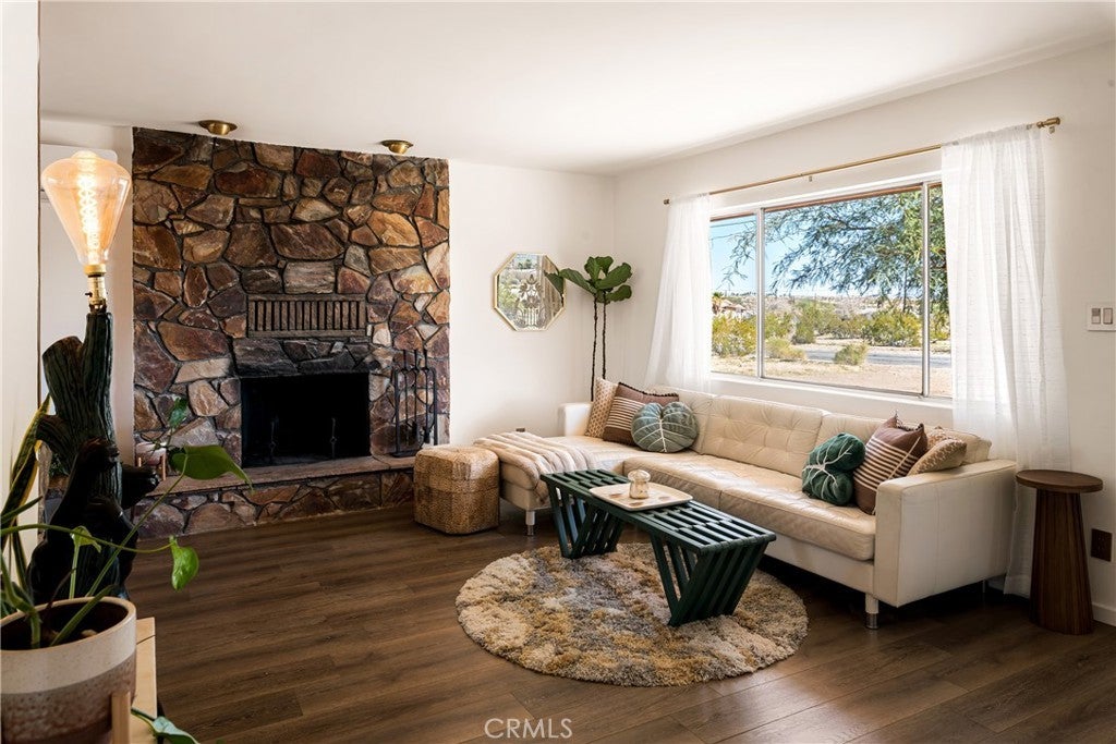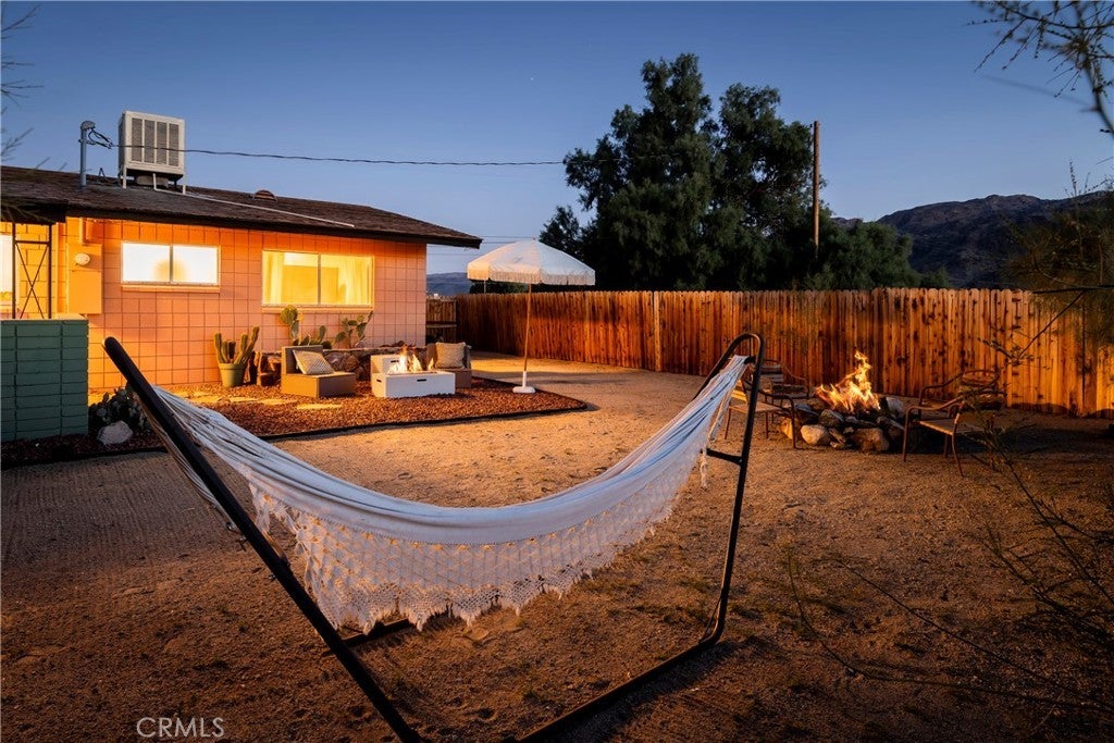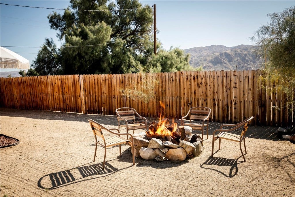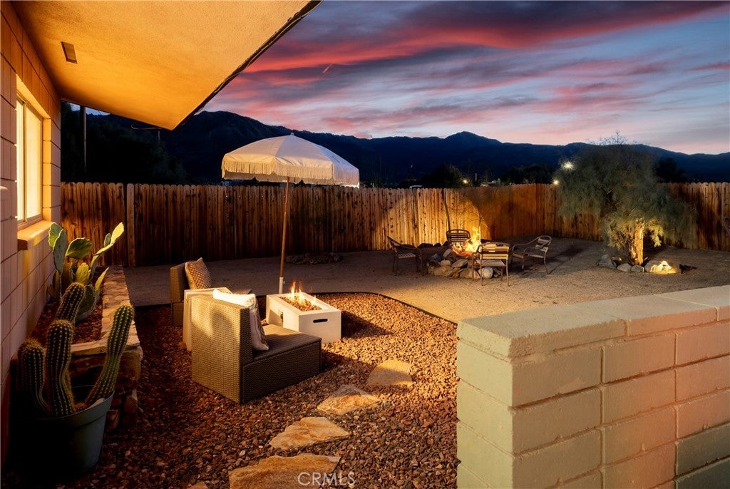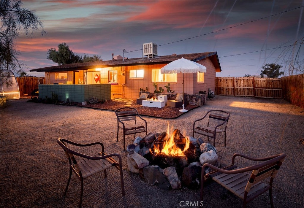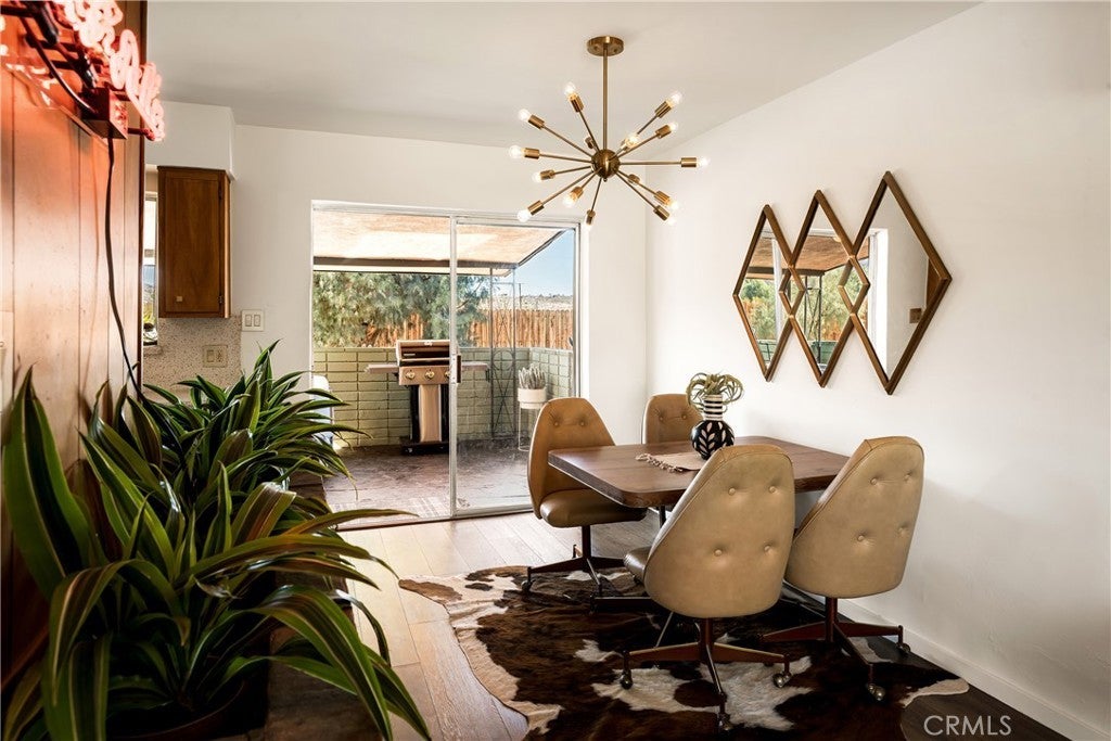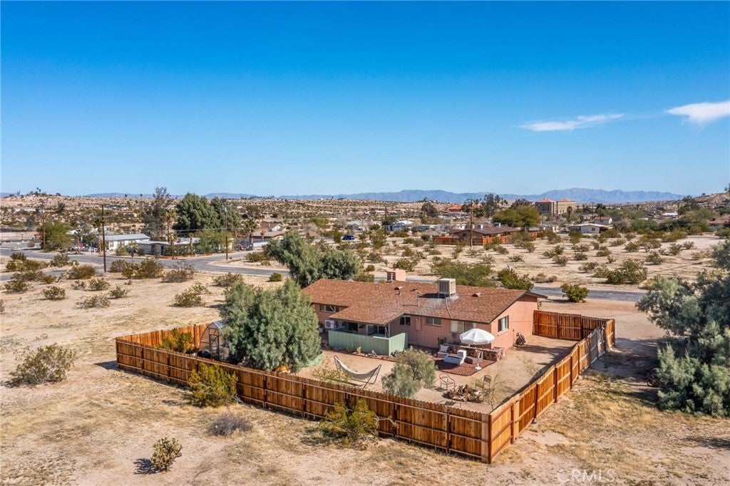 VINTAGE MID-CENTURY OASIS: Built in 1964, this brick-and-stone original sits on an approx. 16,000 sq ft lot and is centrally located near restaurants, shops, and markets, with the Eastern Joshua Tree National Park entrance about a 10-minute drive away. Natural light pours in all day, framing sunrise-to-sunset skies and beautiful mountain views, while the home’s mid-century character stays front and center symmetrical brickwork, classic rock accents, and a dramatic floor-to-ceiling stone, wood-burning fireplace anchoring the living space. The dining area delivers a true architectural moment with a rare indoor stone planter that stretches nearly the full length of the room, and the full bath features restored original tile that keeps the vintage vibe intact. The kitchen offers generous counter space and a large window above the dual sink with view lines toward the park, plus a driveway leading to a single-car garage with workshop. Outside, the property is framed by mature, lush green trees and sculptural desert cacti, creating a private, resort-like setting. A shaded, covered flagstone back porch/patio with a jacuzzi invites year-round unwinding, while a built-in cowboy pool on a wood deck is made for sunset dips. The exterior greenhouse with automatic irrigation adds a rare, practical touch for gardening and growing year-round. Finish the evening around the oversized stone fire pit in the gated backyard under the star-filled night sky that makes Joshua Tree famous.