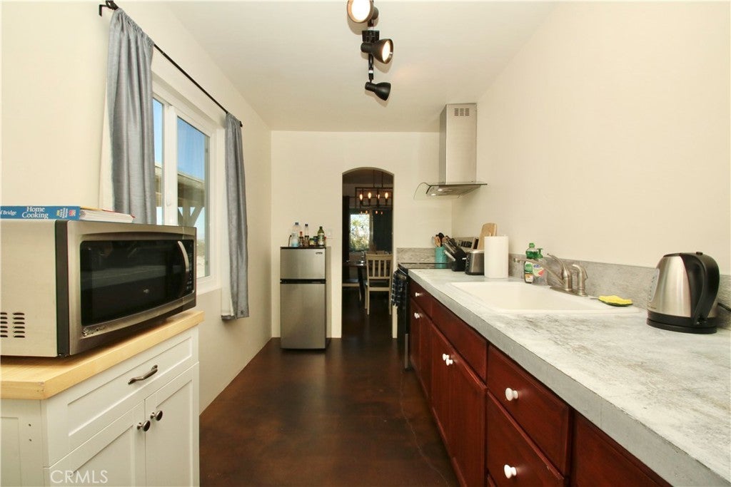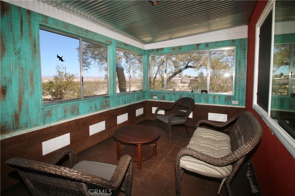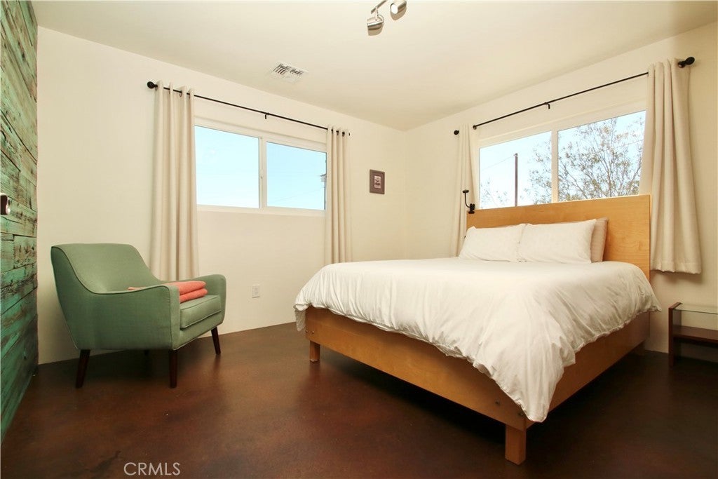 ACREAGE and VIEWS! Not far from the Joshua Tree National Park east entrance, 29 Palms, this darling 2-bedroom, 1-bath home is a stellar getaway to enjoy tranquility and nearby desert attractions. Conveniently located in the large-lot tract of the Hanson area, this 2+ acre property is near a paved road with only one neighboring home adjacent--views abound at this select location. A quick drive to the local eateries and fun in downtown 29 Palms. The back building can be restored to a freestanding garage or possibly converted to a 2nd unit ADU with a separate driveway. Features include central HVAC, gorgeous wood doors, stained concrete floors, and established landscaping—don't miss the colorful enclosed porch sitting area! Most furnishings included. Currently a successful short-term rental; this property offers value! Come see today!