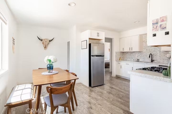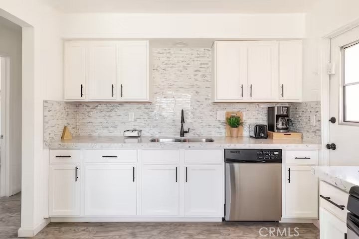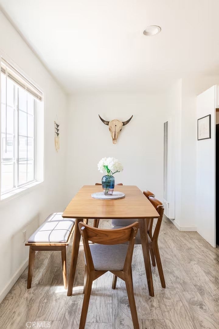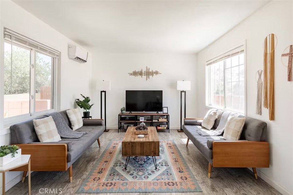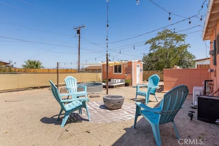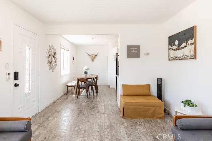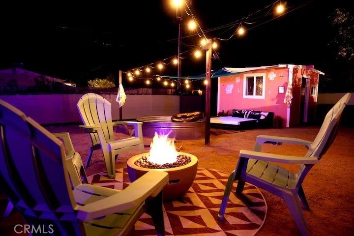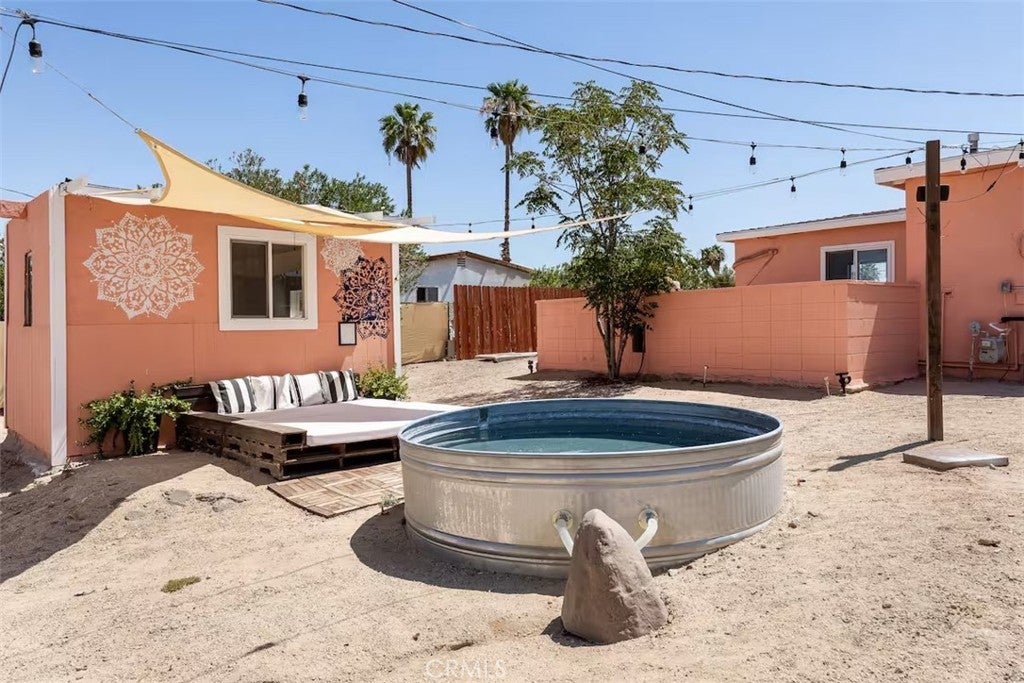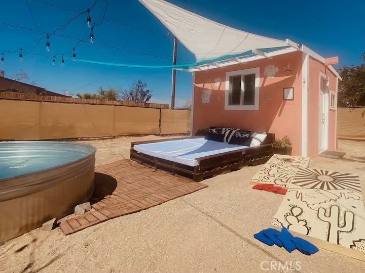 Gorgeous fully furnished turnkey two-bedroom, one-bathroom home with a casita! Ideally located just a short distance from restaurants, boutique shopping, and the famous Joshua Tree National Park, this completely renovated home is a must-see! As you pull up to the property, the character of this mid-century gem sets the mood. A lush palm tree, a paved walkway, and a beautiful mid-century rock planter welcome you in. Stepping through the front door, you will be taken aback by the well-thought-out aesthetics featuring hip wood laminate flooring, tasteful “era-conscious” accents, and an abundance of natural light flowing through the well-placed dual-pane windows. Designed with entertaining in mind, the remodeled kitchen opens up to the living and dining area and comes fully loaded. It features granite countertops, modern cabinets, a large double sink, a stylish backsplash, and stainless steel appliances, including a dishwasher, microwave, stove, and refrigerator—perfect for creating your culinary delights! Each bedroom offers plenty of space and includes an individual mini-split system for efficient heating and cooling. The bathroom is exquisite, showcasing a beautifully designed large walk-in tiled shower with rock flooring, a modern vanity, custom shelving, tasteful tile flooring, and attractive lighting. In the private backyard, you will find the ideal desert oasis. Enjoy lounging on the concrete patio while soaking up some much-needed sunlight or relax on the outdoor bed underneath the shade after taking a dip in the cowboy tub! Hosting outdoor get-togethers or dining experiences under the stars has never been more enticing, as you’ll have the perfect setup for a dinner party beneath pendant lighting. The casita is the perfect space for a home gym, office, yoga/art studio, or extra storage! Additional features include a gorgeous wall mural, efficient heating and cooling with zoned mini-split systems throughout the house, and more! Don’t miss out on this one! It certainly won’t last long, so arrange your private viewing today!