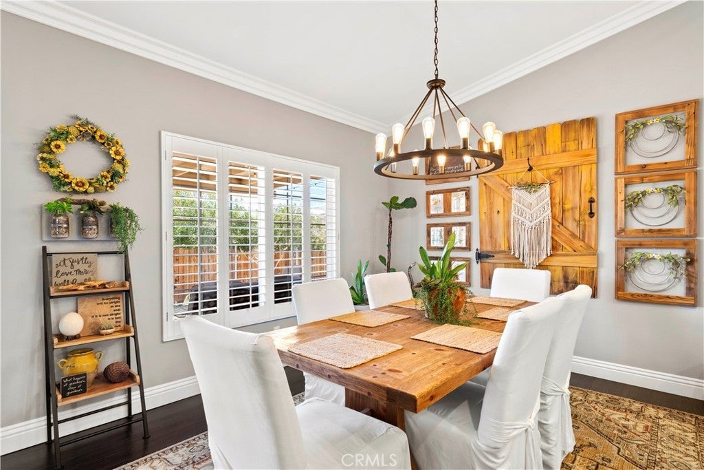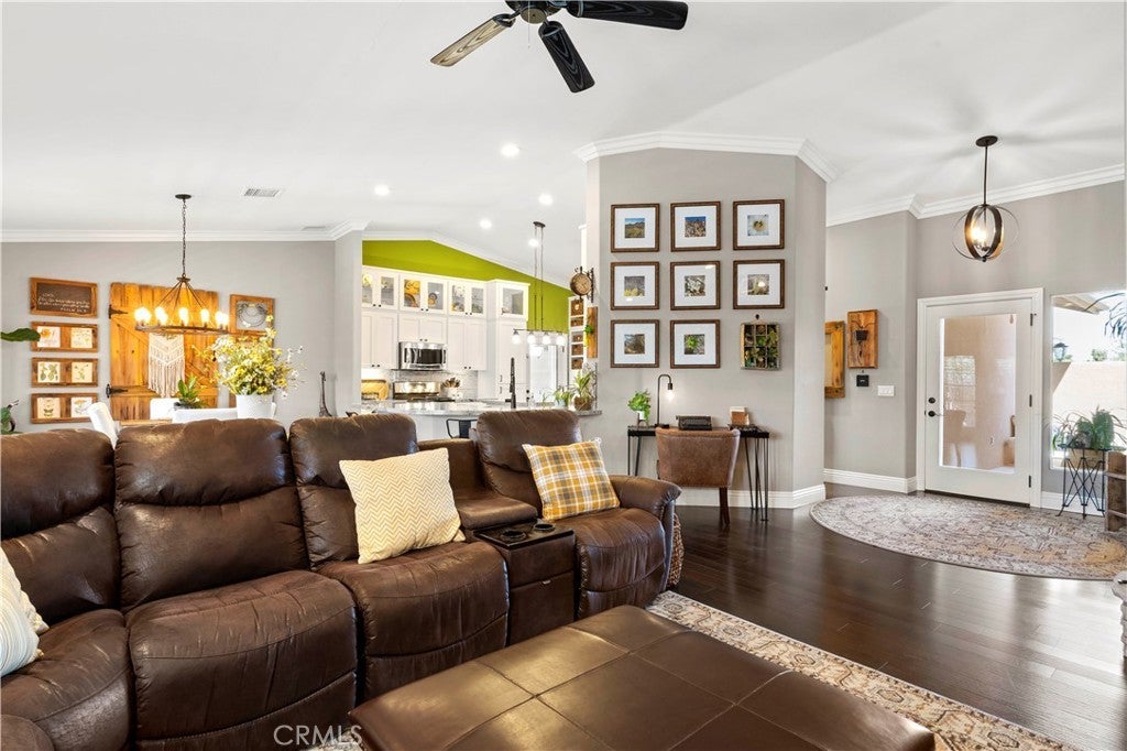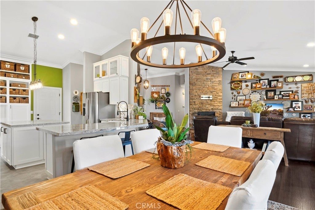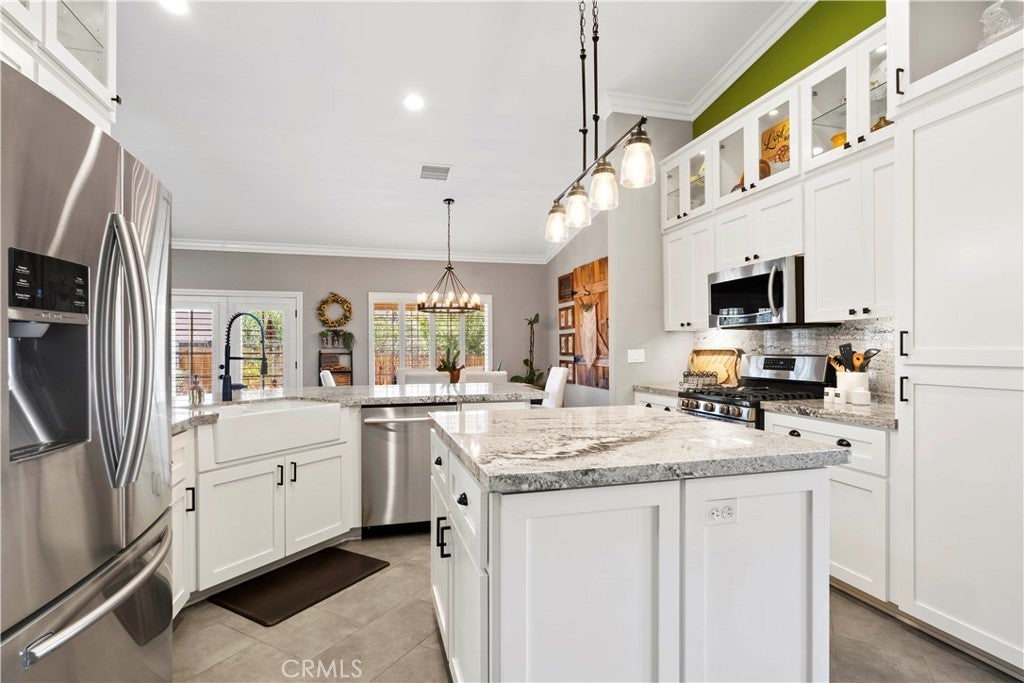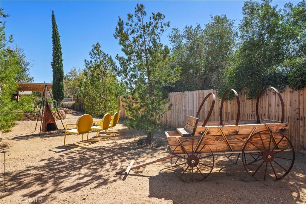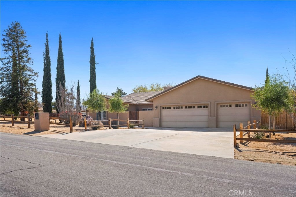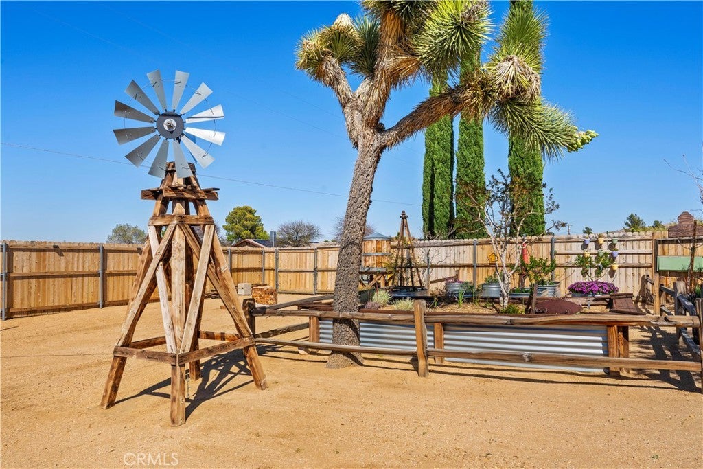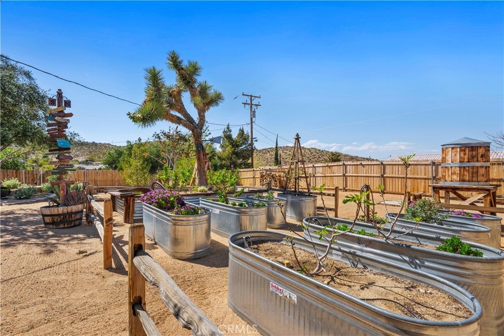 Discover this beautiful, meticulously designed desert home. This 3-bedroom, 2-bath home welcomes you with a charming courtyard. The interior boasts a cohesive design with a touch of sophistication. Plantation shutters allow for privacy and light control. Elegant details include crown molding and baseboards. Custom light fixtures throughout illuminate the space beautifully. A Farmhouse-style kitchen seamlessly blends rustic charm with modern convenience, featuring granite countertops, new stainless steel appliances, and shaker-style cabinetry with lighted upper glass-faced cabinets. Under-cabinet lighting, soft-close cabinet hardware, and customized pantry shelving enhance functionality. The custom-built desk area adds versatility for daily tasks. Dark wood laminate flooring seamlessly connects the open-concept living, dining, and kitchen areas. High ceilings create an airy ambiance, while the custom rock fireplace adds warmth and charm. Abundant natural light floods through well-placed windows. Plus, enjoy cozy evenings with the custom air-tight wood stove. As you step into the primary bedroom, you’ll be captivated by the custom wood wainscoting that offers refined comfort. Enjoy two large walk-in closets. The main bath features dual sinks, a luxurious soaking tub, and a generously sized walk-in shower adorned with floor-to-ceiling tile. The second bedroom exudes elegance with wainscoting adorning the walls. The room boasts a spacious walk-in closet. The second bath features a granite countertop and a custom sink installation. An added linen cabinet provides convenient storage. The third bedroom/office stands out with its custom cabinetry. The enchanting home’s outdoor space is adorned with mature trees and a thriving vegetable garden. Enjoy your morning coffee on the wrap-around patio, complete with a built-in BBQ for culinary delights. It includes new fencing, an automated watering system, a raised bed garden, shaded seating, a built-in BBQ, outdoor dining, illuminated shade, charming yard art, grapevines, and RV hookups. This outdoor paradise is more than a yard—it’s an invitation to create lasting memories. This desert retreat awaits its new owner—schedule a viewing today!