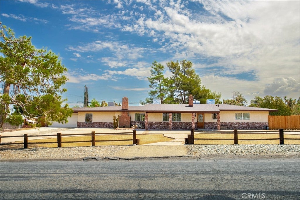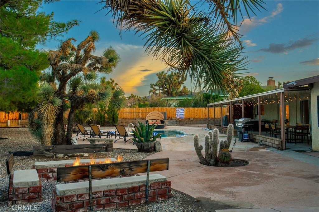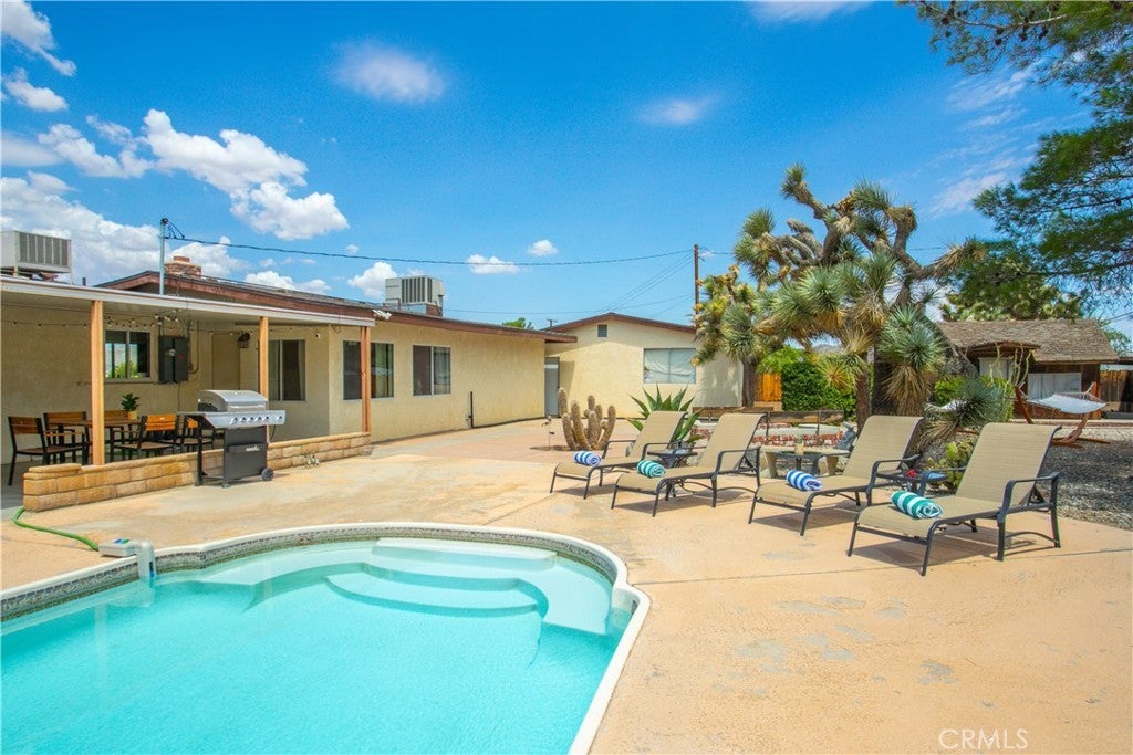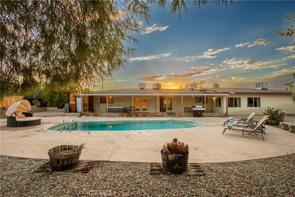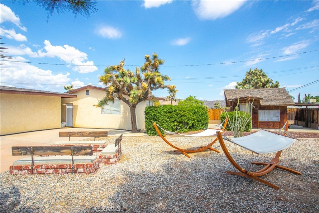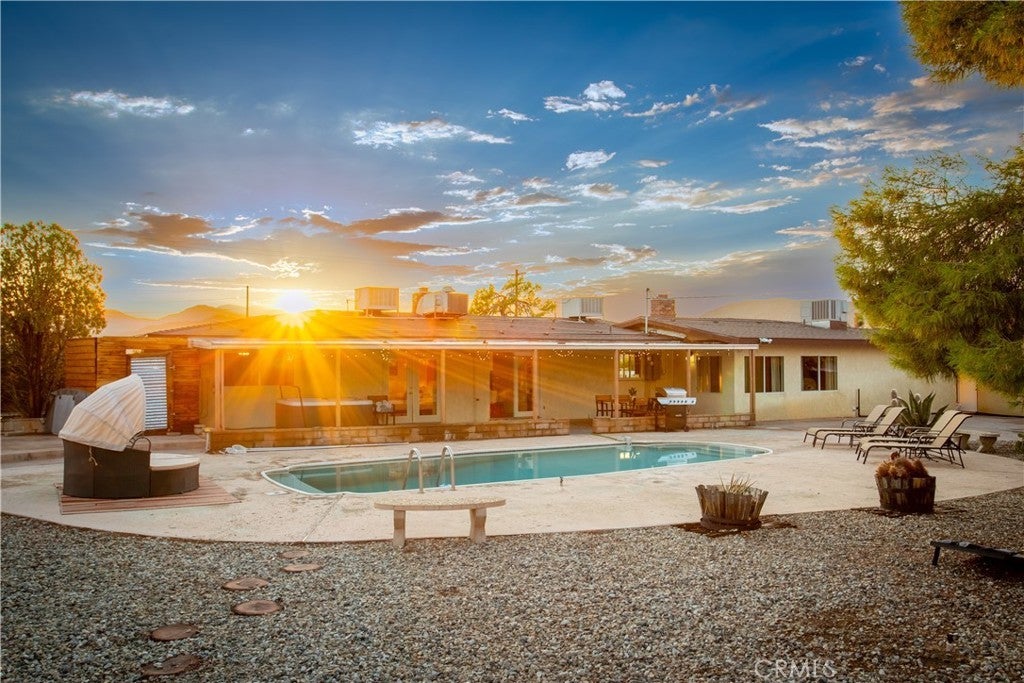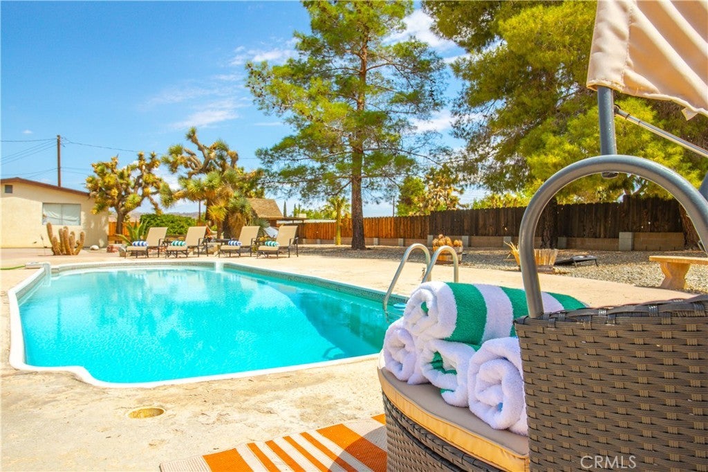 Welcome to 7737 Aster Ave, a stunning POOL home and successful Airbnb (FULLY FURNISHED / RENOVATED IN 2022) located in the heart of Yucca Valley. Nicely set on .62 acres of land, this gorgeous 4 bedroom, 3 bath desert home has been beautifully upgraded with everything intentionally chosen to bring you the perfect desert home, airbnb or weekend retreat. Upon arrival, you’re greeted with a large, semi-circle driveway and manicured yard, showcasing pride of ownership from the moment you pull in. As you step inside the 2,375 square foot home you'll instantly notice the stunning floor-to-ceiling stone fireplace, warm wood-like flooring and large windows that let in an abundance of natural light. The second living room/den (currently set up as a game room) adorns beautiful exposed beams and a charming brick-faced fireplace for added ambiance. The kitchen is complete with ample cabinet space, mosaic tile backsplash, granite counter tops and stainless steel appliances. There is also a formal dining room just off the kitchen which open to the backyard, perfect for seamless indoor-outdoor entertaining. The primary bedroom features crown molding, two closets and a private full bathroom with a single-sink vanity and a walk-in shower. The second ensuite bedroom features sliding glass doors to the back yard, dual closets and a bathroom with a pedestal sink and tiled walk-in shower. The third bedroom also opens to the backyard through French doors and the third and most opulent bathroom adorns a timeless clawfoot bathtub, crown molding, tasteful gold accents and a custom antique-style vanity. That's just the inside; the backyard is an entertainer's paradise. From the oversized covered patio to the large in-ground pool, fire pit with seating, relaxing spa & hammocks, mature landscaping and ample space for hosting, it's like having a mini resort right outside your back door. This home is complete with dual cooling (AC & Evaporative Cooling), an indoor laundry room, detached 2 car garage, pool room and dog run or horse shoe area. Last but not least, take in the gorgeous views of the snowcap mountains and the breathtaking cotton candy sunsets right from your front porch. It's just a short 11 minute drive to Joshua Tree or a quick 35 min drive to Palm Springs so you're close to all the wonderful attractions our desert has to offer. Schedule a showing today & let this home's charming allure do the rest. Your new desert home or weekend retreat awaits!
