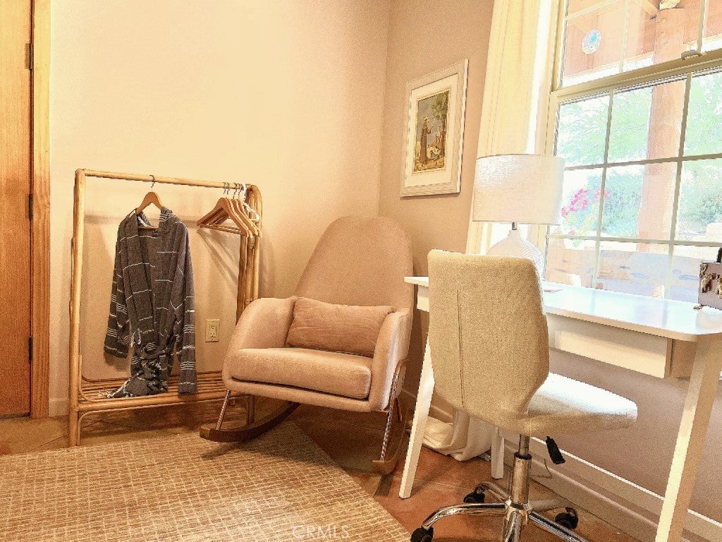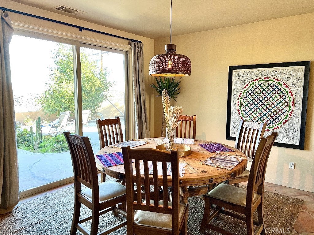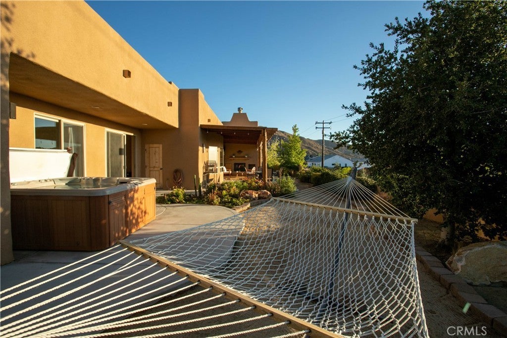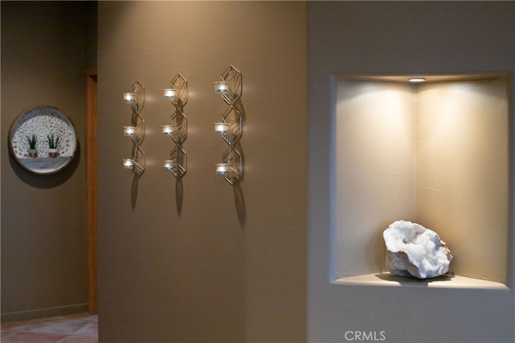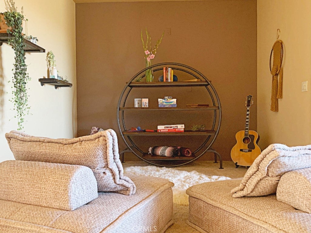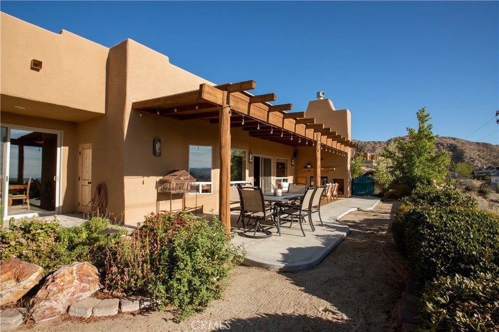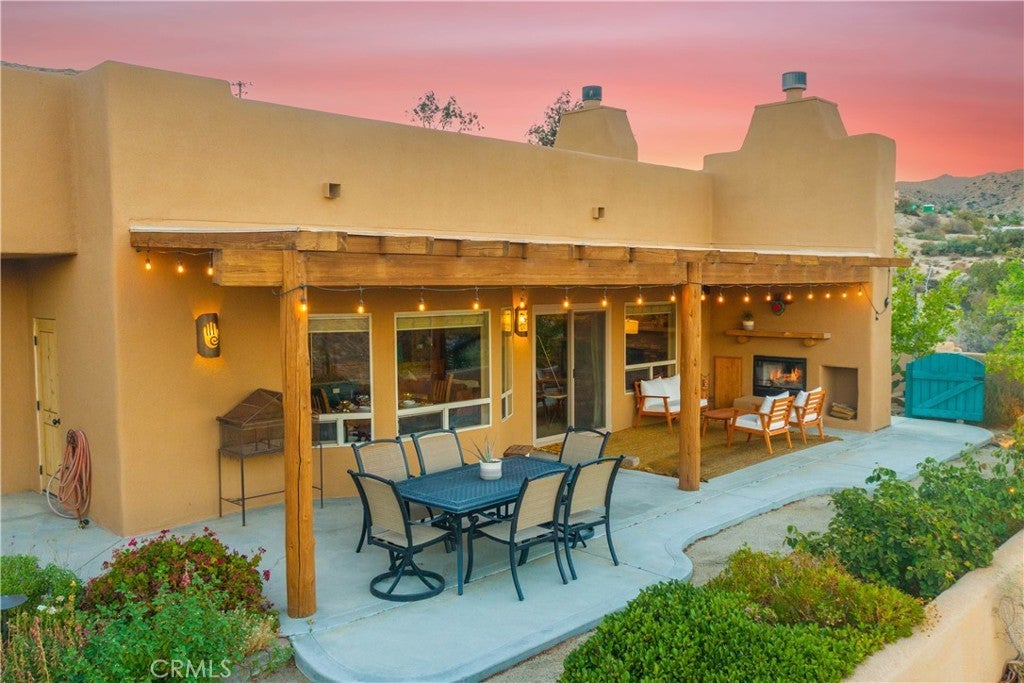 Architectural Santa Fe Pueblo–inspired builder’s home in Country Club Estates, thoughtfully designed and crafted by a builder/architect team after extensive study of traditional New Mexico architecture. This striking residence blends authentic Southwestern character with modern comfort, resulting in a truly distinctive desert retreat. The open-concept floor plan features high ceilings, tall solid wood doors, and expansive sliding glass doors that frame unobstructed east-facing views across Yucca Valley and toward the hills of Joshua Tree National Park. Natural light fills the living spaces, creating a seamless connection between indoor living and the surrounding desert landscape. At the heart of the home is a spacious chef’s kitchen with quality appliances, a large island with breakfast bar seating, and generous prep space—perfect for entertaining or everyday living. The home offers large, comfortable bedrooms, including a well-appointed primary suite with jacuzzi tub, walk-in shower, double vanity, and walk-in closet. A fourth bedroom—currently staged as additional sleeping space for vacation rental guests—was previously used as a beautiful office/library with wood paneling and built-in bookshelves. Adding to the property’s versatility is the professionally built recording studio, created from the original three-car garage. Designed with a control room and isolation/live room, the space features sound treatment, its own HVAC system, private entry/exit, and even a baby grand piano. The studio has also functioned as an art and photography workspace and was designed so it can be converted back to a garage if desired (buyer to verify). Outdoor highlights include RV parking along the south side of the property with long-distance views stretching toward the San Jacinto mountains near Palm Springs, along with multiple vantage points to enjoy the expansive desert scenery. Tastefully designed in a Santa Fe Modern aesthetic, this property is also a top-rated short-term vacation rental with excellent guest reviews, offering both lifestyle appeal and income potential. A rare opportunity to own a carefully crafted architectural home where quality construction, thoughtful design details, and breathtaking desert views come together in one exceptional property.