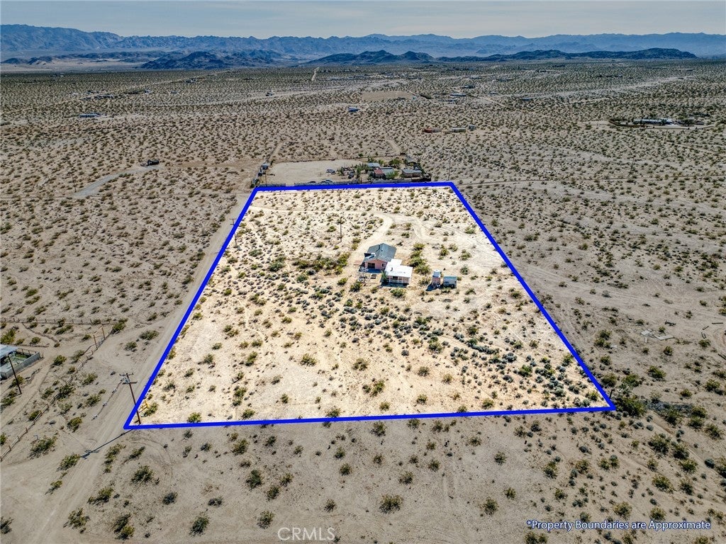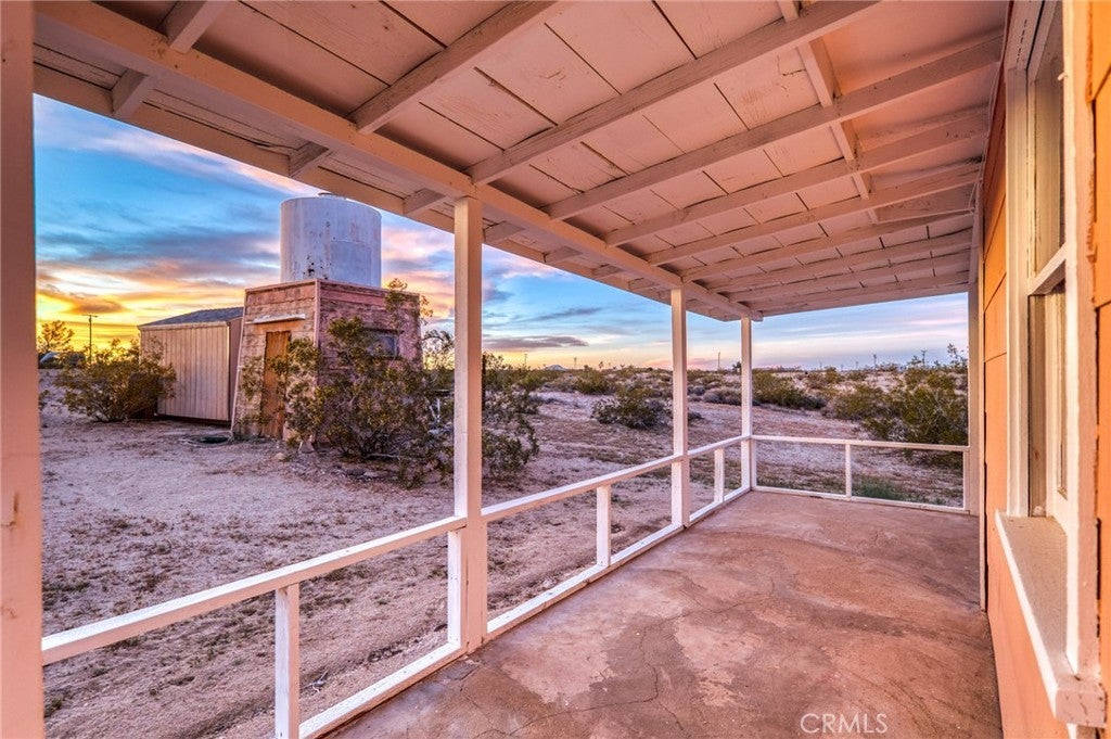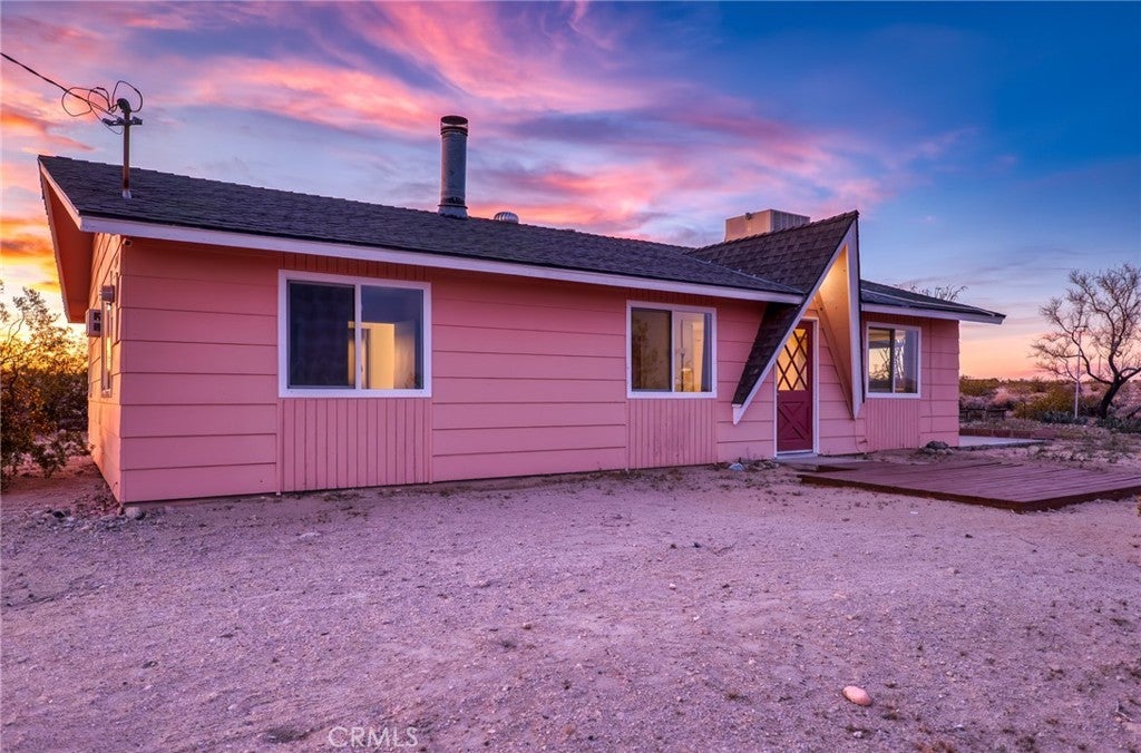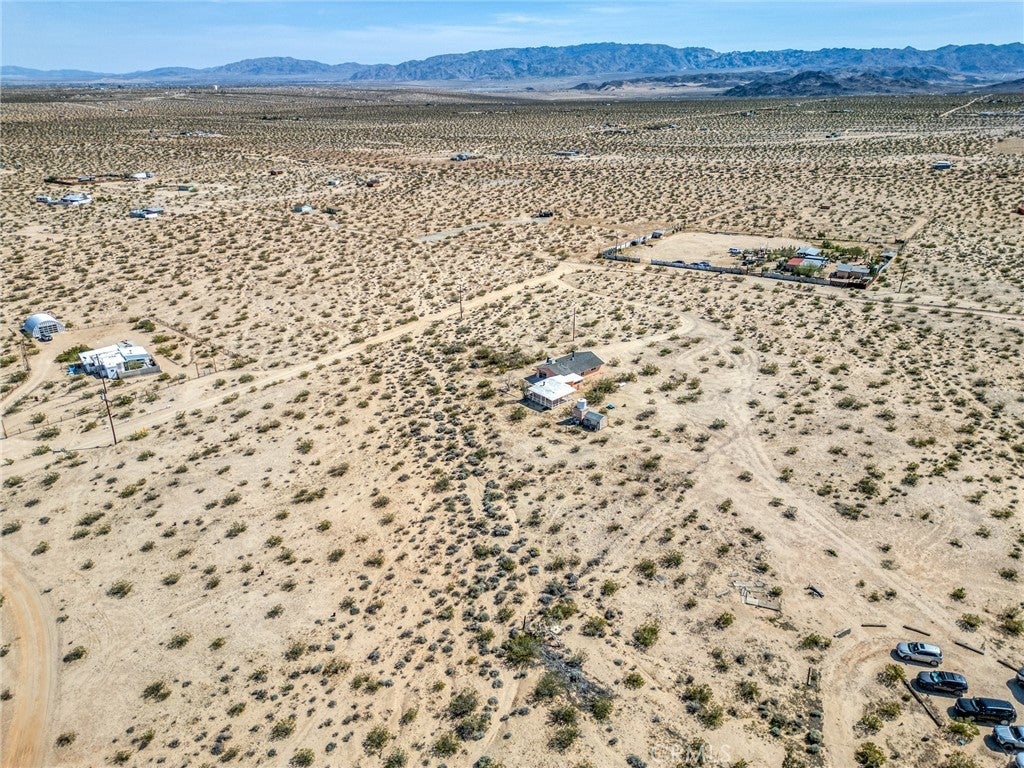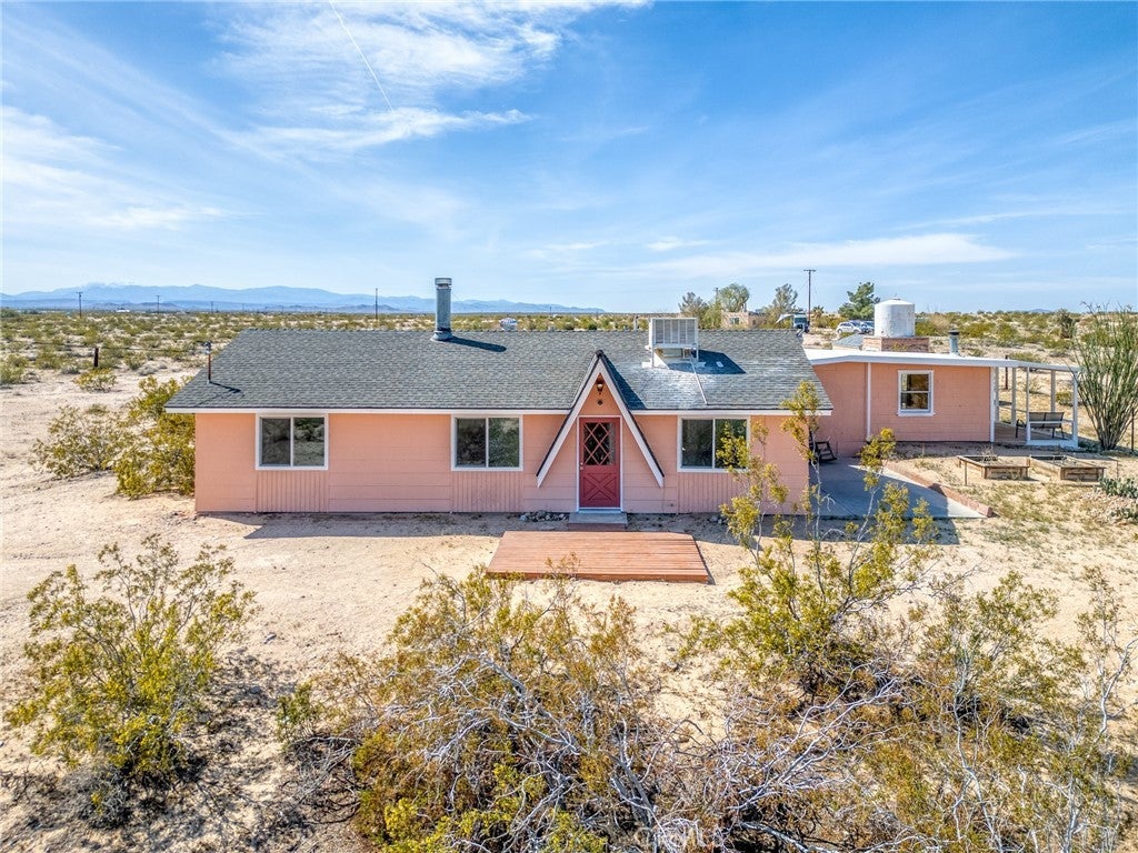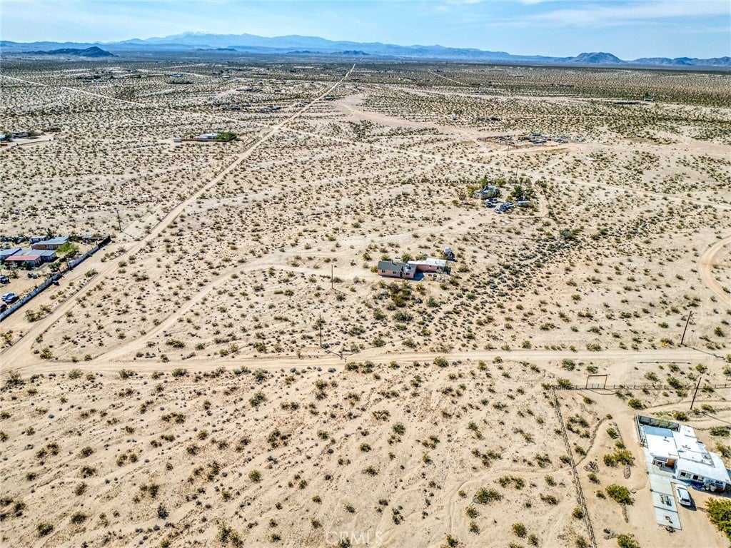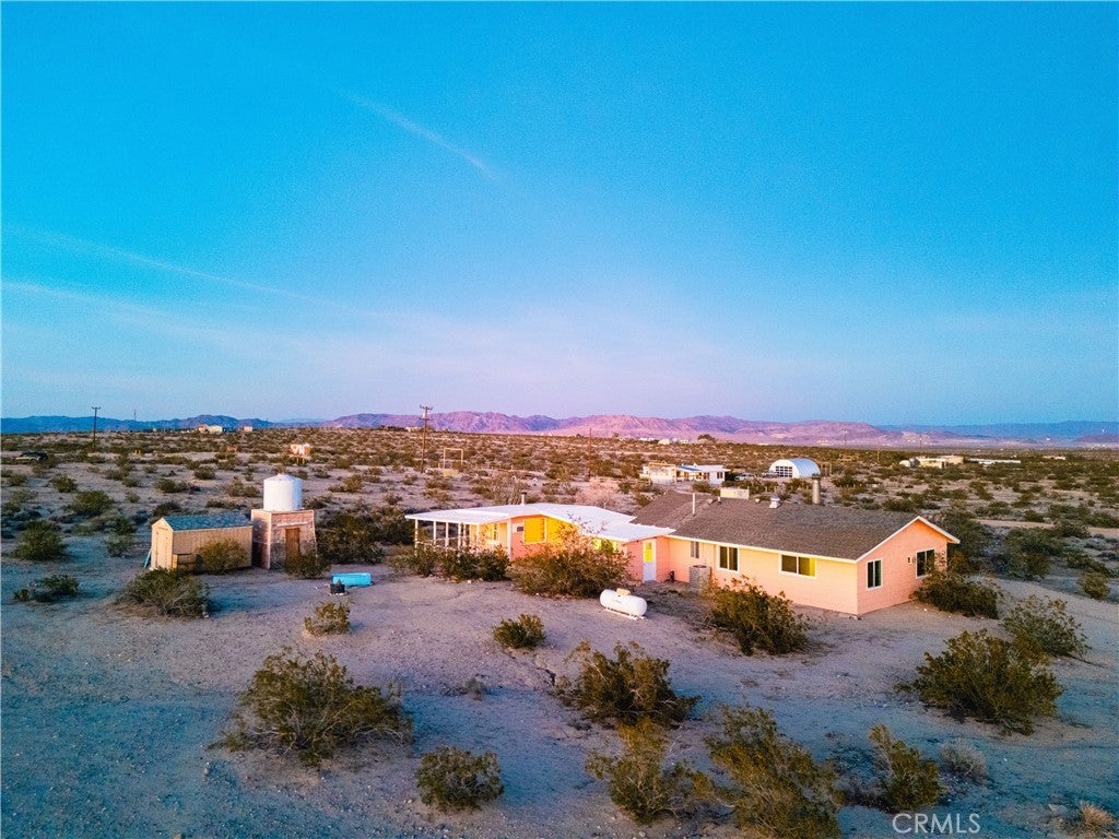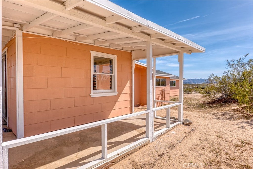 Set on 5 breathtaking acres in Joshua Tree, this charming (3) bedroom, 1 bath home captures the essence of desert living with sweeping 360° sunrise and sunset views and uninterrupted open space to the north. Elevated on a gentle rise, the property offers a peaceful, private setting where quiet surroundings and star filled skies create a true sense of escape. Built in 1966 and thoughtfully updated, the 1,510 sq ft home features new flooring, (new) dual pane windows, fresh interior and exterior paint, a newer water heater, and a beautifully refreshed kitchen. Inside, the home welcomes you with a warmly (spacious) and inviting living room, filled with natural light, highlighted with new tile flooring and a cozy corner brick-faced wood burning fireplace. The space flows effortlessly into the dining area, where sliding glass doors frame the desert landscape beyond. The kitchen blends charm and functionality with white shaker cabinetry, a wood shiplap backsplash, gas stove, dishwasher, ceiling fan, and a bright, airy feel that makes it a joy to gather and cook. Both bedrooms offer LVT flooring and soft natural light, creating comfortable and restful spaces, while second bedroom features mirrored closet doors. A spacious second living area adds flexibility and is bathed in sunlight, expansive views, and sliding doors that open to the covered patio and yard, inviting seamless indoor-outdoor living. The bathroom is tastefully finished with tile flooring, a single sink vanity, and a walk-in tiled shower, while the indoor laundry room includes tile flooring and crown molding for added detail. The grounds are equally captivating, with mature desert landscaping that includes striking cacti, creosote, and a flowering desert willow, all set against a backdrop of expansive skies. Wildlife such as roadrunners, desert rabbits, and native birds are frequent visitors, enhancing the natural beauty of the setting. Evenings bring incredibly dark skies, perfect for expansive stargazing. Additional features include an efficient central heat pump system for year round comfort, ducted evaporative cooling for energy efficient summer days, a new French drain at the laundry area, and a welcoming new front deck. Two large sheds provide excellent storage, including one with extensive shelving, while irrigated garden beds offer space to grow and cultivate. A unique outdoor hot water setup creates a serene space for soaking under the stars, adding to the home’s retreat like atmosphere.