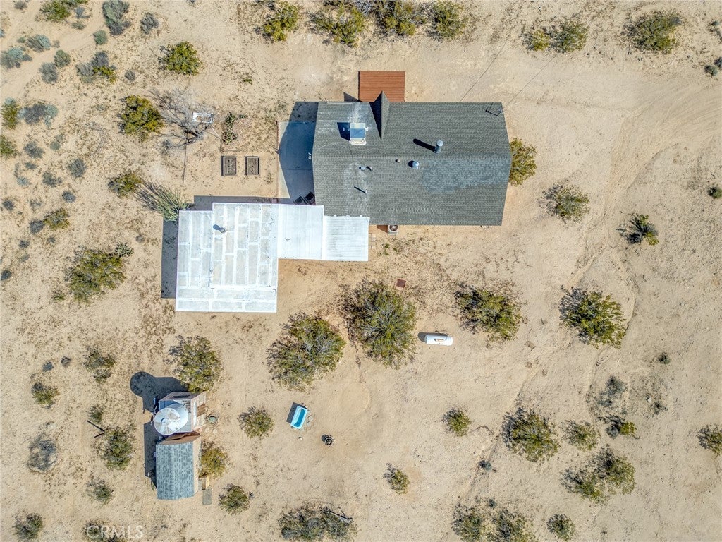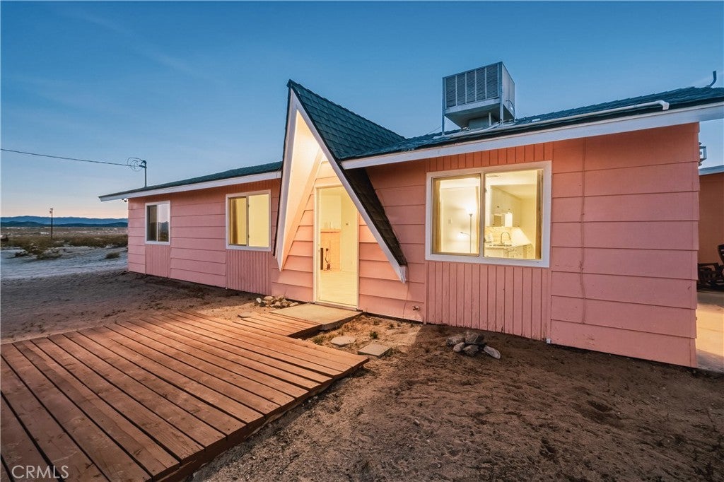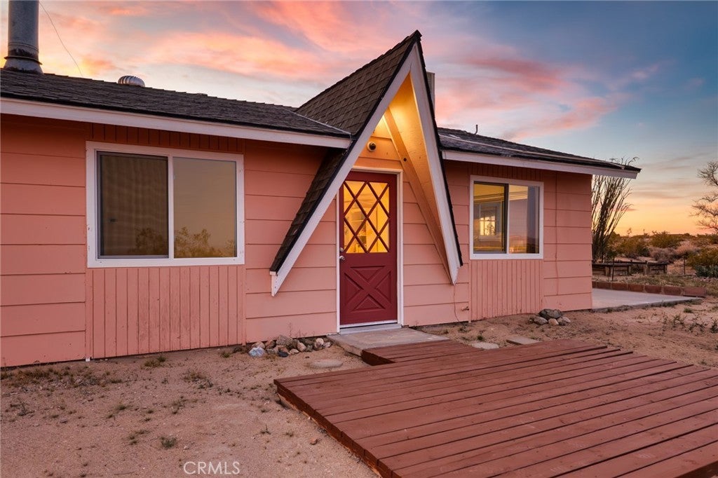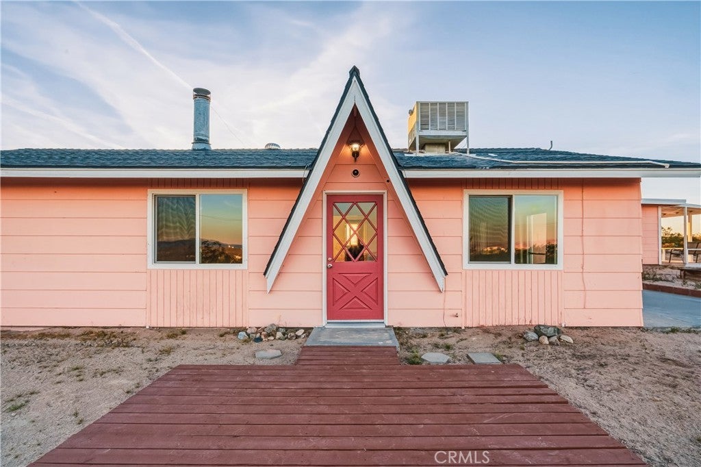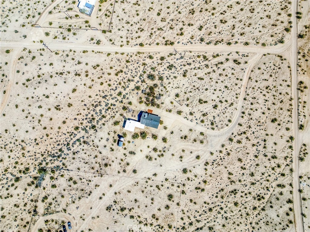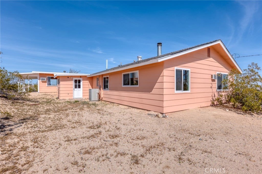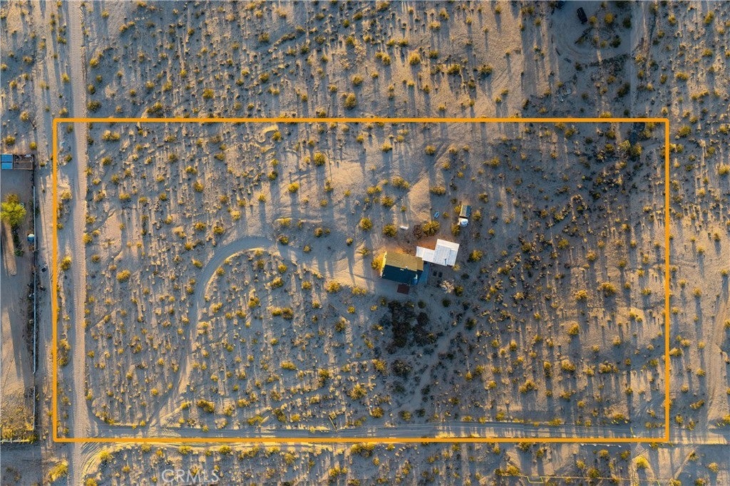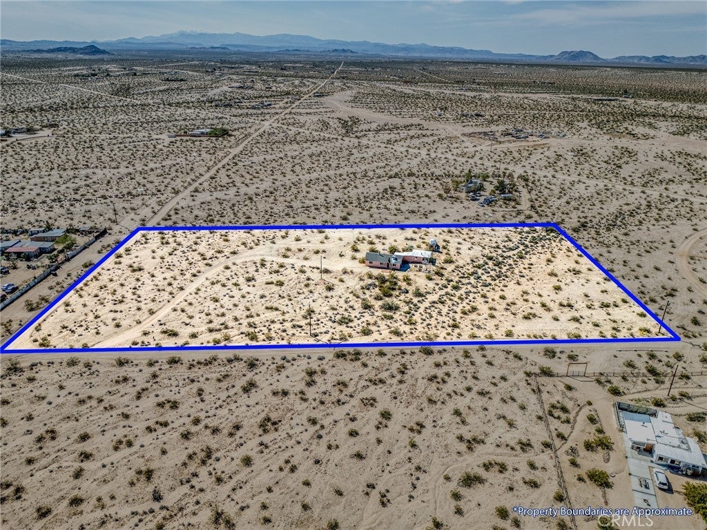 Set on 5 breathtaking acres in Joshua Tree, this charming (3) bedroom, 1 bath home captures the essence of desert living with sweeping 360° sunrise and sunset views and uninterrupted open space to the north. Elevated on a gentle rise, the property offers a peaceful, private setting where quiet surroundings and star filled skies create a true sense of escape. Built in 1966 and thoughtfully updated, the 1,510 sq ft home features new flooring, (new) dual pane windows, fresh interior and exterior paint, a newer water heater, and a beautifully refreshed kitchen. Inside, the home welcomes you with a warmly (spacious) and inviting living room, filled with natural light, highlighted with new tile flooring and a cozy corner brick-faced wood burning fireplace. The space flows effortlessly into the dining area, where sliding glass doors frame the desert landscape beyond. The kitchen blends charm and functionality with white shaker cabinetry, a wood shiplap backsplash, gas stove, dishwasher, ceiling fan, and a bright, airy feel that makes it a joy to gather and cook. Both bedrooms offer LVT flooring and soft natural light, creating comfortable and restful spaces, while second bedroom features mirrored closet doors. A spacious second living area adds flexibility and is bathed in sunlight, expansive views, and sliding doors that open to the covered patio and yard, inviting seamless indoor-outdoor living. The bathroom is tastefully finished with tile flooring, a single sink vanity, and a walk-in tiled shower, while the indoor laundry room includes tile flooring and crown molding for added detail. The grounds are equally captivating, with mature desert landscaping that includes striking cacti, creosote, and a flowering desert willow, all set against a backdrop of expansive skies. Wildlife such as roadrunners, desert rabbits, and native birds are frequent visitors, enhancing the natural beauty of the setting. Evenings bring incredibly dark skies, perfect for expansive stargazing. Additional features include an efficient central heat pump system for year round comfort, ducted evaporative cooling for energy efficient summer days, a new French drain at the laundry area, and a welcoming new front deck. Two large sheds provide excellent storage, including one with extensive shelving, while irrigated garden beds offer space to grow and cultivate. A unique outdoor hot water setup creates a serene space for soaking under the stars, adding to the home’s retreat like atmosphere.