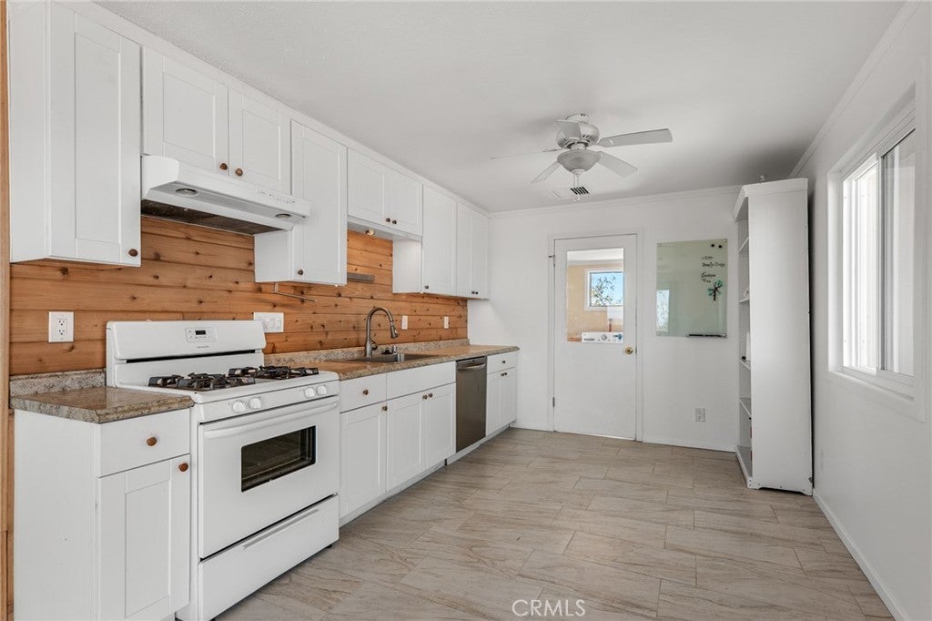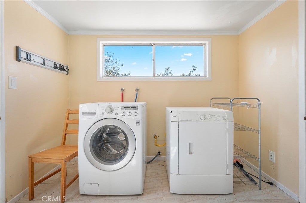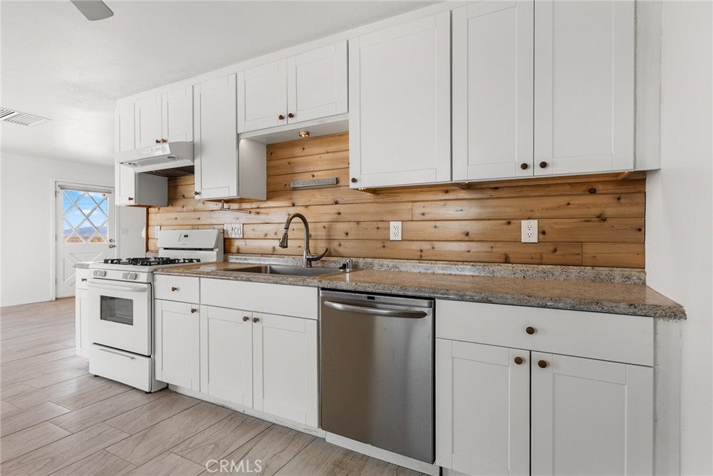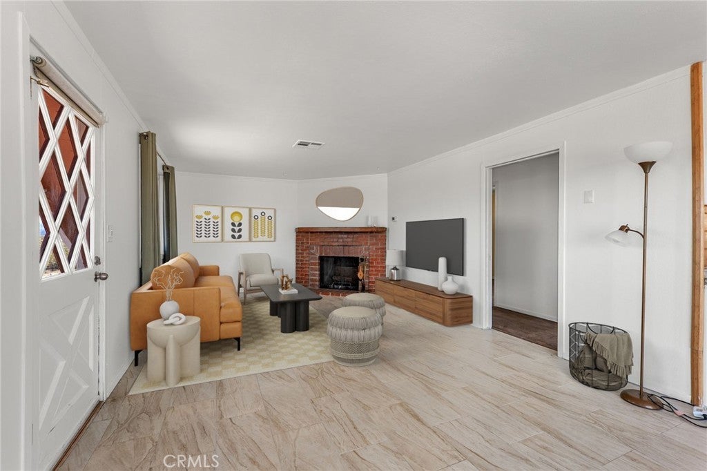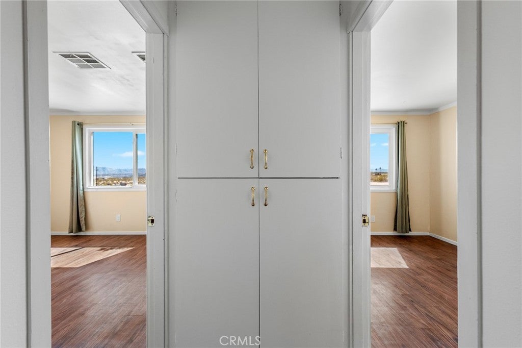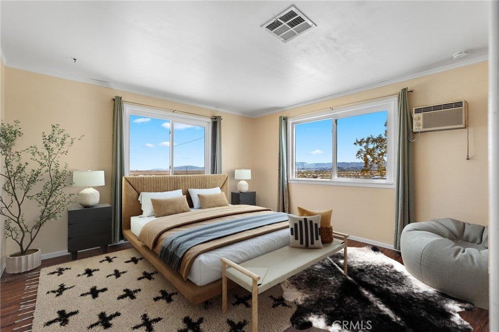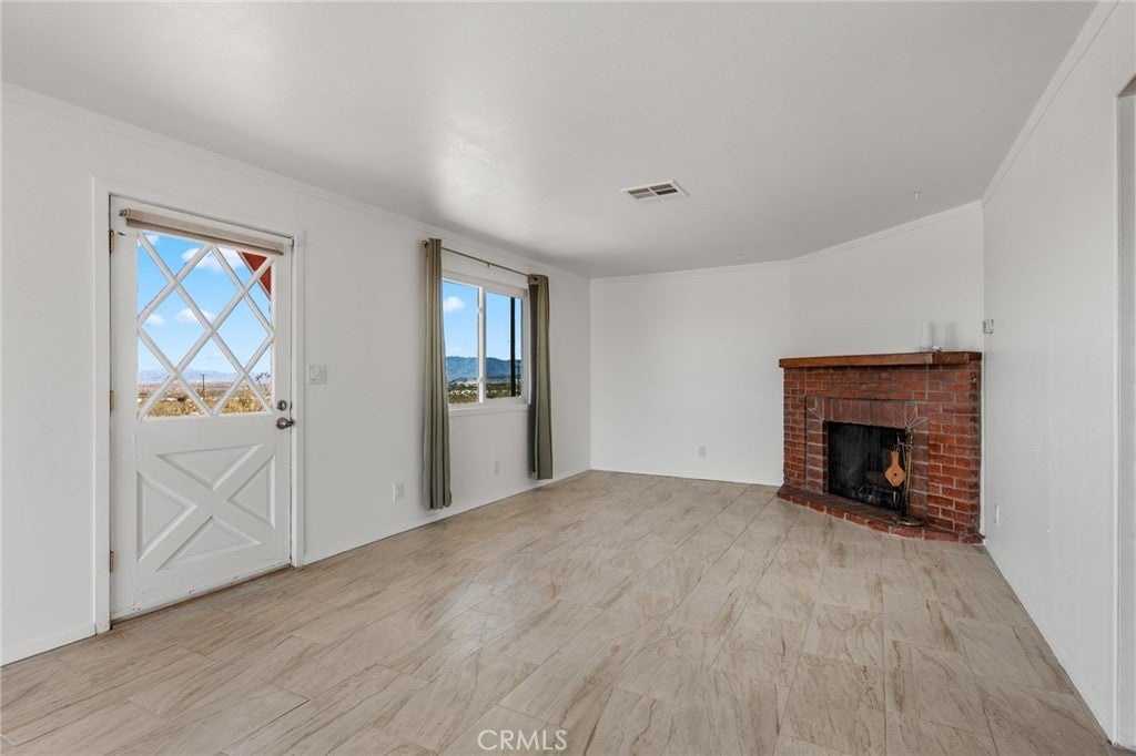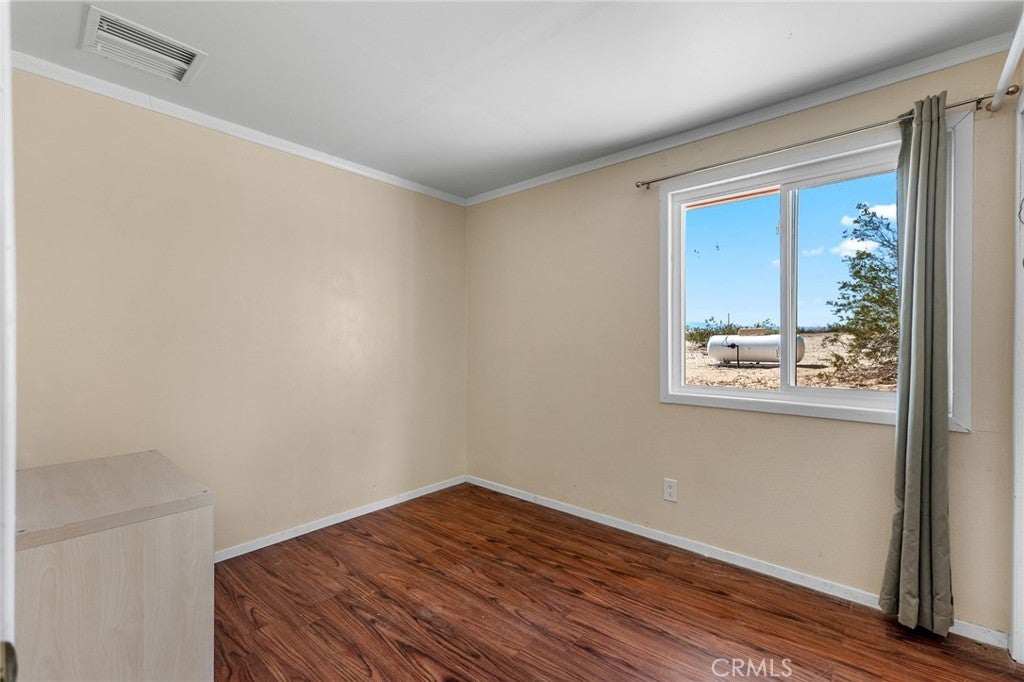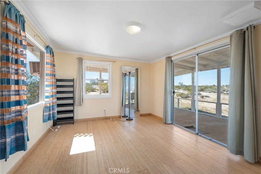 Set on 5 breathtaking acres in Joshua Tree, this charming (3) bedroom, 1 bath home captures the essence of desert living with sweeping 360° sunrise and sunset views and uninterrupted open space to the north. Elevated on a gentle rise, the property offers a peaceful, private setting where quiet surroundings and star filled skies create a true sense of escape. Built in 1966 and thoughtfully updated, the 1,510 sq ft home features new flooring, (new) dual pane windows, fresh interior and exterior paint, a newer water heater, and a beautifully refreshed kitchen. Inside, the home welcomes you with a warmly (spacious) and inviting living room, filled with natural light, highlighted with new tile flooring and a cozy corner brick-faced wood burning fireplace. The space flows effortlessly into the dining area, where sliding glass doors frame the desert landscape beyond. The kitchen blends charm and functionality with white shaker cabinetry, a wood shiplap backsplash, gas stove, dishwasher, ceiling fan, and a bright, airy feel that makes it a joy to gather and cook. Both bedrooms offer LVT flooring and soft natural light, creating comfortable and restful spaces, while second bedroom features mirrored closet doors. A spacious second living area adds flexibility and is bathed in sunlight, expansive views, and sliding doors that open to the covered patio and yard, inviting seamless indoor-outdoor living. The bathroom is tastefully finished with tile flooring, a single sink vanity, and a walk-in tiled shower, while the indoor laundry room includes tile flooring and crown molding for added detail. The grounds are equally captivating, with mature desert landscaping that includes striking cacti, creosote, and a flowering desert willow, all set against a backdrop of expansive skies. Wildlife such as roadrunners, desert rabbits, and native birds are frequent visitors, enhancing the natural beauty of the setting. Evenings bring incredibly dark skies, perfect for expansive stargazing. Additional features include an efficient central heat pump system for year round comfort, ducted evaporative cooling for energy efficient summer days, a new French drain at the laundry area, and a welcoming new front deck. Two large sheds provide excellent storage, including one with extensive shelving, while irrigated garden beds offer space to grow and cultivate. A unique outdoor hot water setup creates a serene space for soaking under the stars, adding to the home’s retreat like atmosphere.